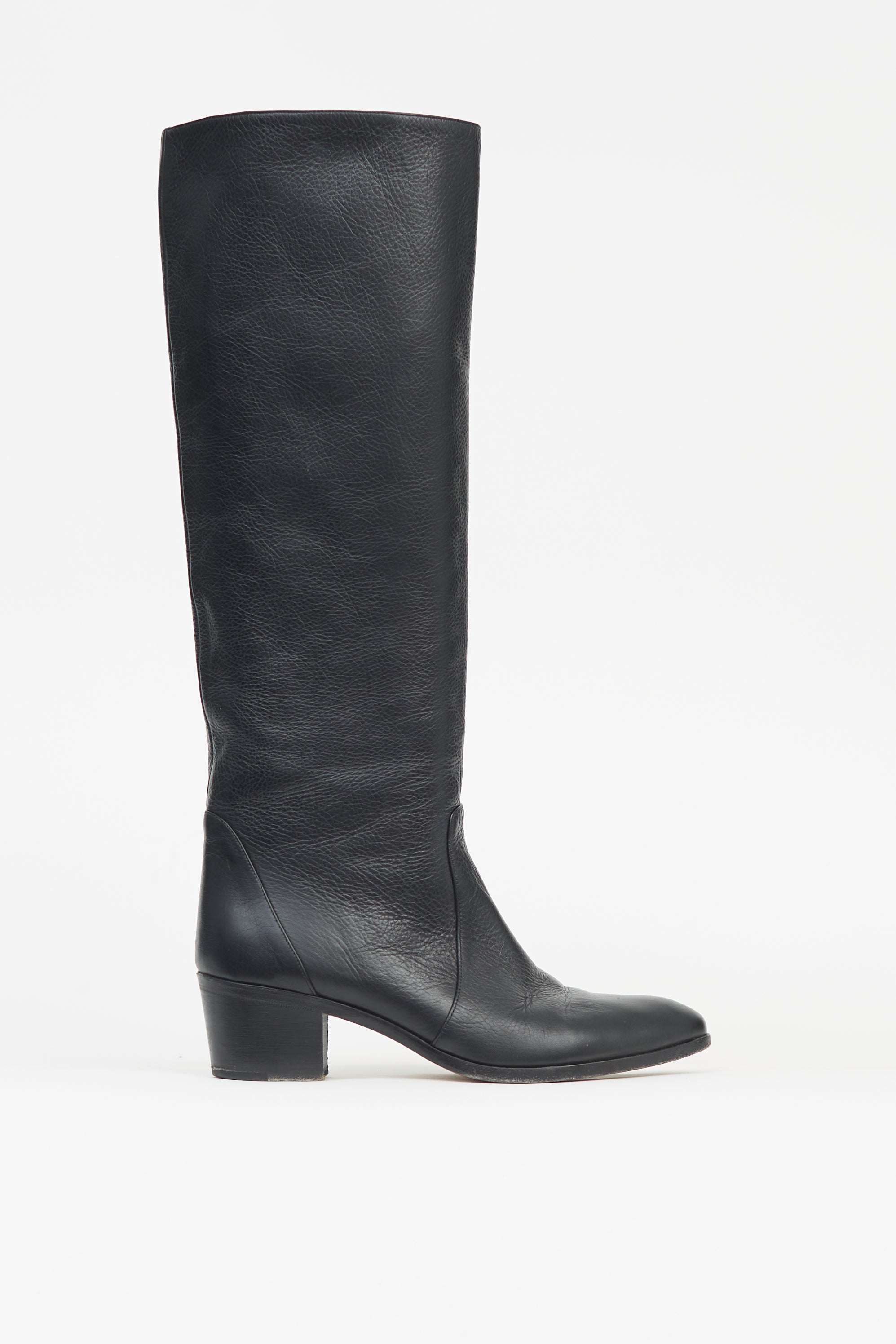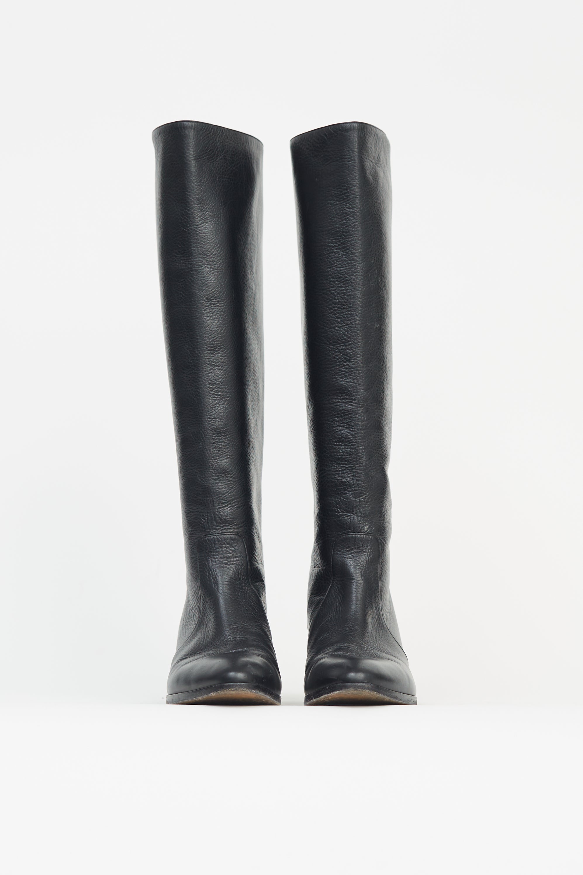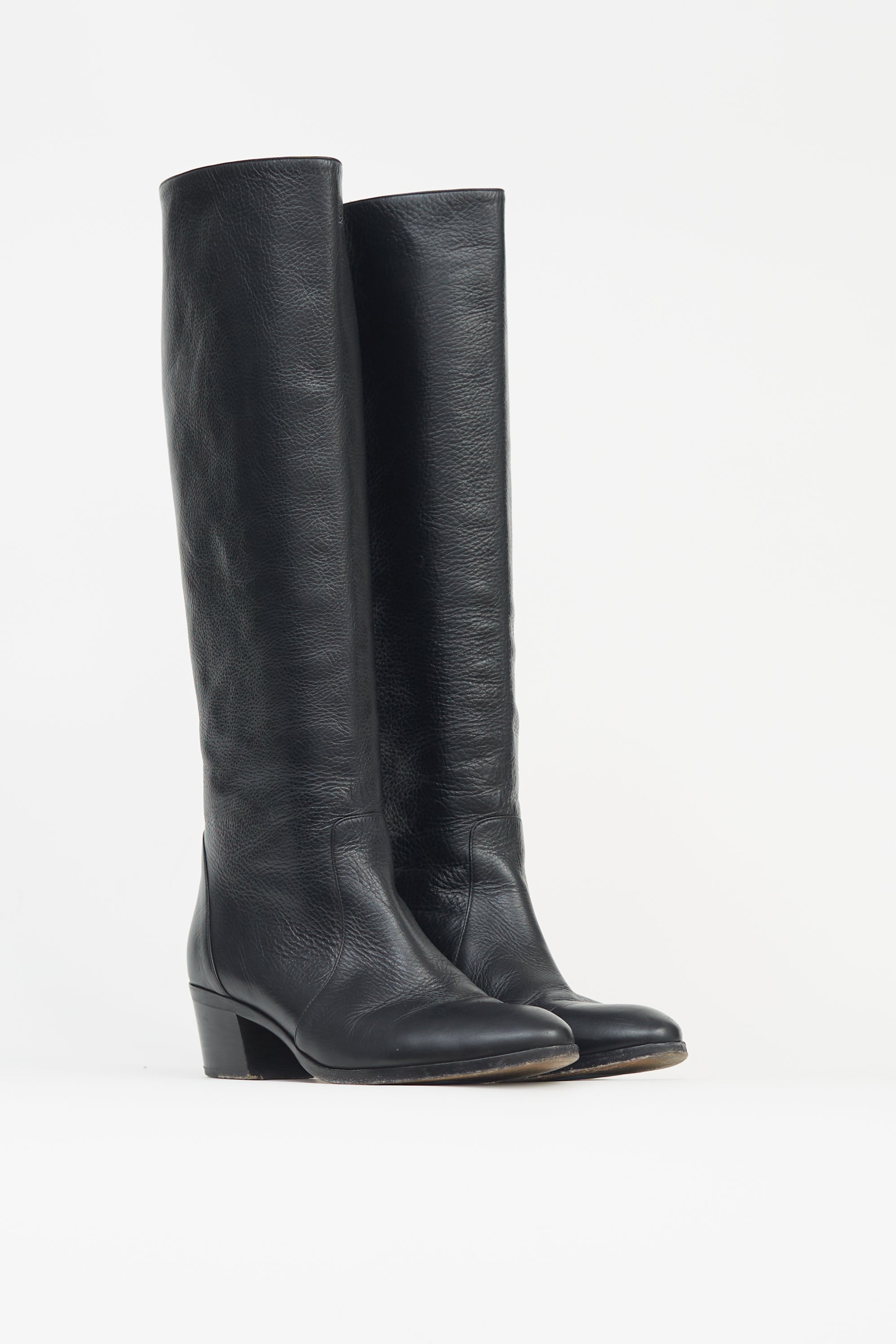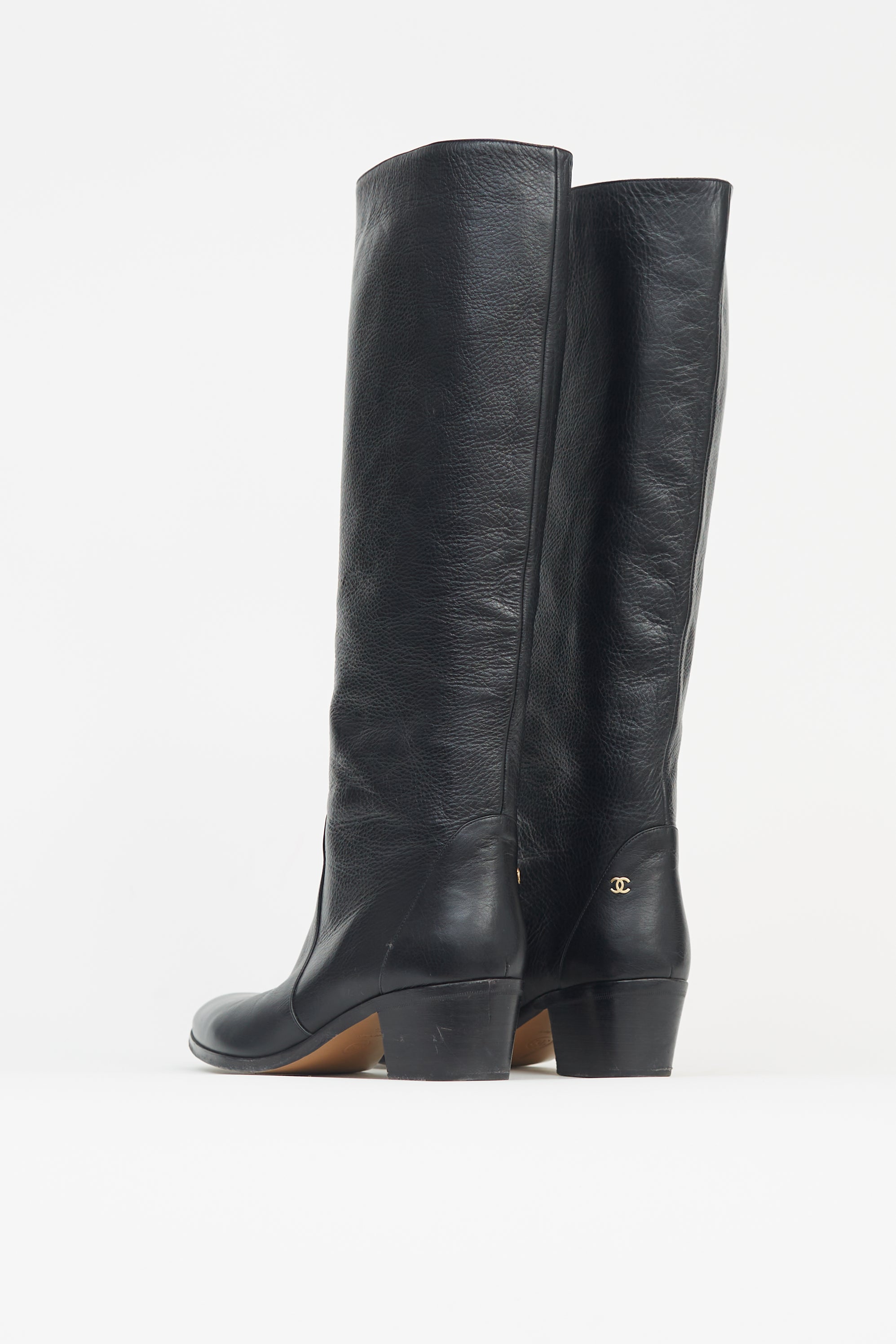 Pre-owned Chanel black leather knee high riding boot featuring minimal details, pebble leather, small interlocking CC logo in gold tone at heel back, almond toe and low stacked heel.