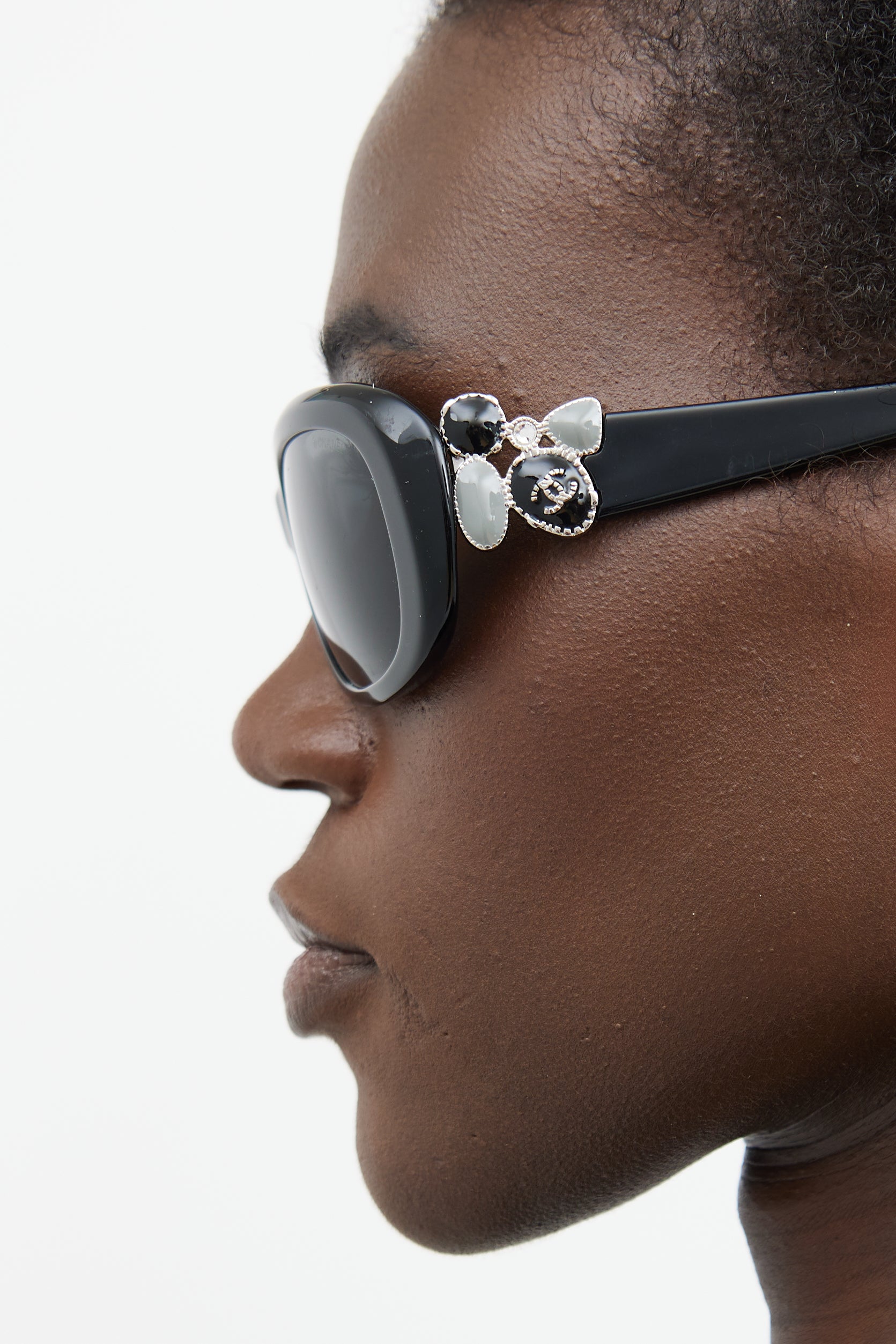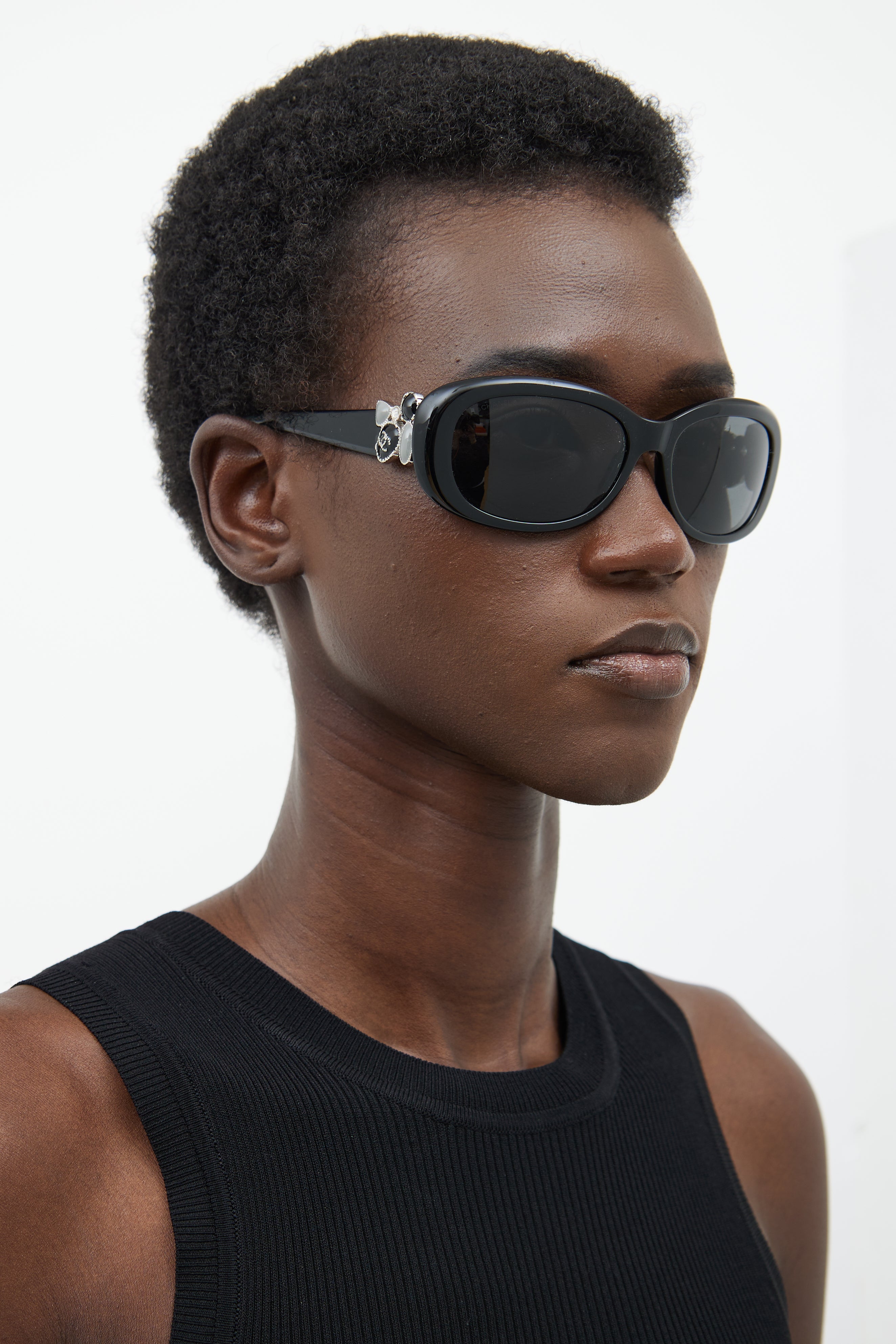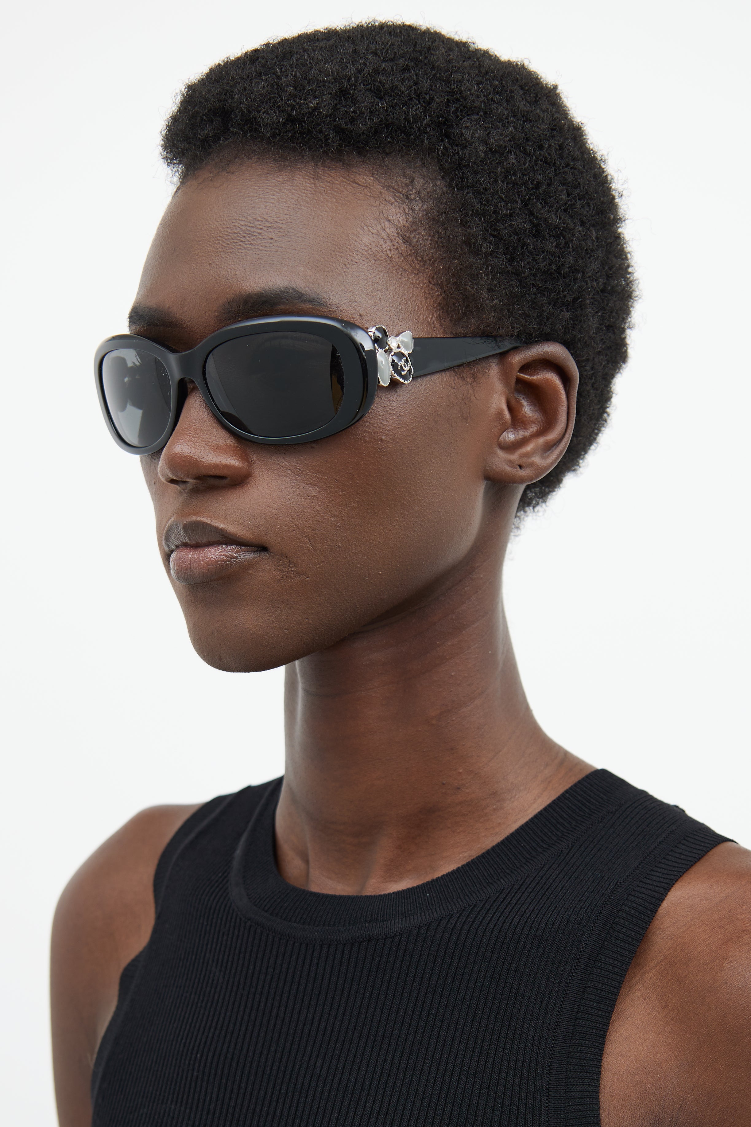 Pre-owned Chanel black 5181-B sunglasses featuring an oval frame, black and grey faux stone detailing at temple with logo hardware, and nose pads.