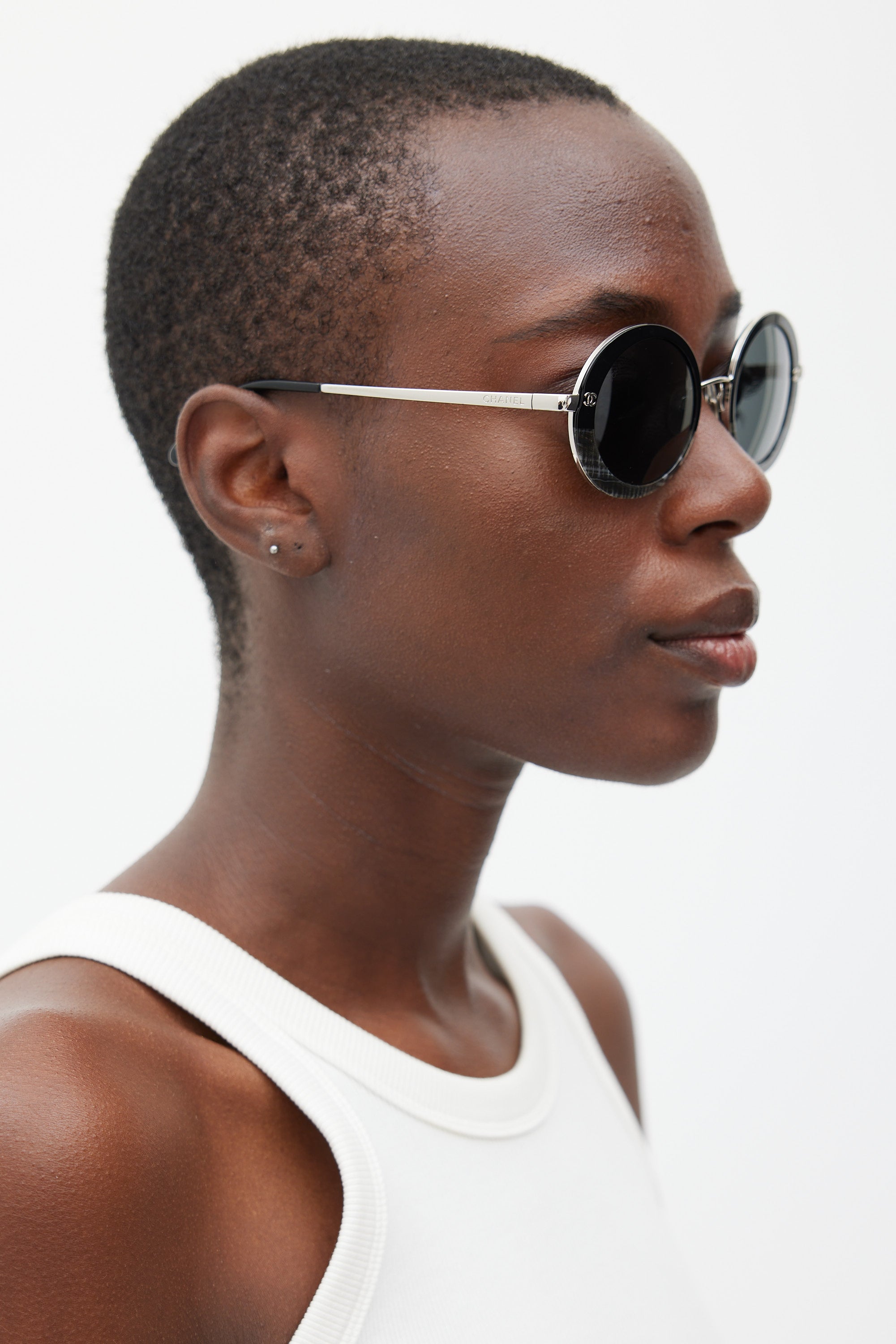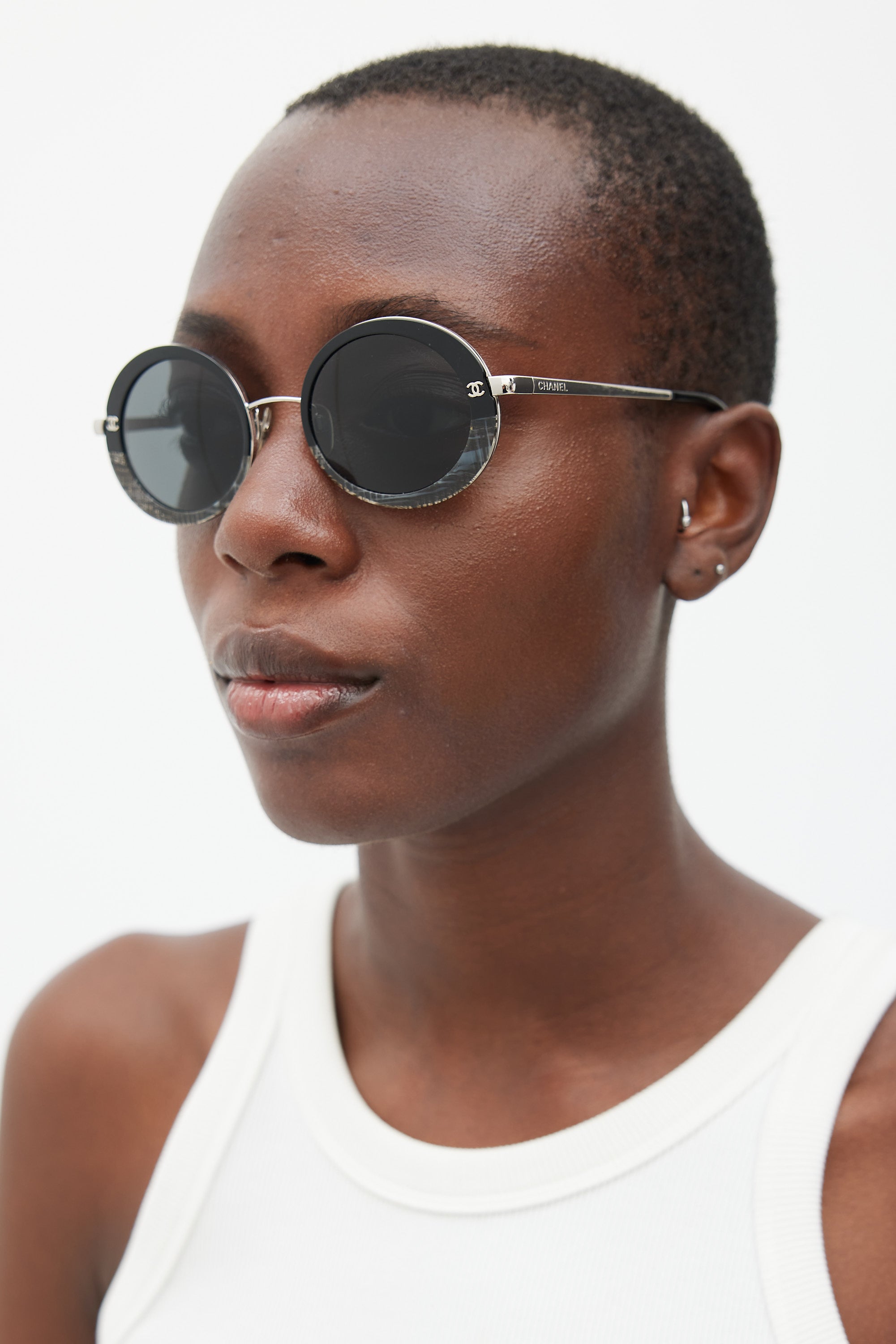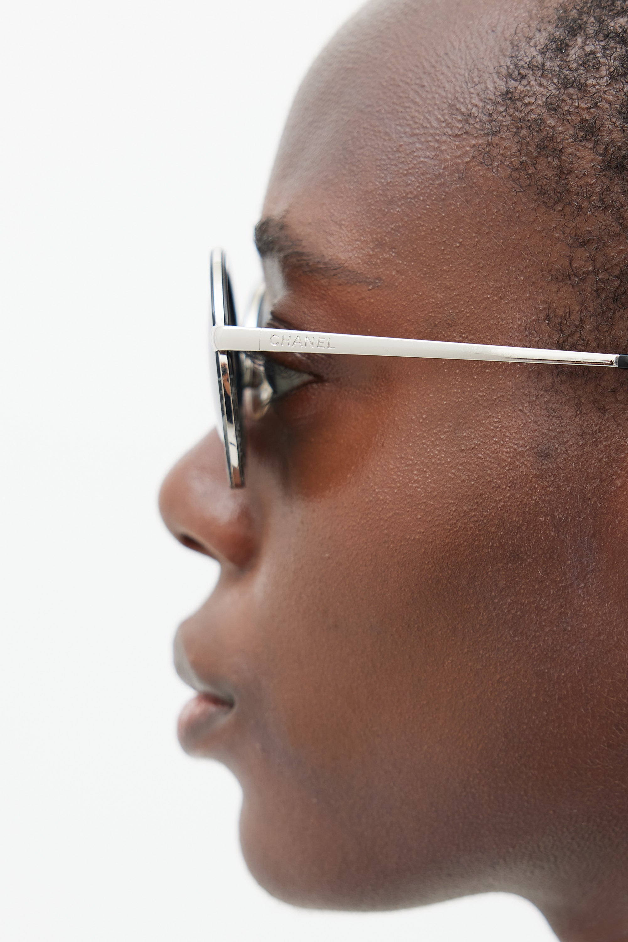 Pre-owned Chanel 4182 sunglasses featuring a circular frame, tinted lenses, nose pads, silver tone arms, and embossed logo at temples.