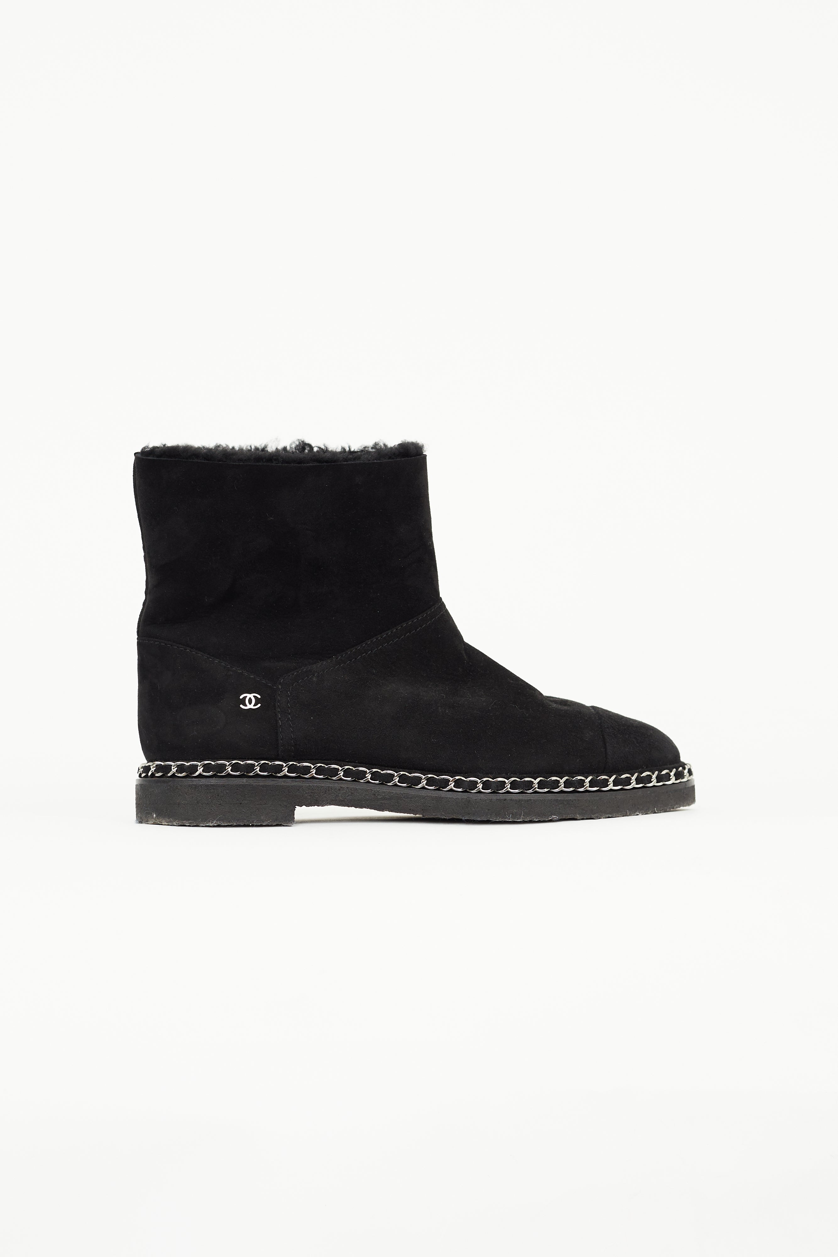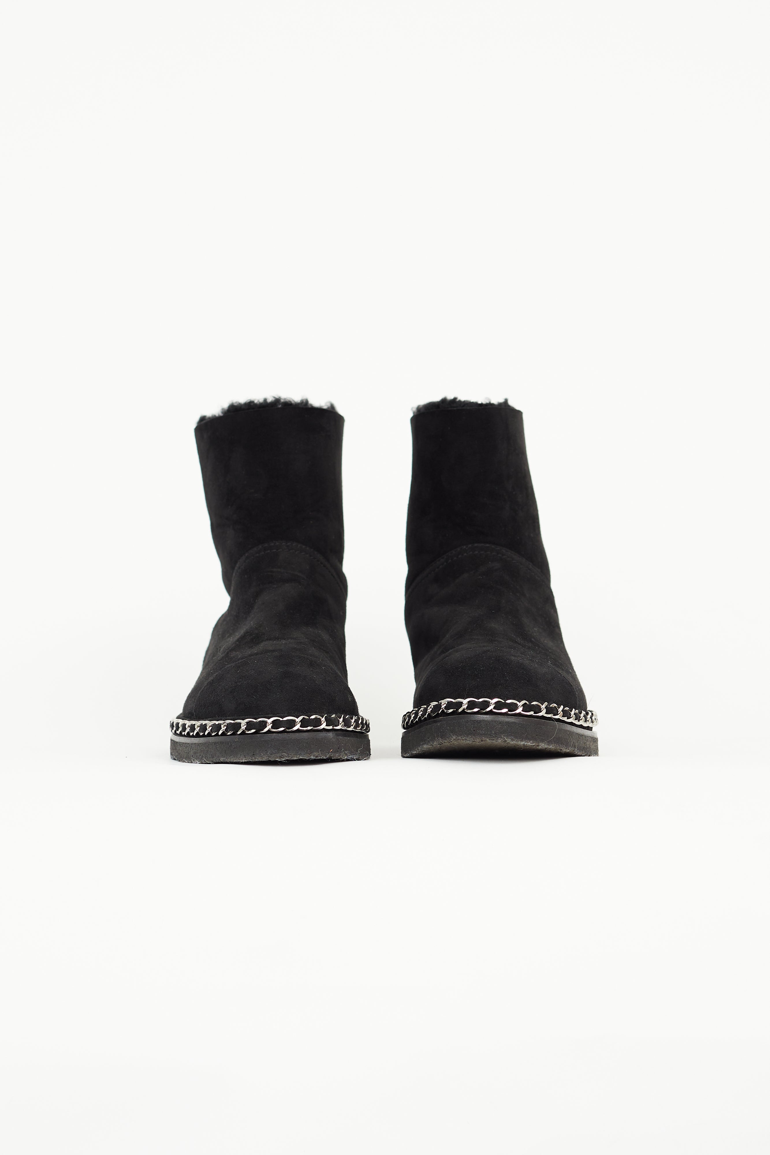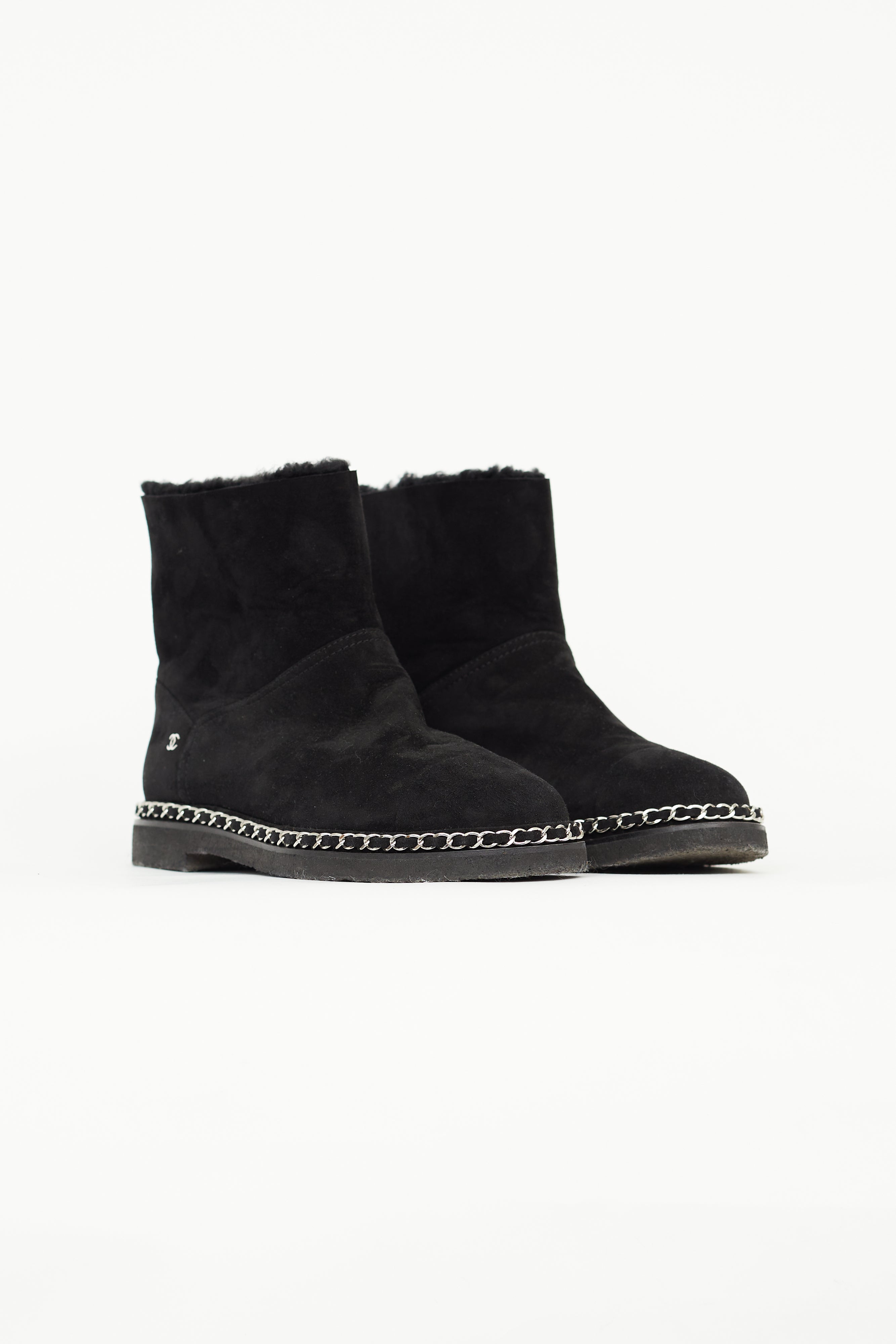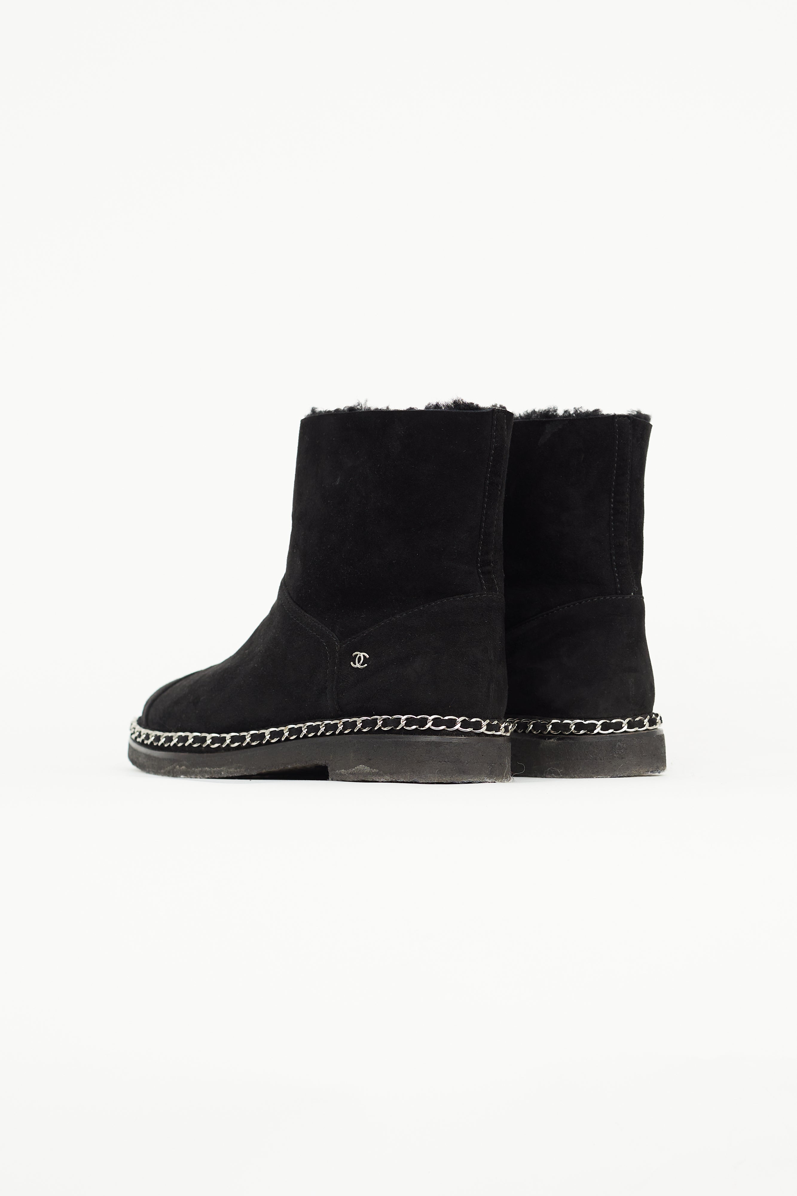 Pre-owned Chanel black suede and shearling boots featuring a narrow rounded toe, tonal toe cap, ankle height shaft, black suede upper, shearling lined interior, woven silver tone chain trim detail around midsole and a silver tone CC logo at outer heel. Comes with original dust bag.