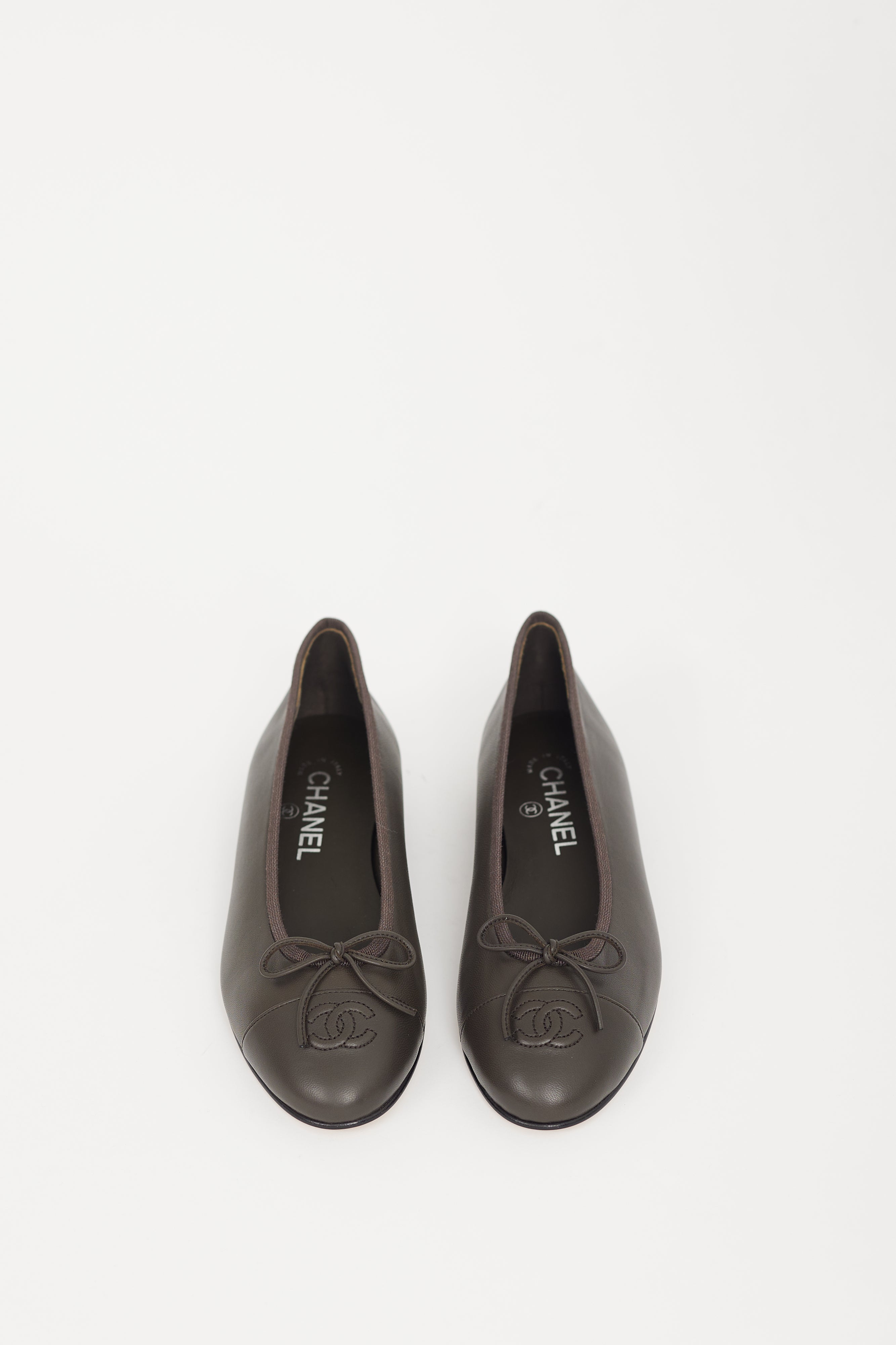 Pre-owned Chanel brown leather ballet flats featuring a round cap toe with tonal CC logo embroidery, bow at collar, and stacked heel. Comes with original box.