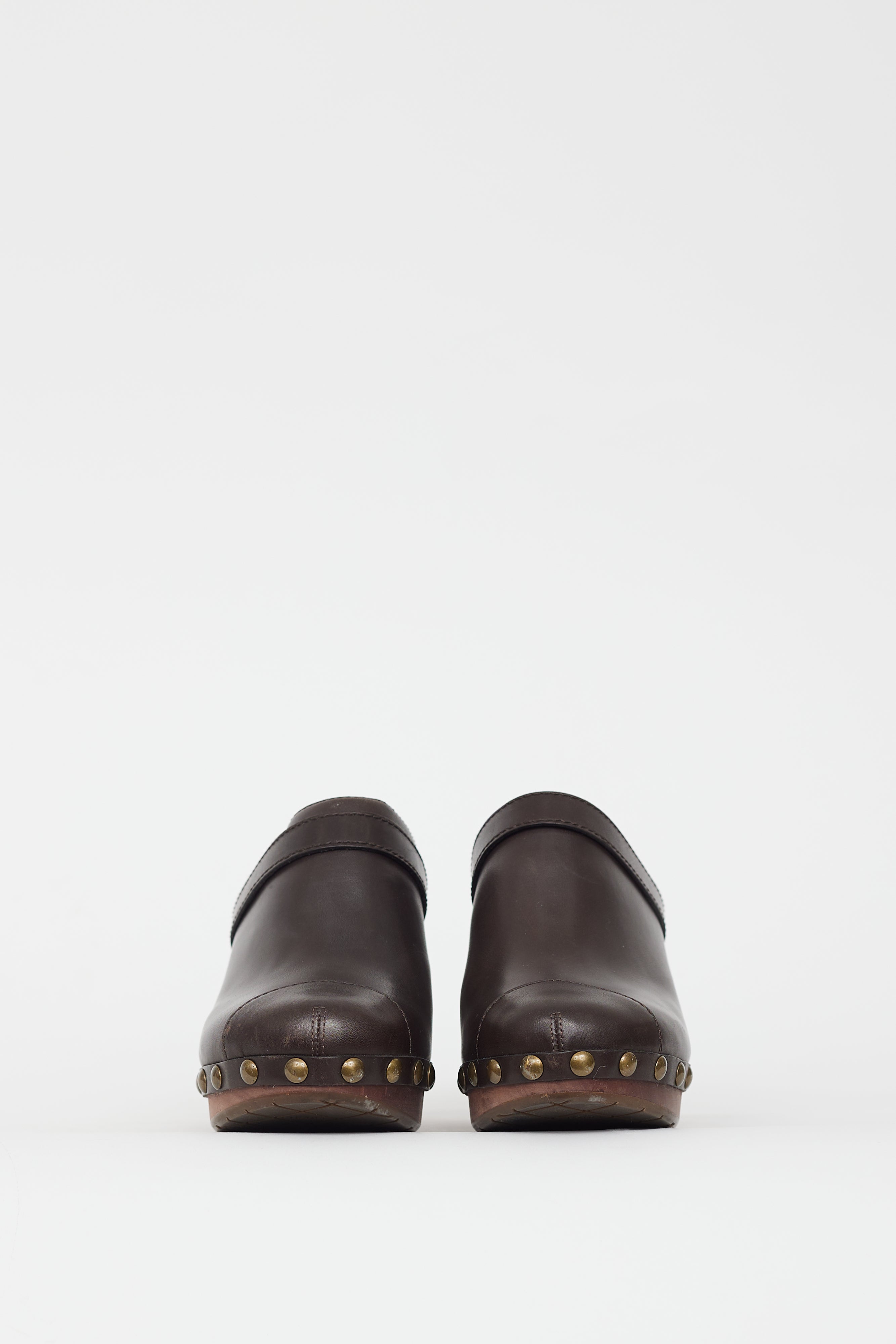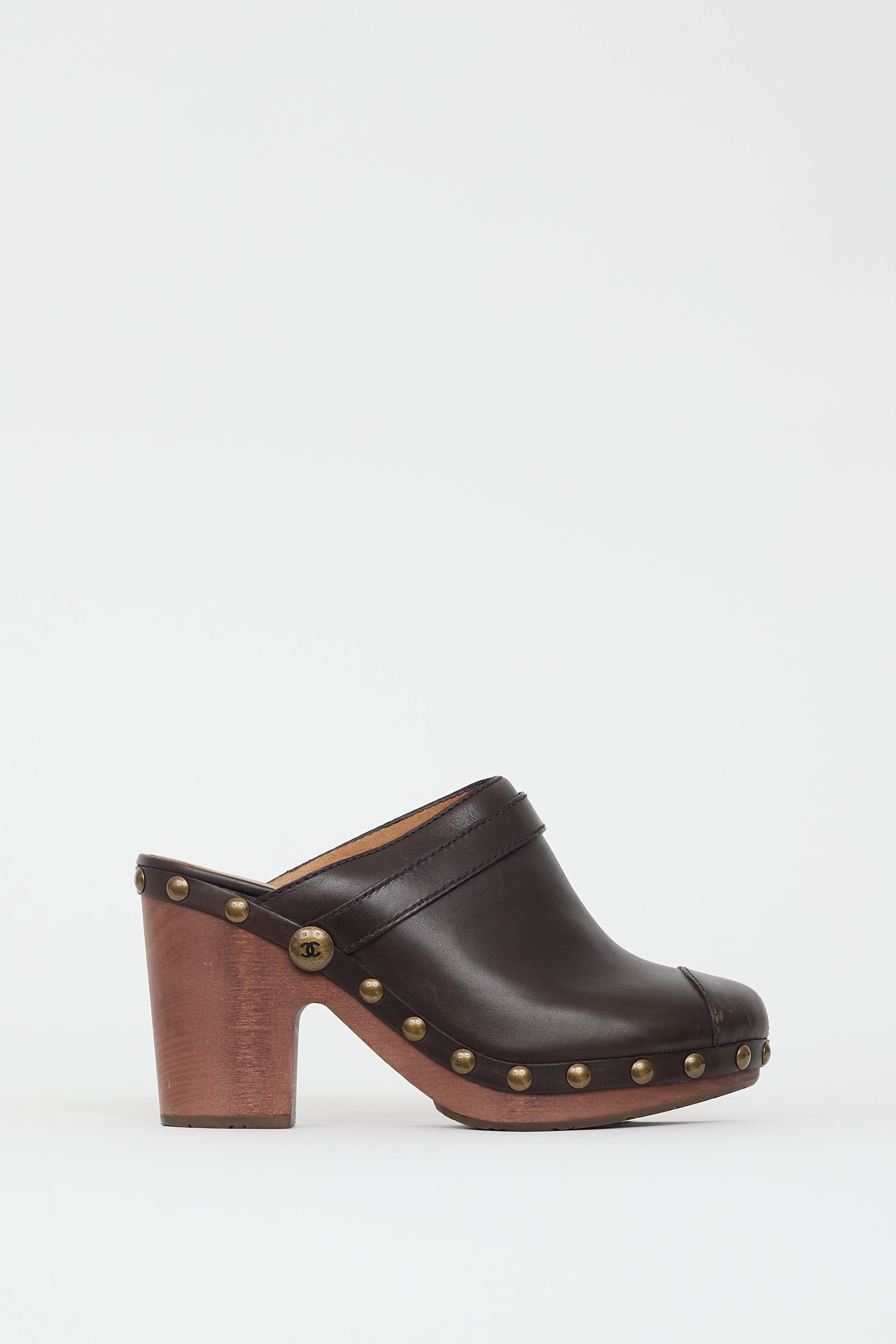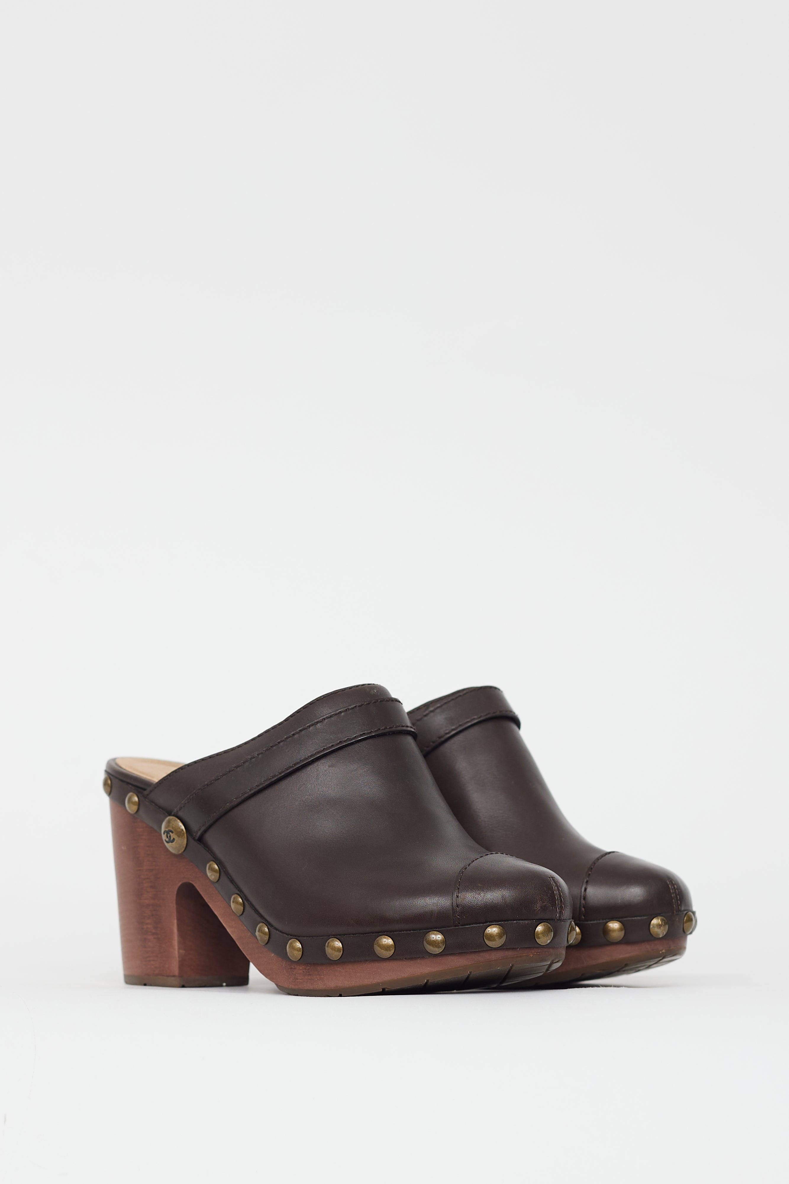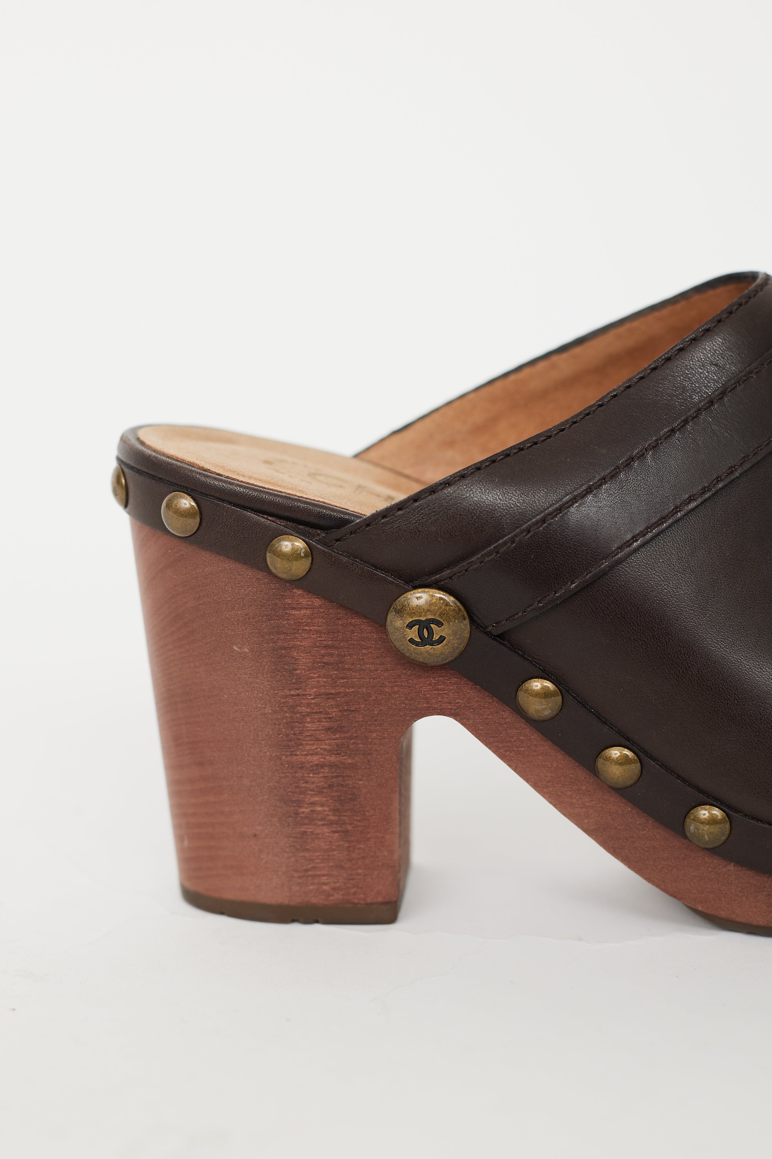Pre-owned Chanel brown leather mules featuring rounded toe, bronze toe hardware, CC logo at side midsole, suede insole, and wooden heel. Comes with original box.