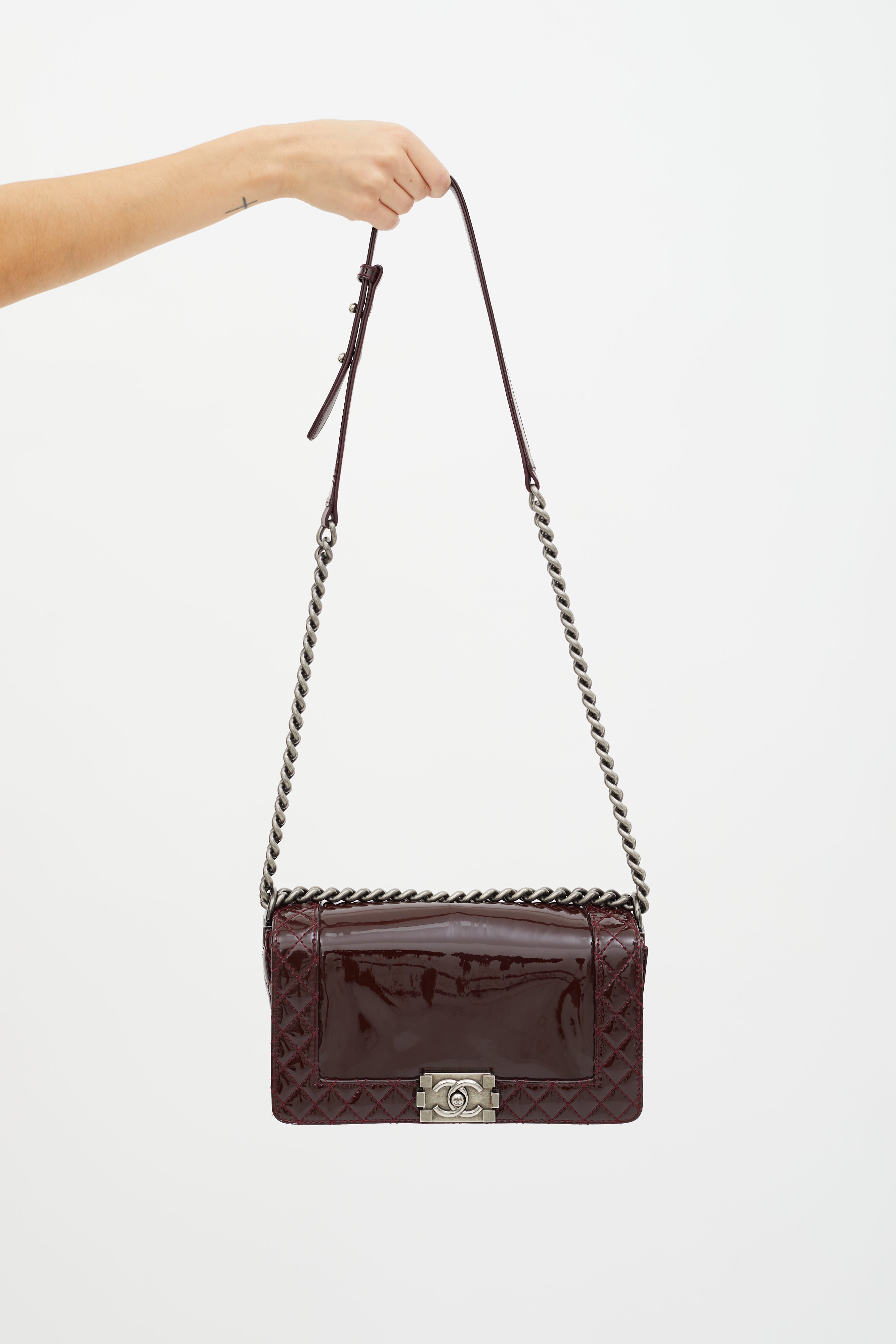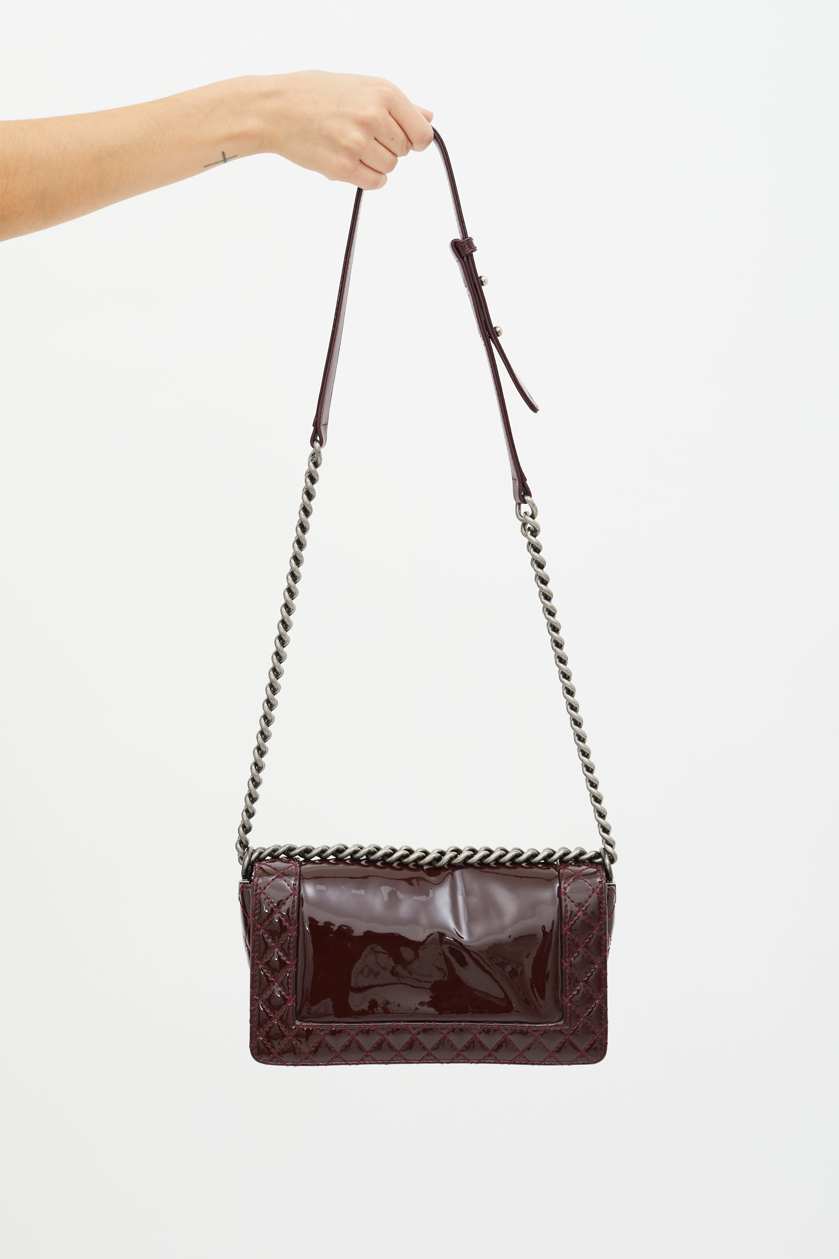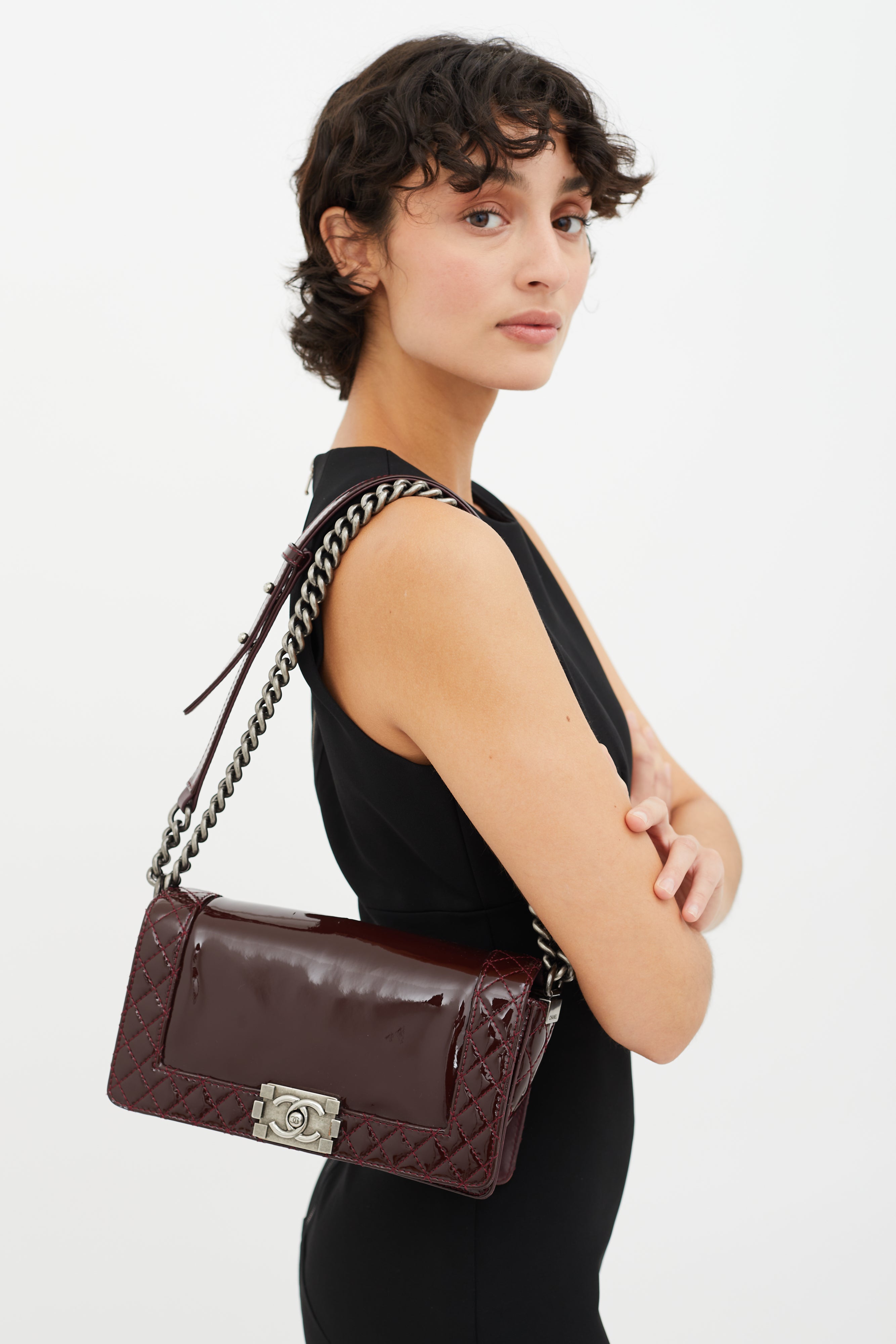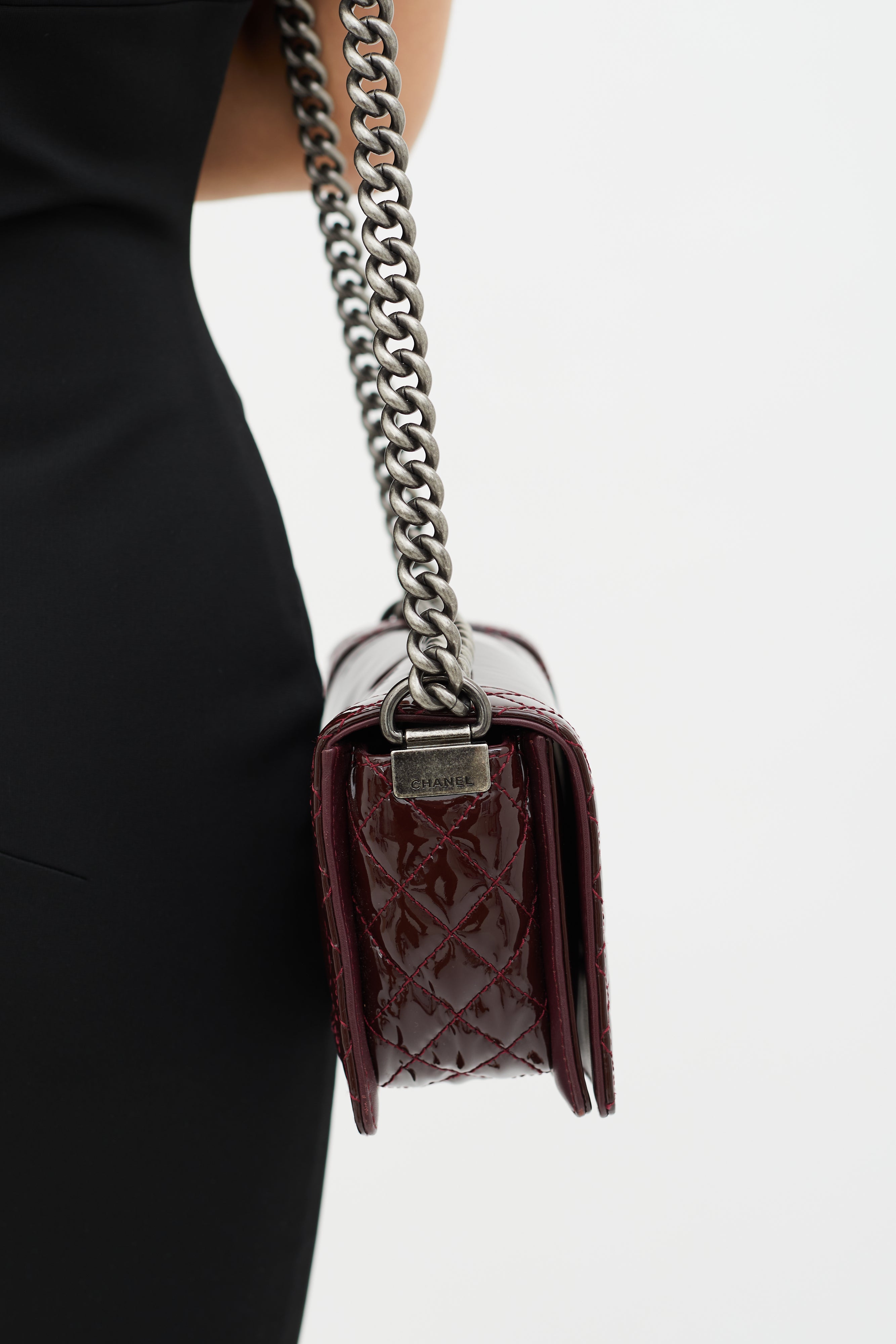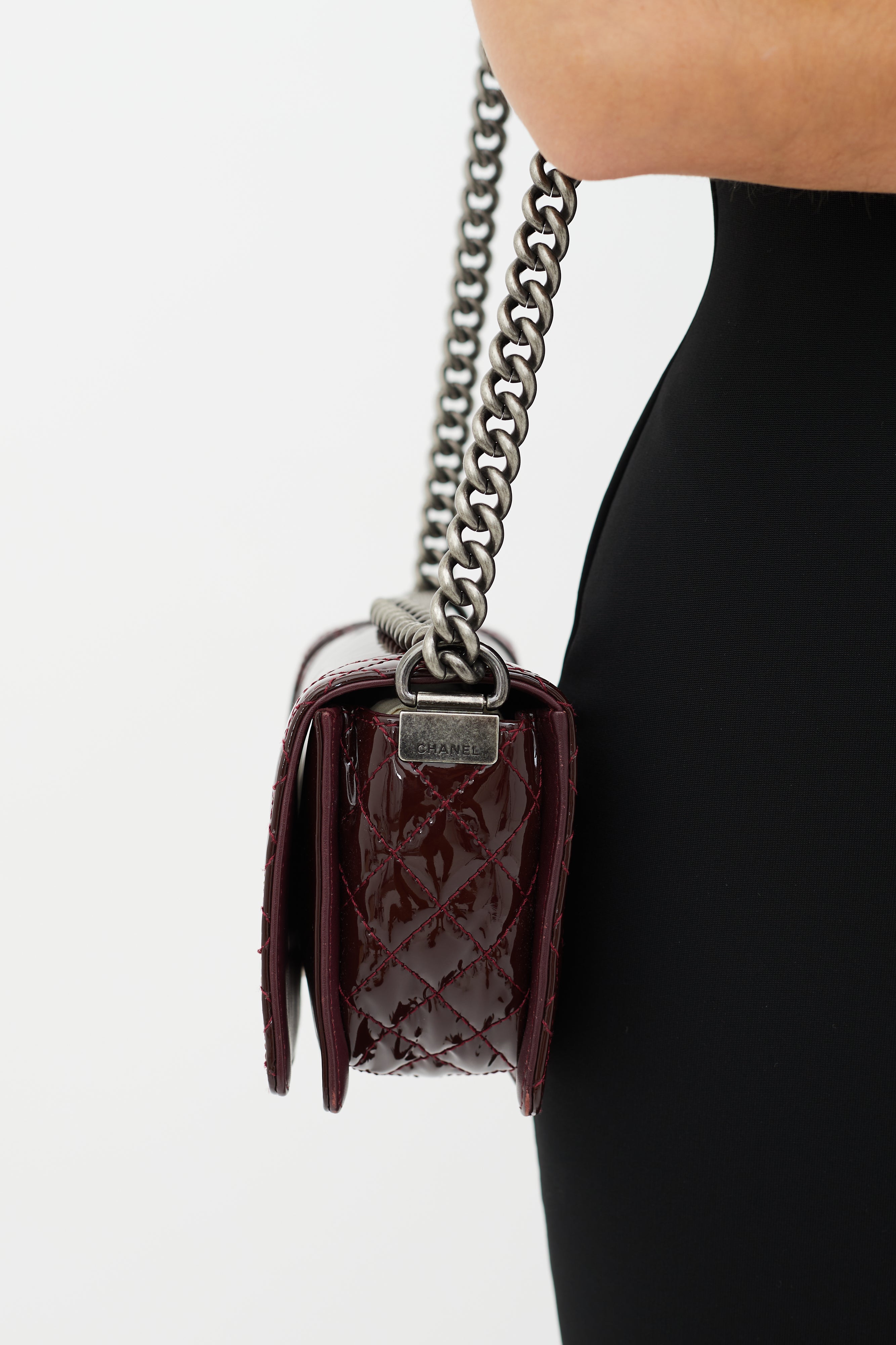 Pre-loved Chanel Reverse Boy Bag in patent burgundy featuring aged silver-tone hardware, interlocking CC side tab lock closure at face, tonal quilt stitching trim and body, two slip pockets at face and back, single compartment with nylon lining, two engraved plaques at sides and chain strap that can be worn two different ways.