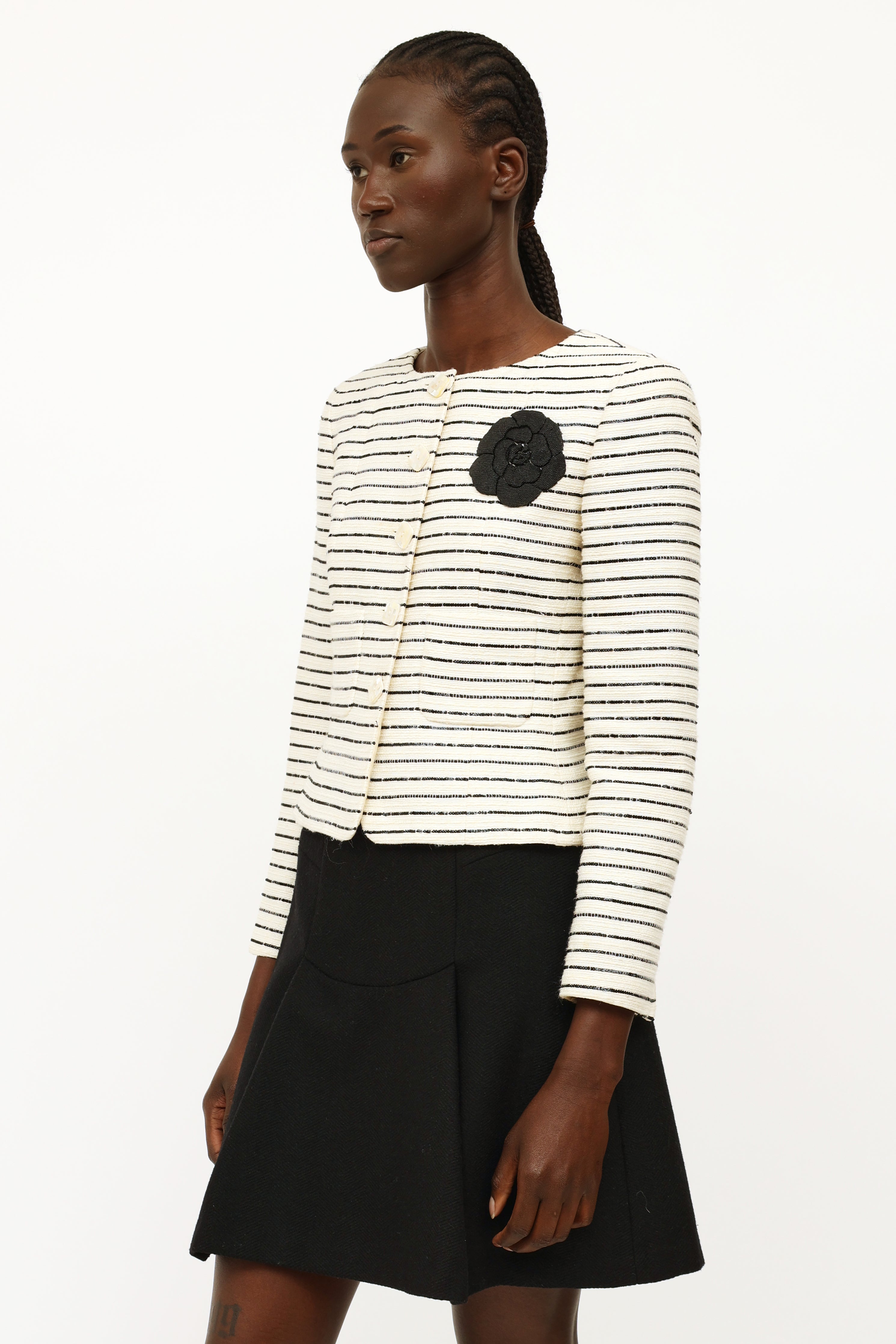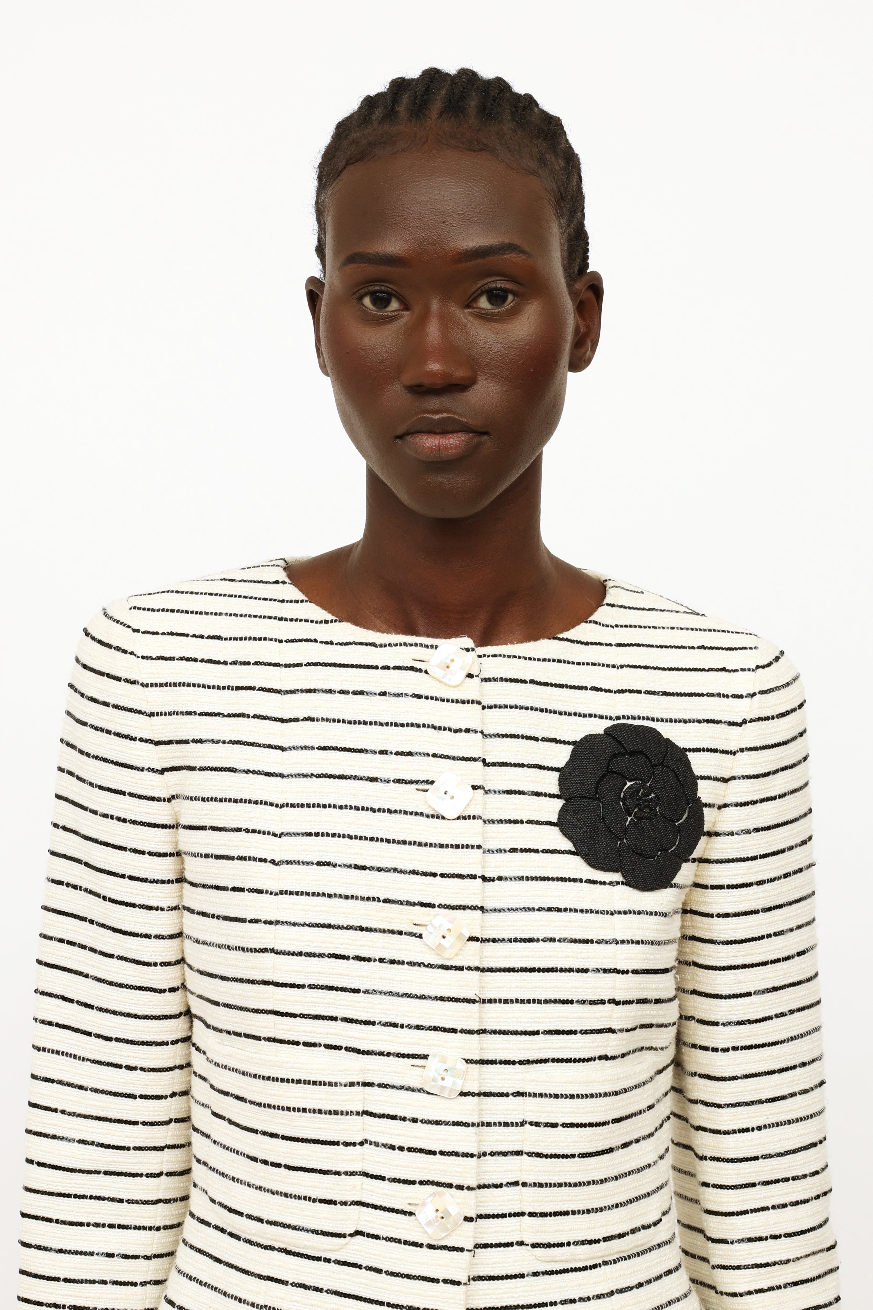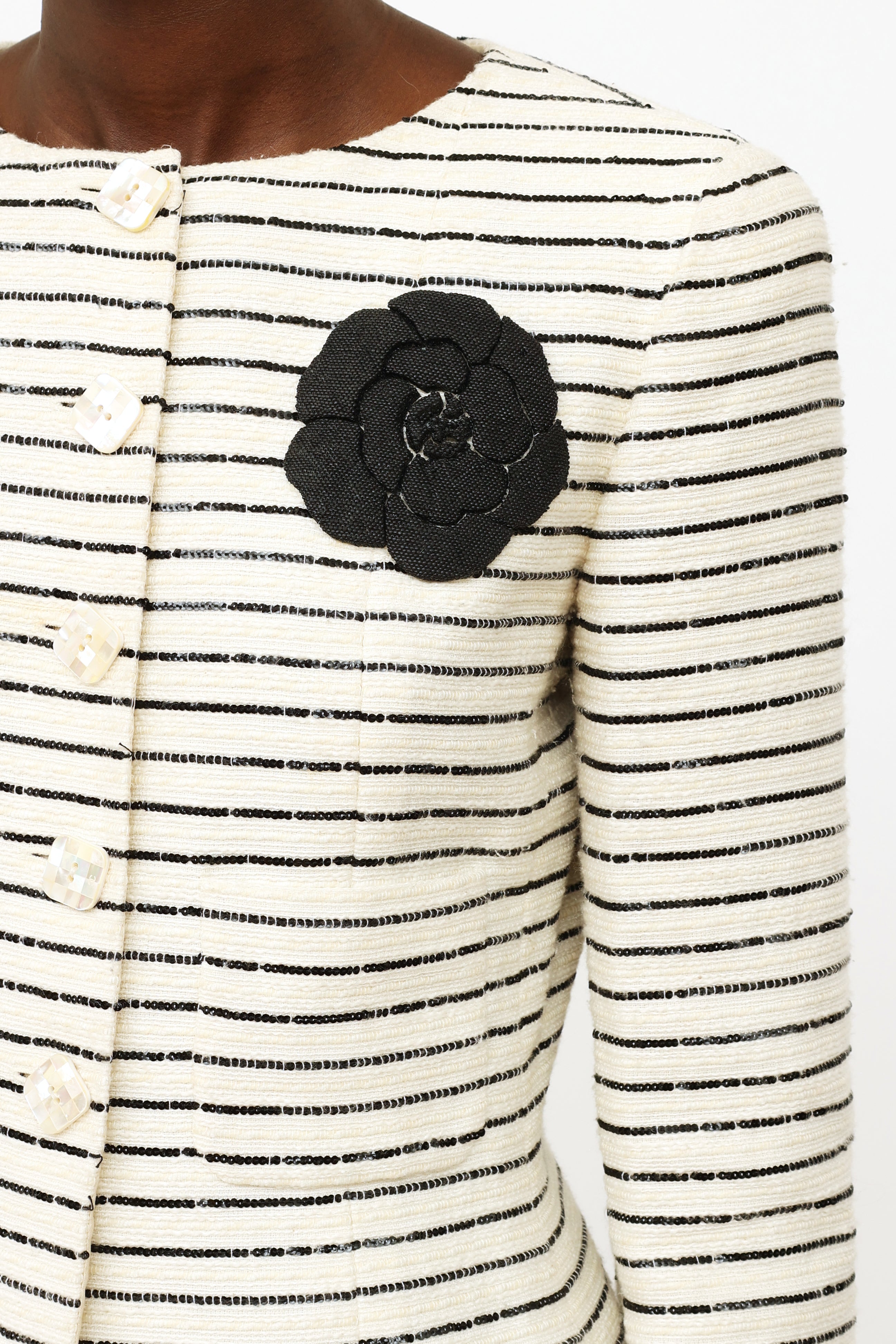 Pre-owned Chanel cream and black sequin Camelia blazer featuring a collar less design, slightly padded shoulders, full length sleeves with slit cuffs, cream tweed and black sequin stripes throughout, button up closure at centre front, dual patch pockets and black Camelia flower applicque at left chest. Fully lined.
