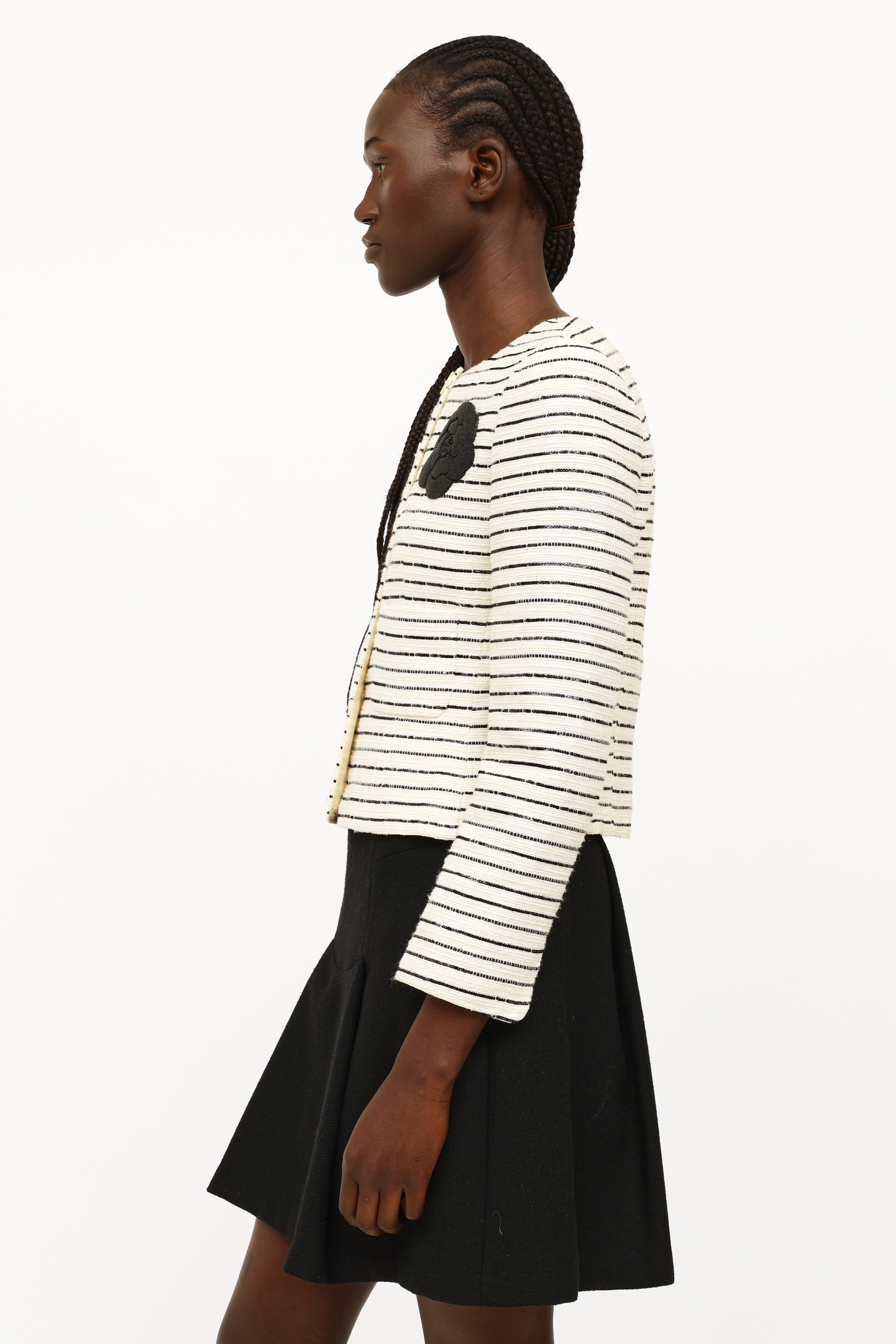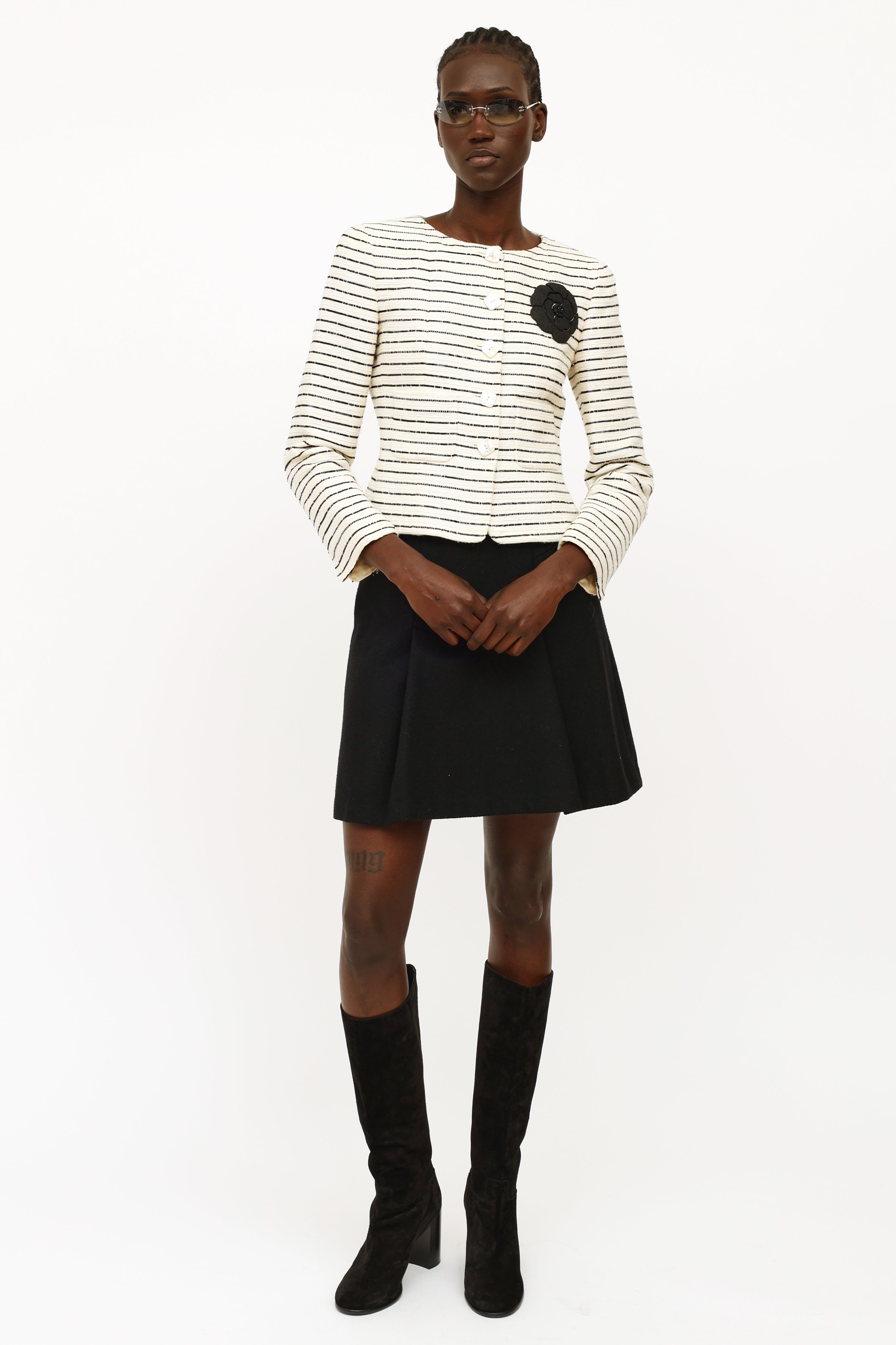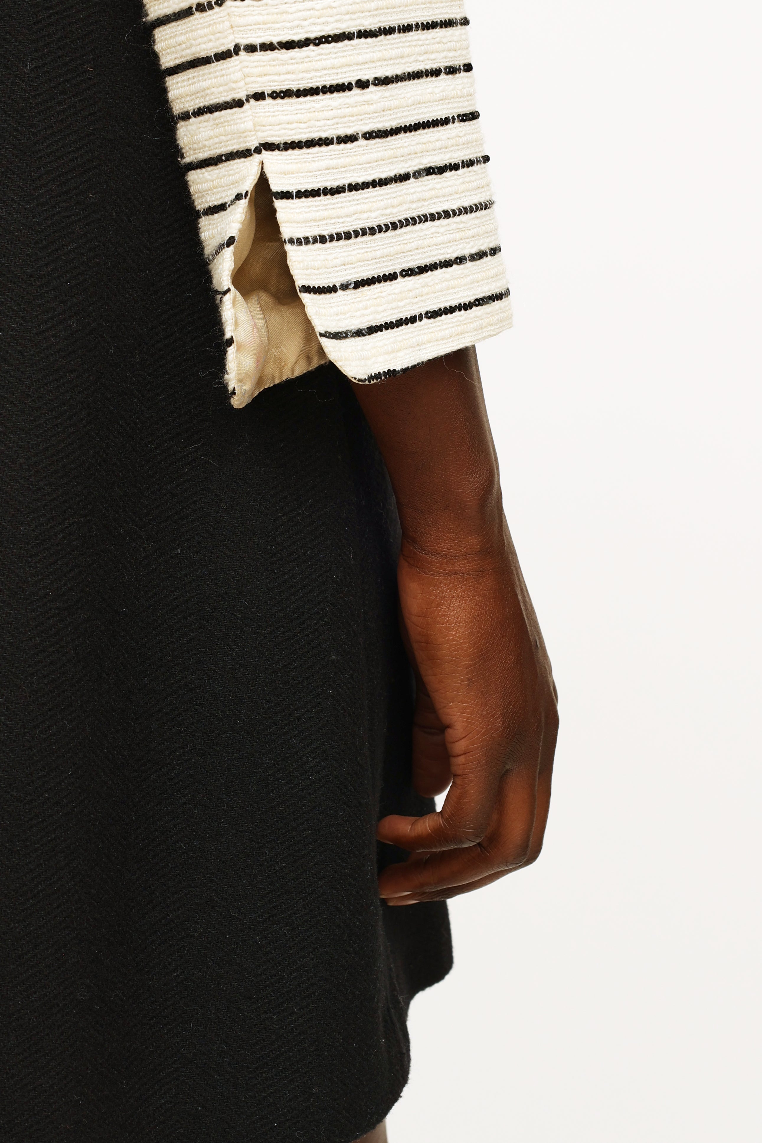 Pre-owned Chanel cream and black sequin Camelia blazer featuring a collar less design, slightly padded shoulders, full length sleeves with slit cuffs, cream tweed and black sequin stripes throughout, button up closure at centre front, dual patch pockets and black Camelia flower applicque at left chest. Fully lined.