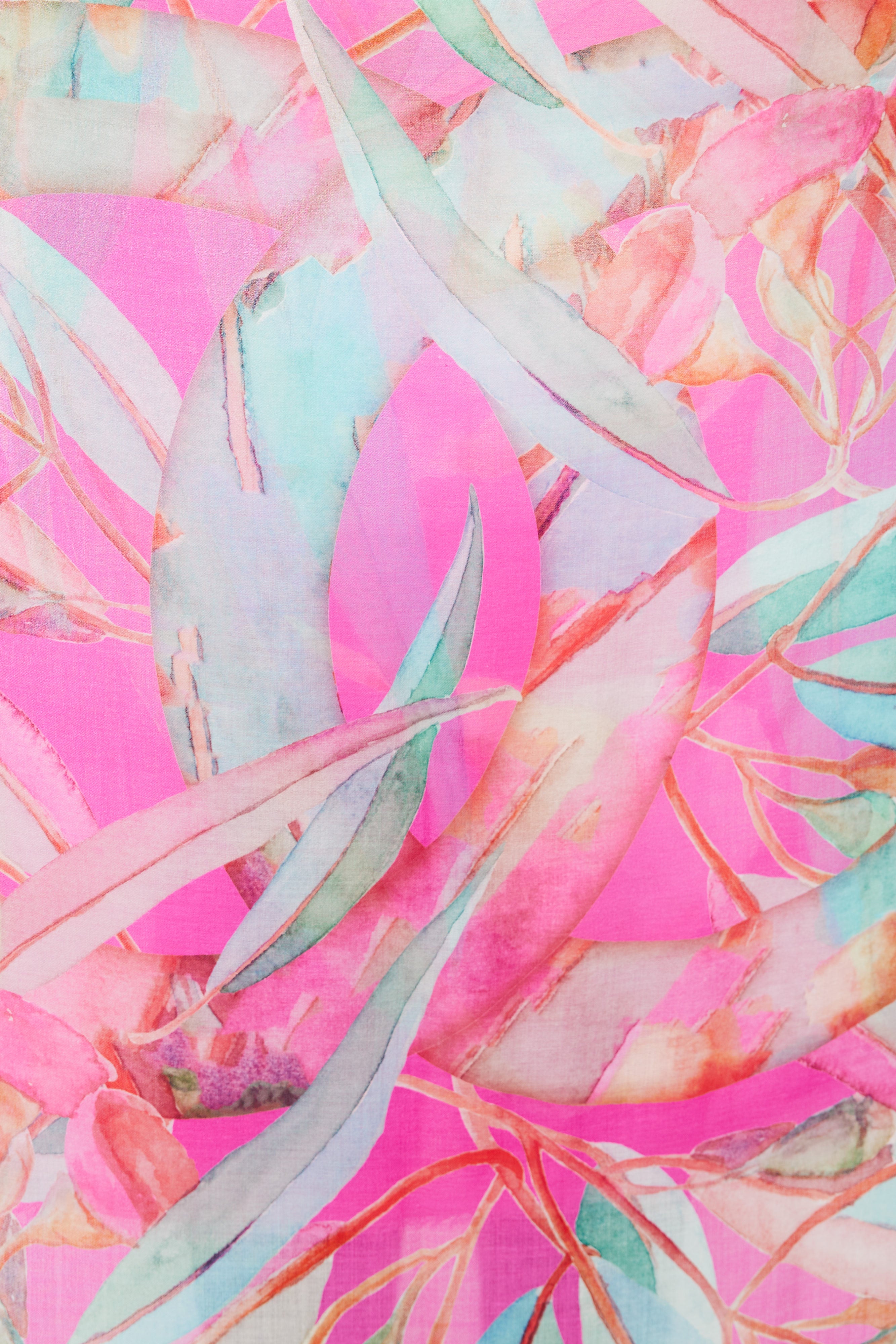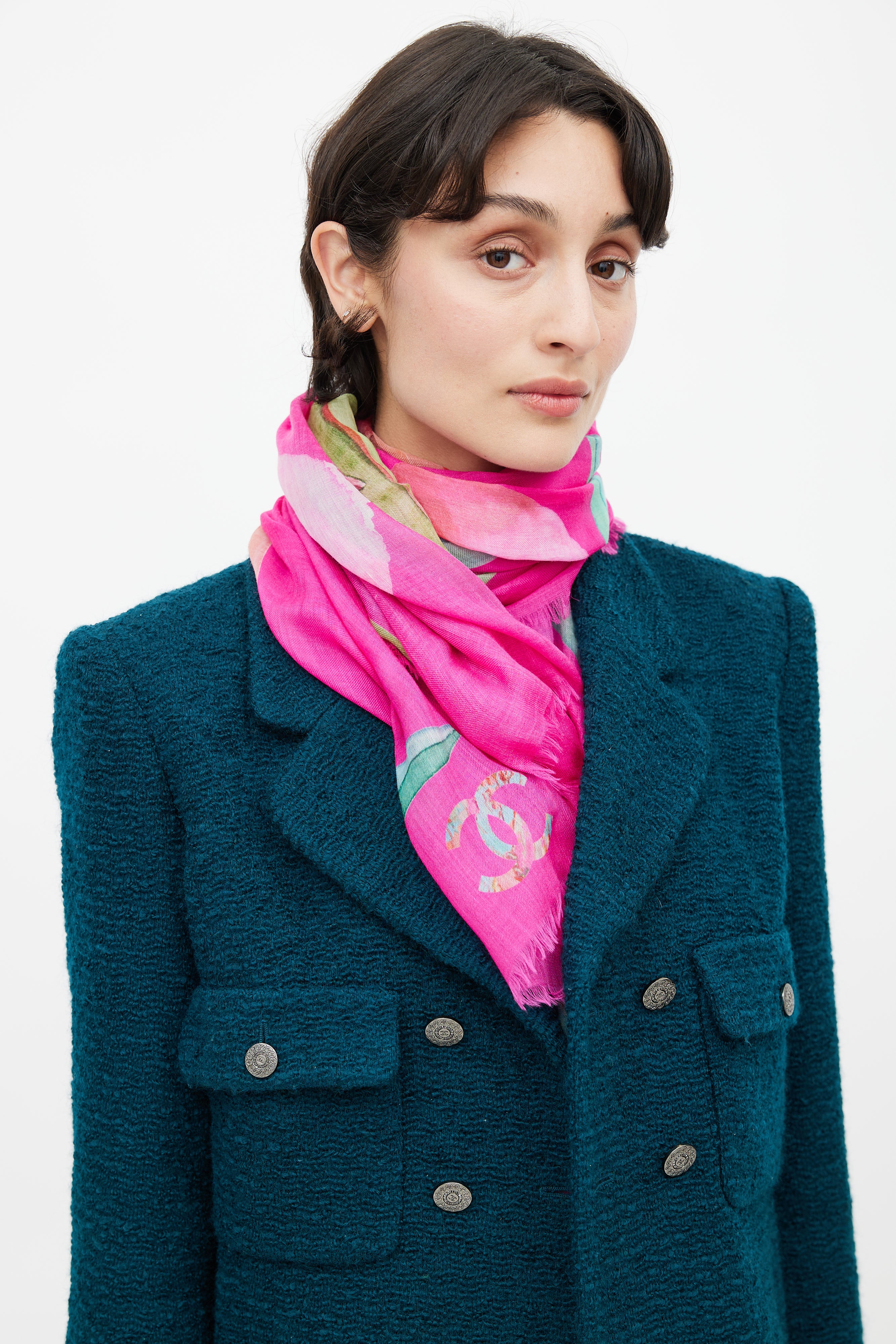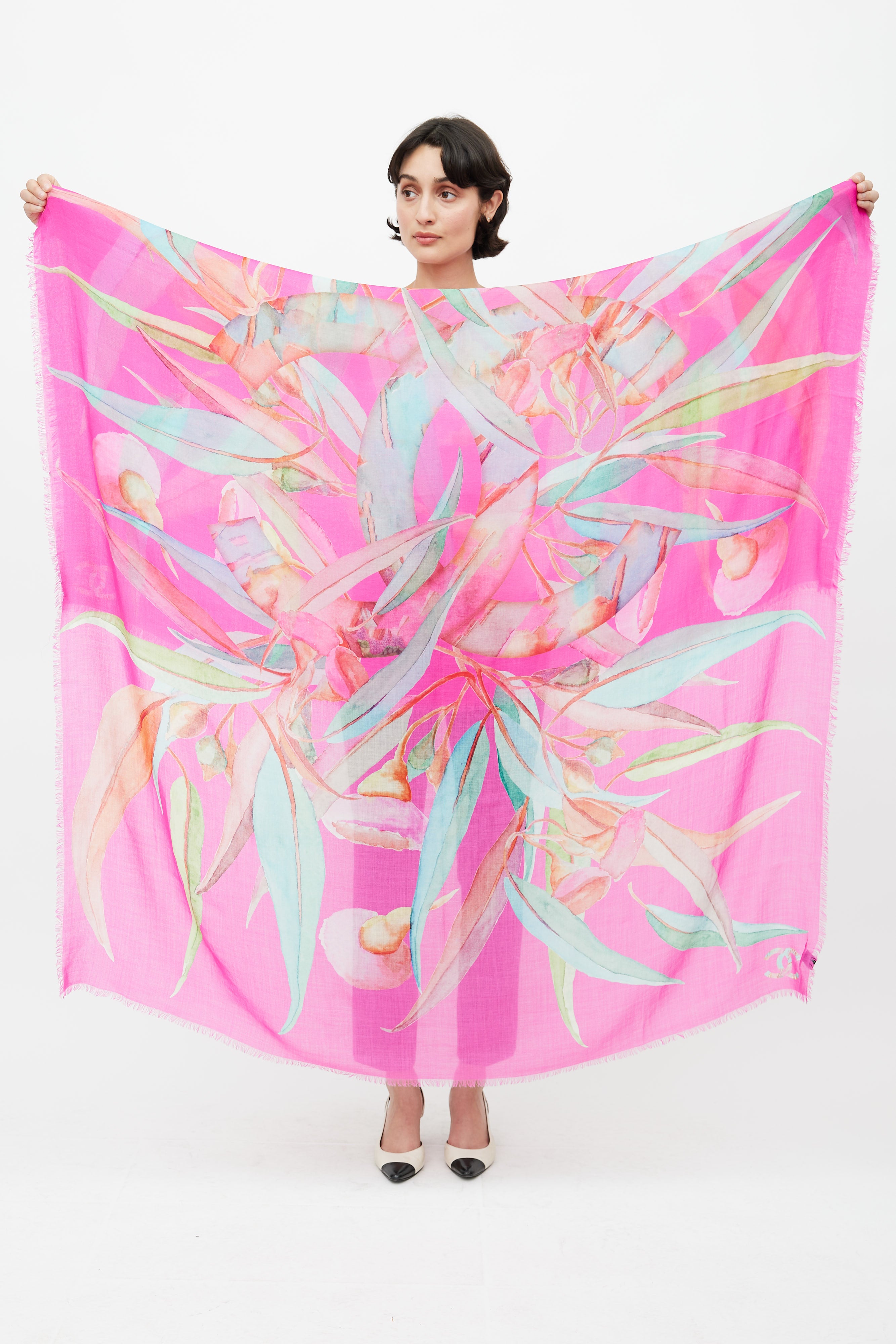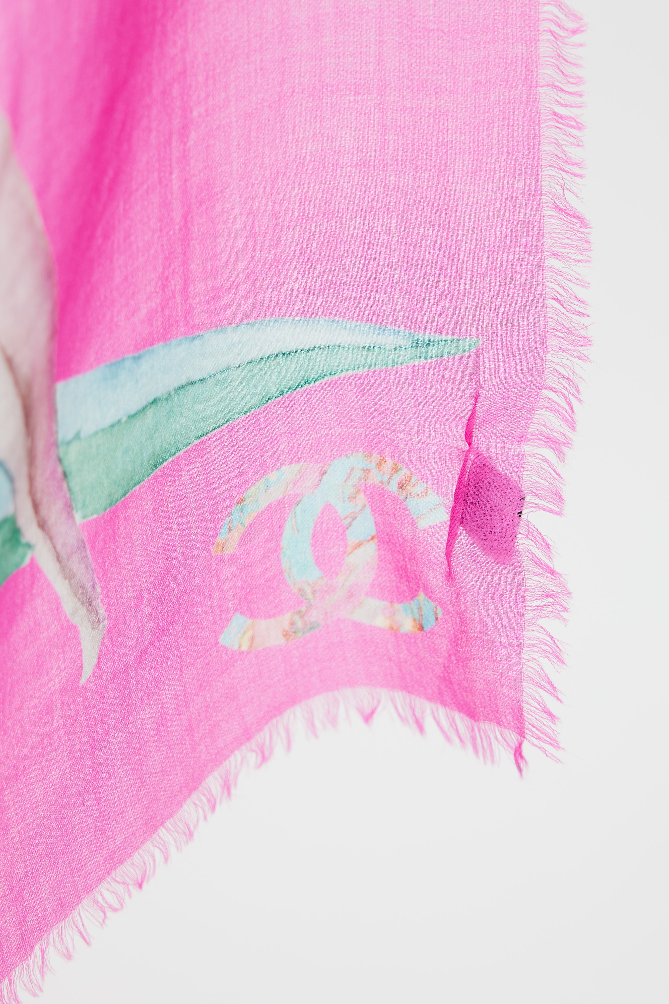 Pre-owned Chanel fuchsia scarf featuring multicolour floral print, fringe hem, and CC logo at corner. Comes with original box.