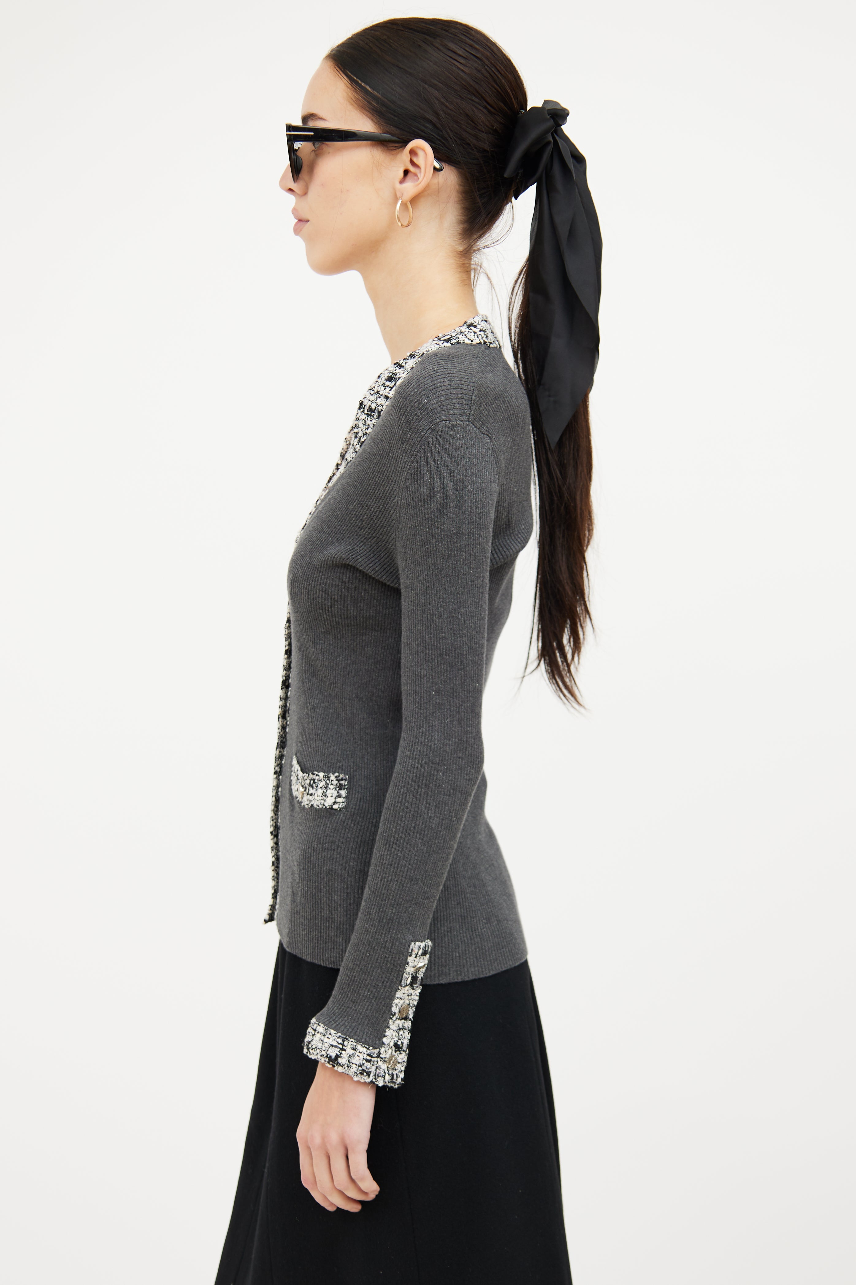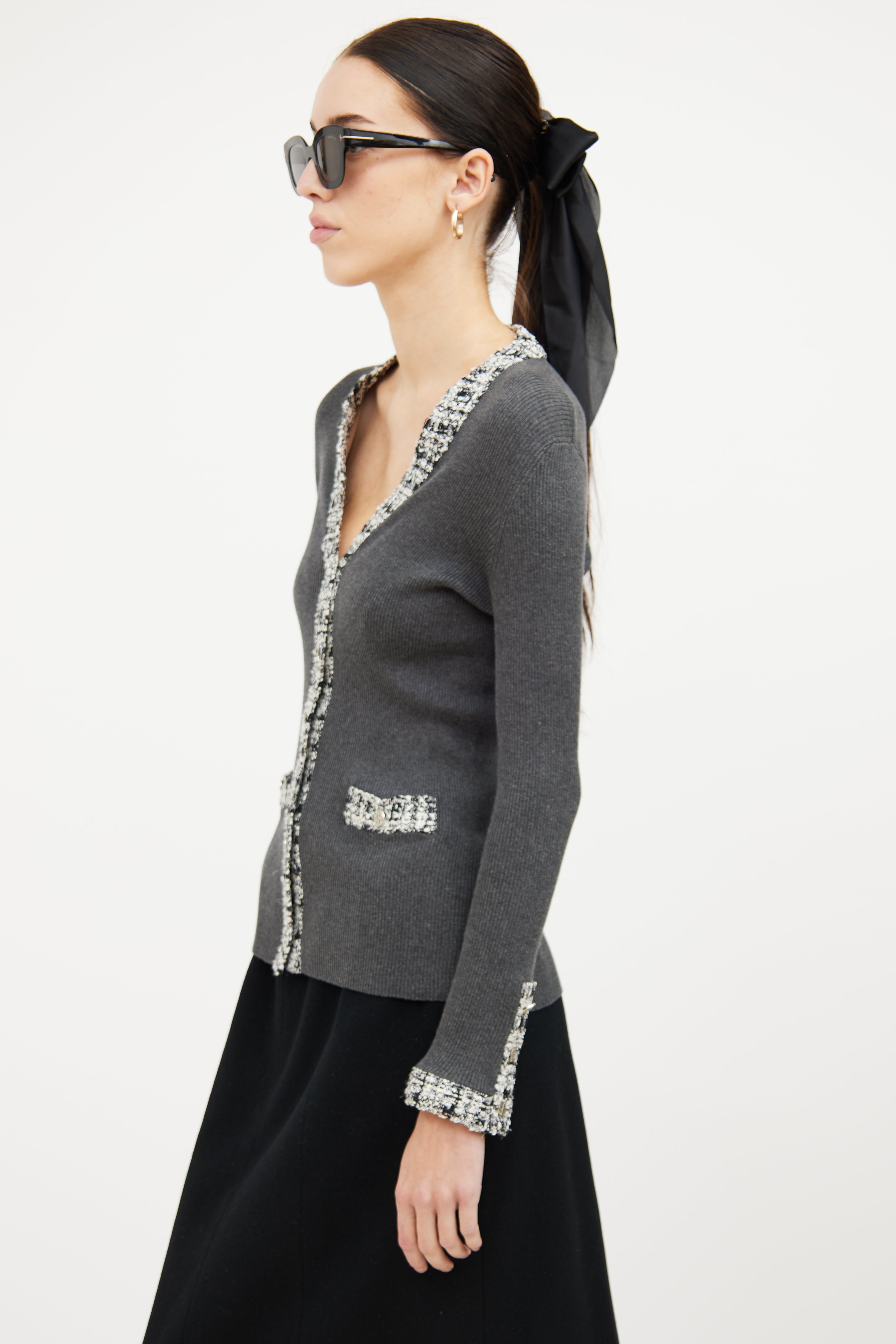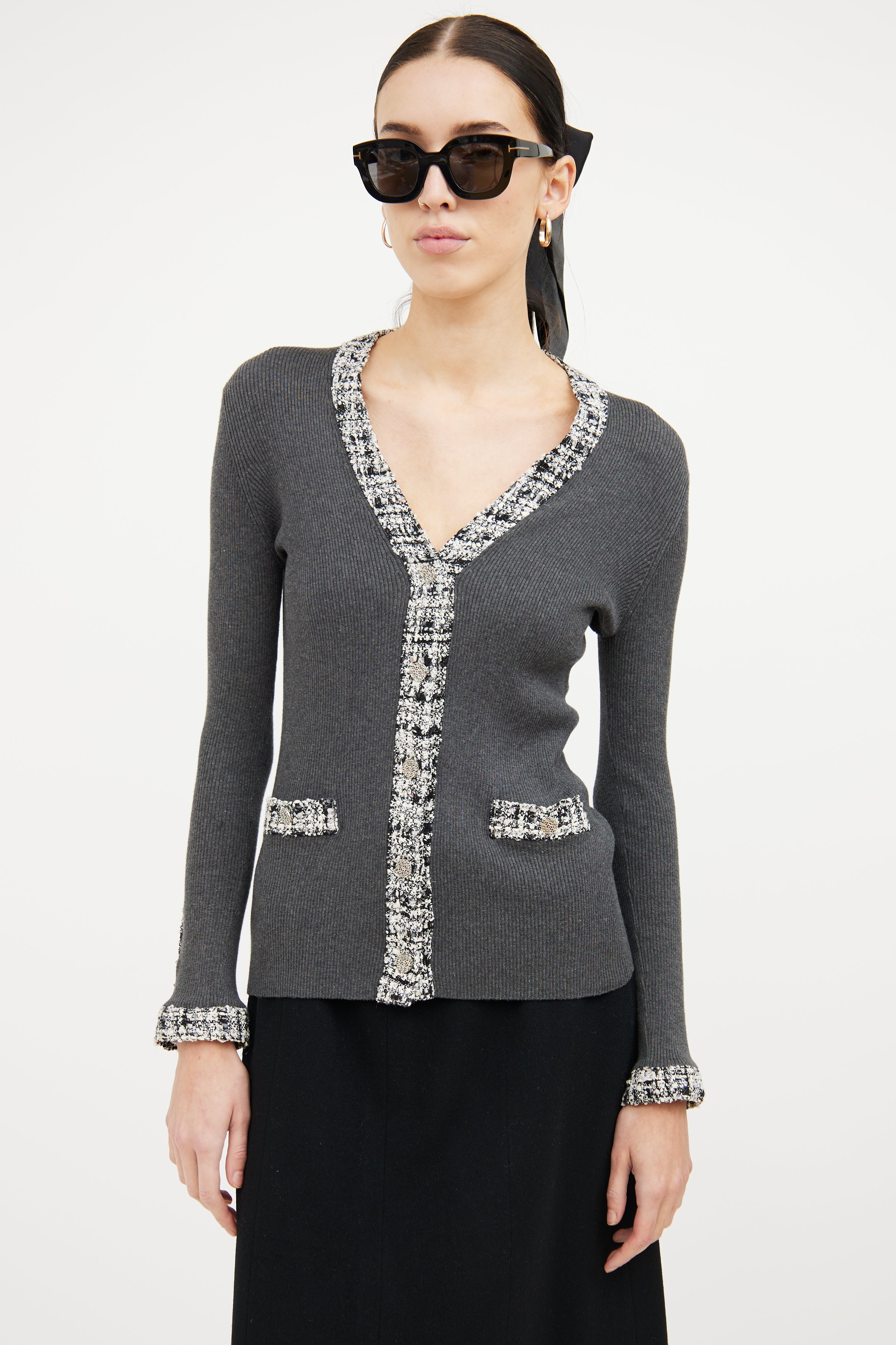 Pre-owned Chanel grey cardigan featuring black and white tweed trim, V neckline, CC logo embossed button closure at front, flat pockets at waist, and three button closure cuffs.