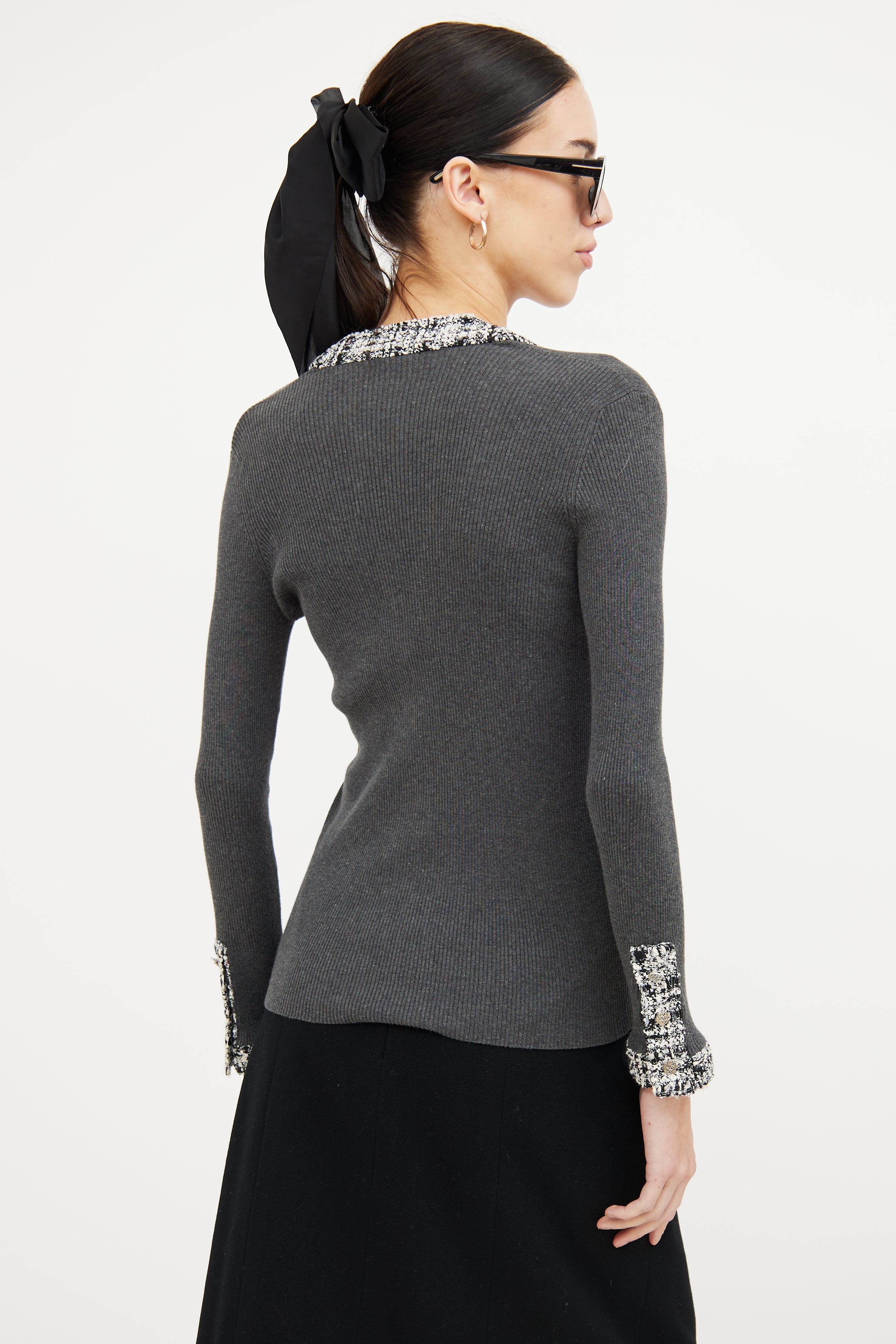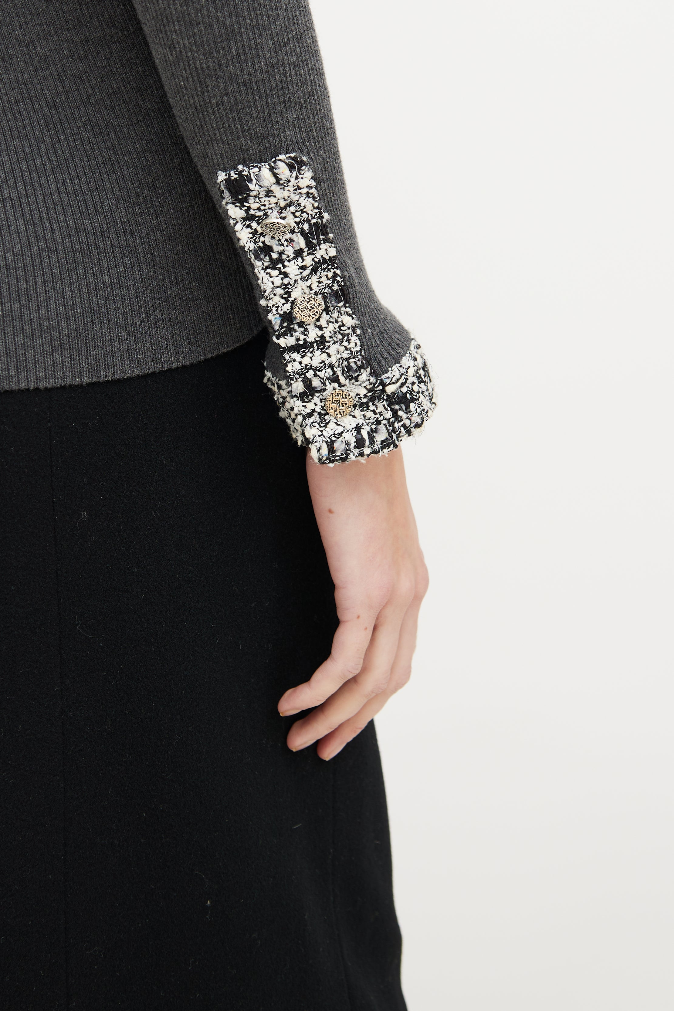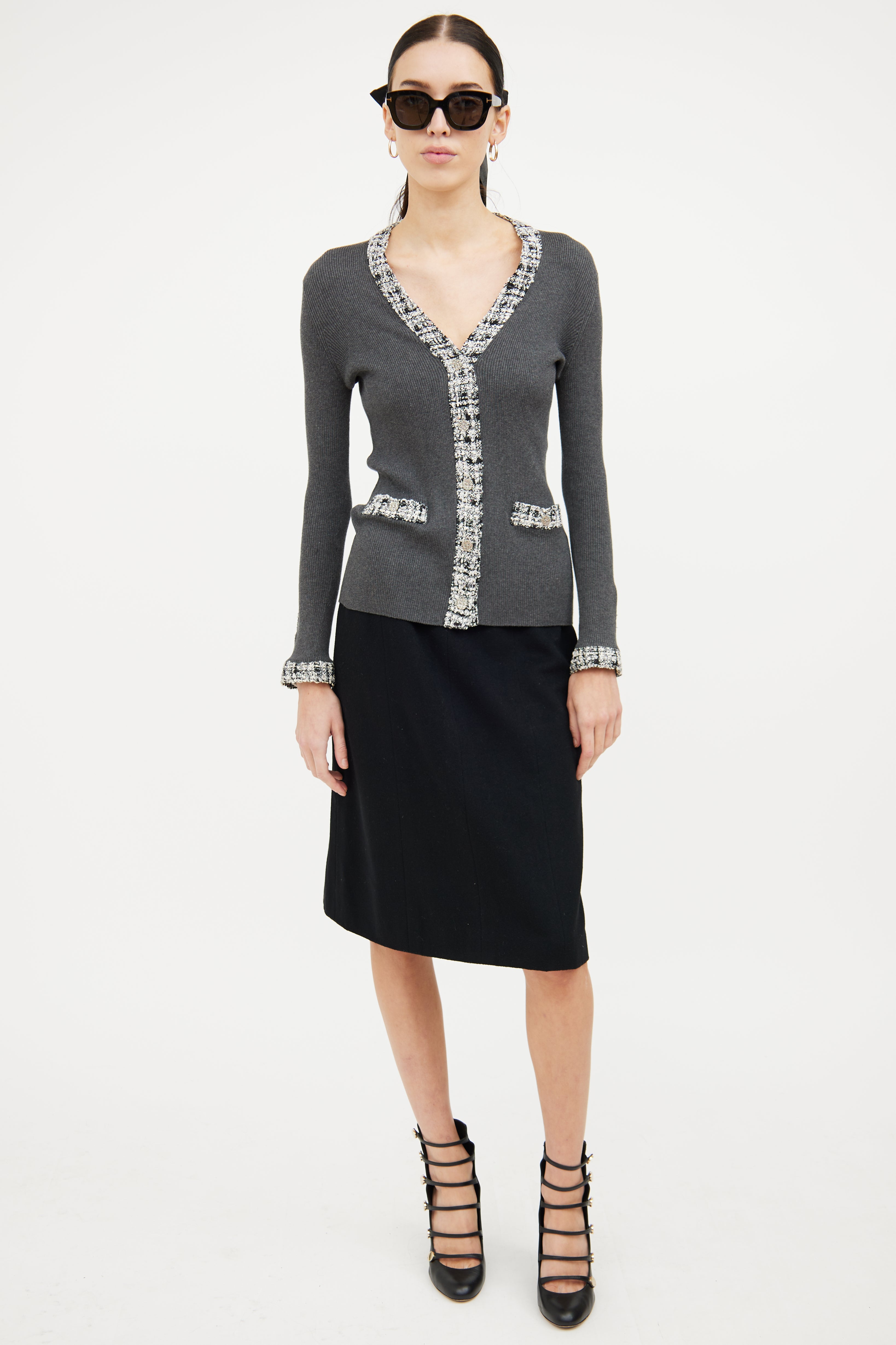 Pre-owned Chanel grey cardigan featuring black and white tweed trim, V neckline, CC logo embossed button closure at front, flat pockets at waist, and three button closure cuffs.