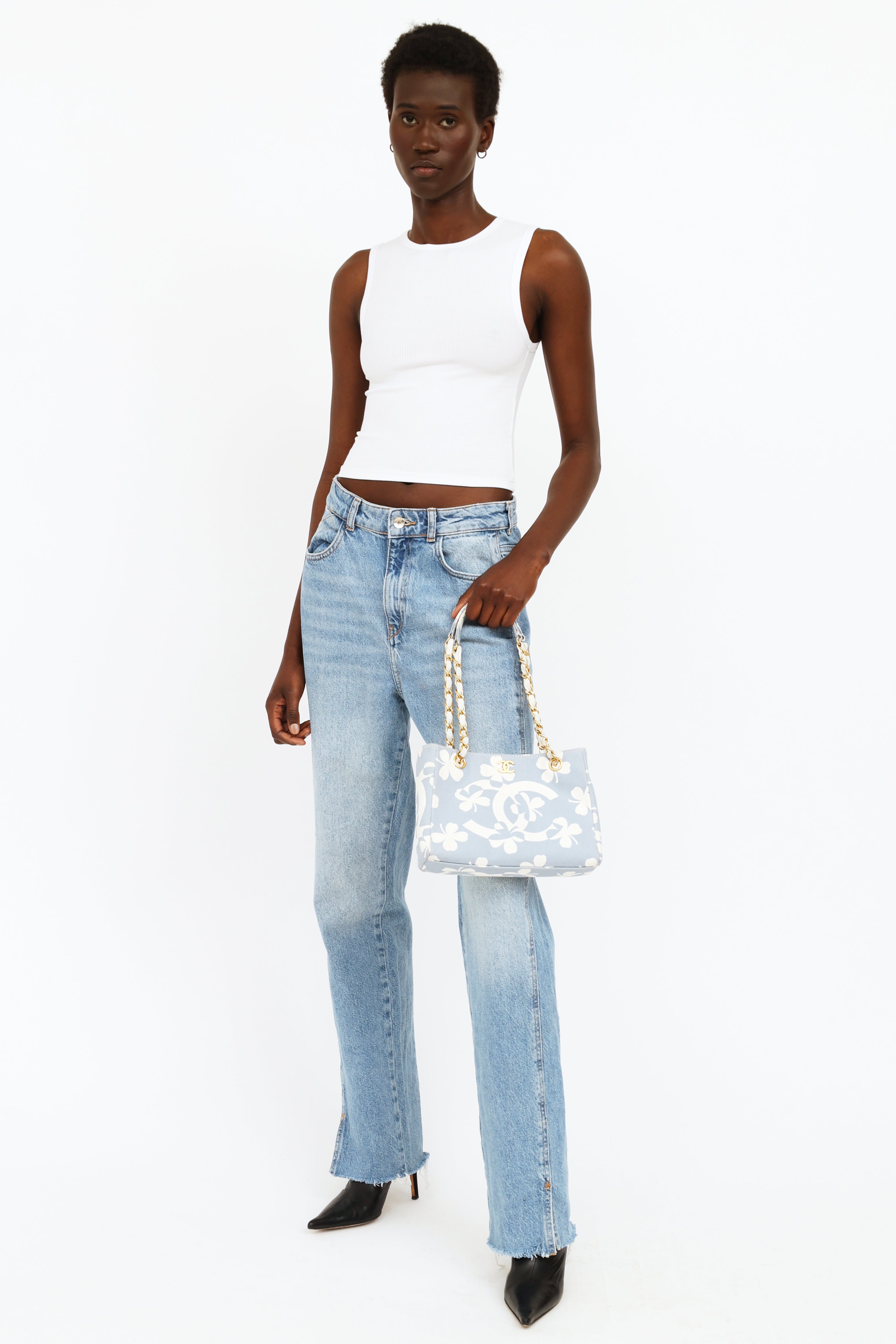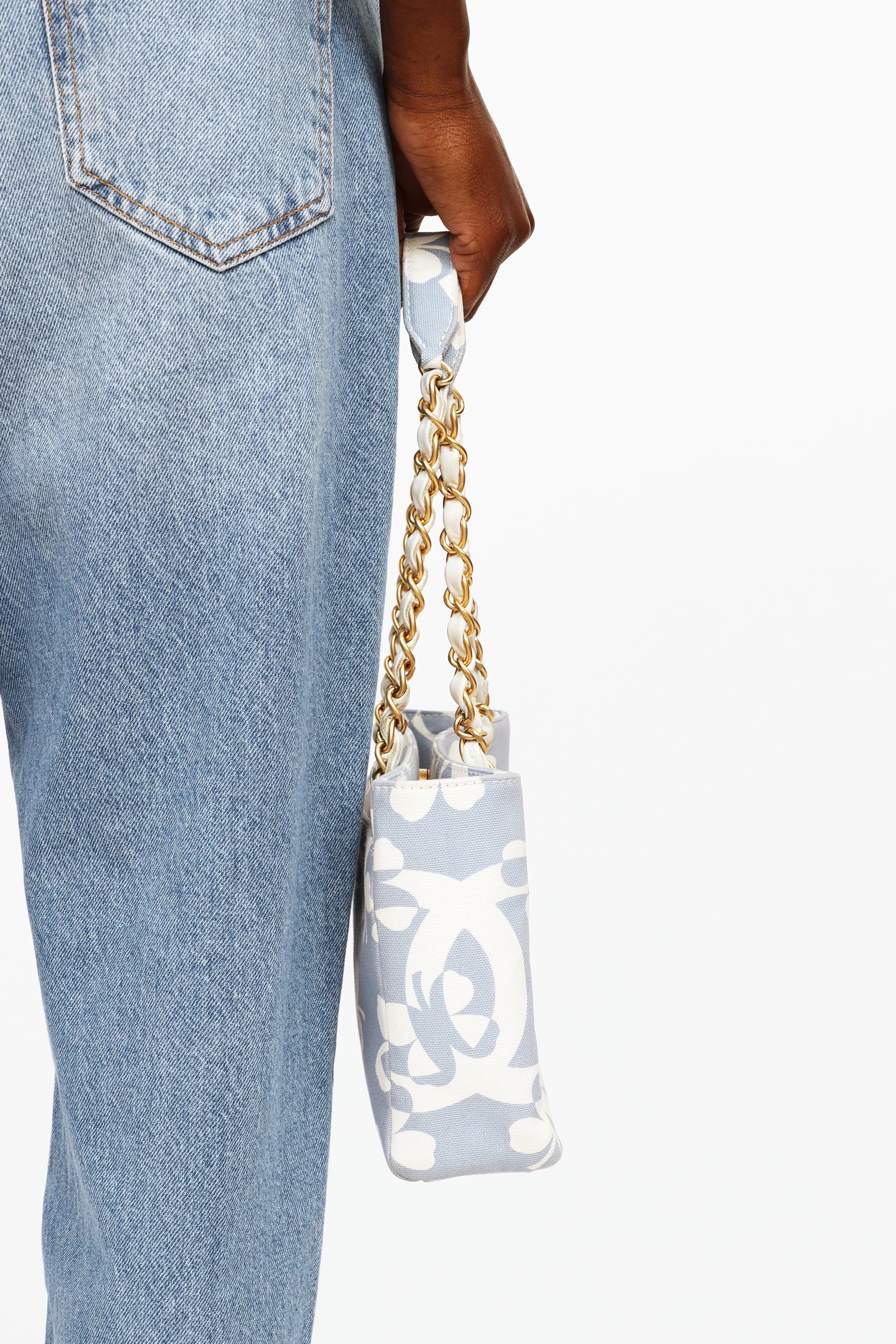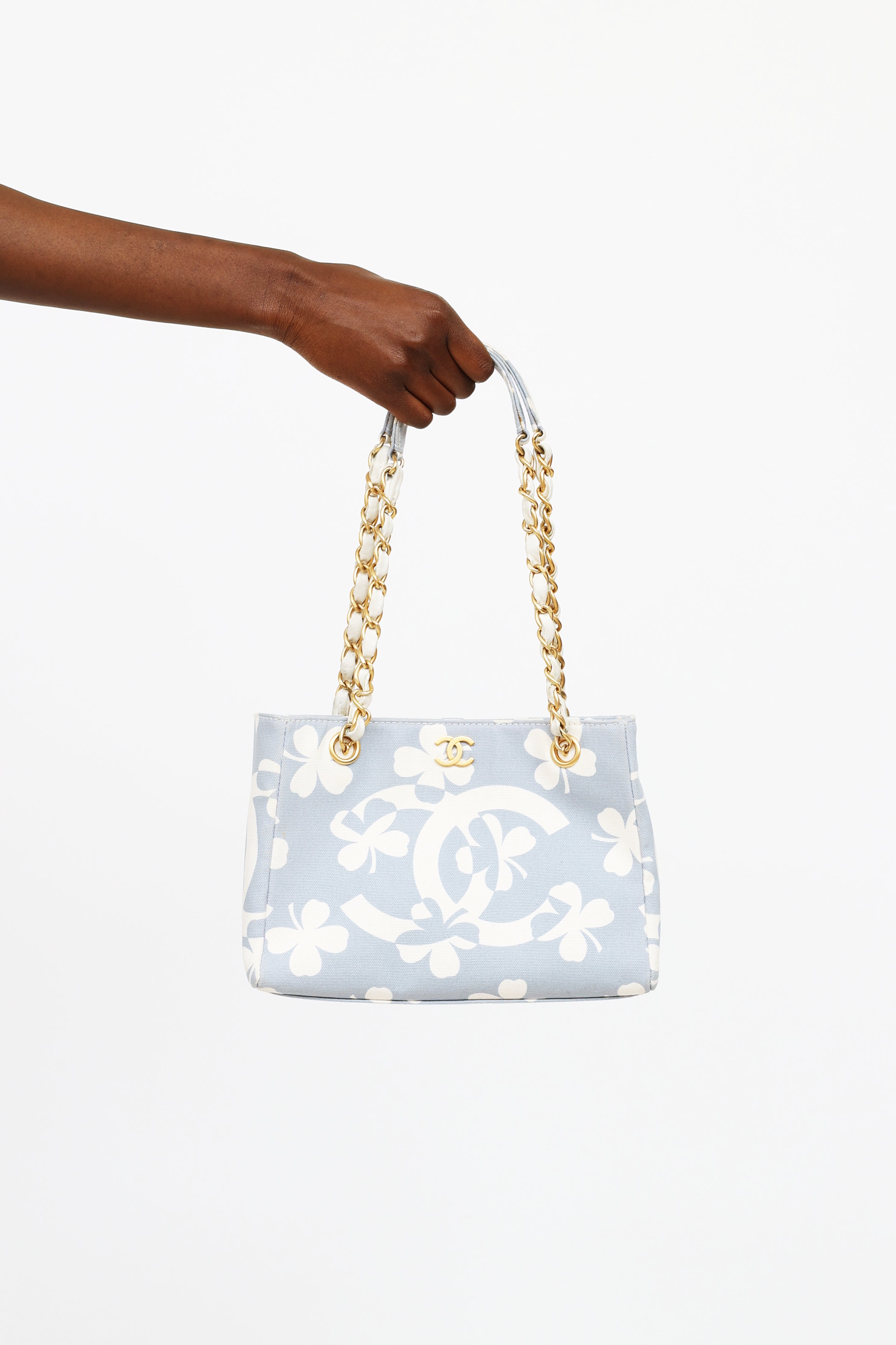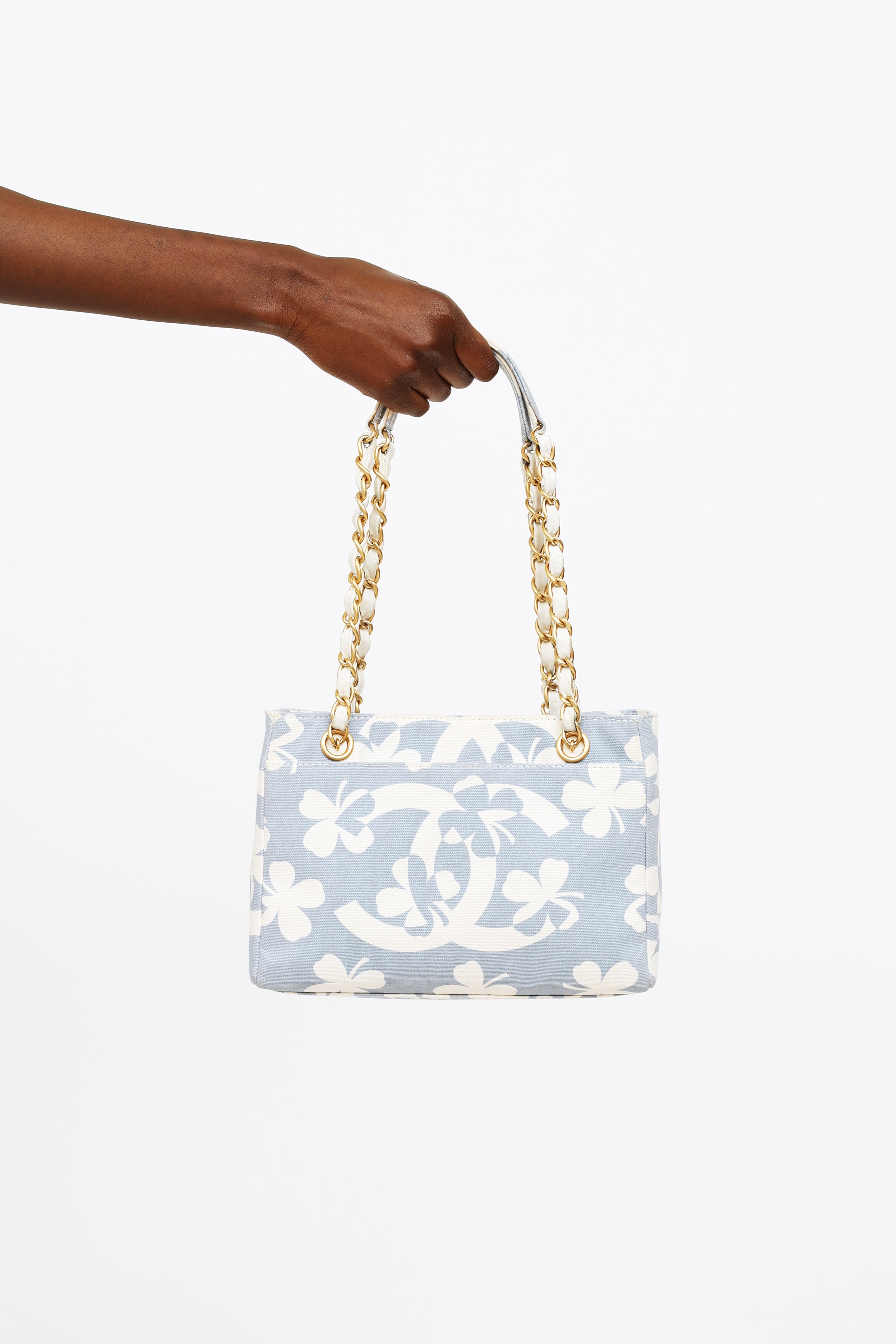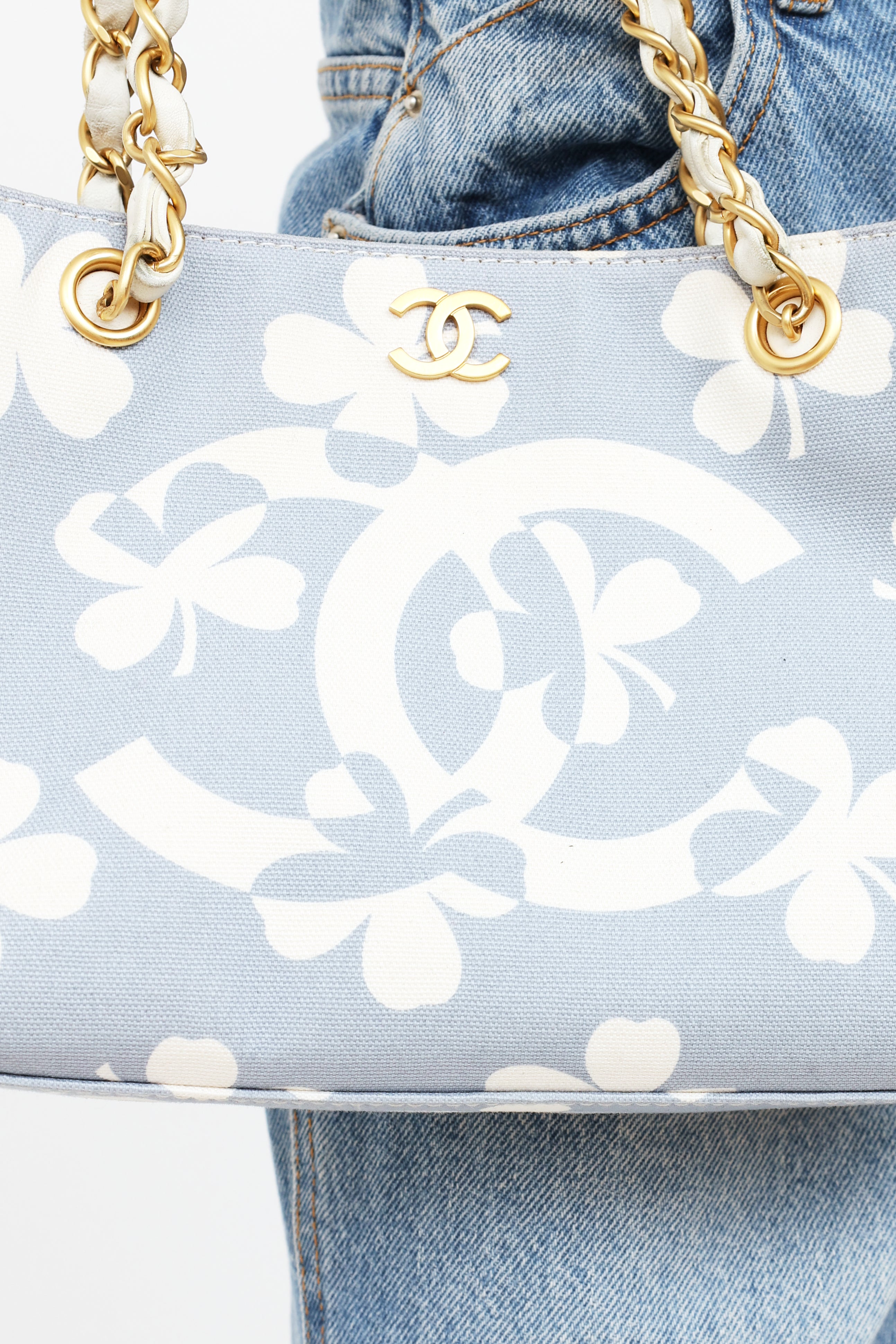 Pre-owned Chanel shoulder bag in light blue and white canvas featuring gold-tone hardware, double CC logo on front, braided leather and gold chain straps with canvas handles, double CC and clover pattern, top snap closure, single interior zip pocket, back slip pocket and white satin lining with logo. Original box and dust bag included.