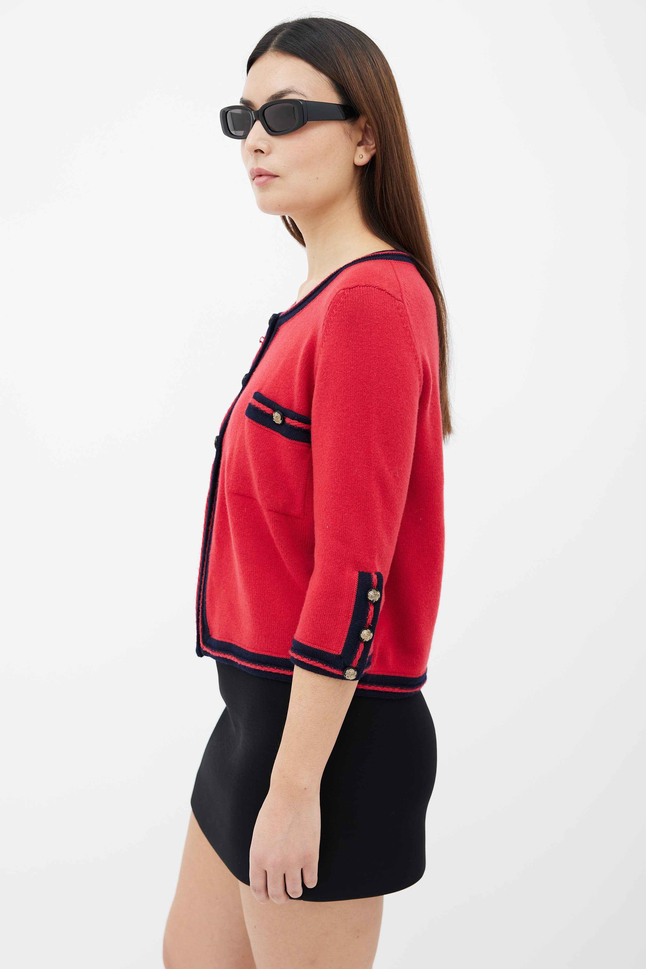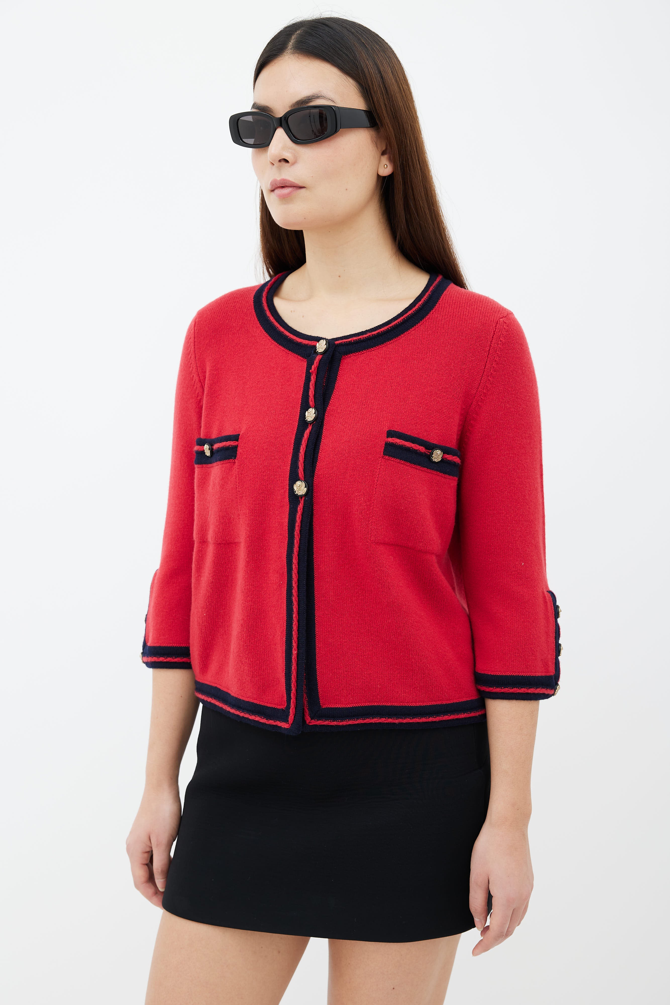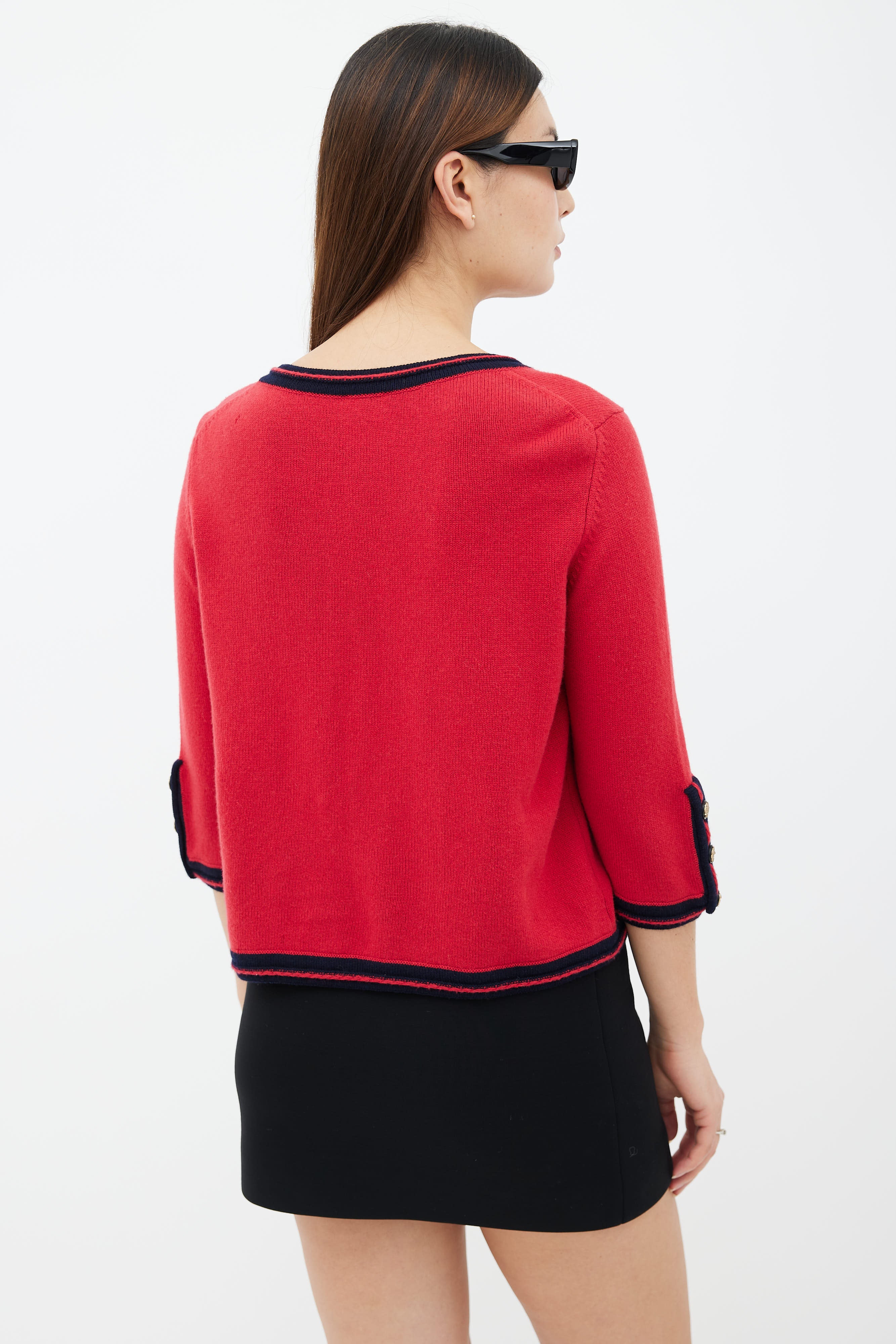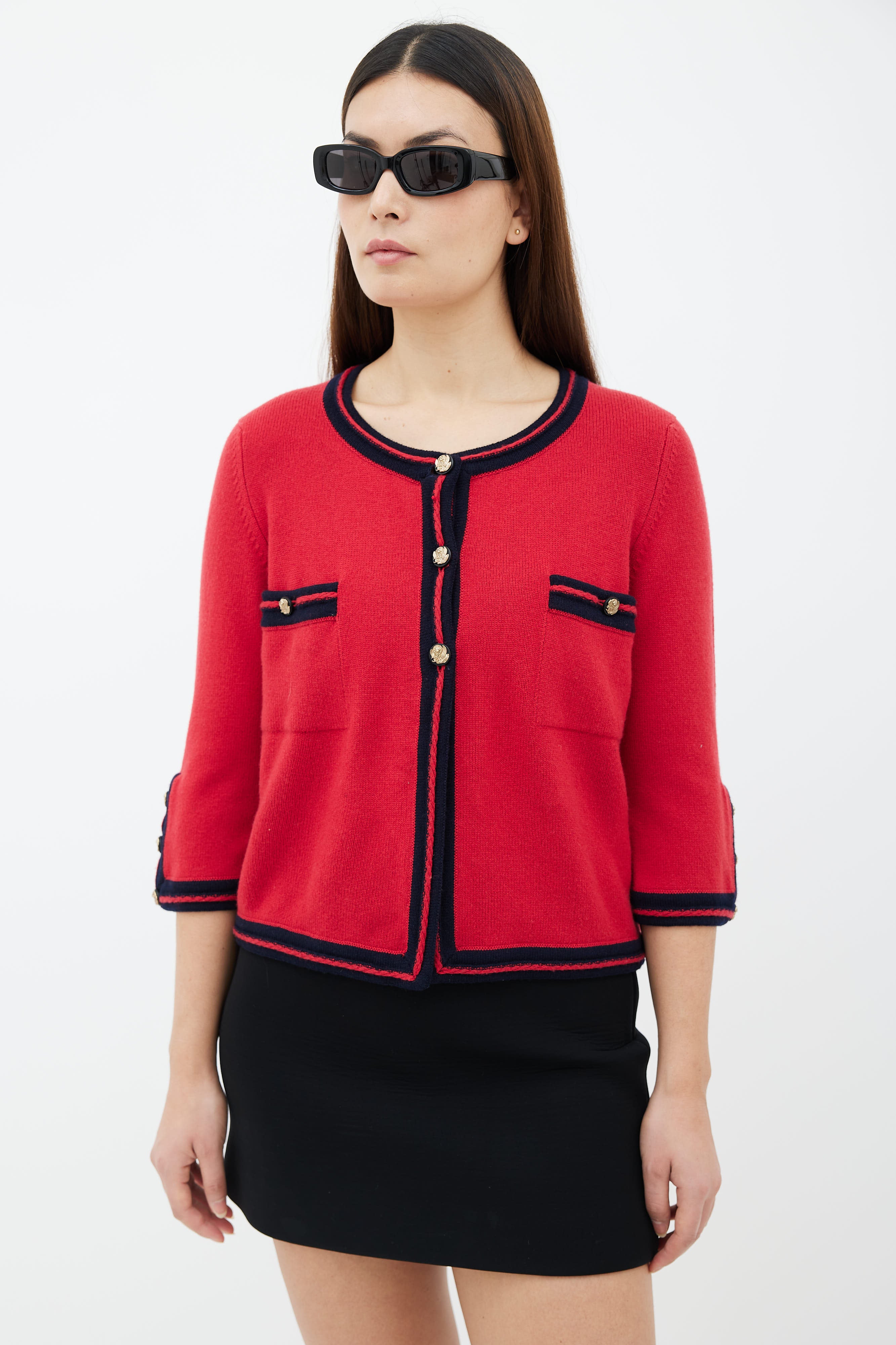 Pre-owned Chanel red cashmere cardigan featuring navy trim throughout, round collar, three-quarter sleeves with three buttoned cuff, three front button closure, black button with gold-tone plaque design throughout and two chest buttoned pockets.