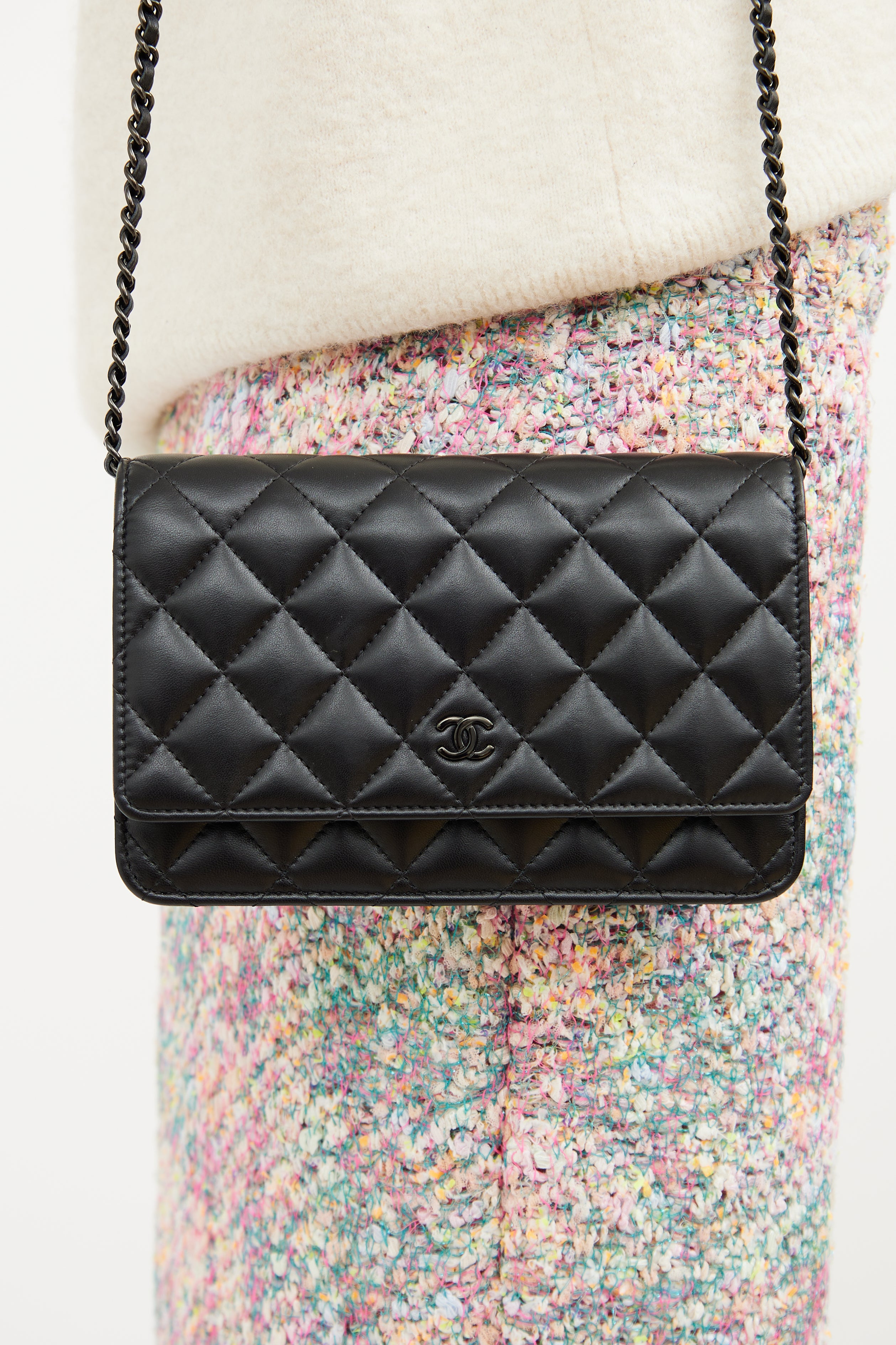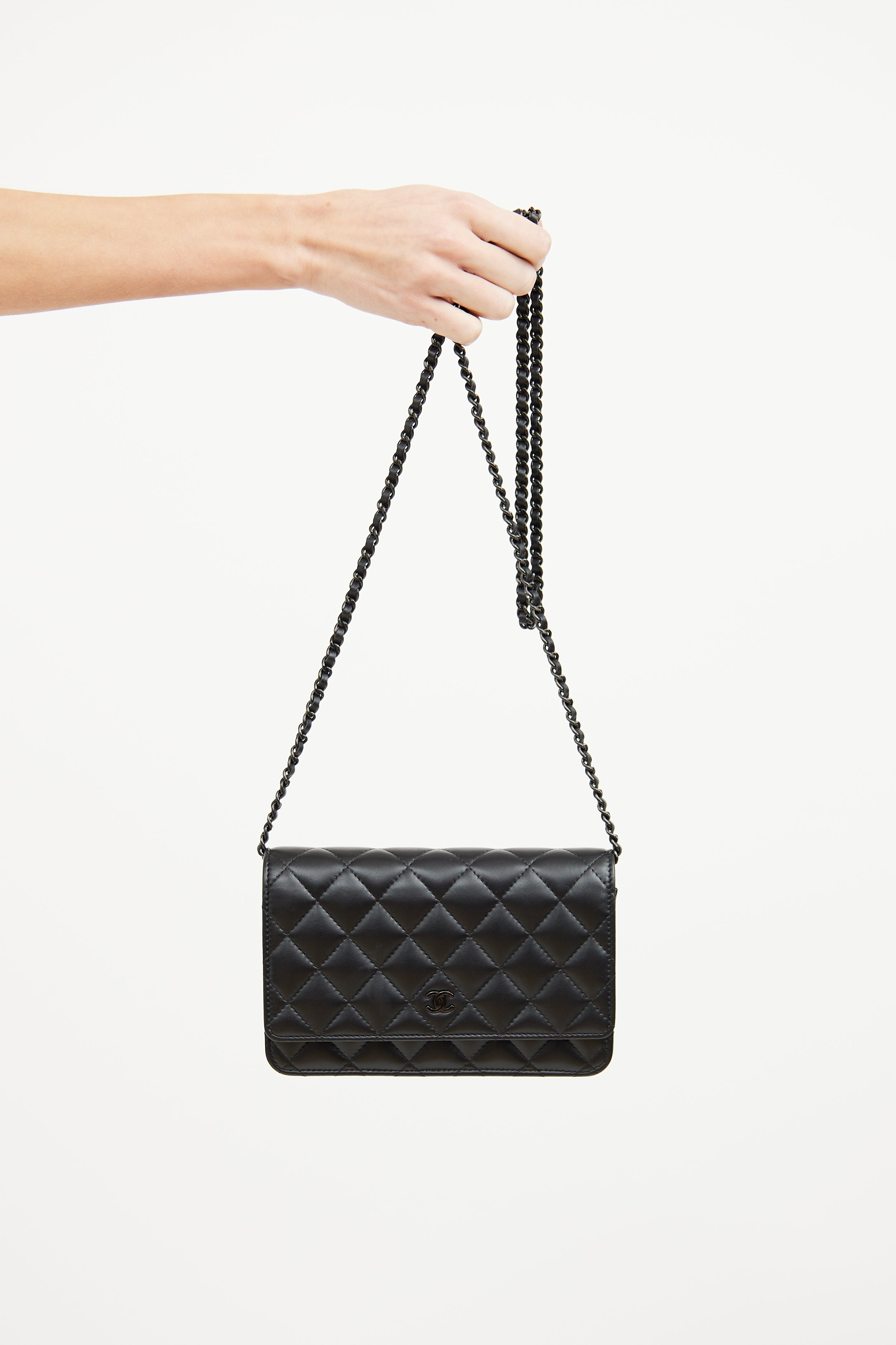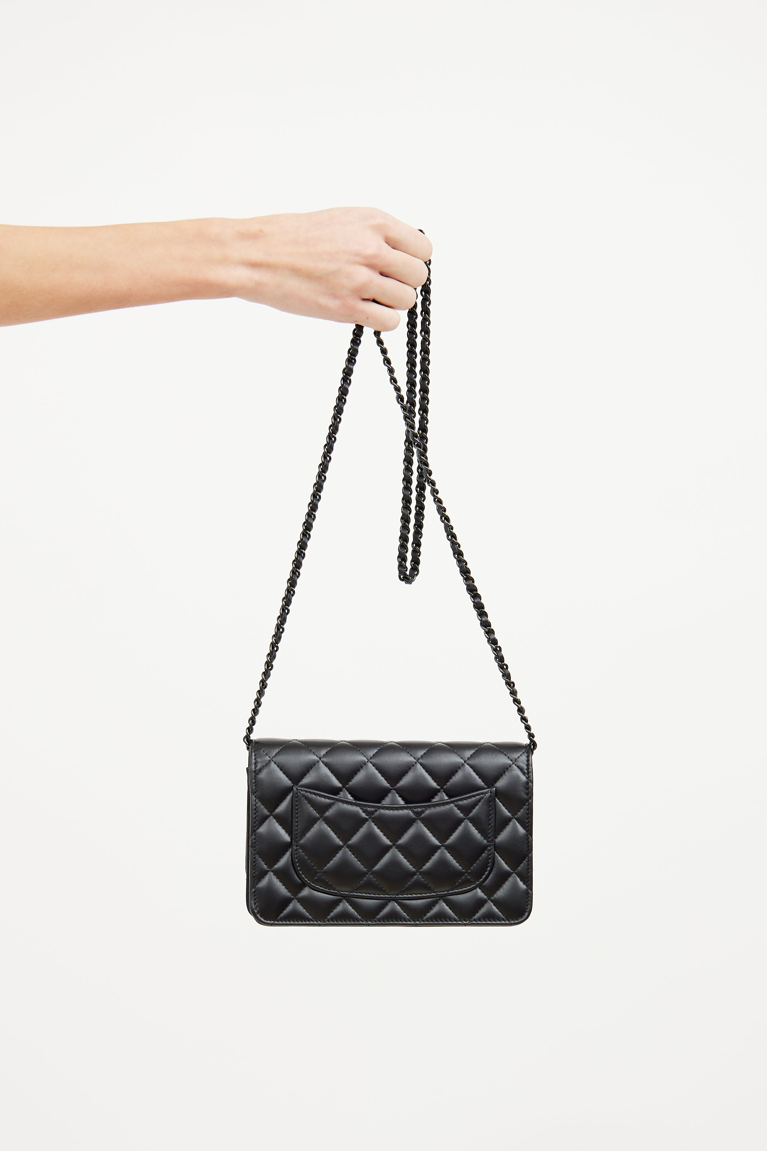 Pre-owned Chanel black wallet on chain bag featuring quilted lambskin leather, braided leather and chain strap, black CC logo at front, magnetic closure, slip pocket at back, zip and slip pockets under top flap, interior zip and slip pockets, and six card slots.