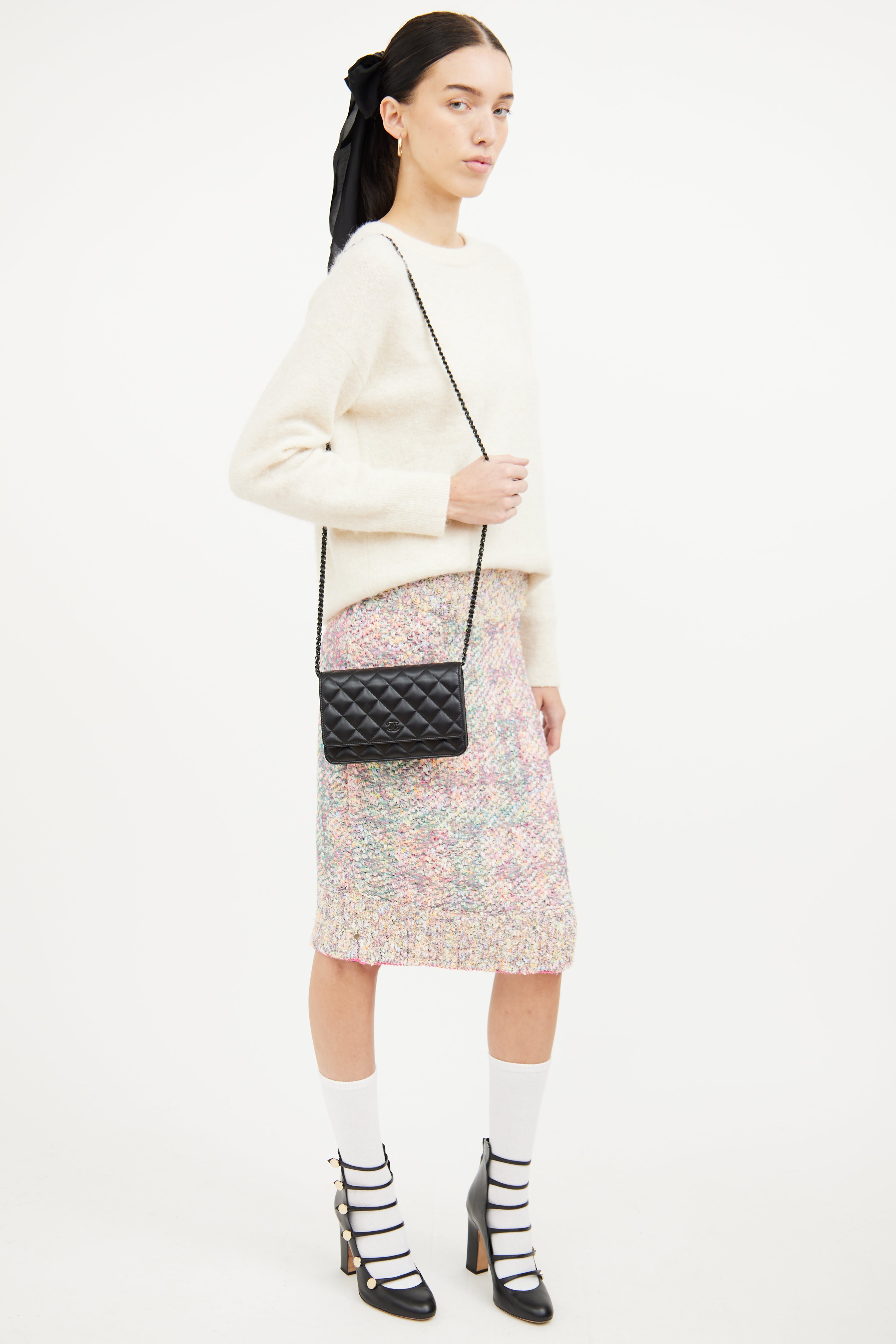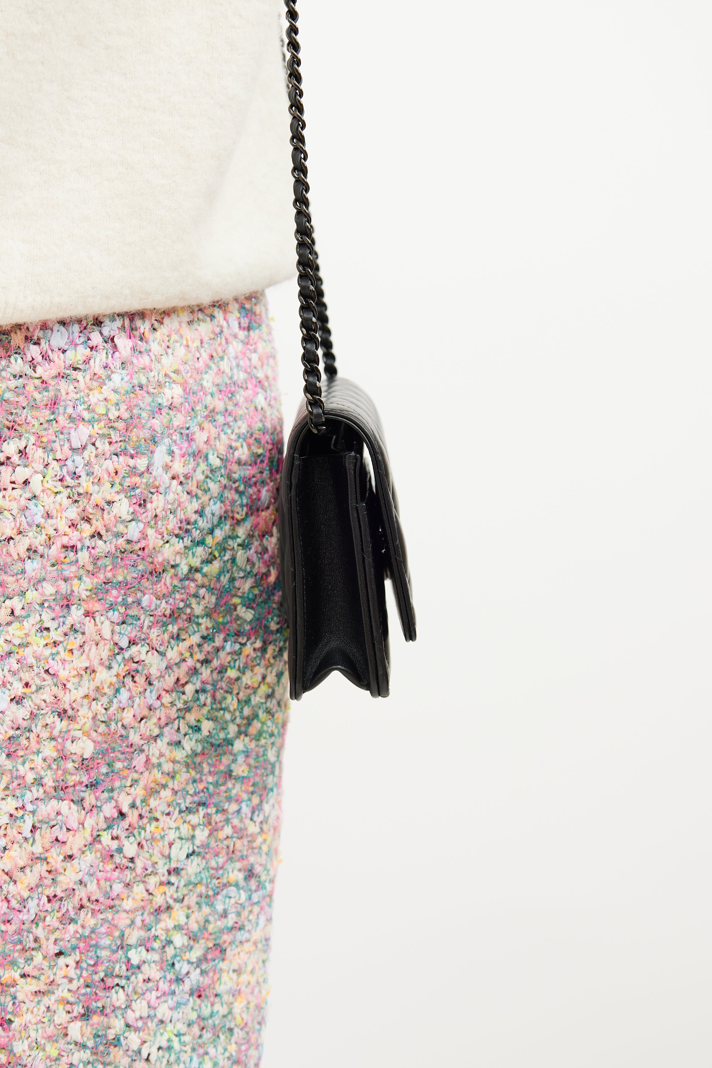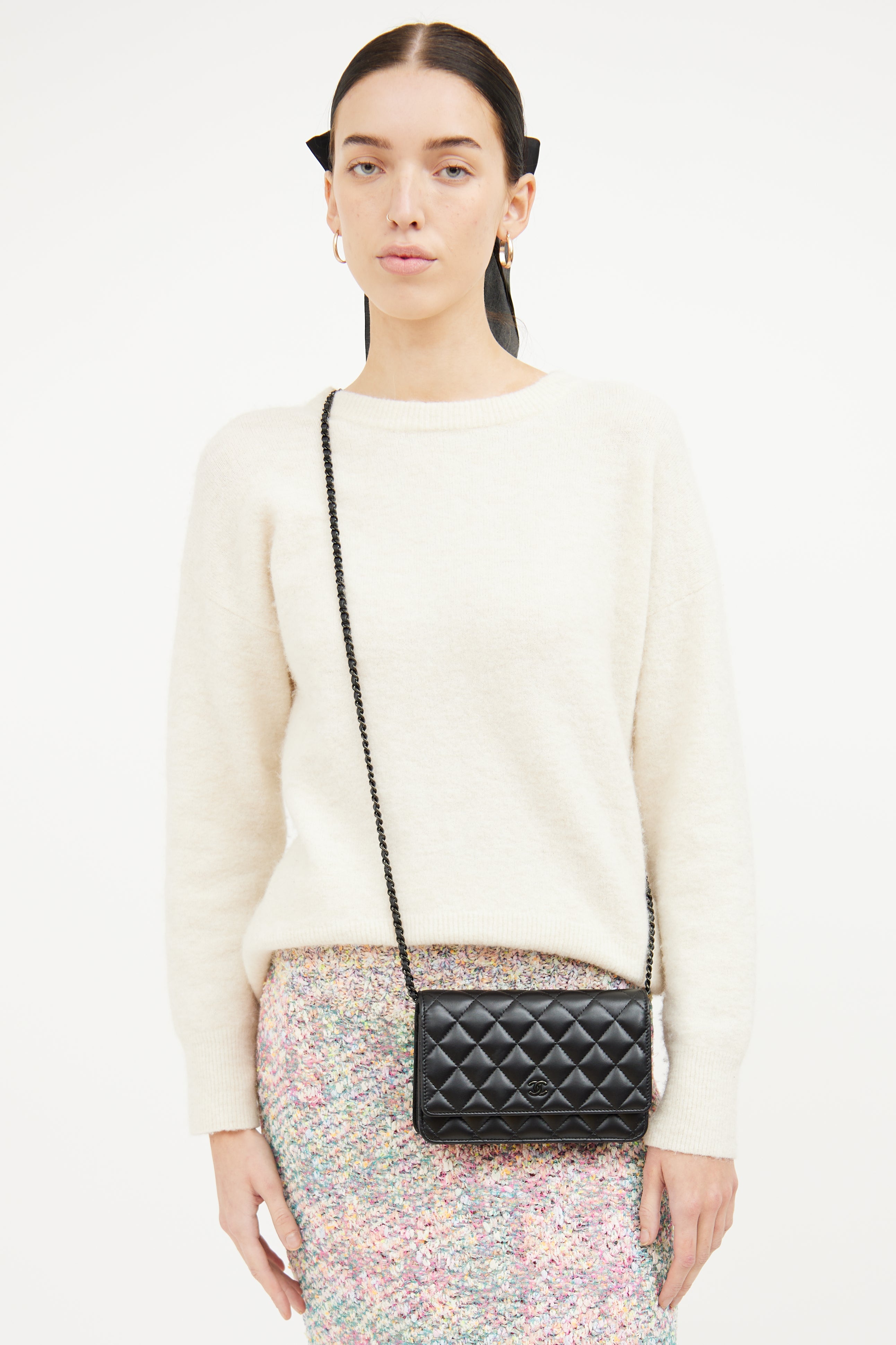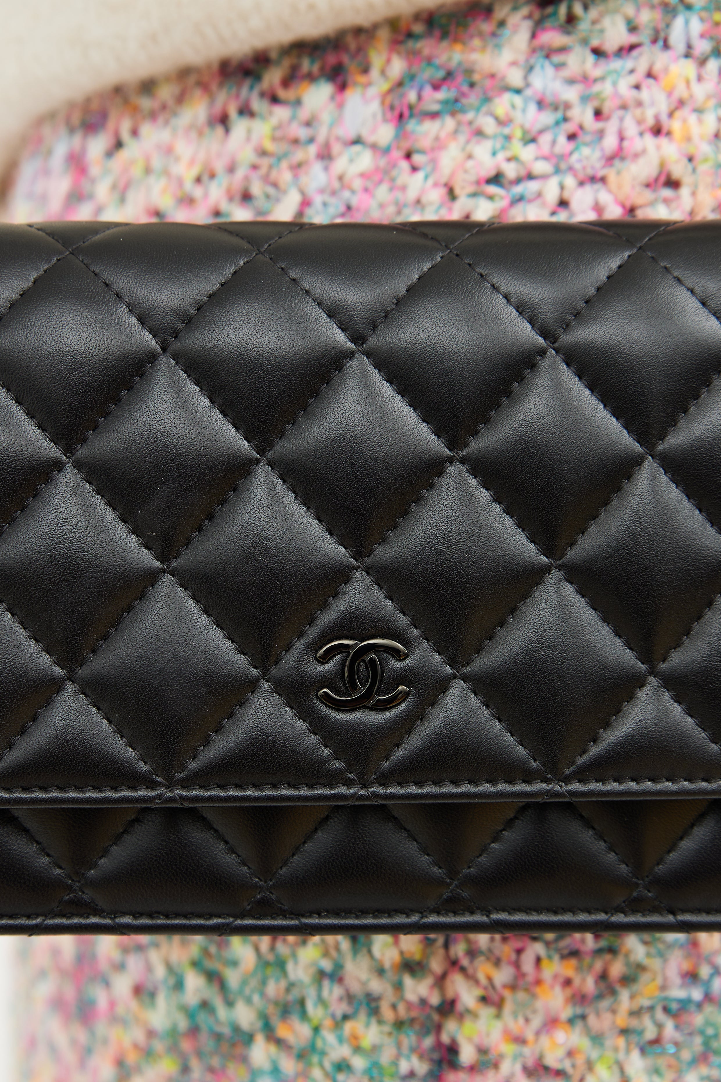 Pre-owned Chanel black wallet on chain bag featuring quilted lambskin leather, braided leather and chain strap, black CC logo at front, magnetic closure, slip pocket at back, zip and slip pockets under top flap, interior zip and slip pockets, and six card slots.