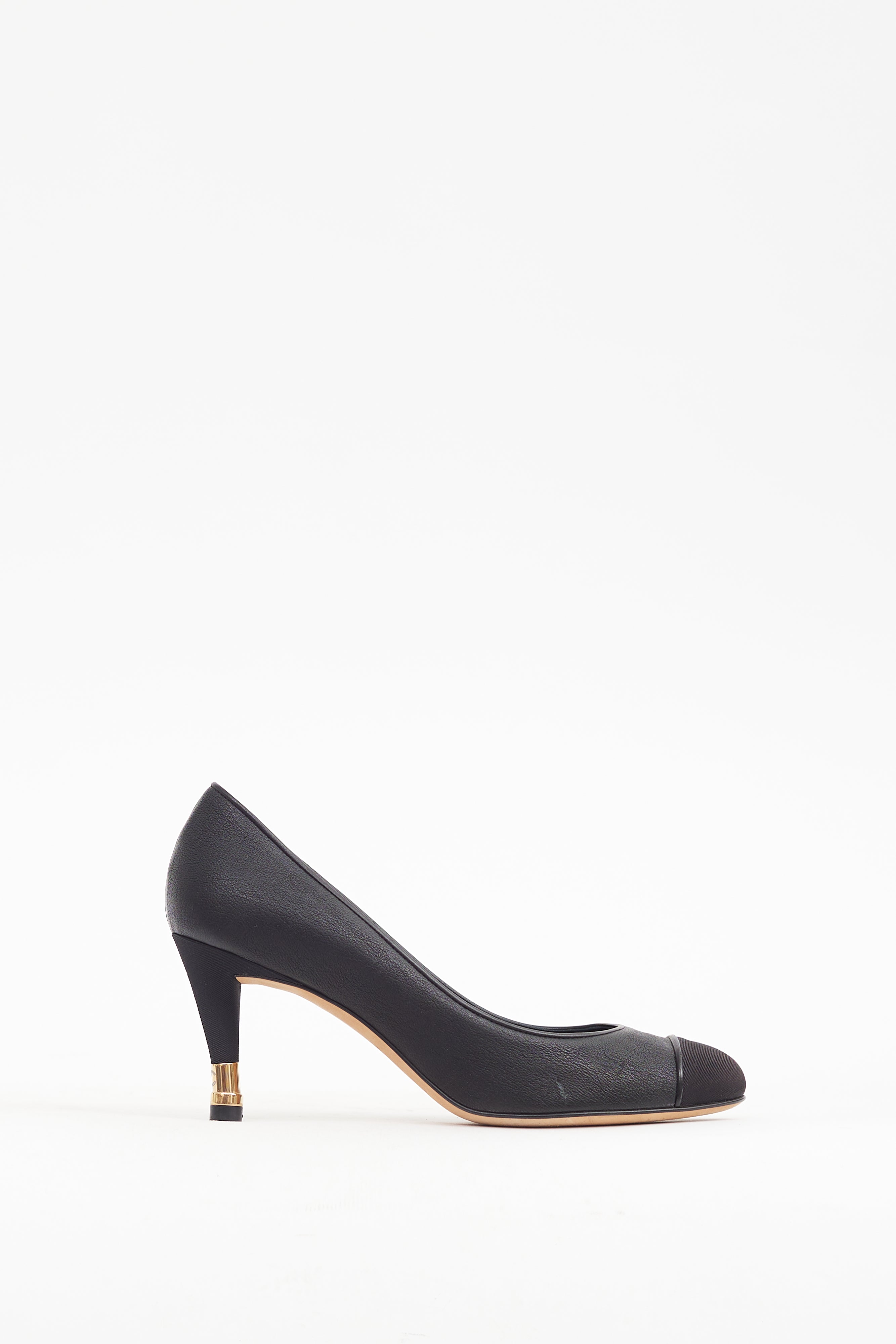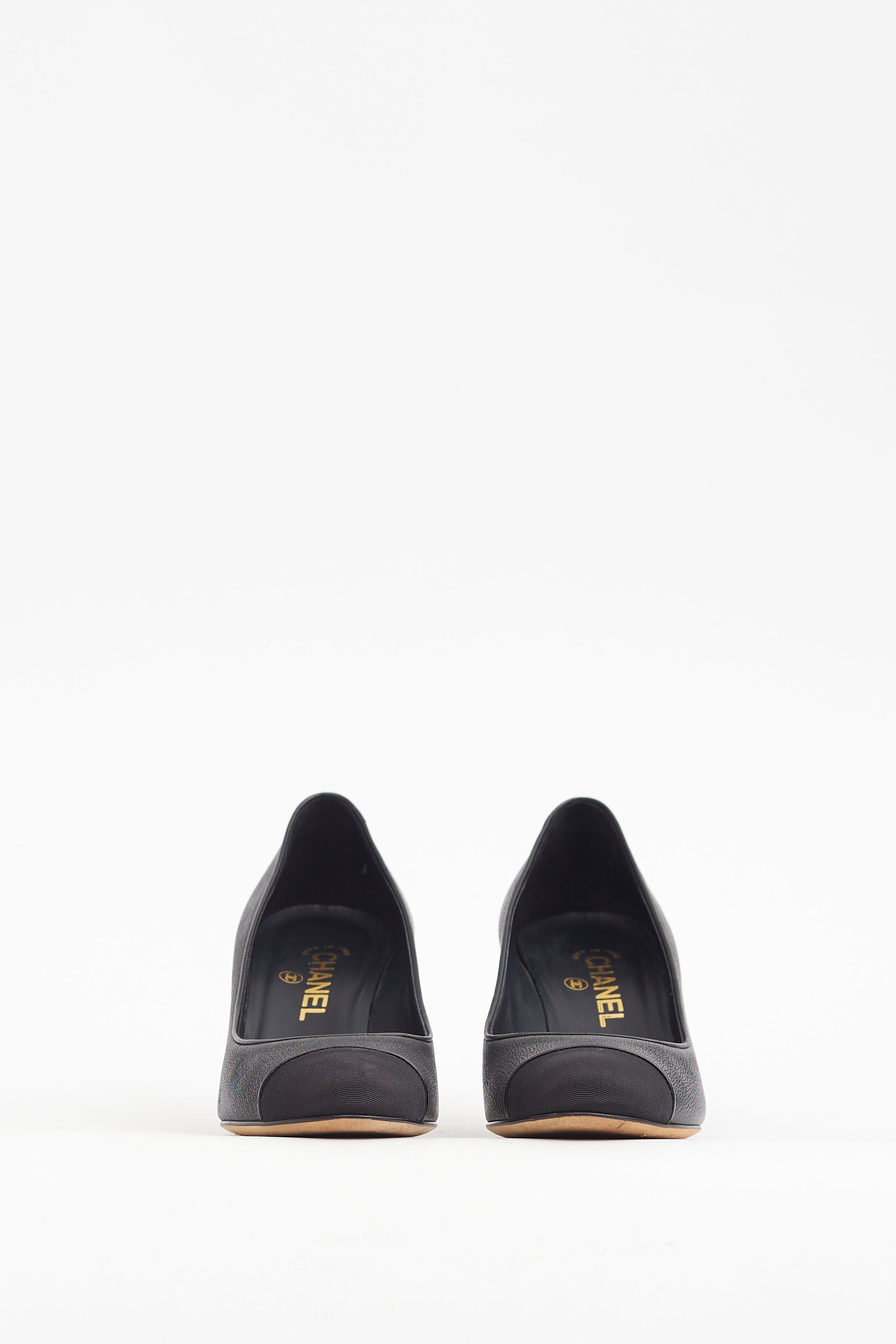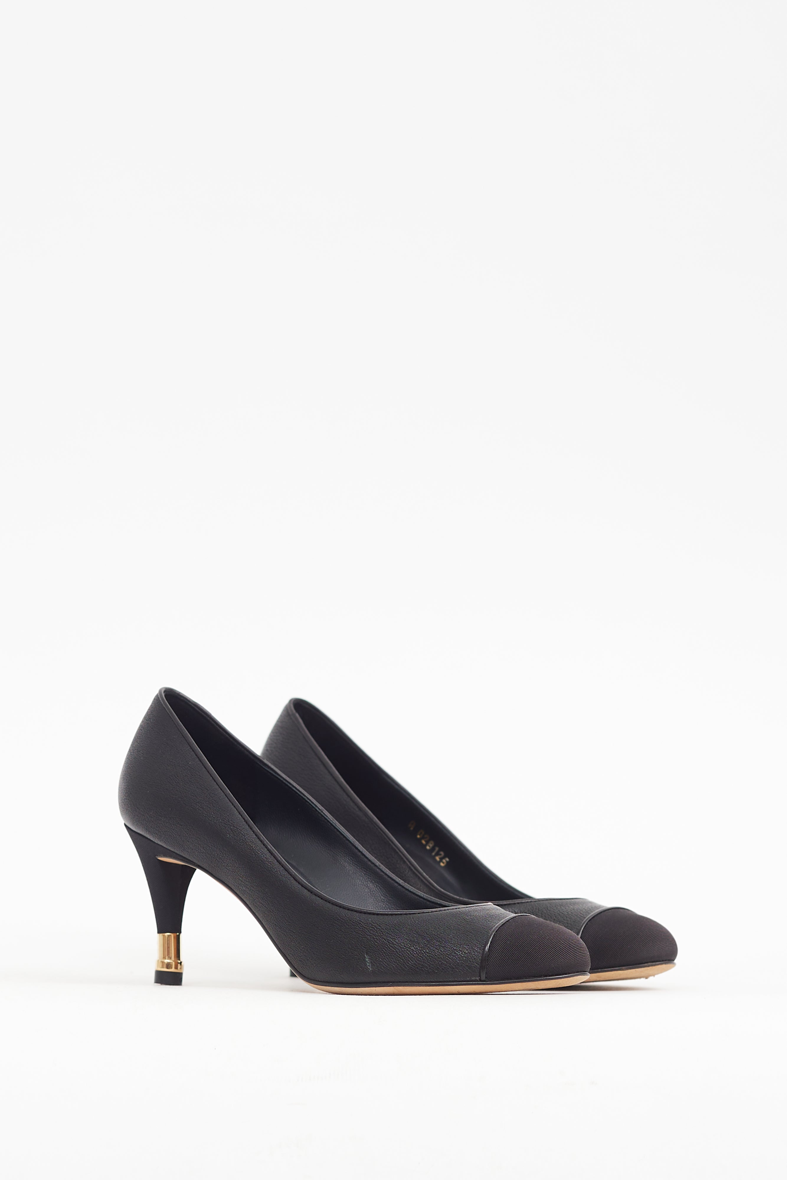 Pre-owned Chanel Spring 2012 black heels featuring an almond toe, textile toe cap, textile covered angled stiletto heel, and gold tone accent above heel tip with debossed CC logo. Comes with original dust bags and extra set of heel tips.