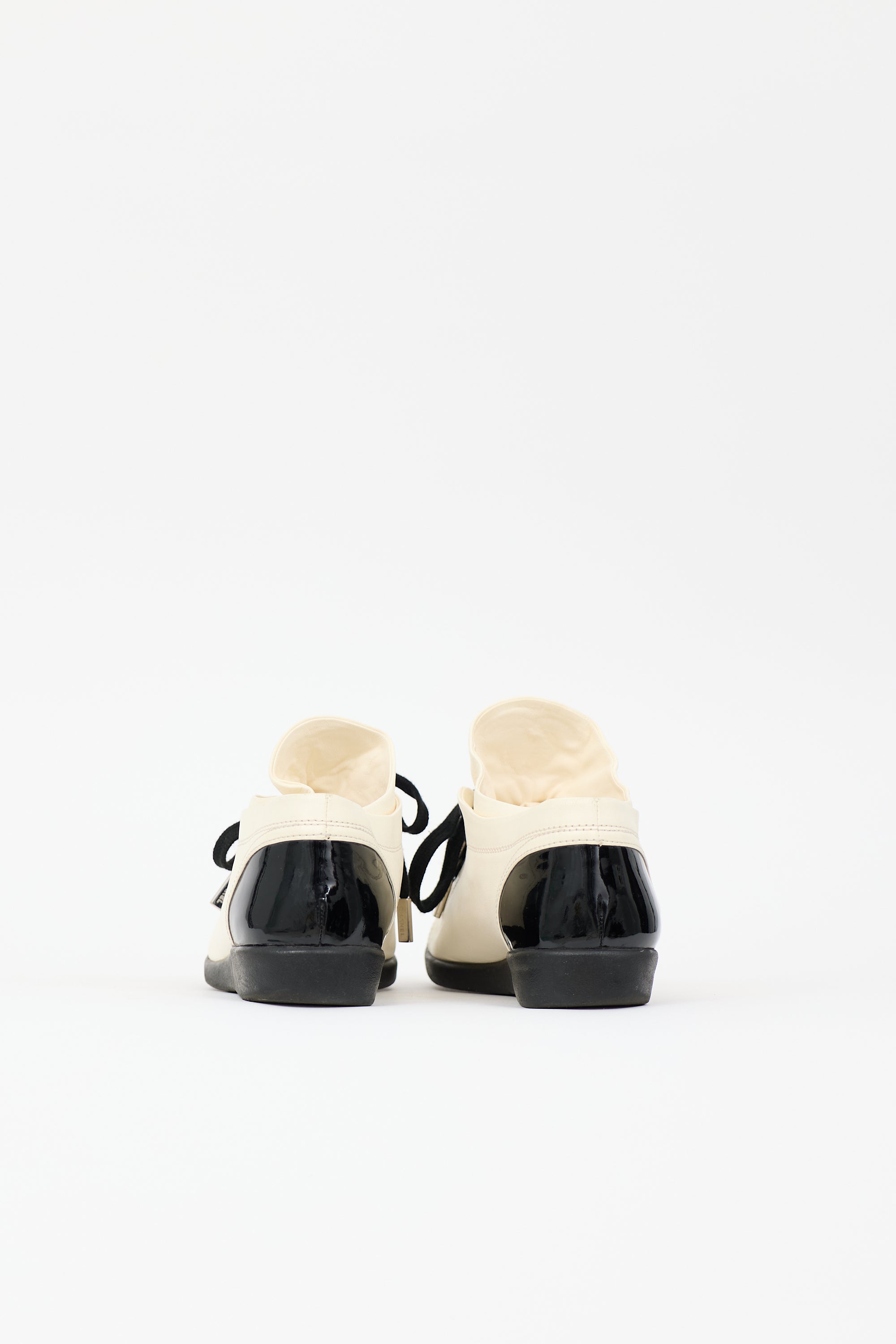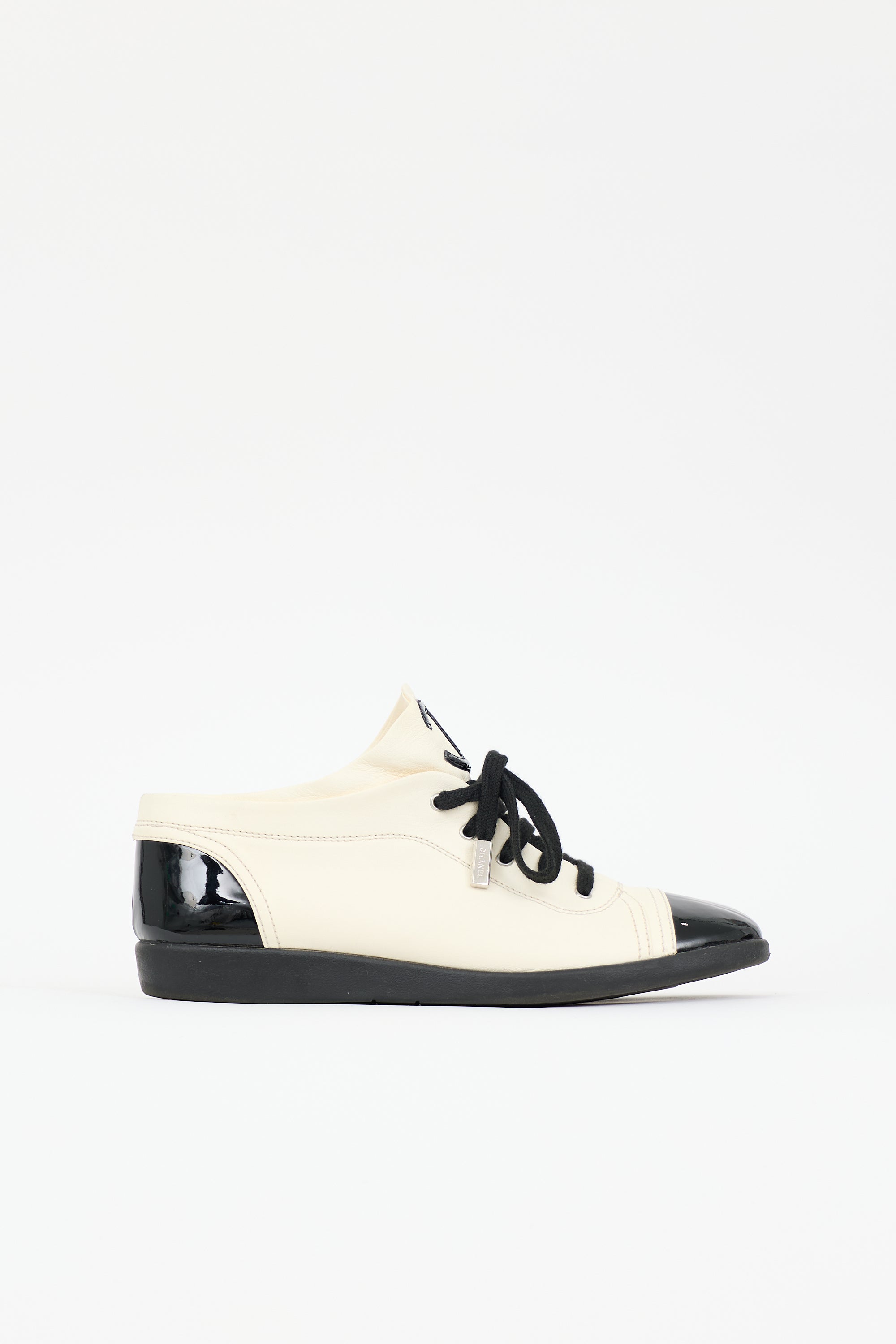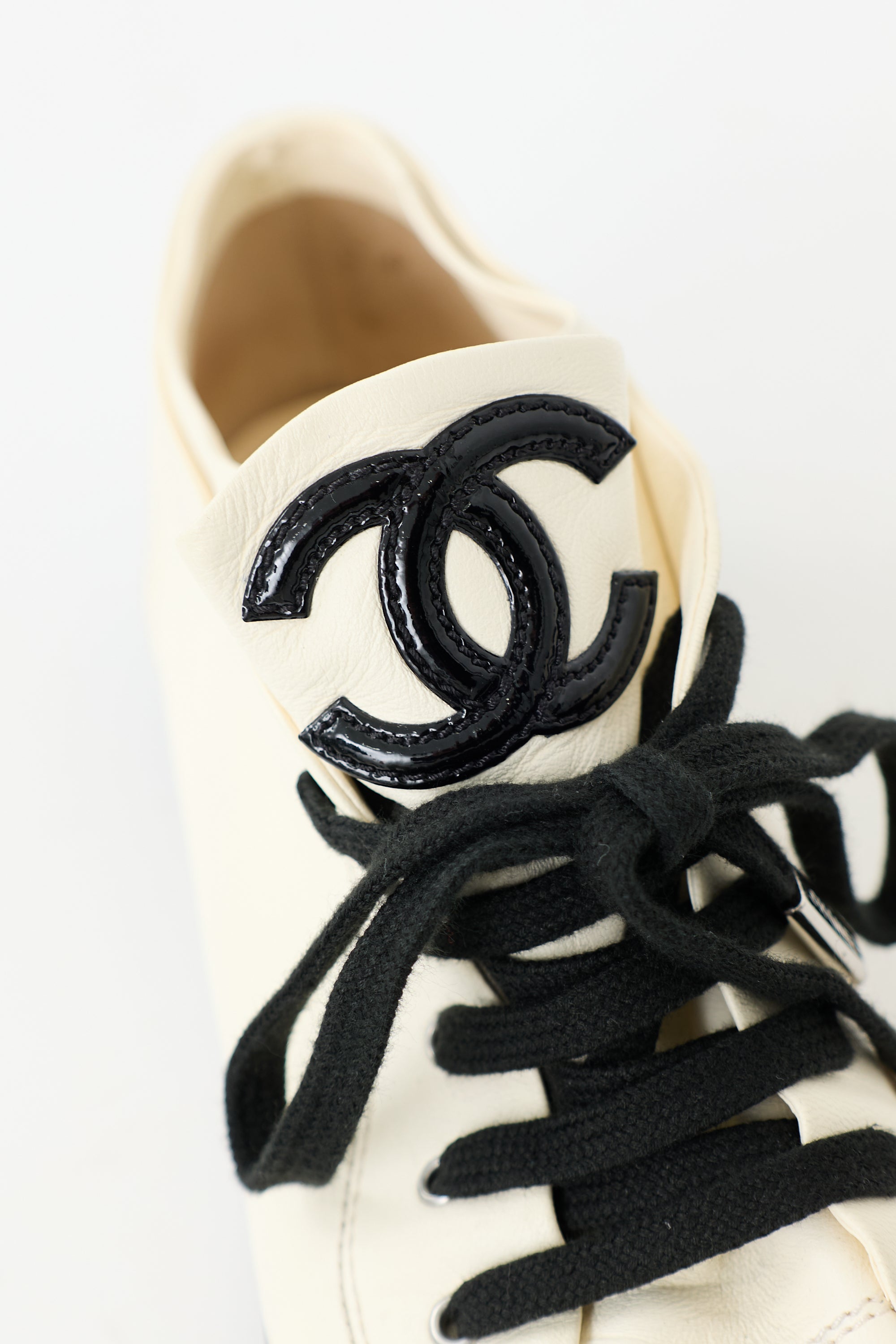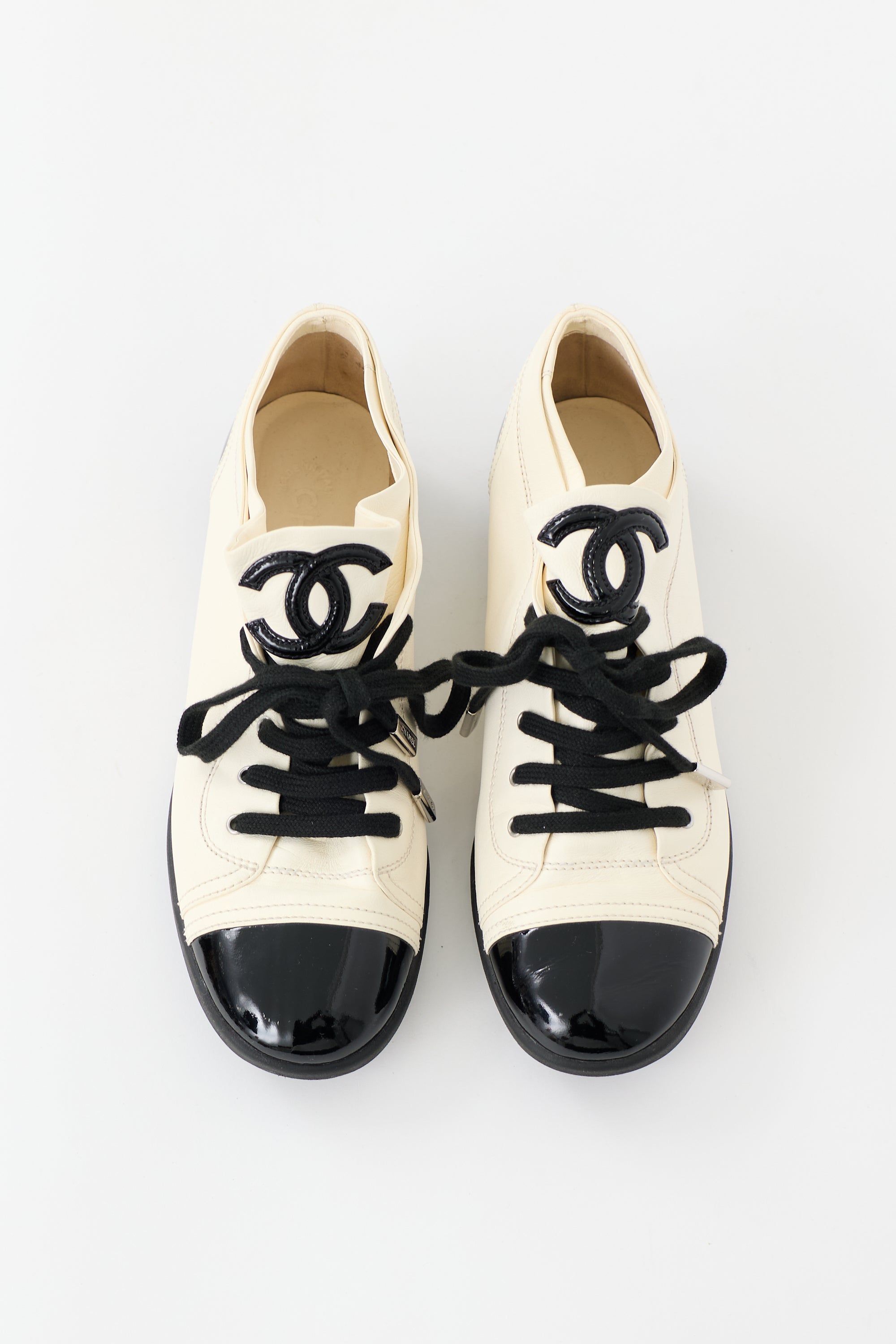 Pre-owned Chanel Spring 2015 cream and black sneakers featuring rounded toe with patent cap, lace up front, CC logo at tongue, layered collar, and rubber outsole. Includes original dust bag and box.
