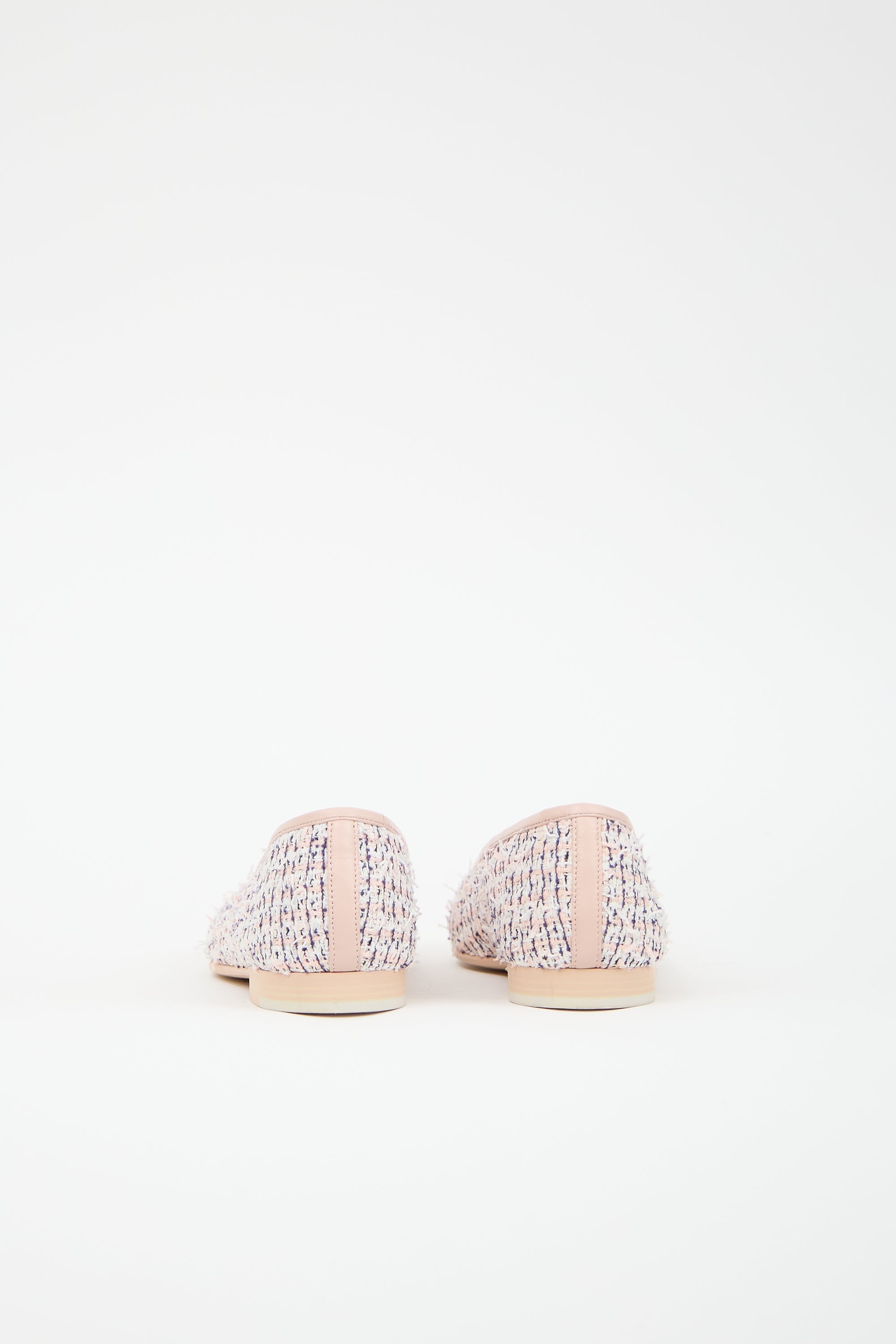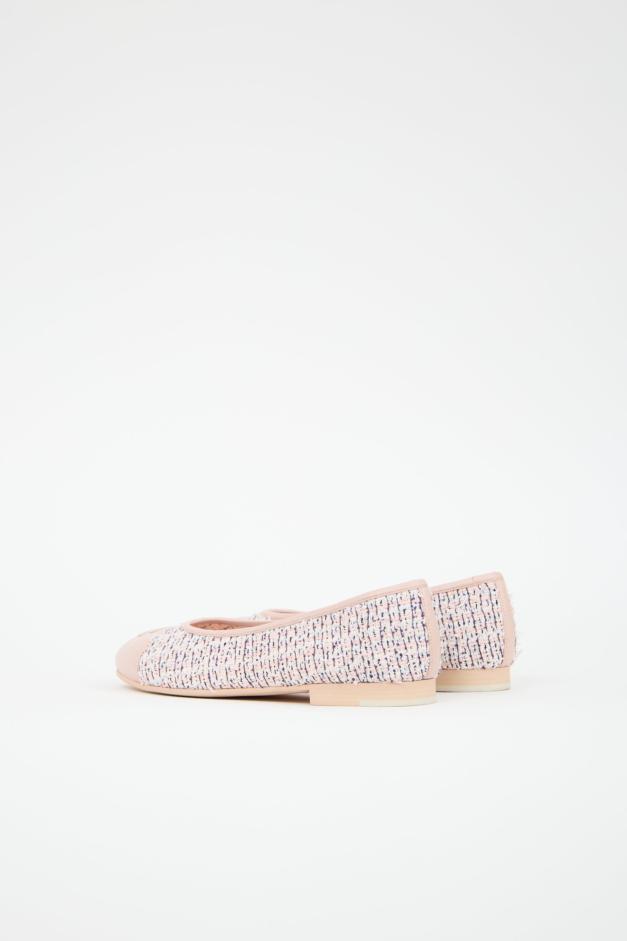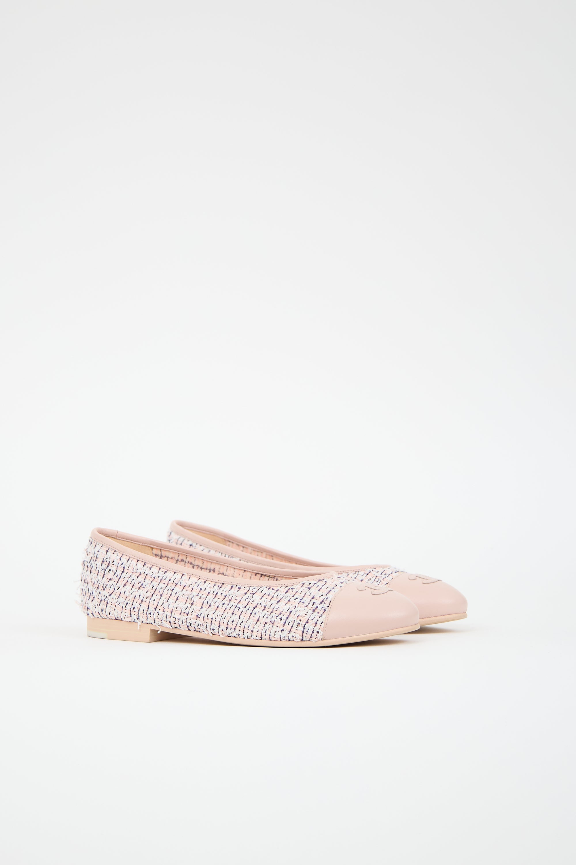 Pre-owned Chanel pink and multicolour ballet flats featuring rounded toe, tweed upper, leather panelling, and interlocking CC motif at toe cap.