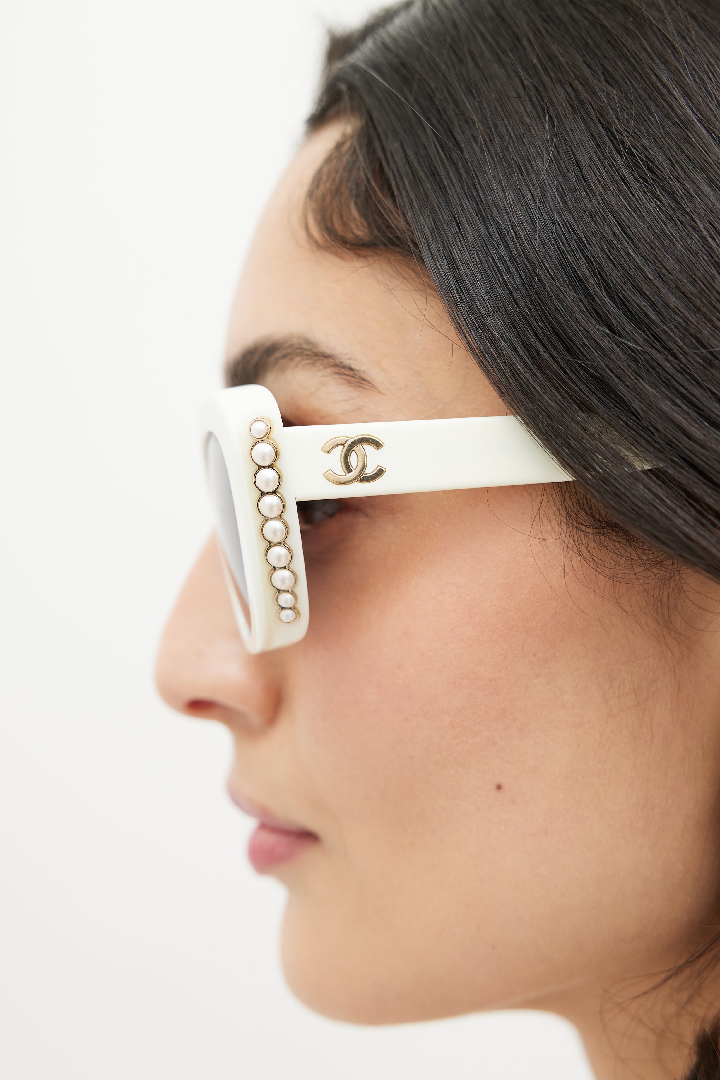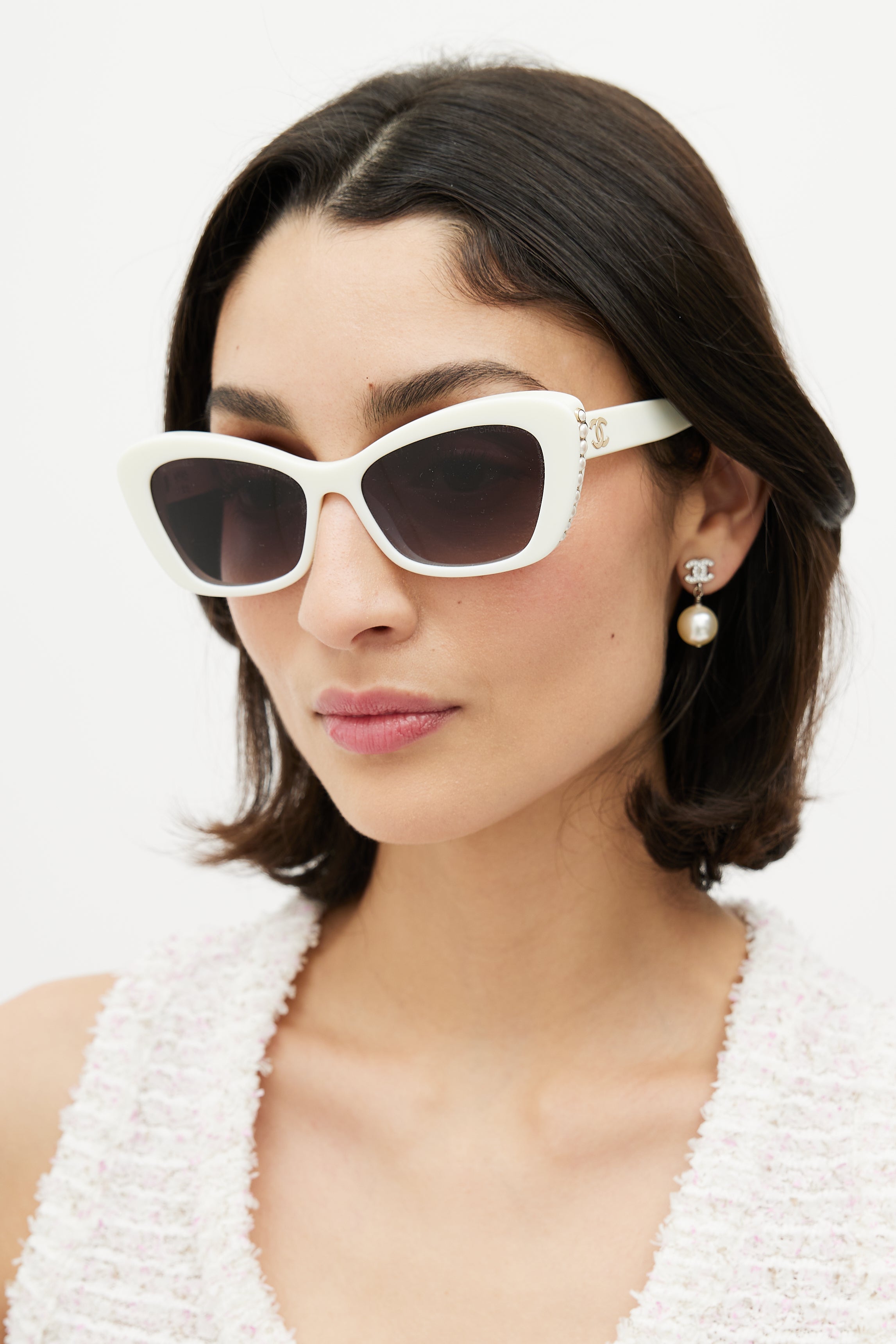 Pre-owned Chanel white 5481-H sunglasses featuring a cateye frame, pearl detailing at sides, tinted lenses, nose pads, and gold tone logo hardware at sides. Comes with original case and box.
