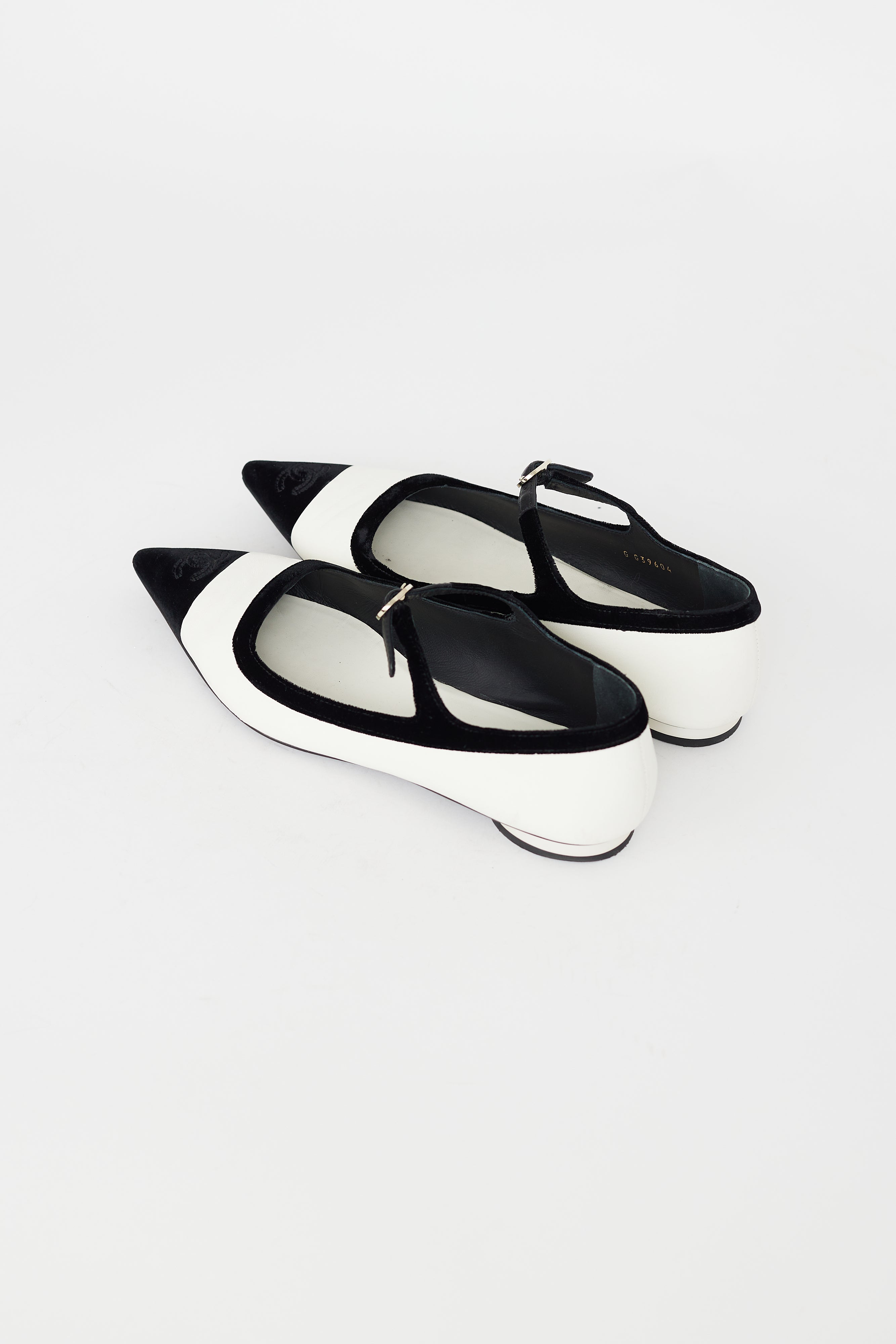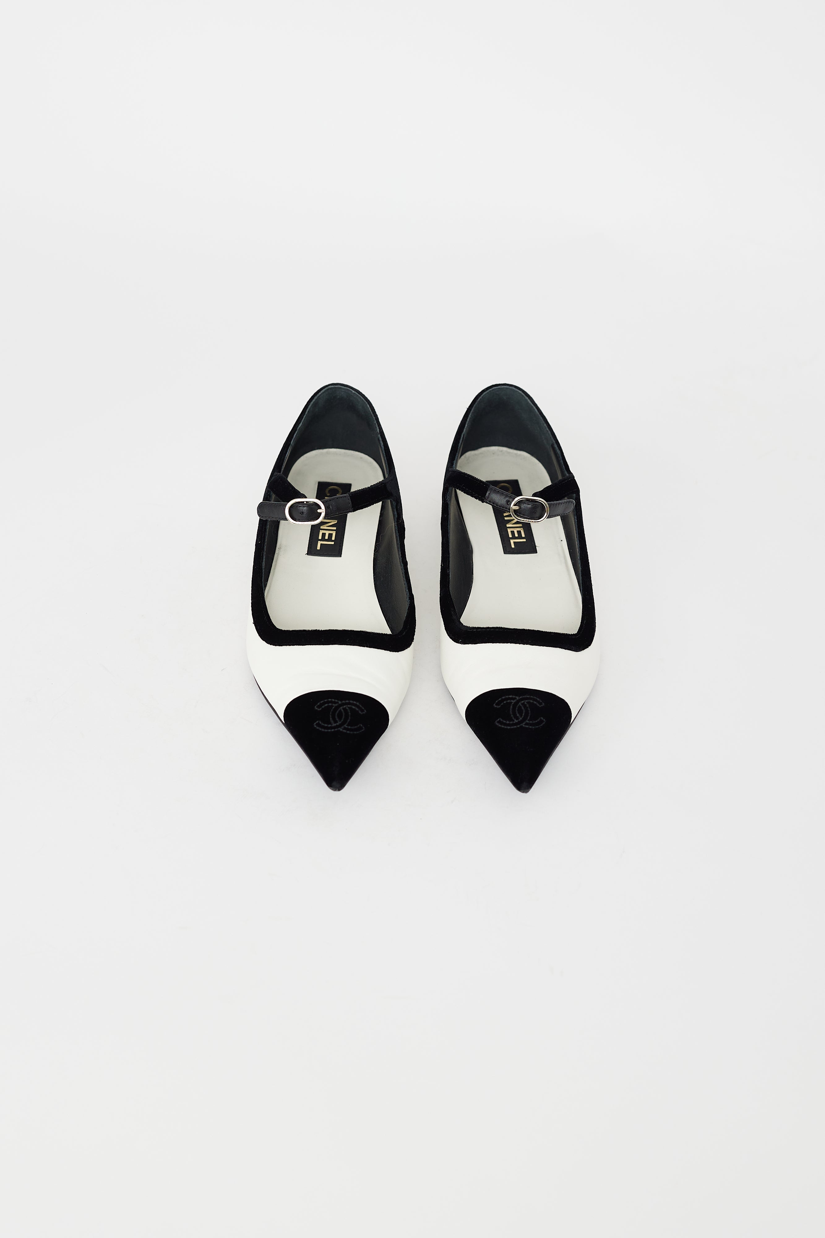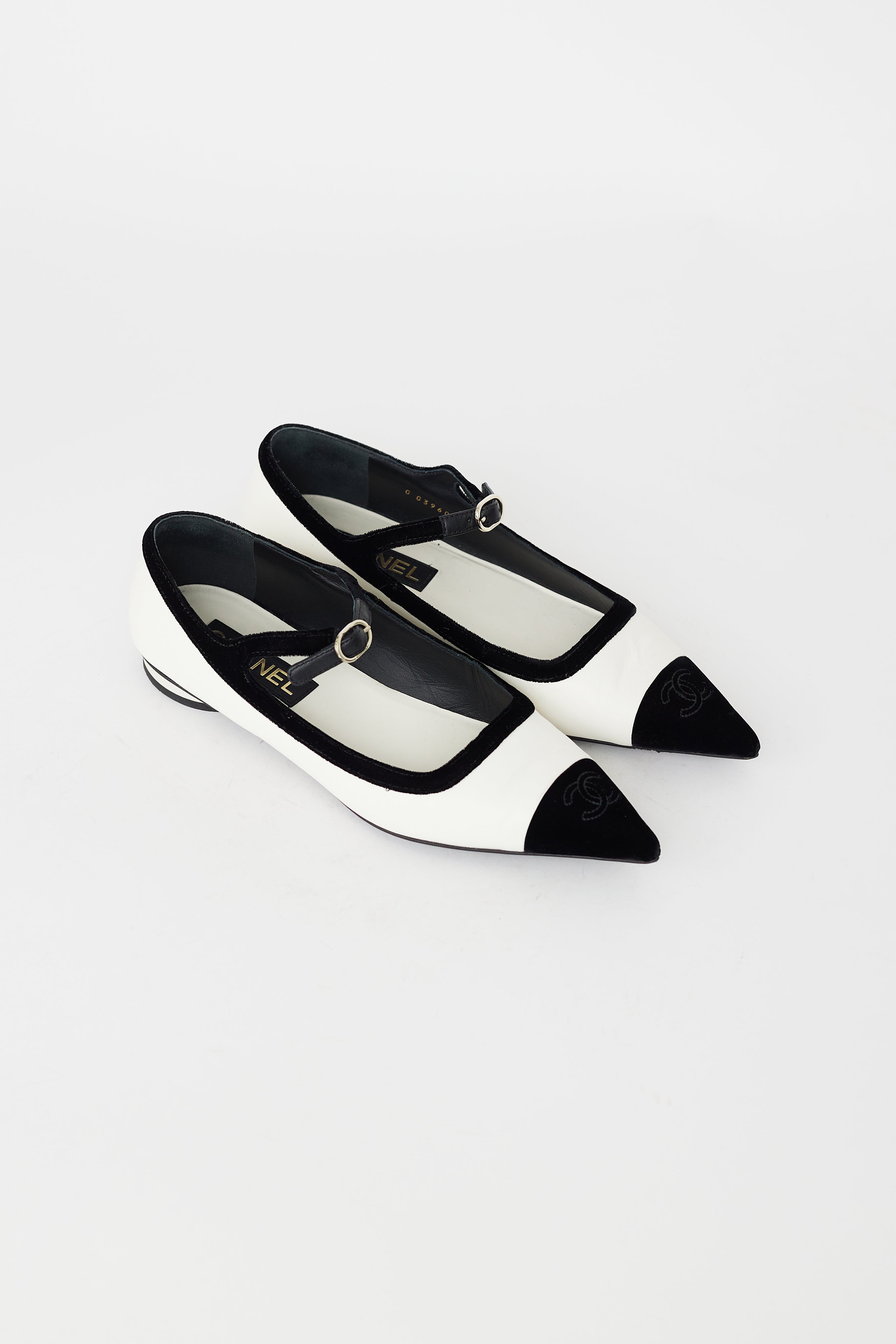 Pre-owned Chanel white and black leather mary jane flats featuring pointed toe, white leather upper, silver tone hardware, black suede toe box with embroidered CC logo, black suede and leather adjustable buckle strap, and circular heel. Comes with original box.