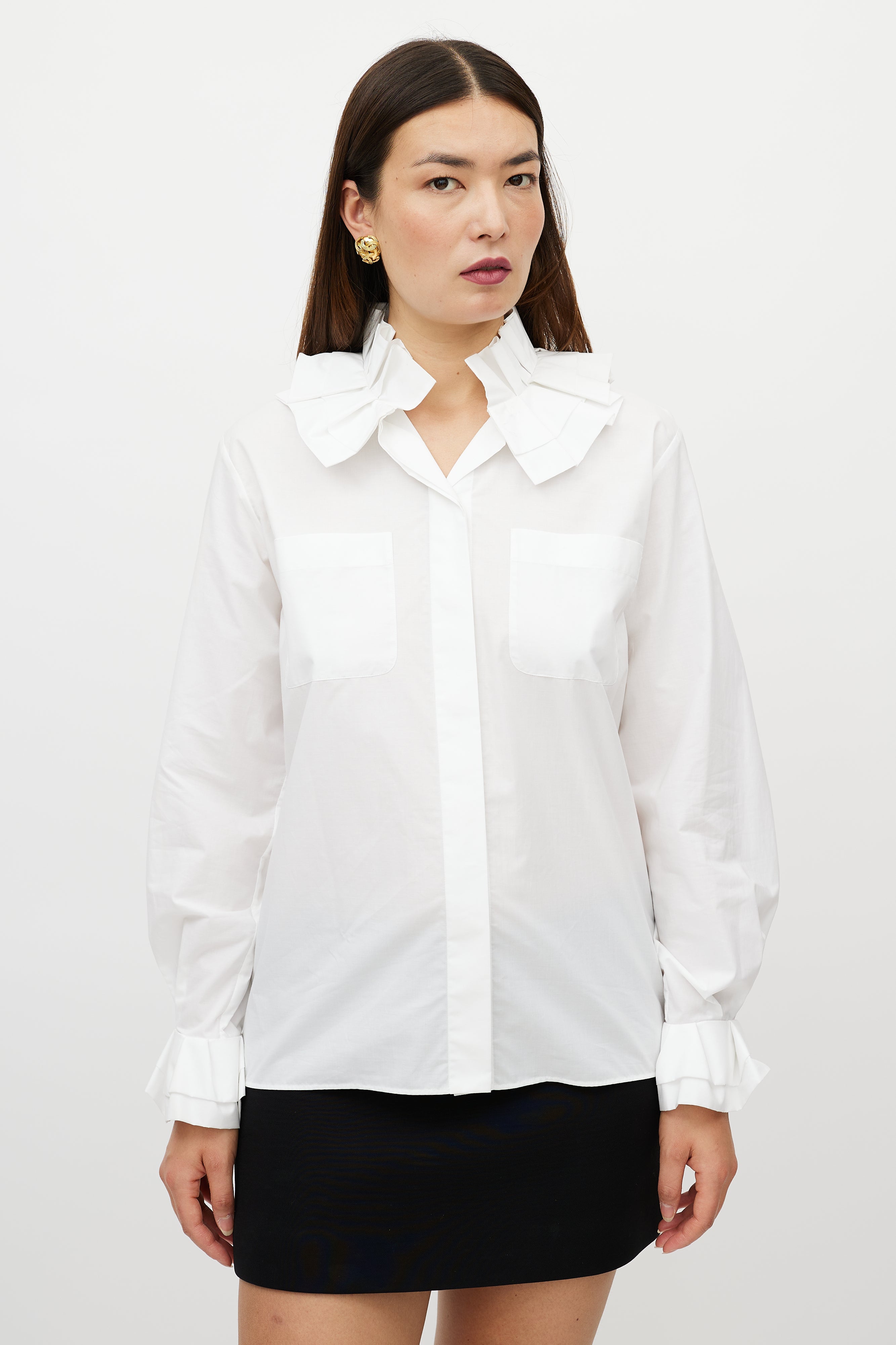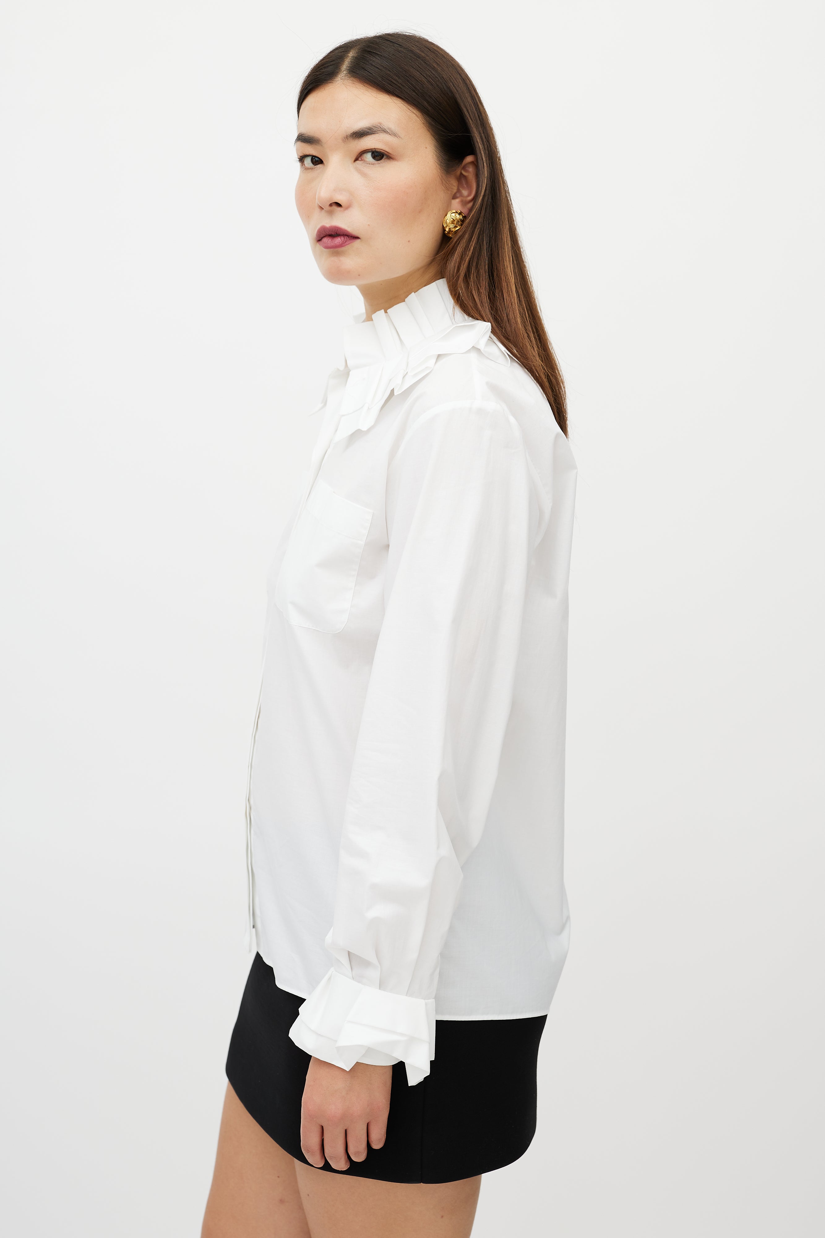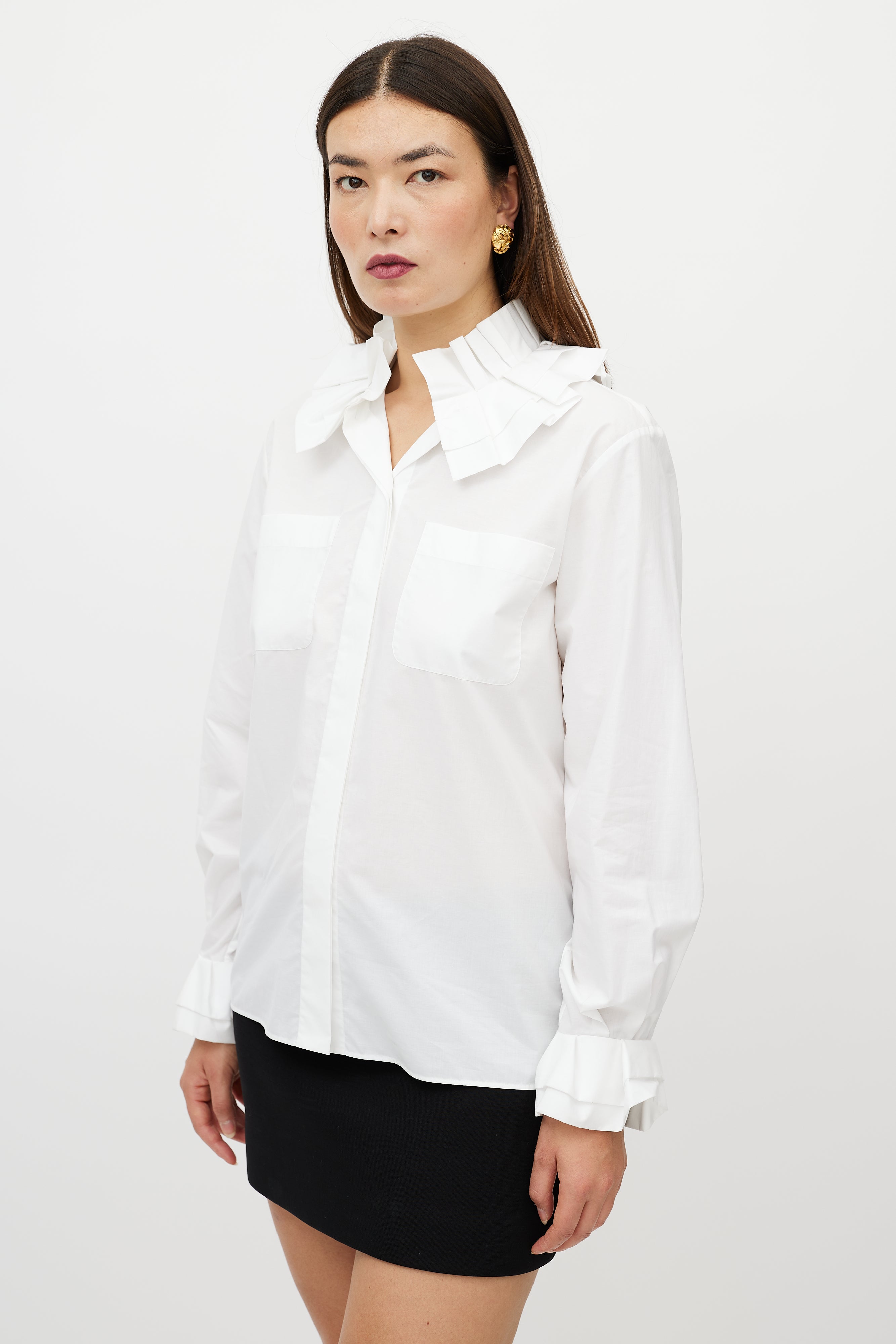 Pre-owned Chanel white shirt featuring a ruffled collar, two patch pockets at chest, long sleeves with ruffled logo button cuffs, and button closure.