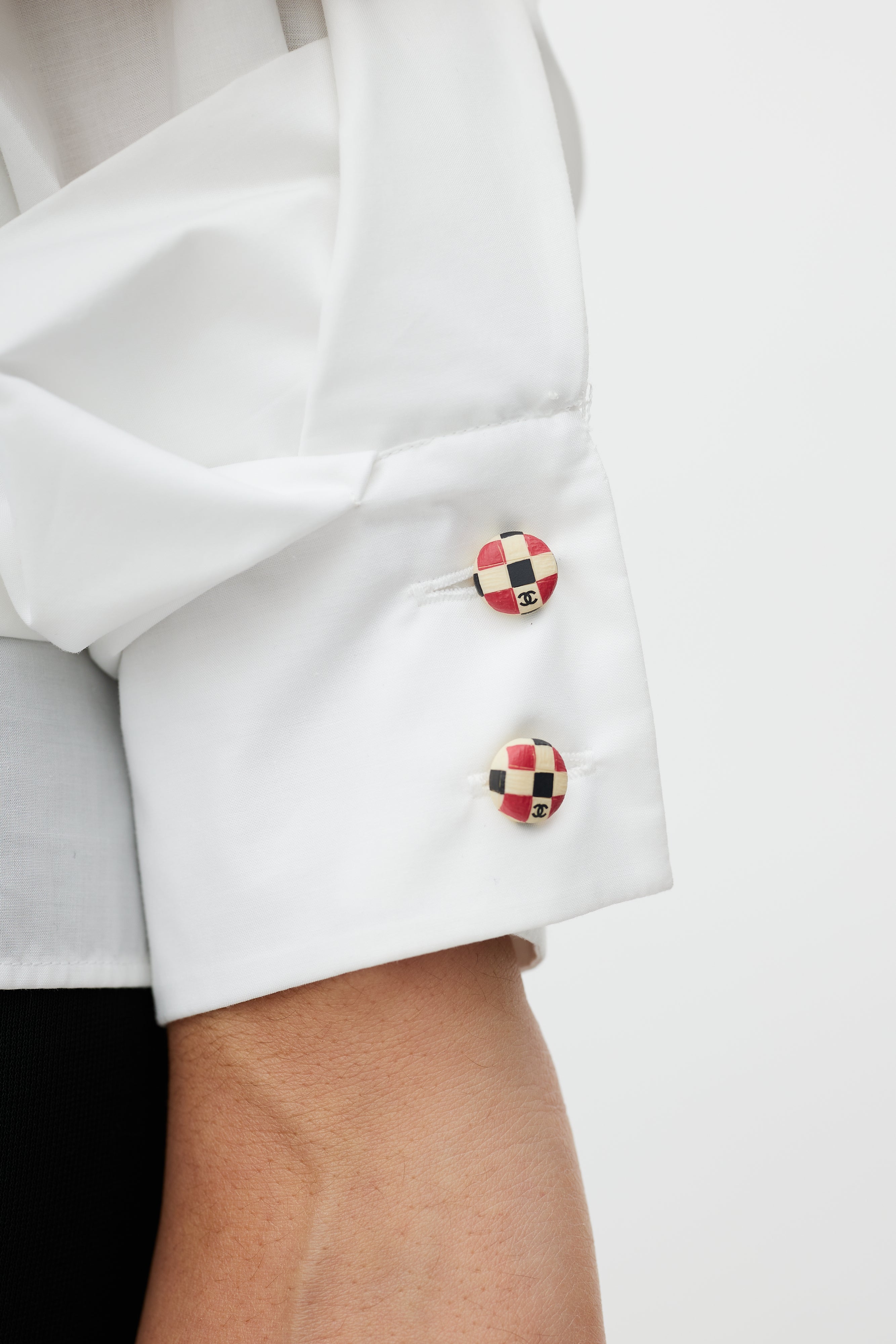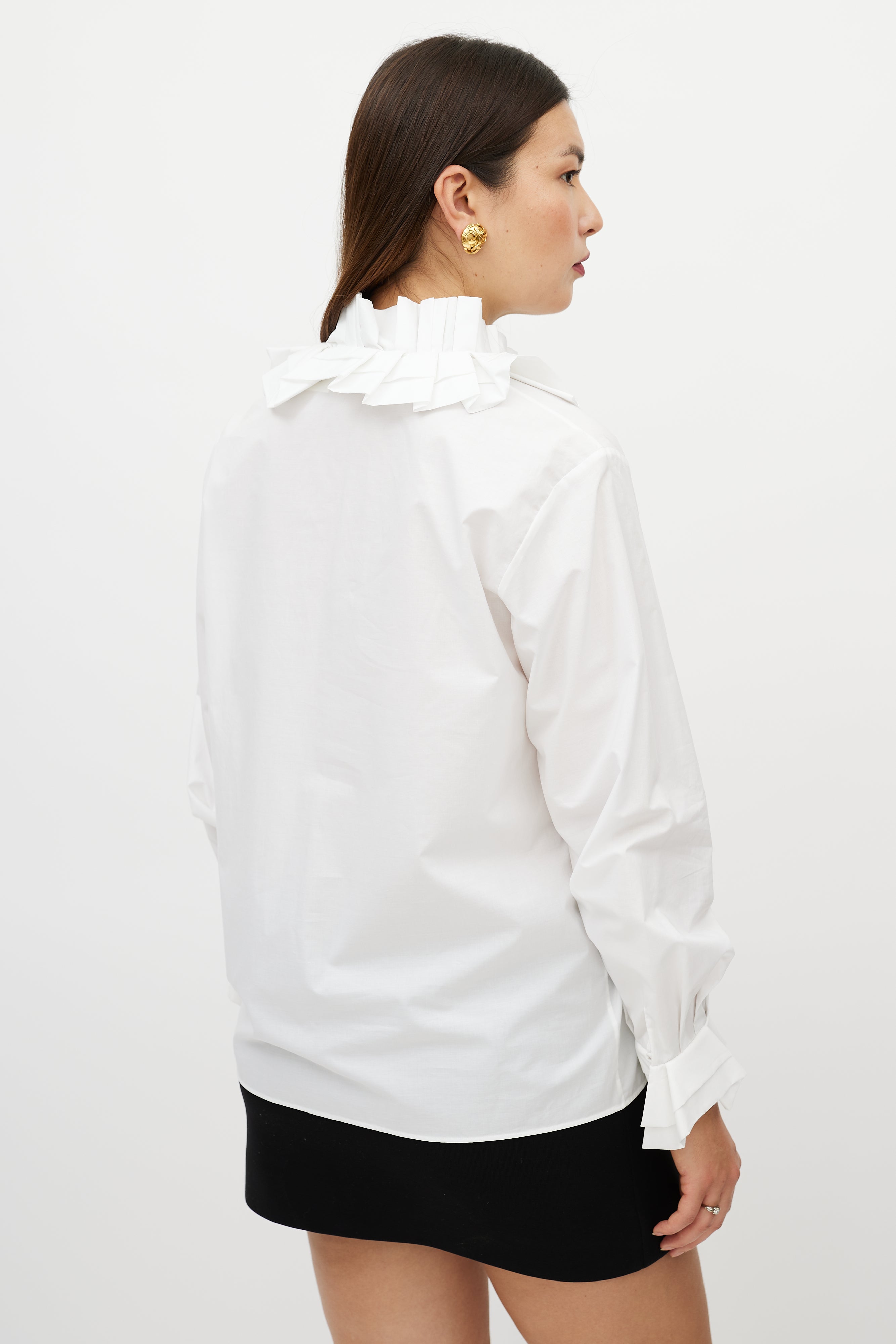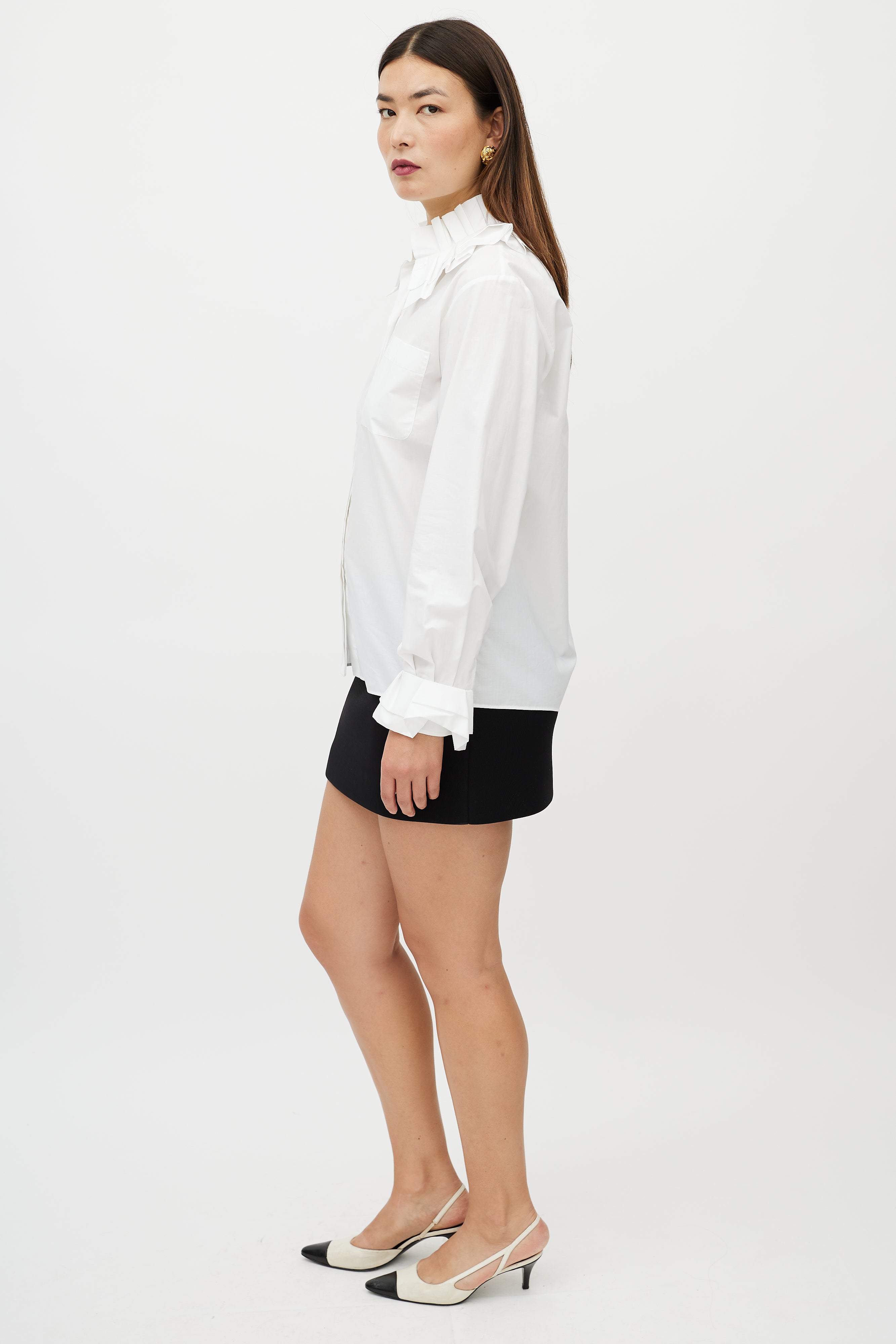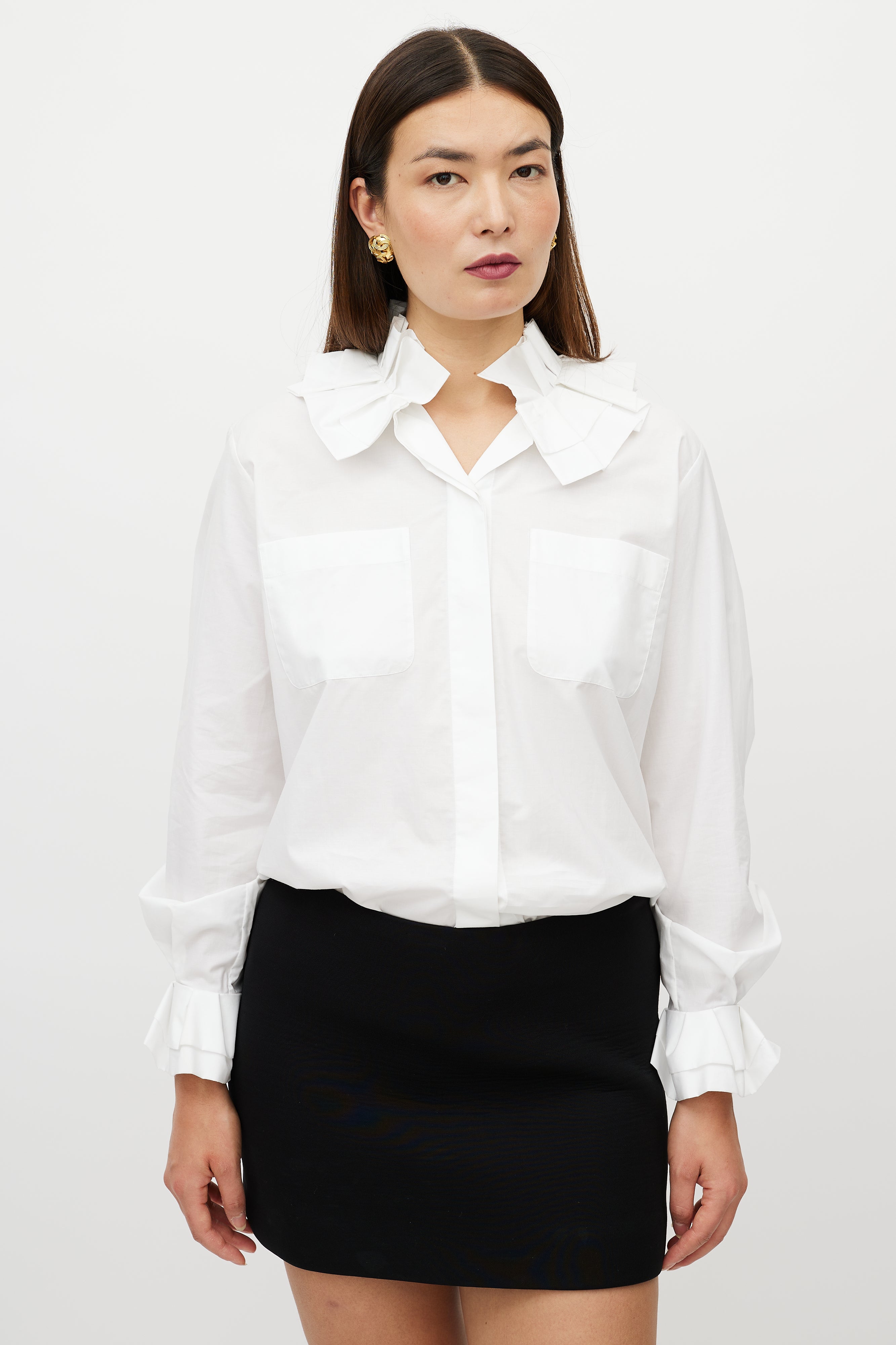 Pre-owned Chanel white shirt featuring a ruffled collar, two patch pockets at chest, long sleeves with ruffled logo button cuffs, and button closure.
