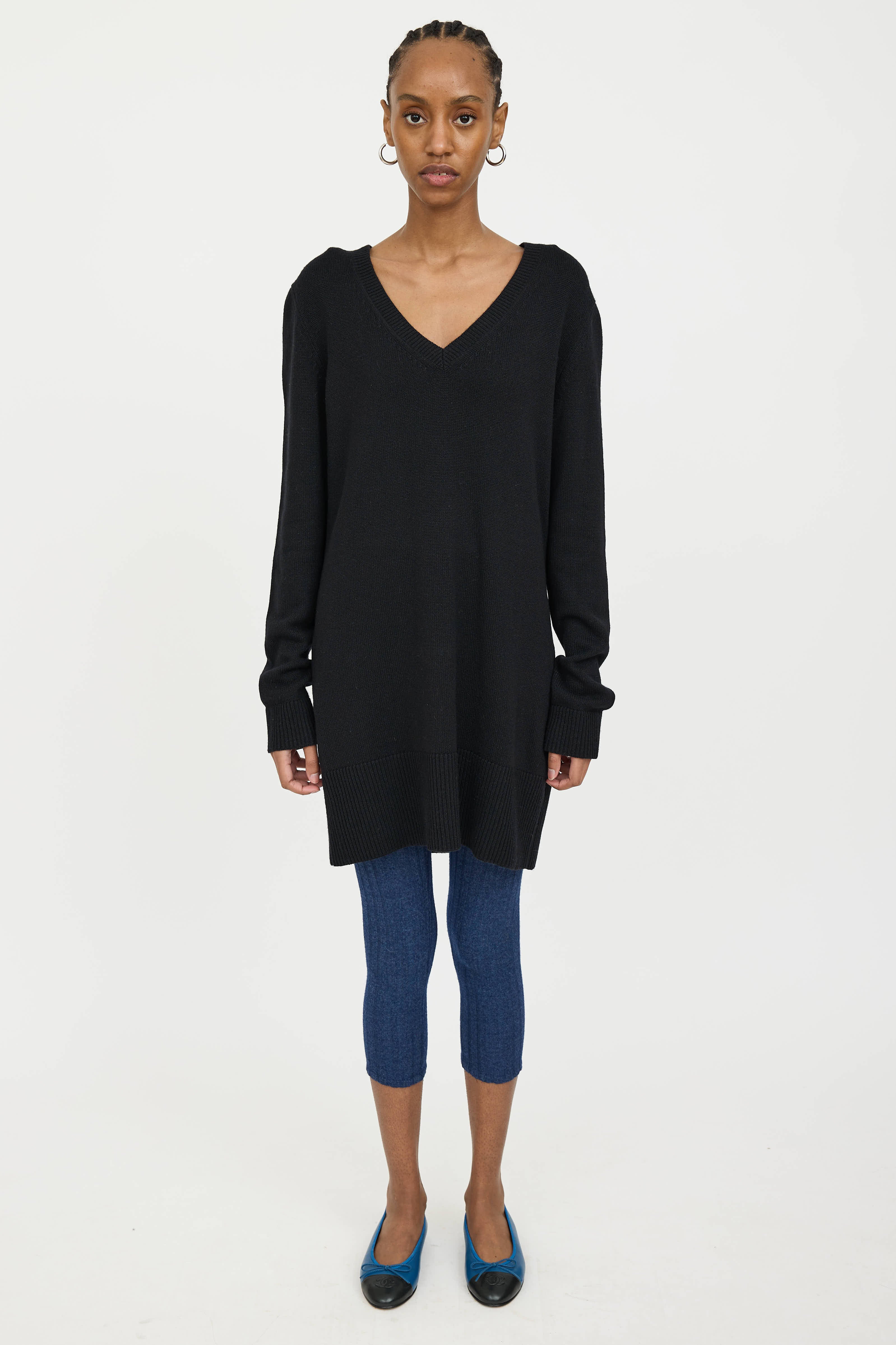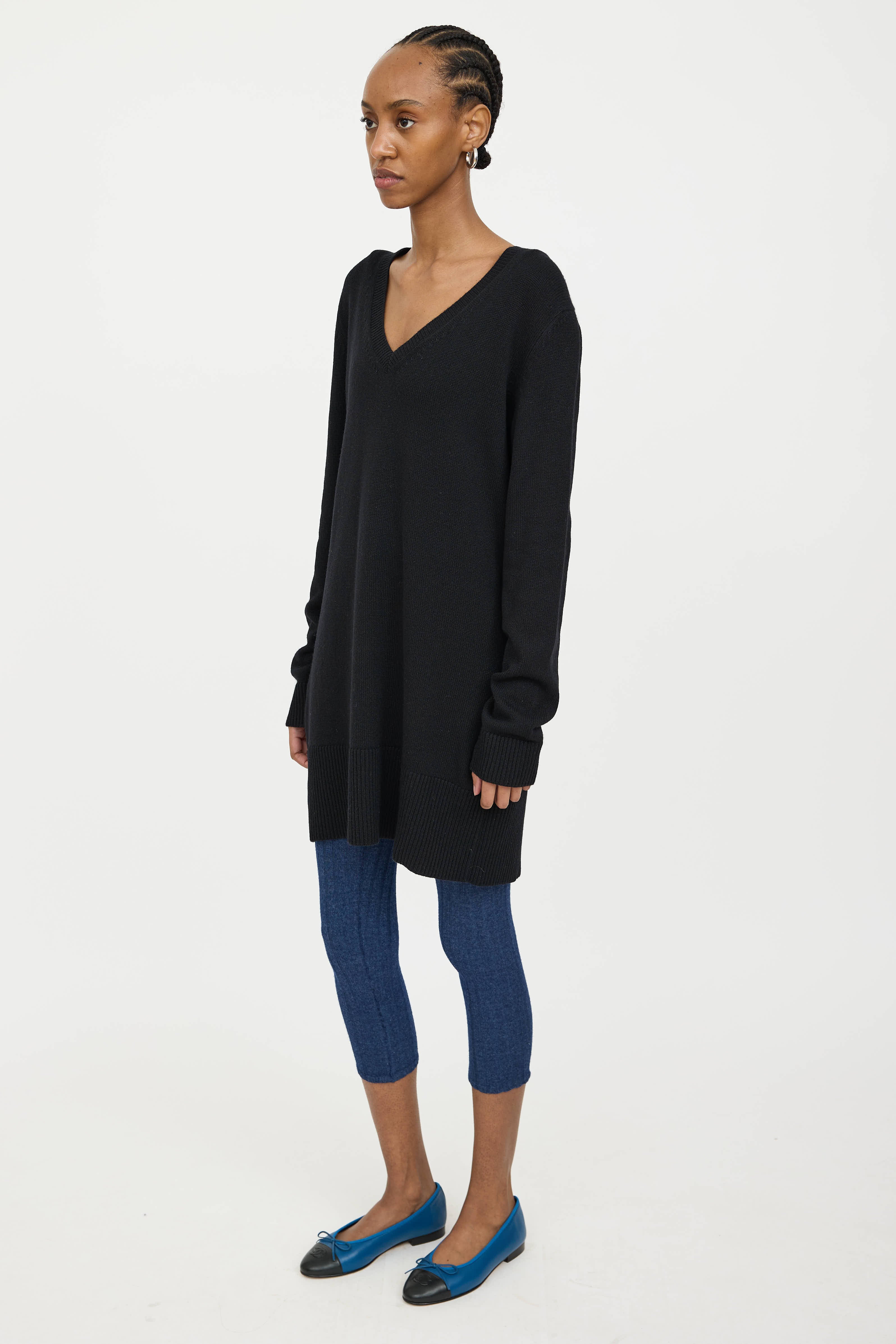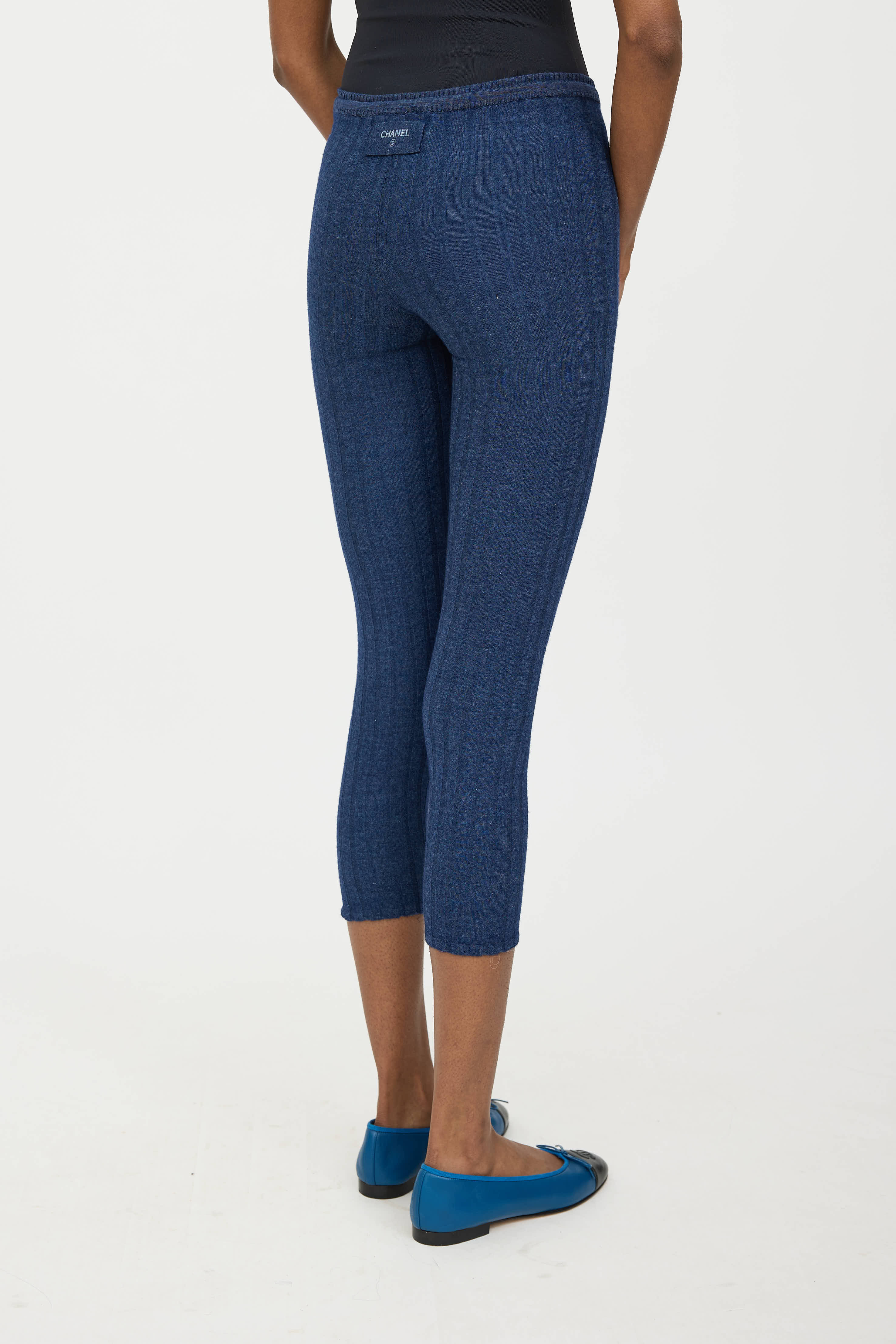 Pre-owned Chanel navy wool knit pants featuring an elastic drawstring waist, printed logo patch at back, and ribbed leg.