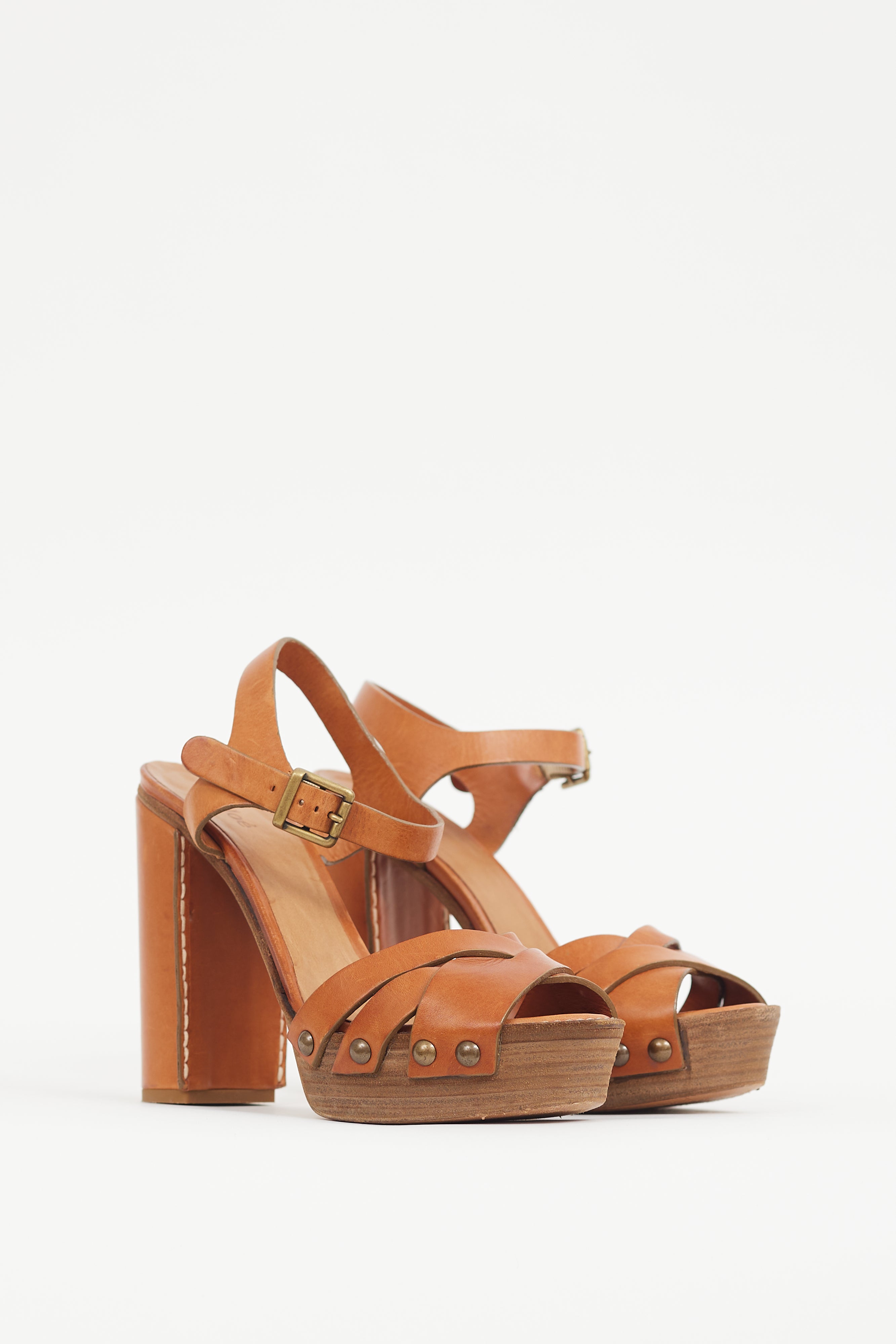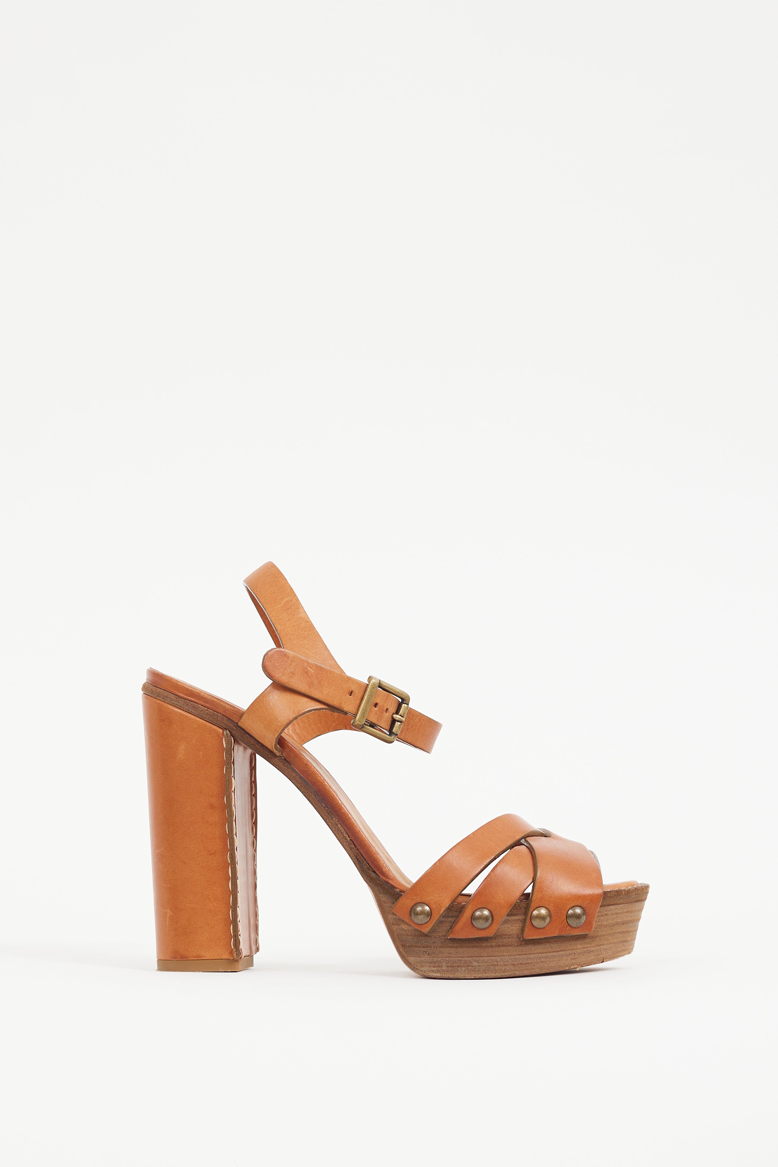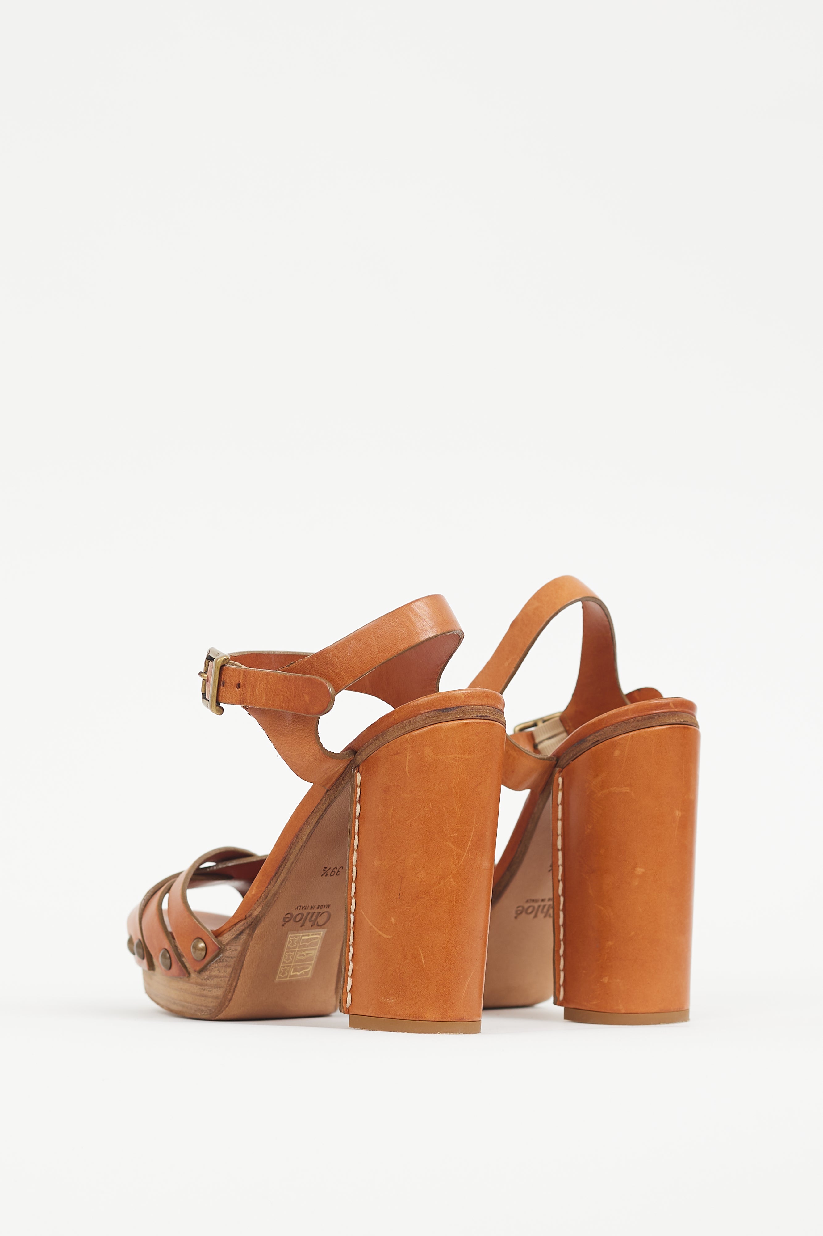 Pre-owned Chloé brown leather sandals featuring an open round toe, wrapped block heel, platform midsole, woven straps at vamp, gunmetal tone studs at sides, and adjustable strap at ankle.