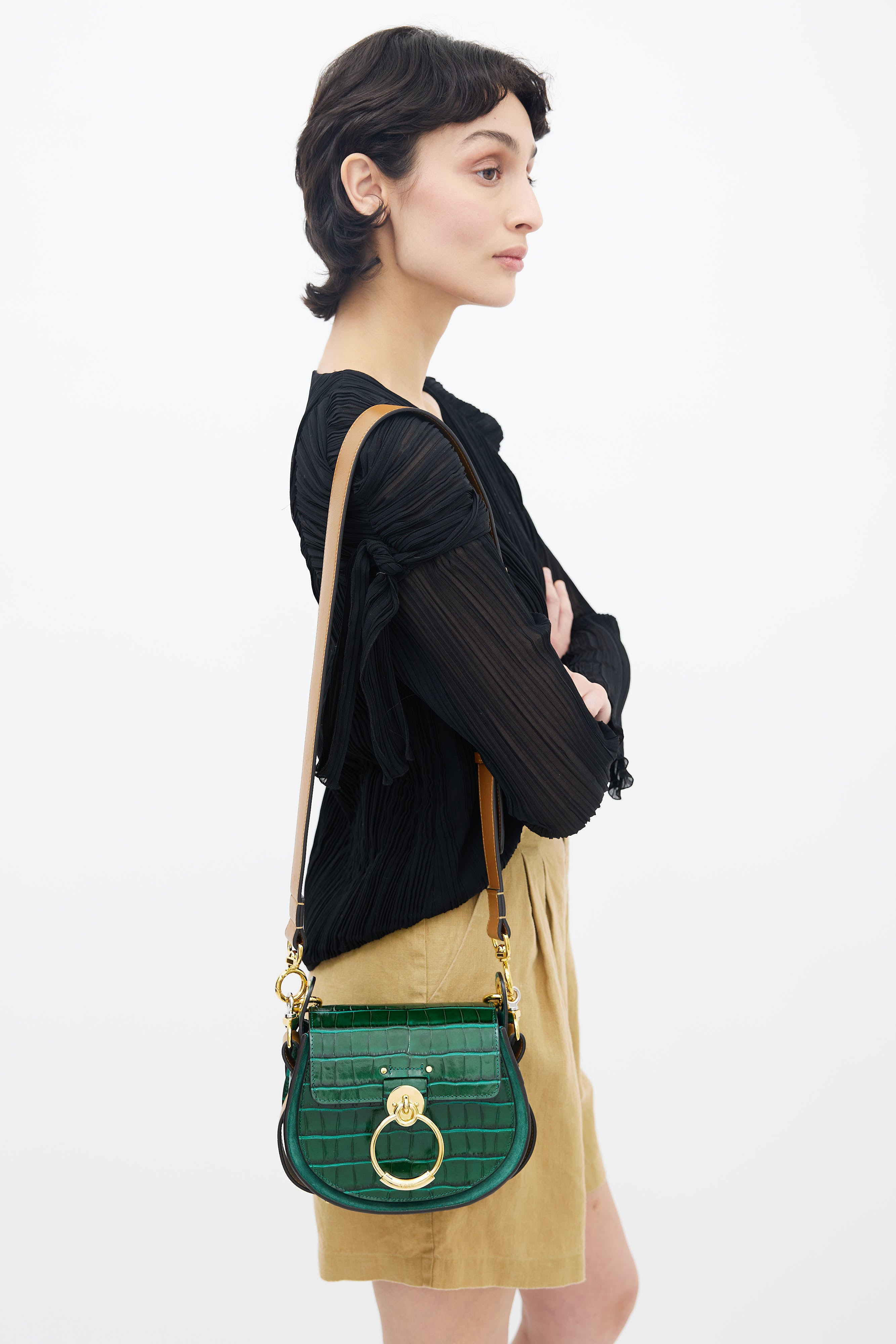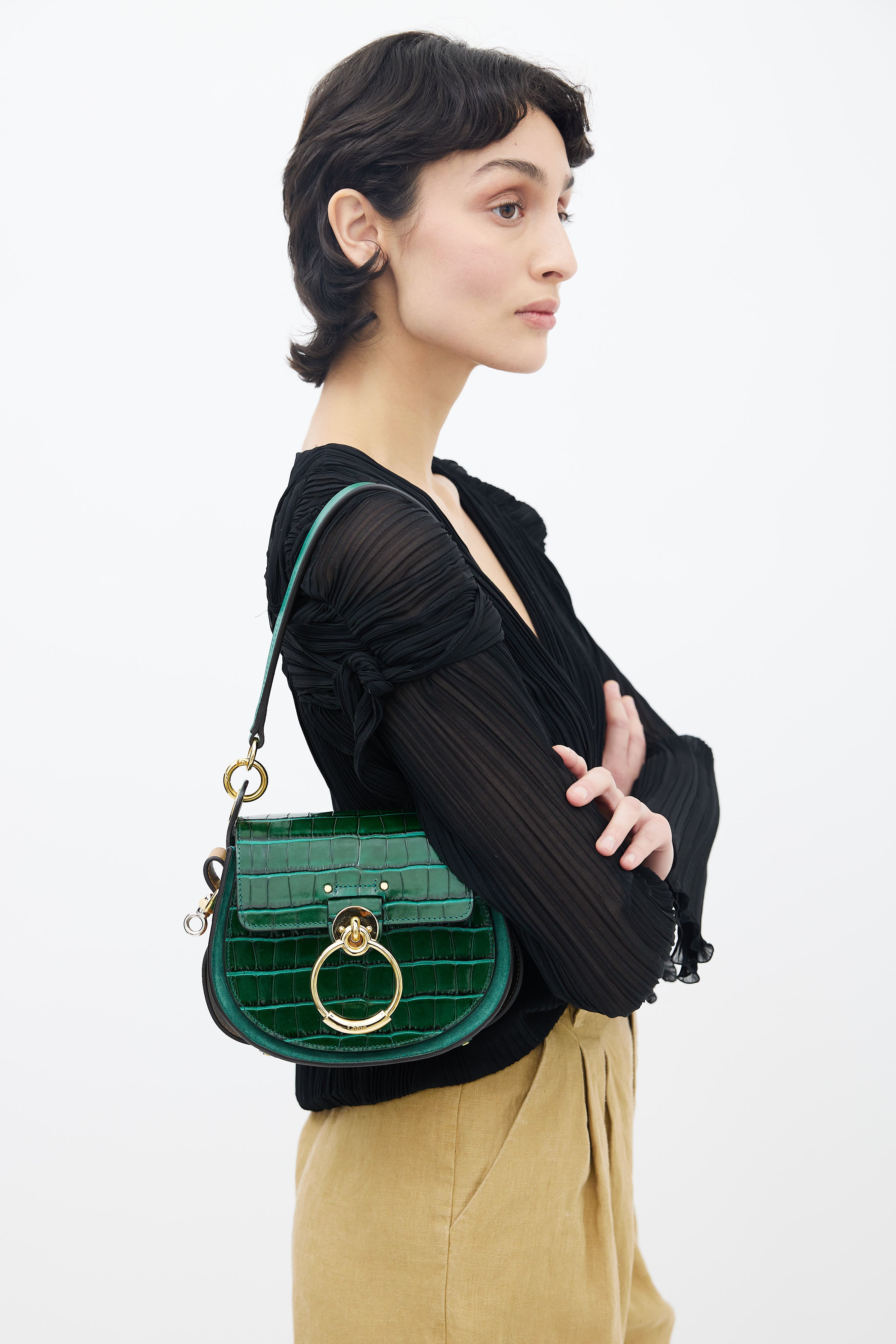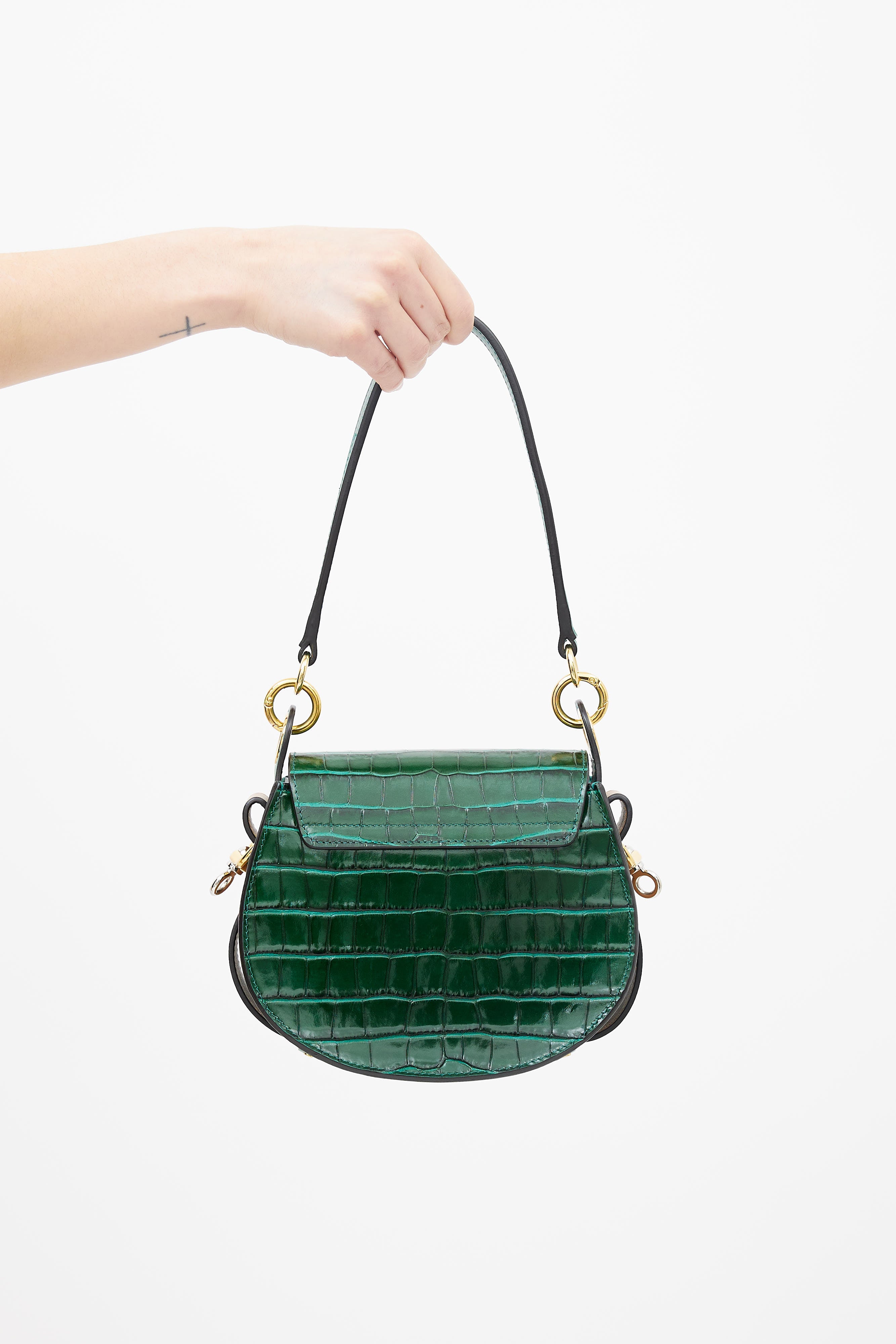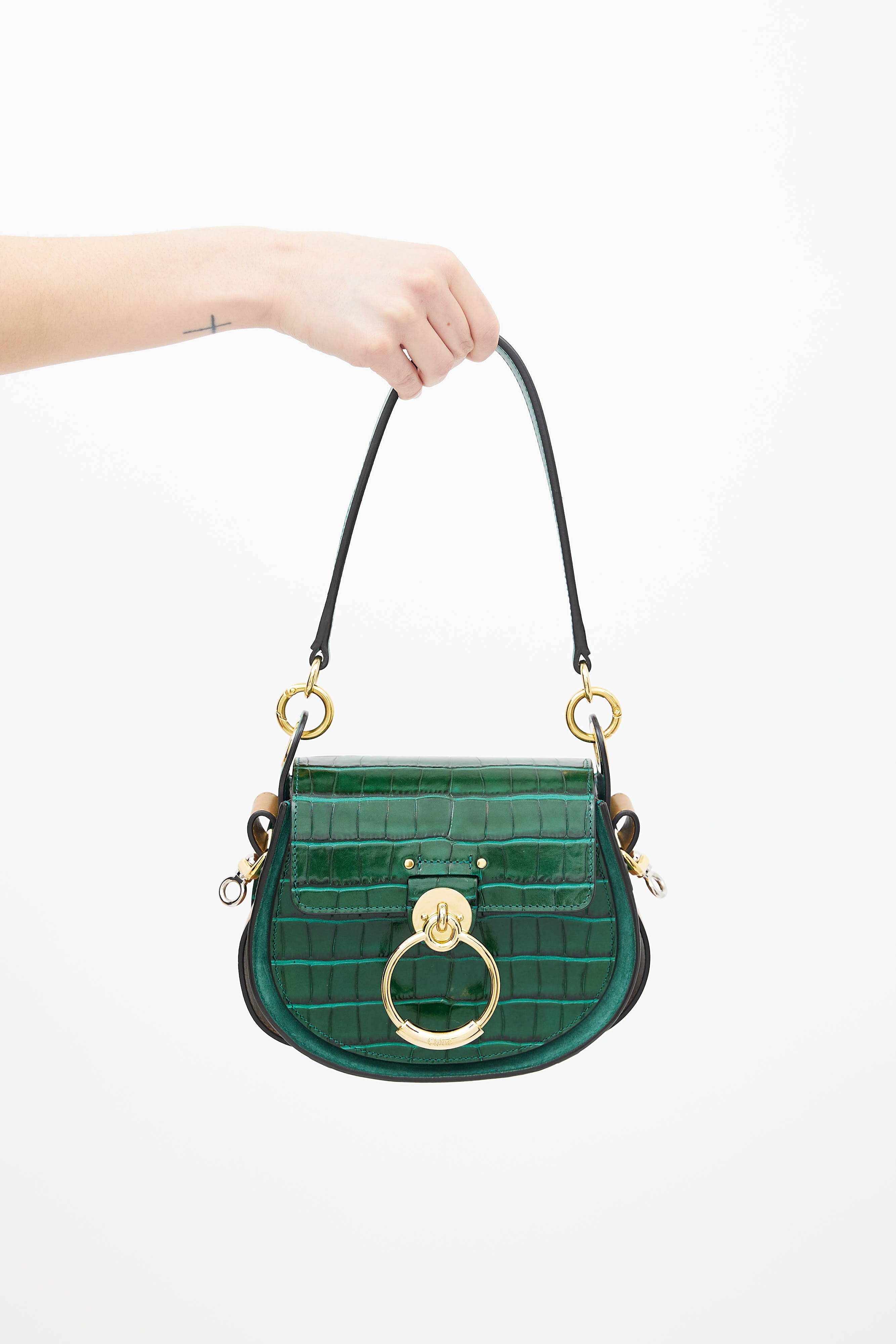 Chloé Tess bag in green featuring crocodile effect leather, gold-tone hardware, detachable brown leather shoulder strap, flat top handle, ring hardware at face with engraved logo, magnetic button closure, front slip pocket, and interior slip pocket. Original dust bag included.
