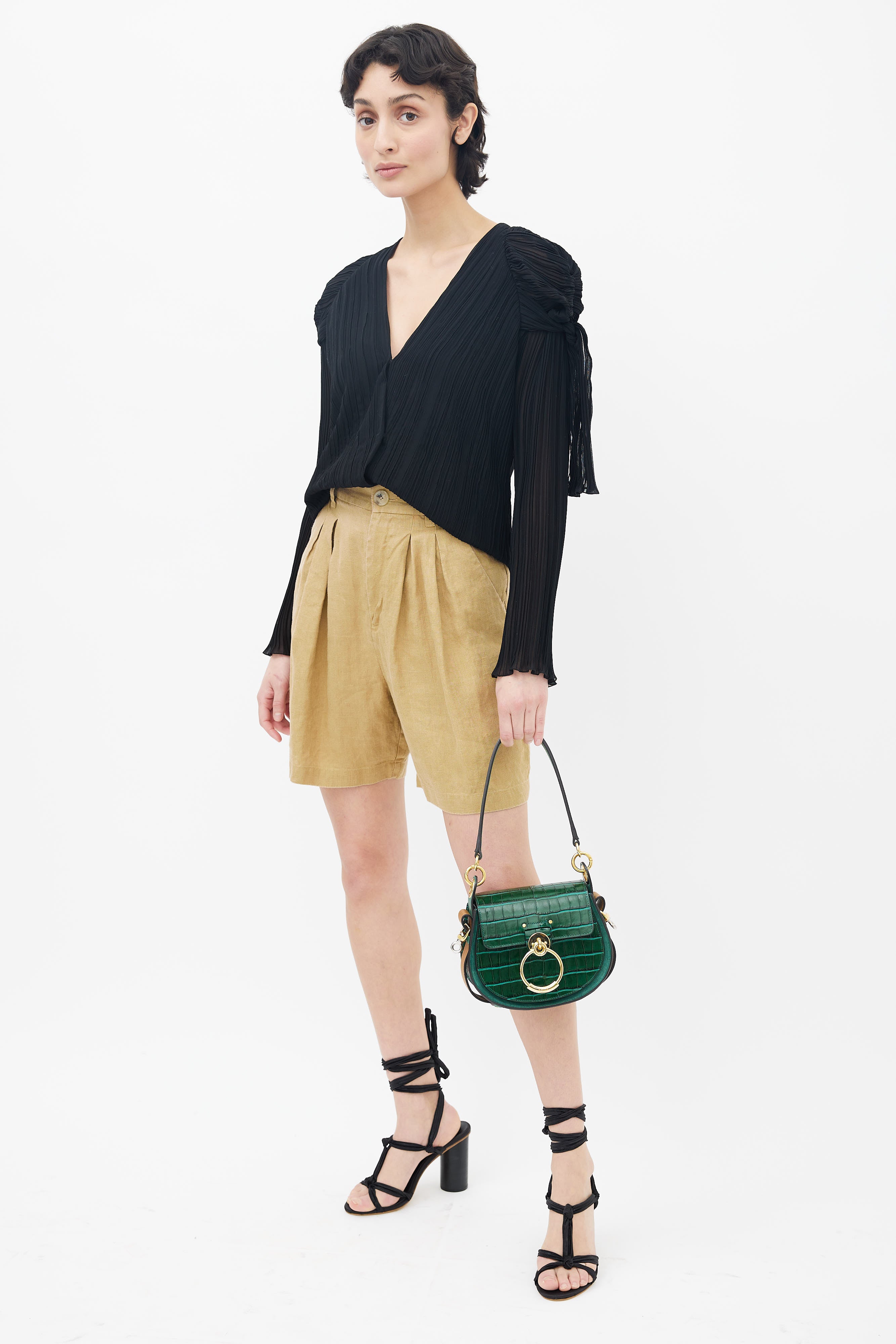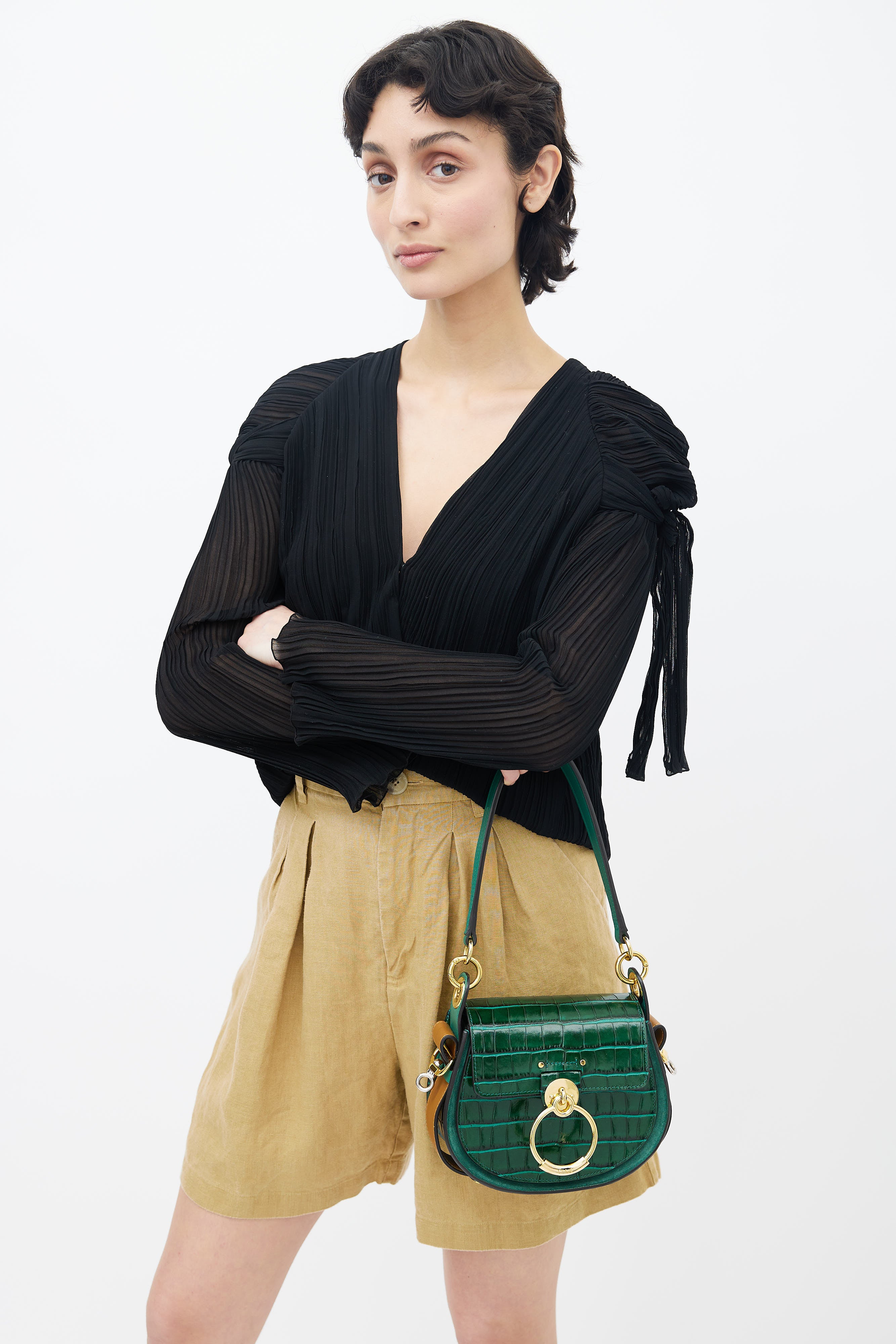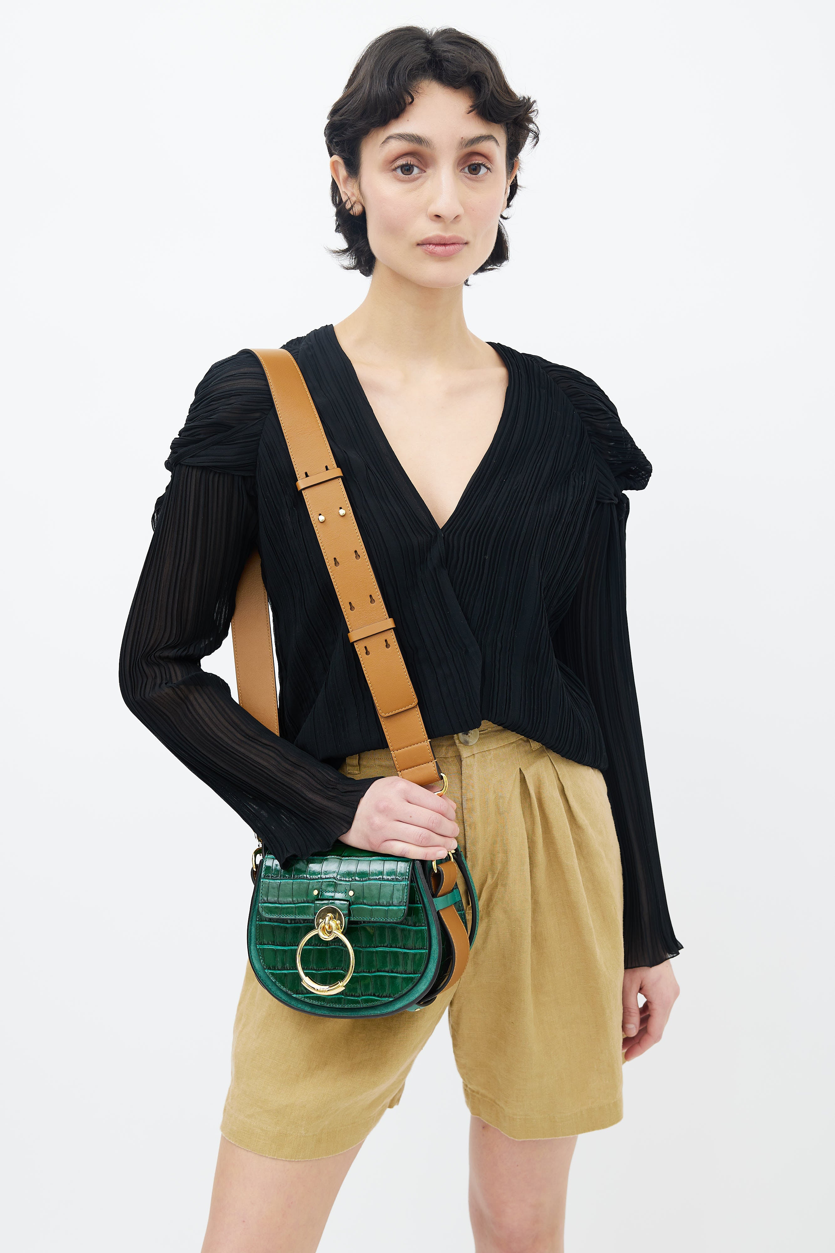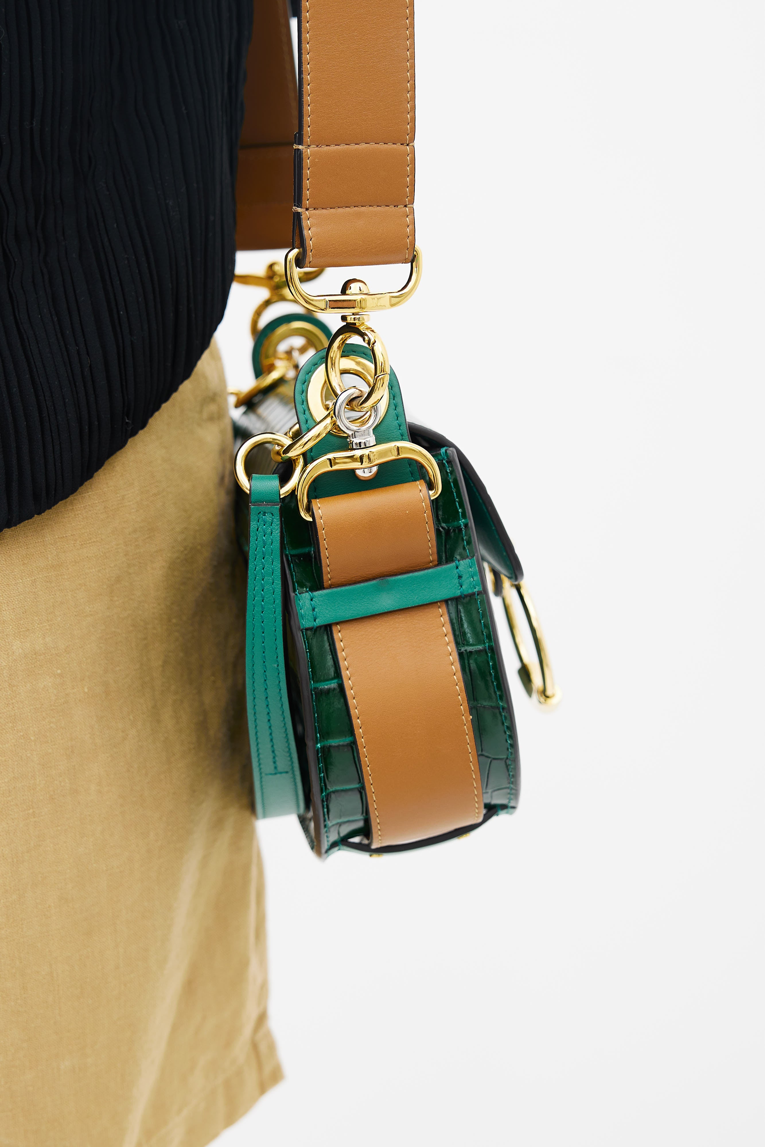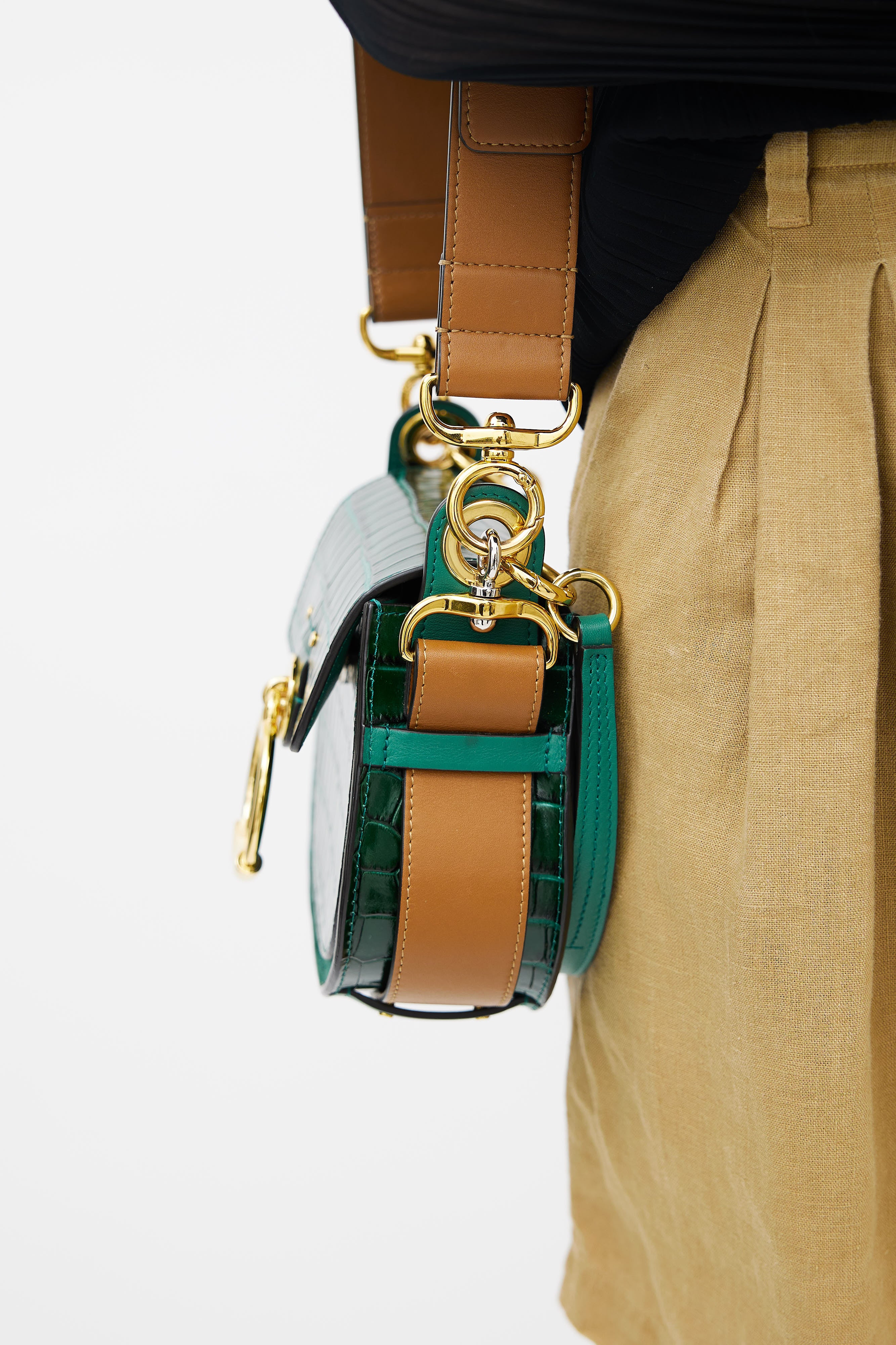 Chloé Tess bag in green featuring crocodile effect leather, gold-tone hardware, detachable brown leather shoulder strap, flat top handle, ring hardware at face with engraved logo, magnetic button closure, front slip pocket, and interior slip pocket. Original dust bag included.