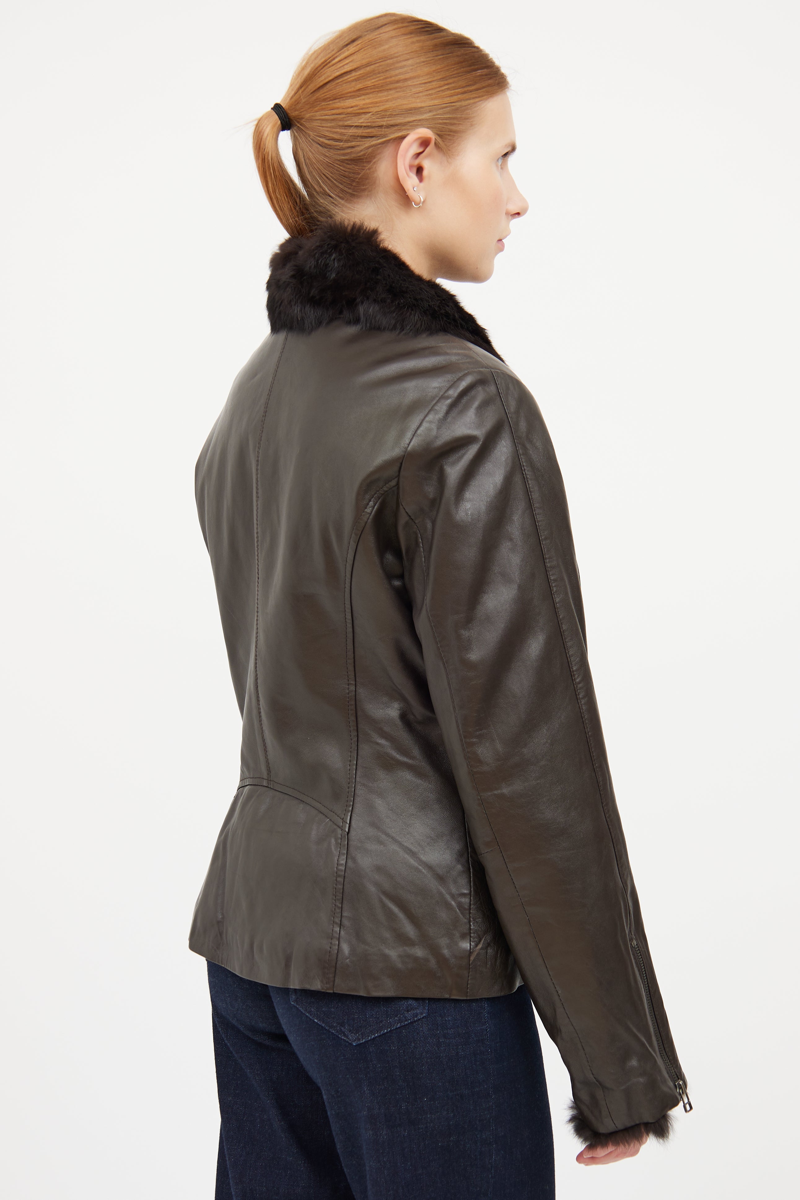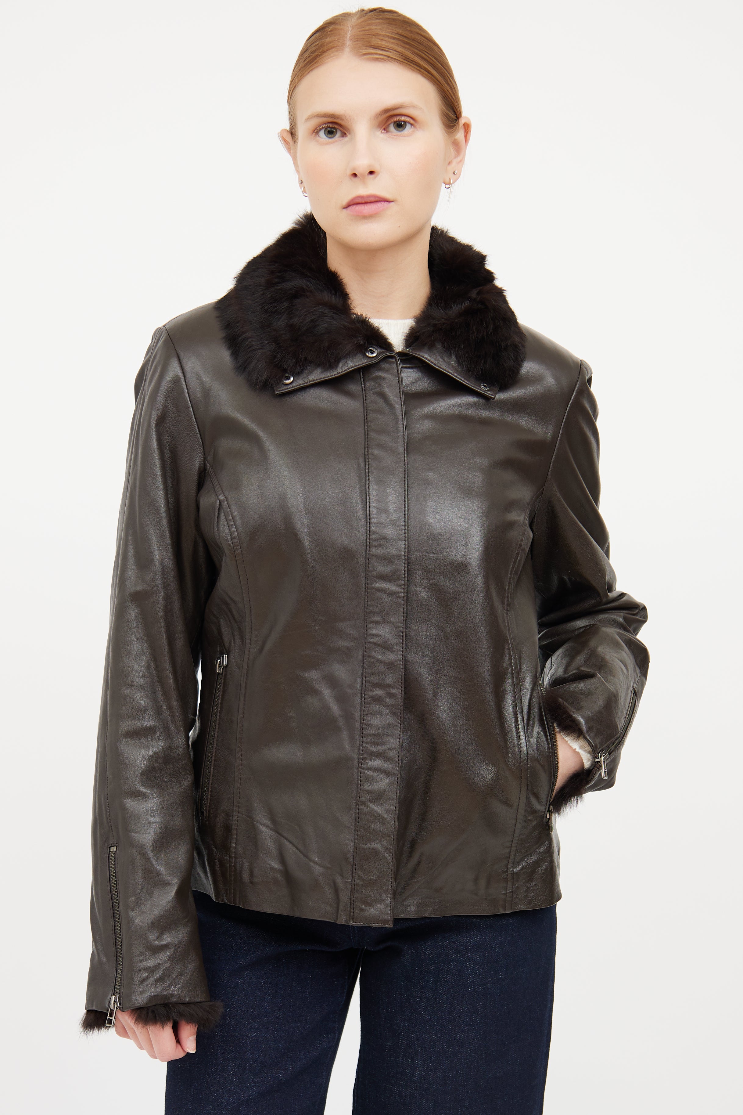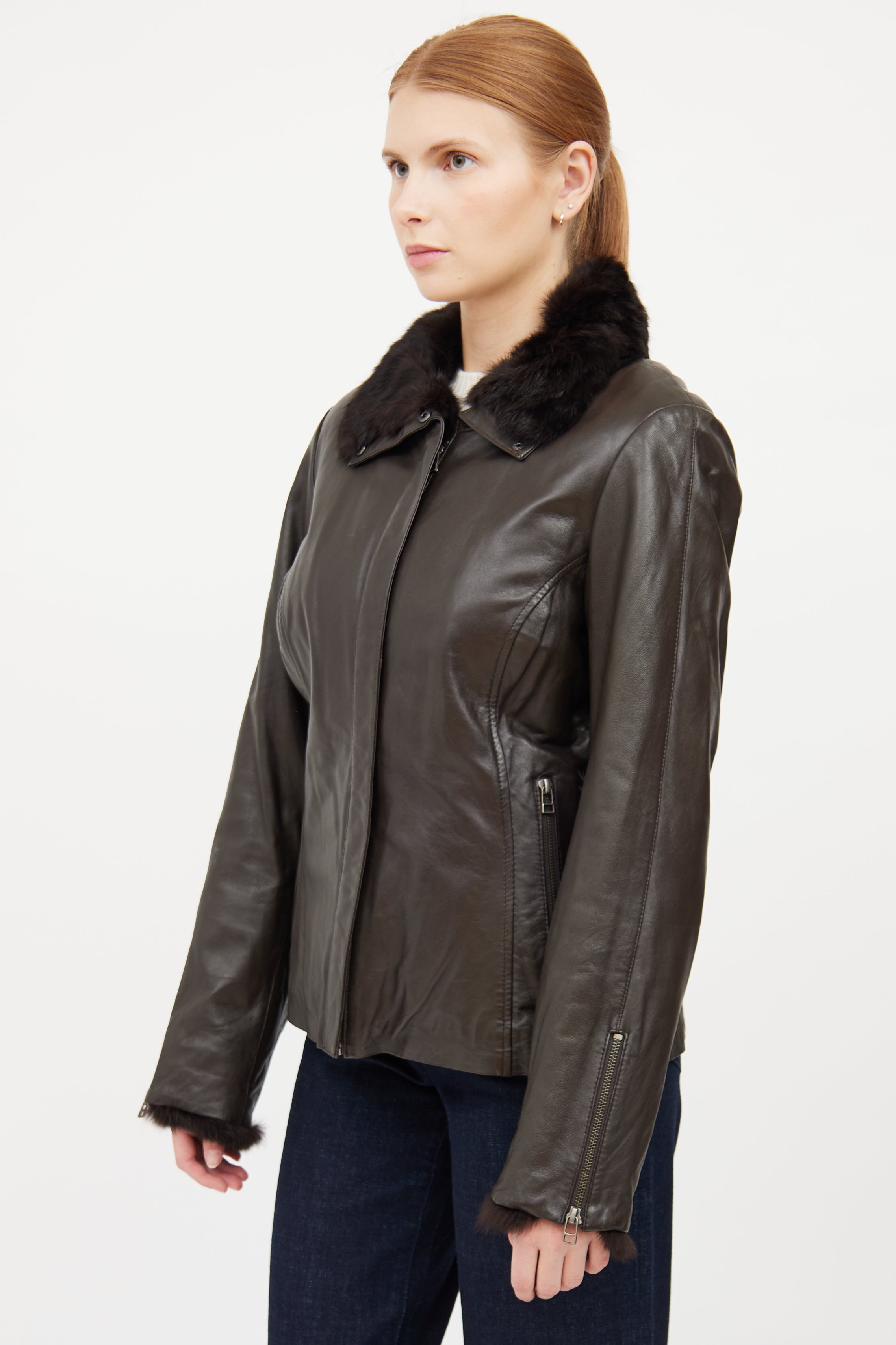 Pre-owned Danier brown leather jacket featuring point collar, long sleeves with zip cuffs, slight padding at shoulder, concealed zip front closure, slight flare at hem, gathered detail at back and tonal rabbit fur lining at collar and cuffs. Fully lined.