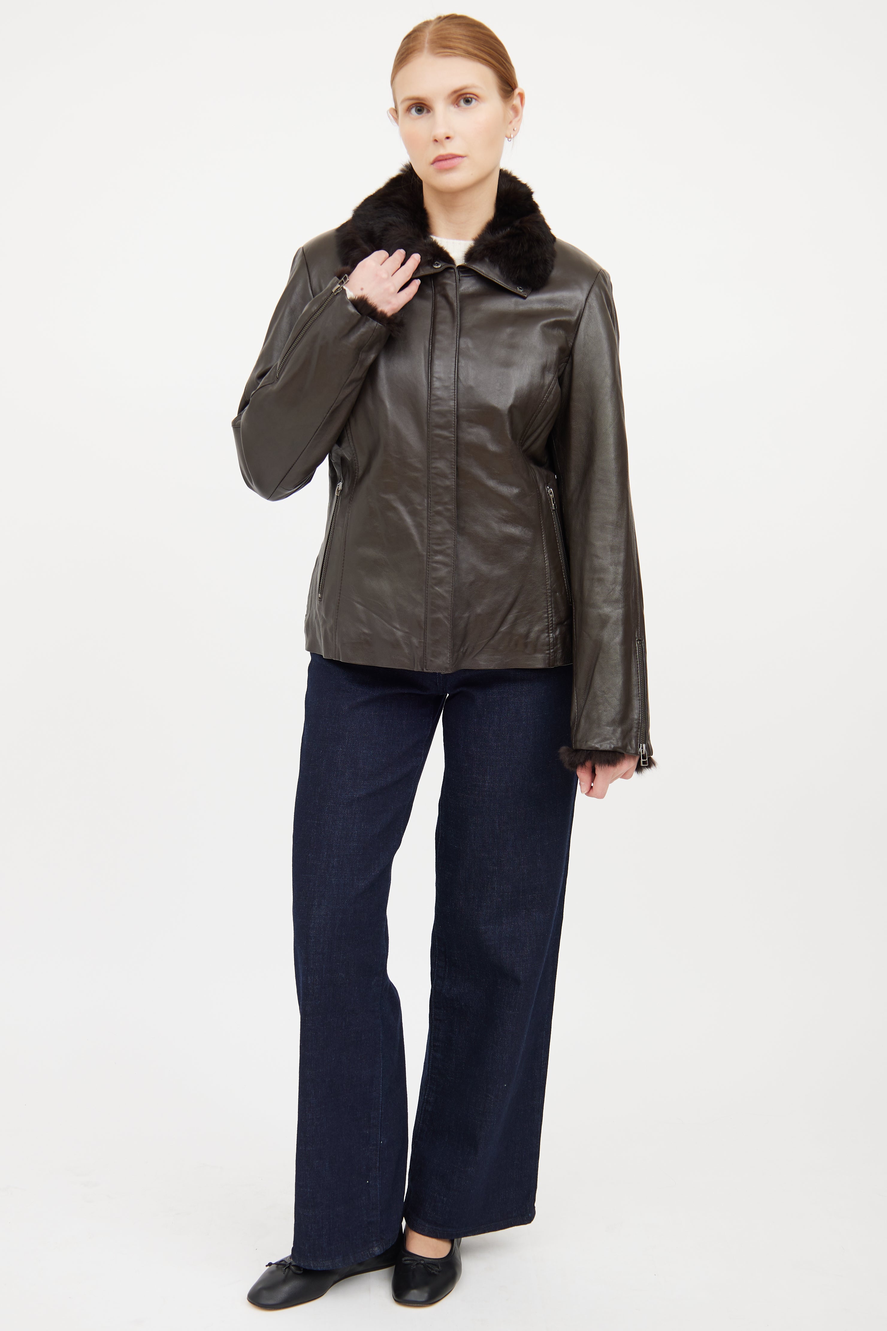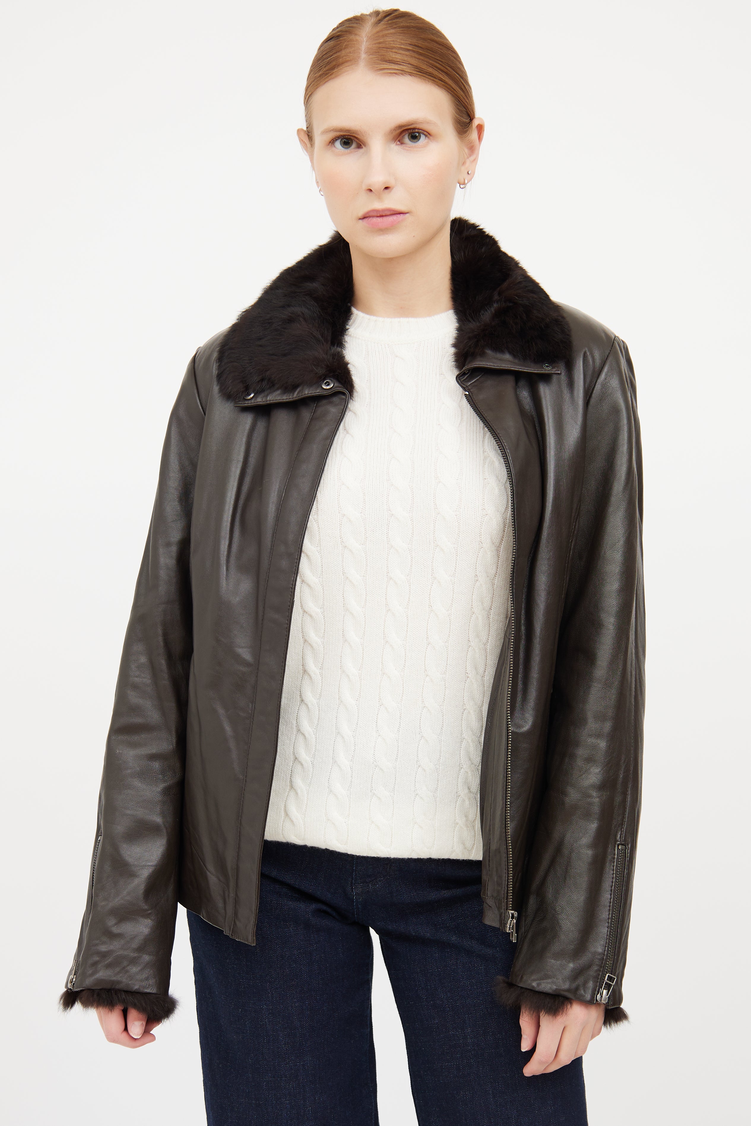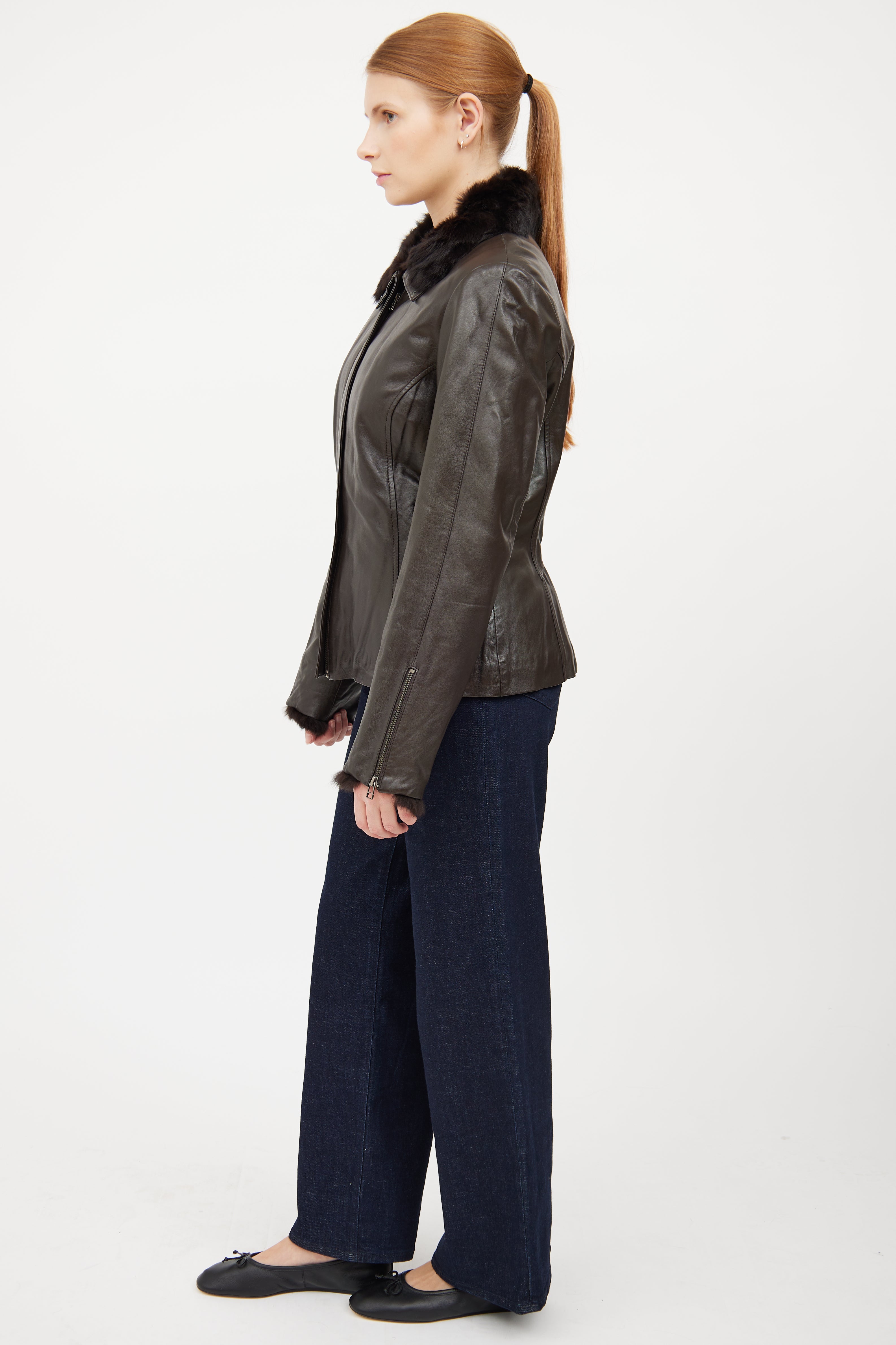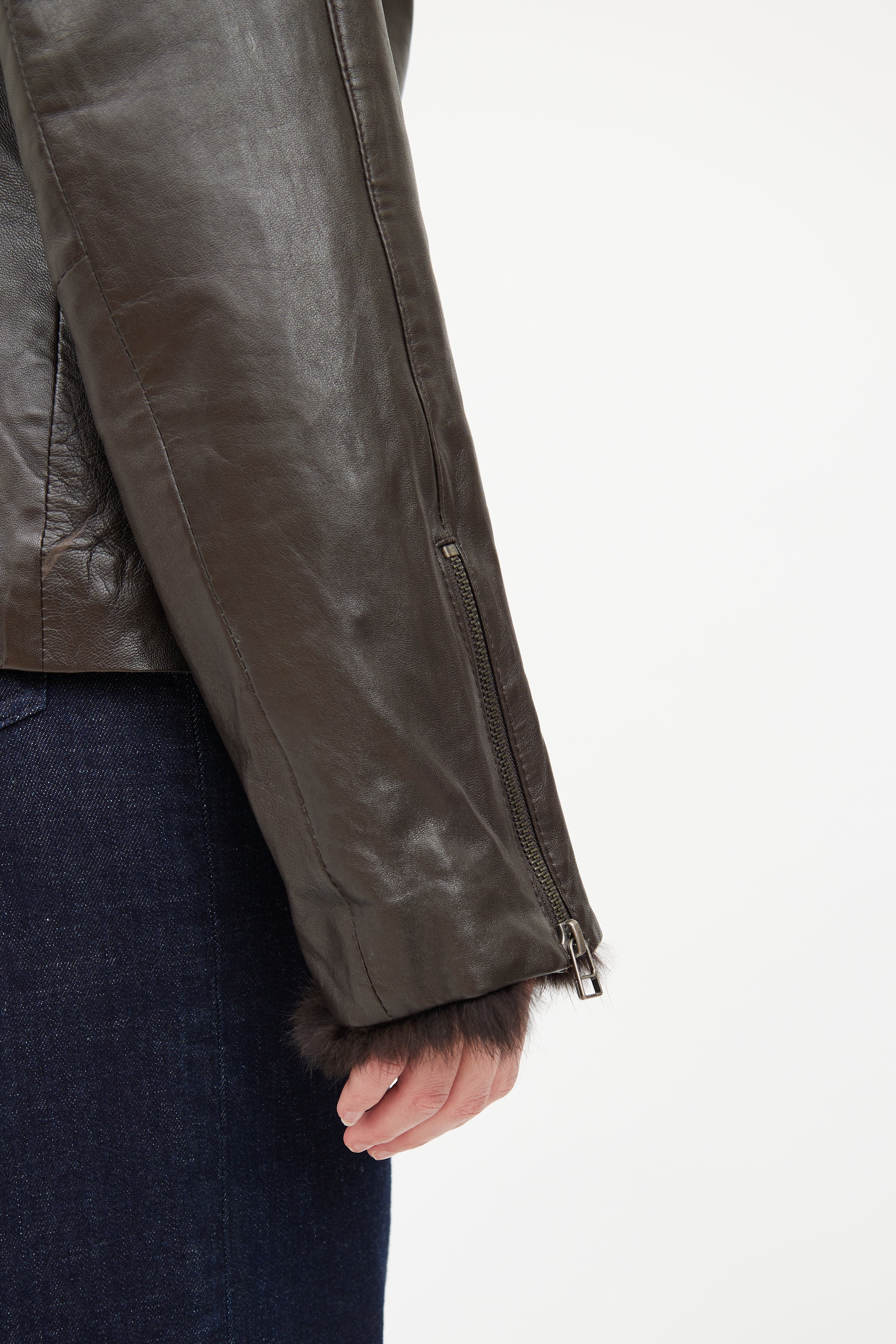 Pre-owned Danier brown leather jacket featuring point collar, long sleeves with zip cuffs, slight padding at shoulder, concealed zip front closure, slight flare at hem, gathered detail at back and tonal rabbit fur lining at collar and cuffs. Fully lined.