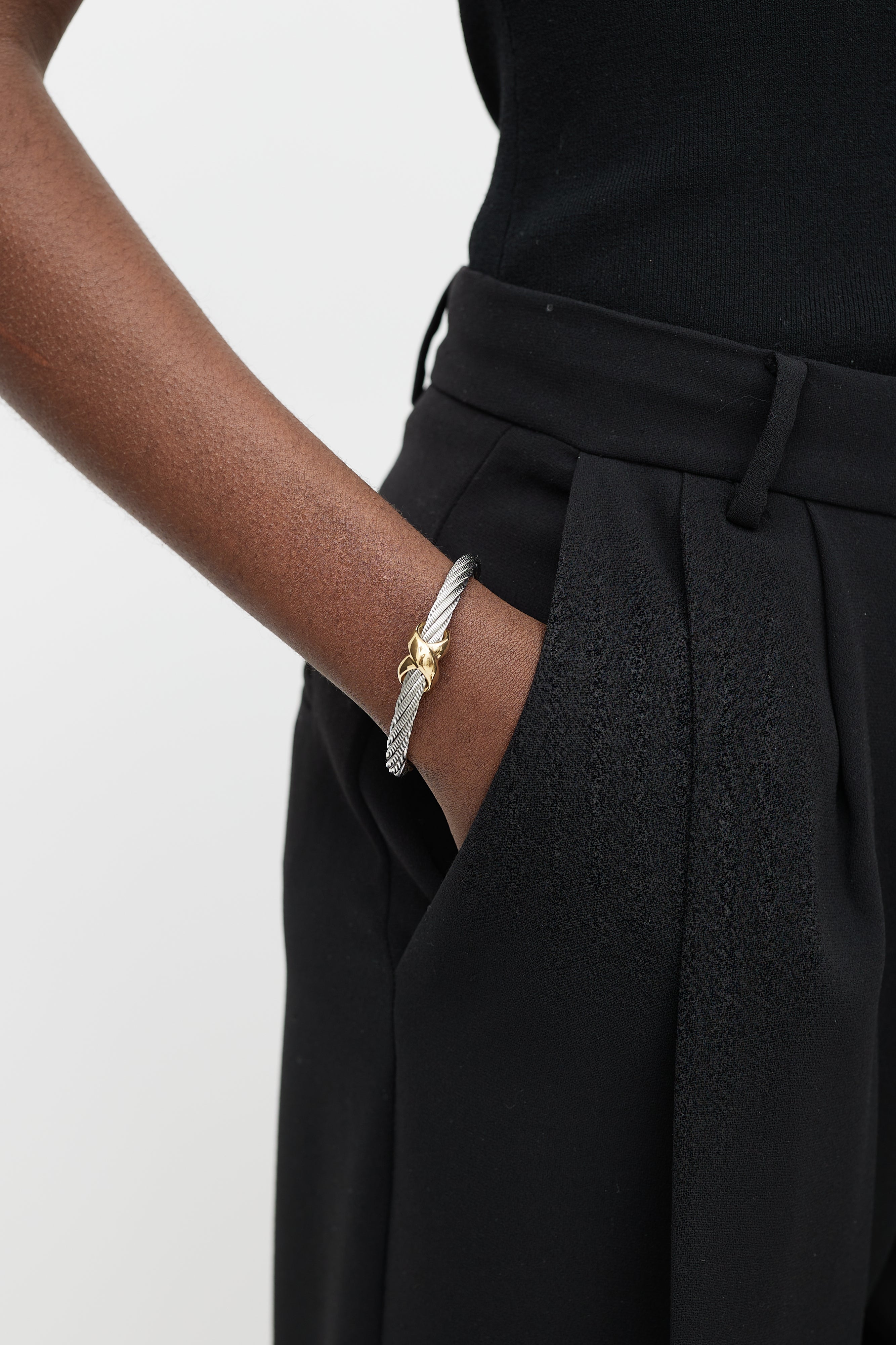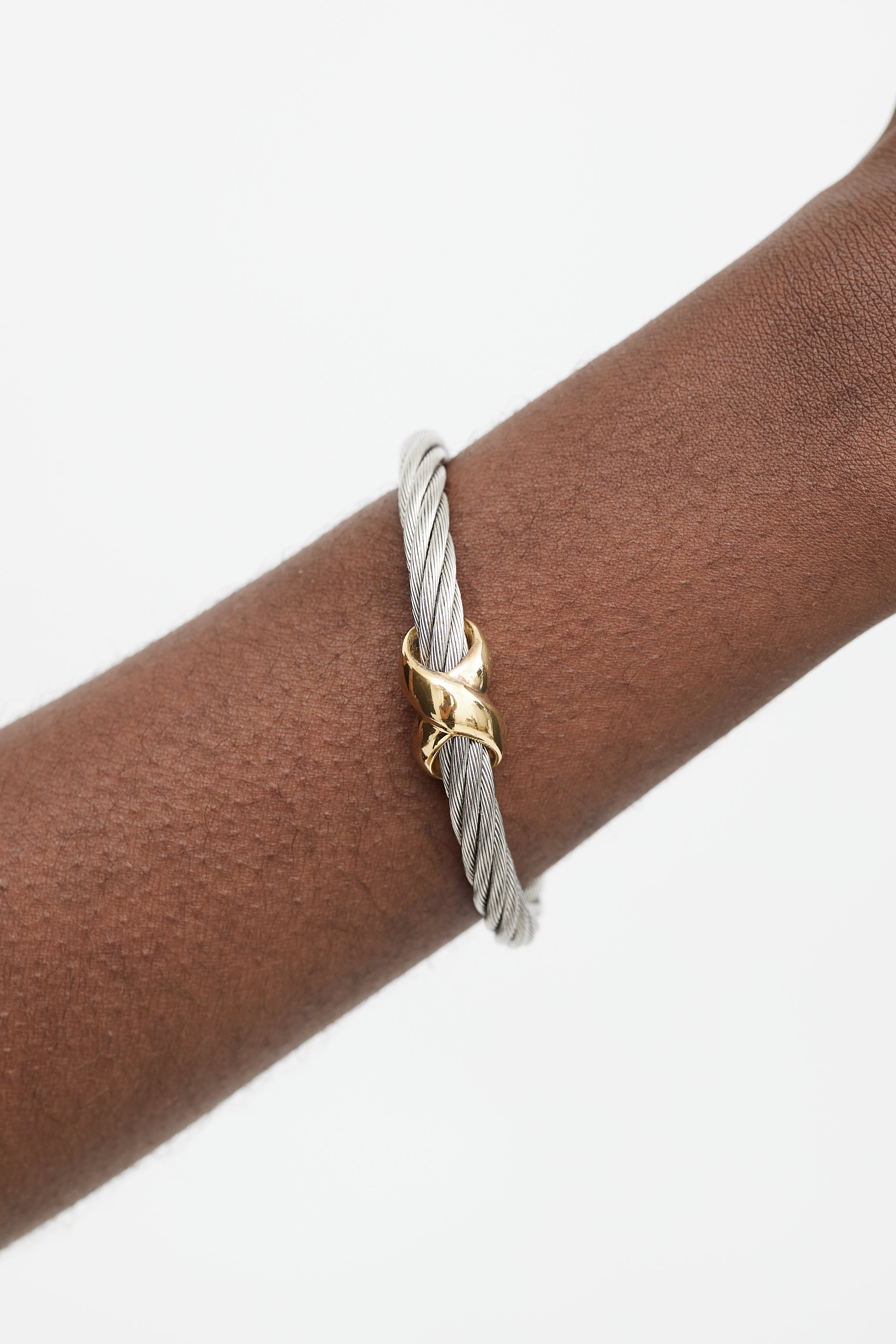 Pre-owned David Yurman silver Station bracelet featuring a cable band, gold tone hardware at ends, and gold tone hardware at middle.
