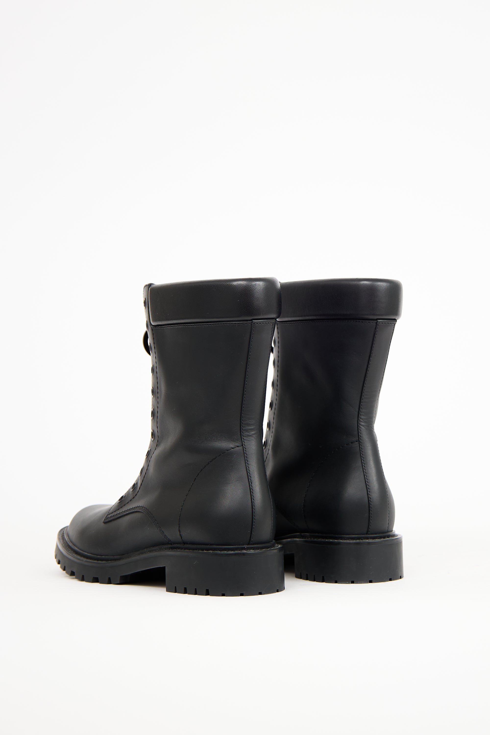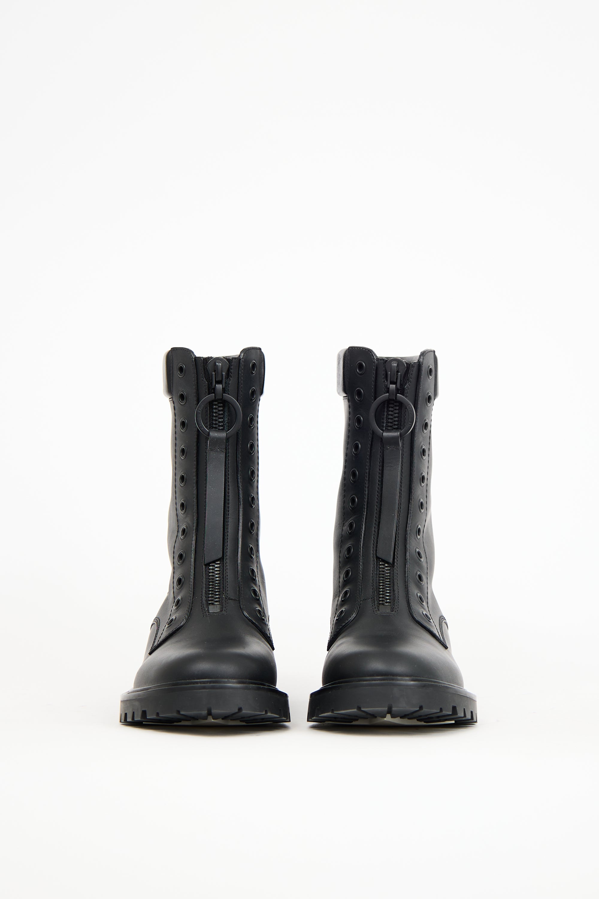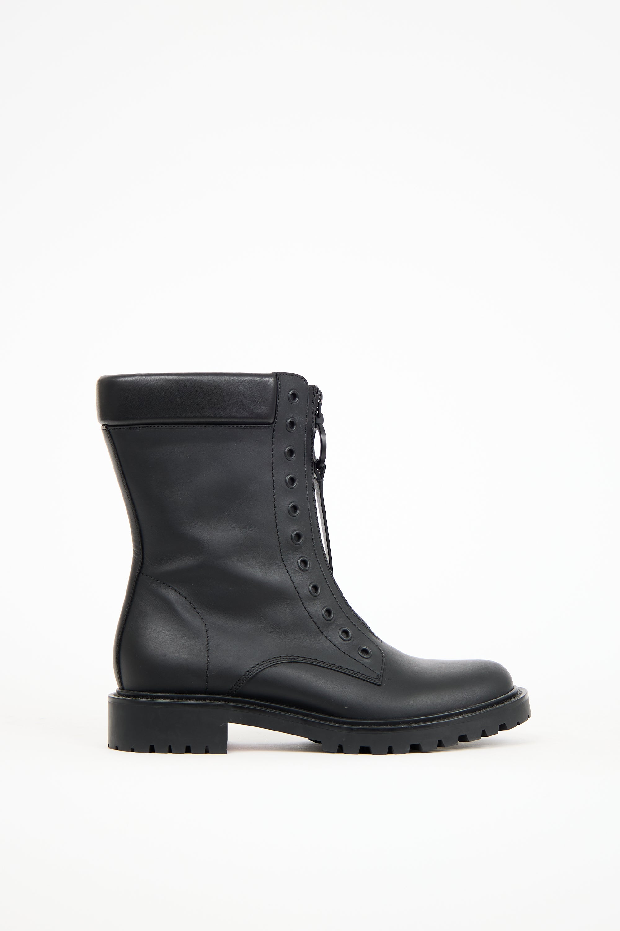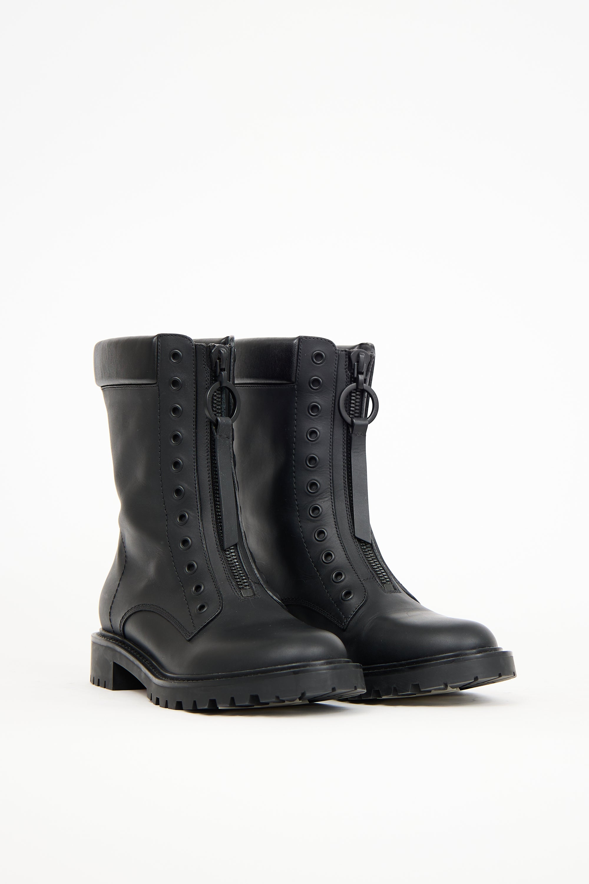Pre-owned Dior black leather Bold combat boots featuring a rounded toe, zip closure at front uppers with a logo engraved circle zipper detail, padded leather trim, and treaded outsole.