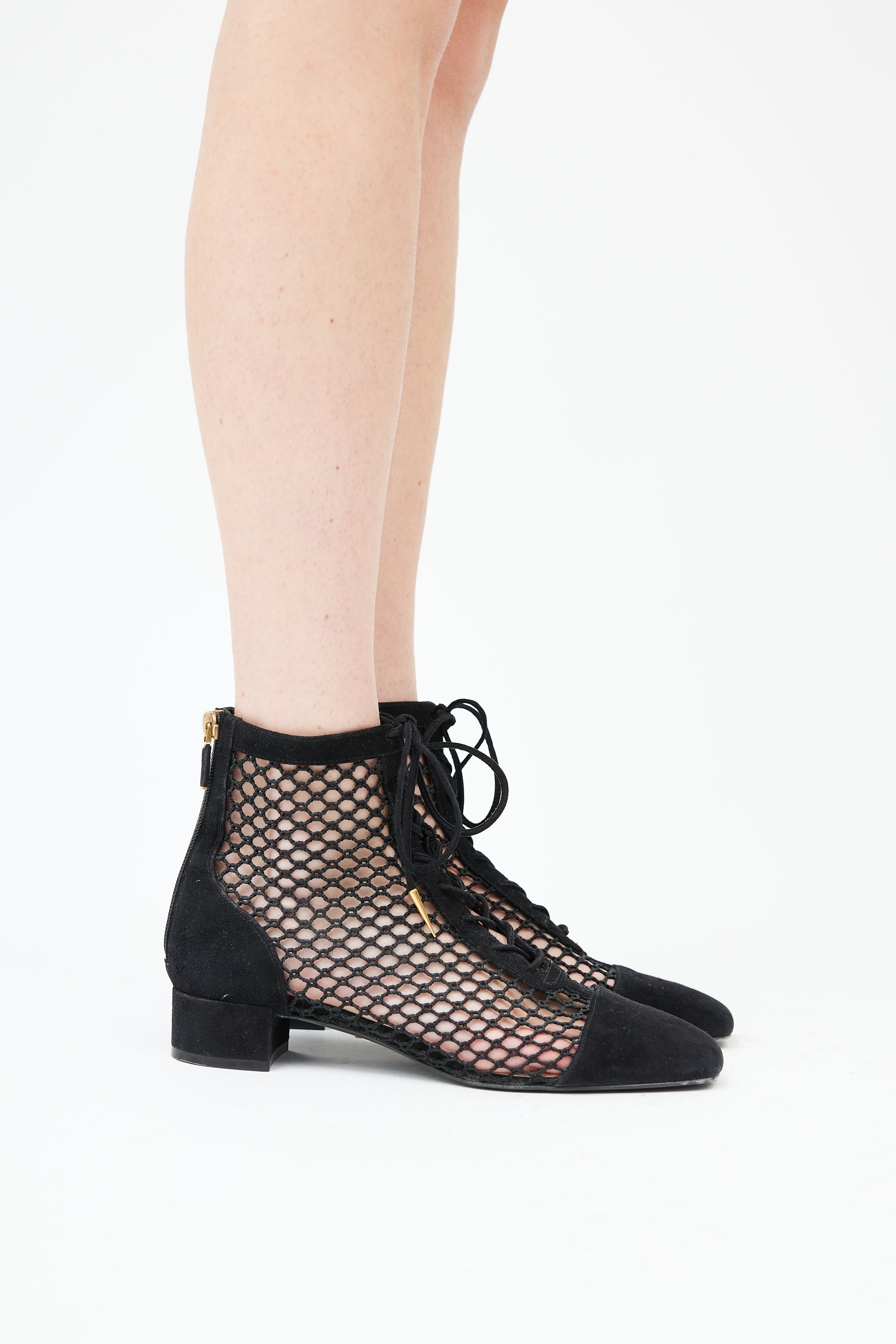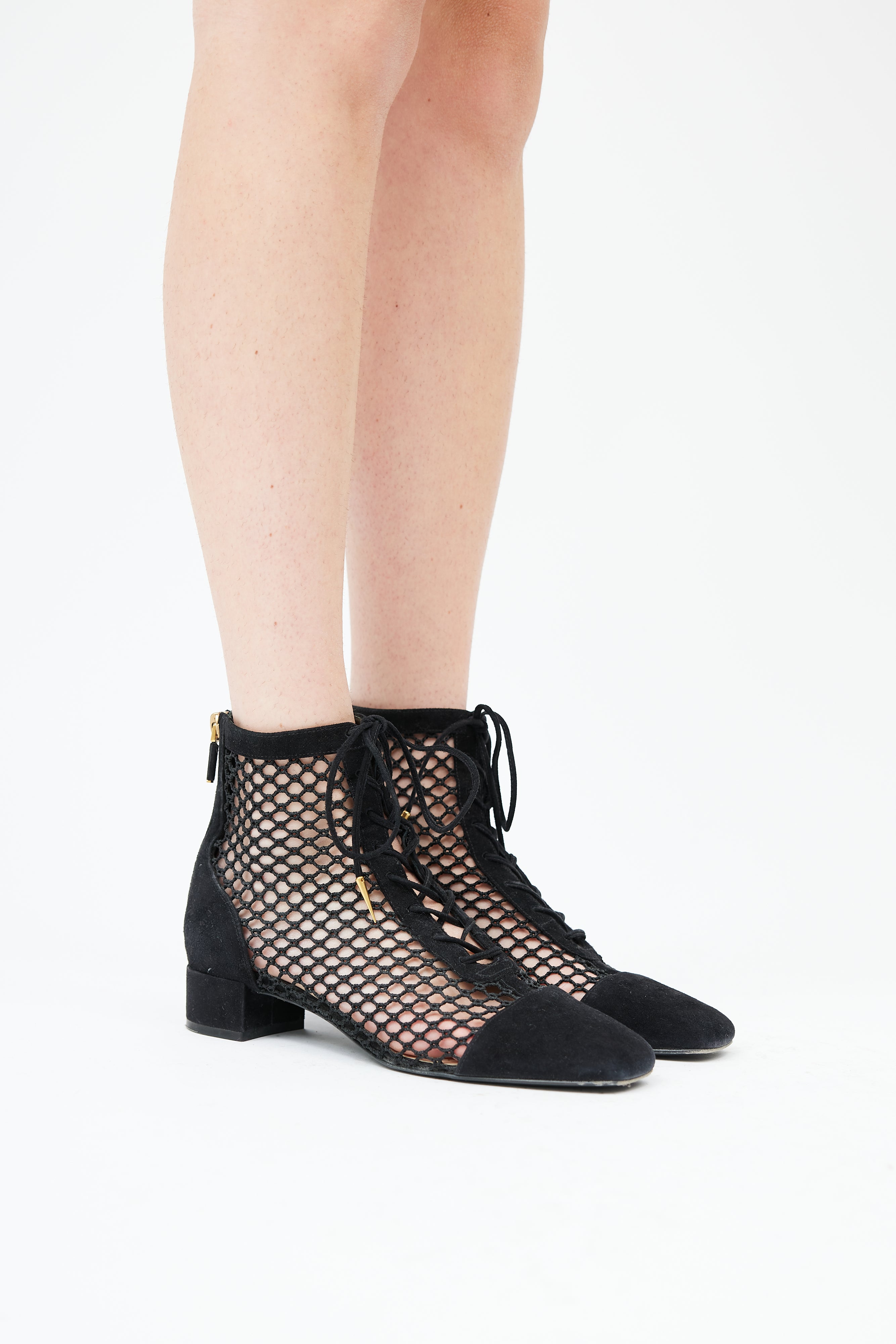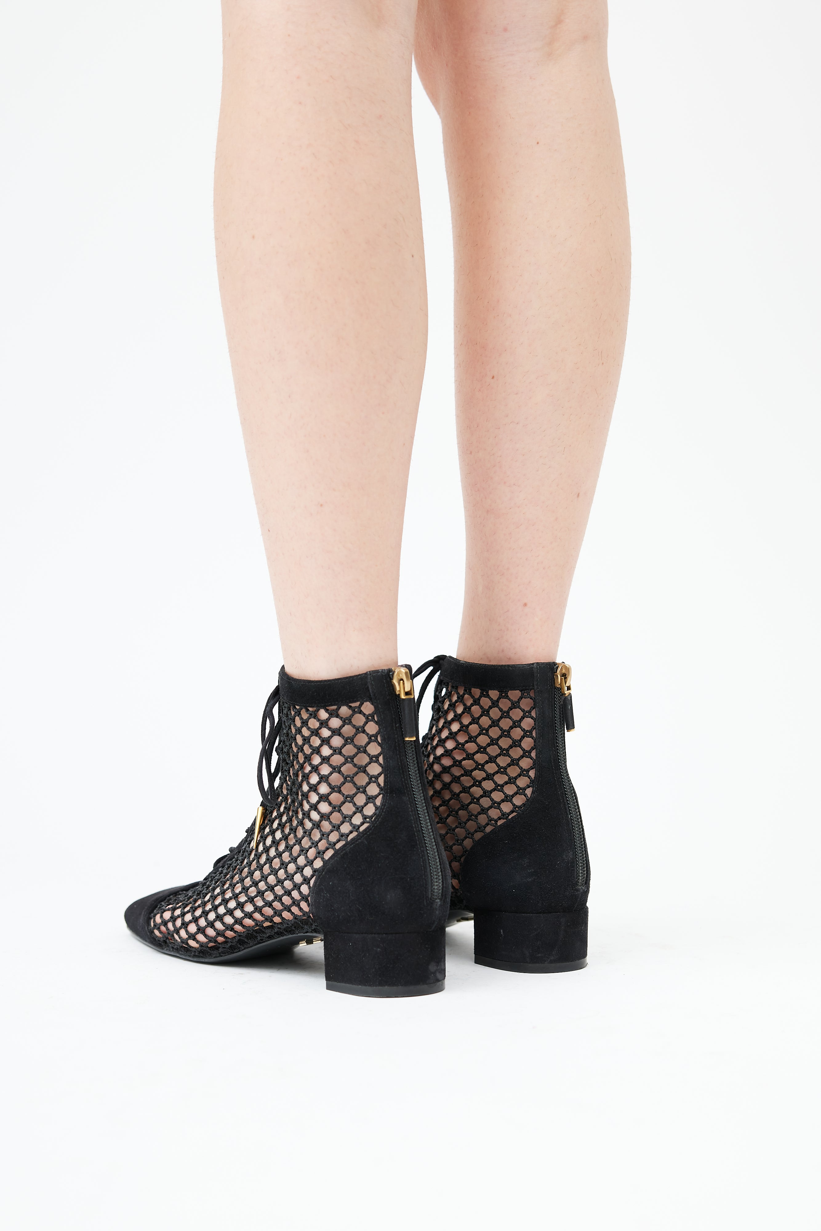 Pre-owned Dior black ankle boot featuring suede toe cap and heel, fishnet upper with suede lace details and gold tone hardware, rounded square toe, short block heel, and leather insoles.