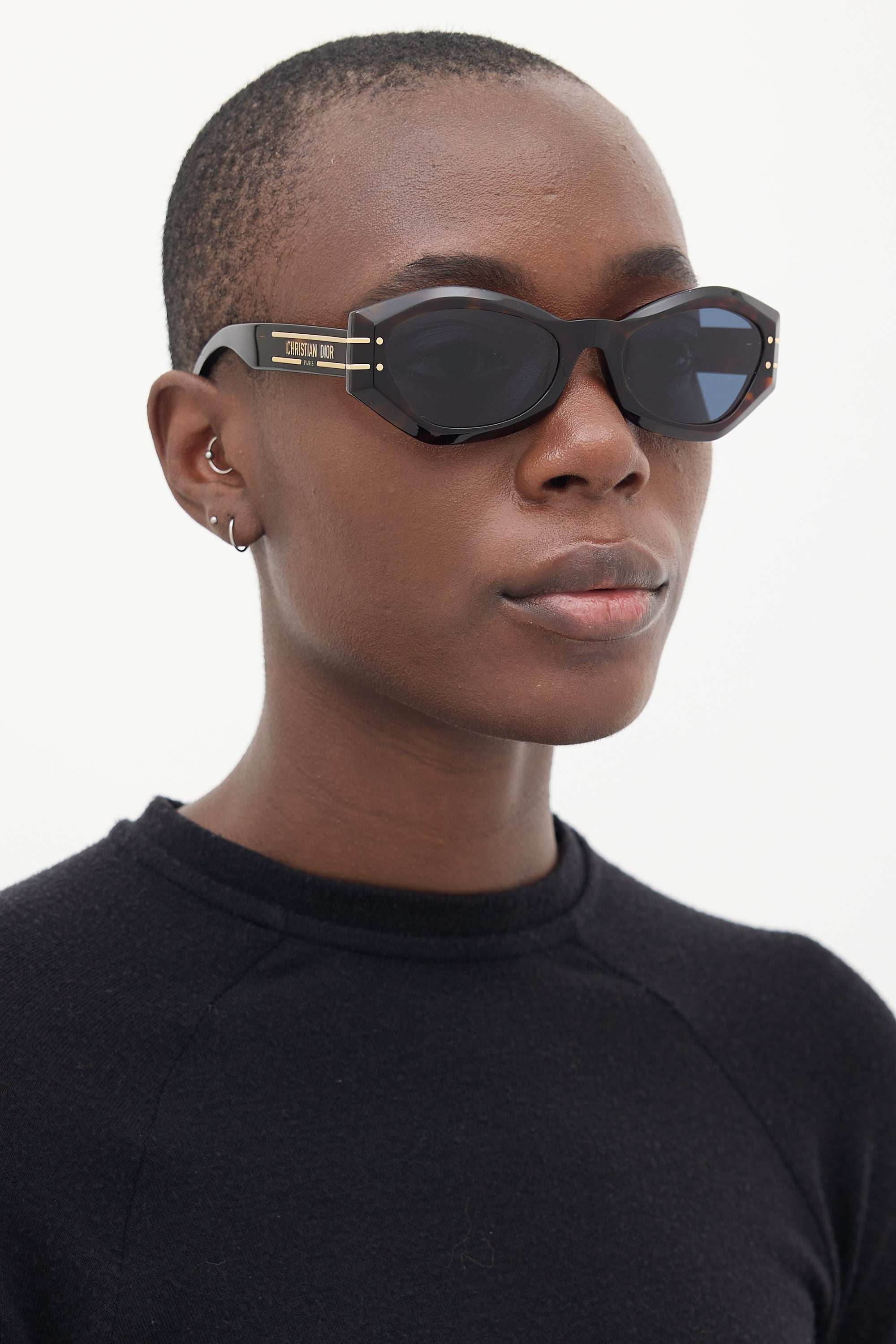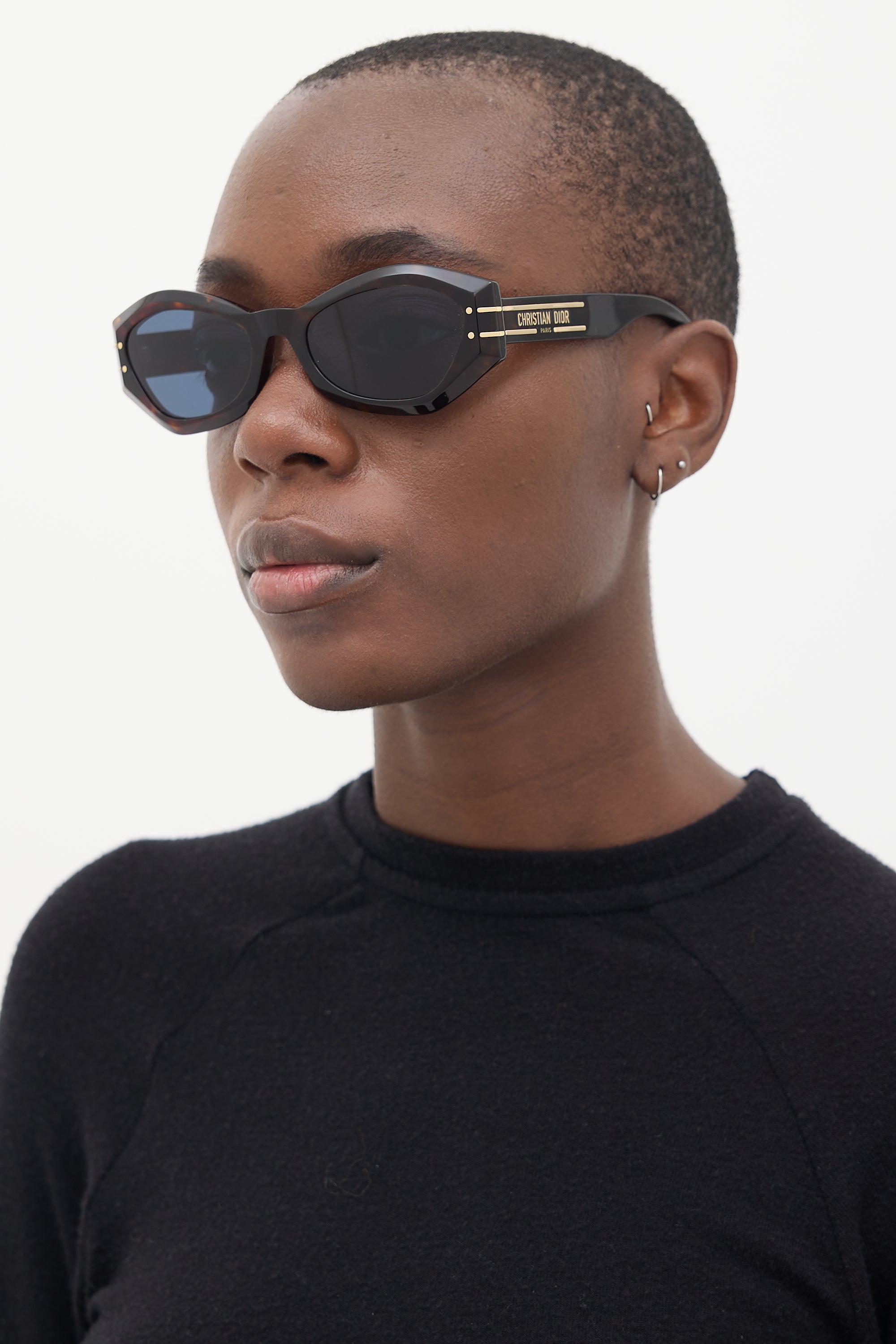 Pre-owned Dior DiorSignature B1U sunglasses featuring blue tinted lenses, brown tortoiseshell angular tapered frame, and gold tone hardware logo at temples.