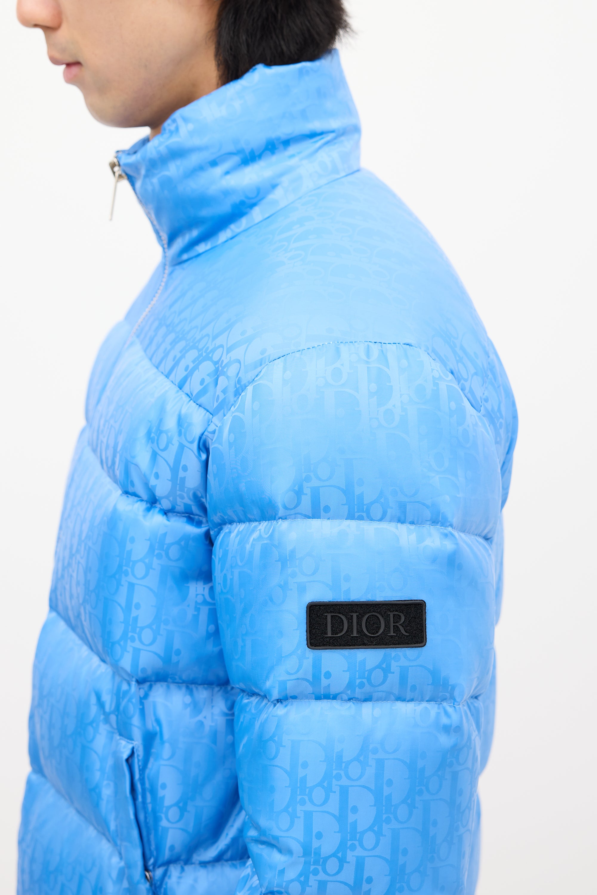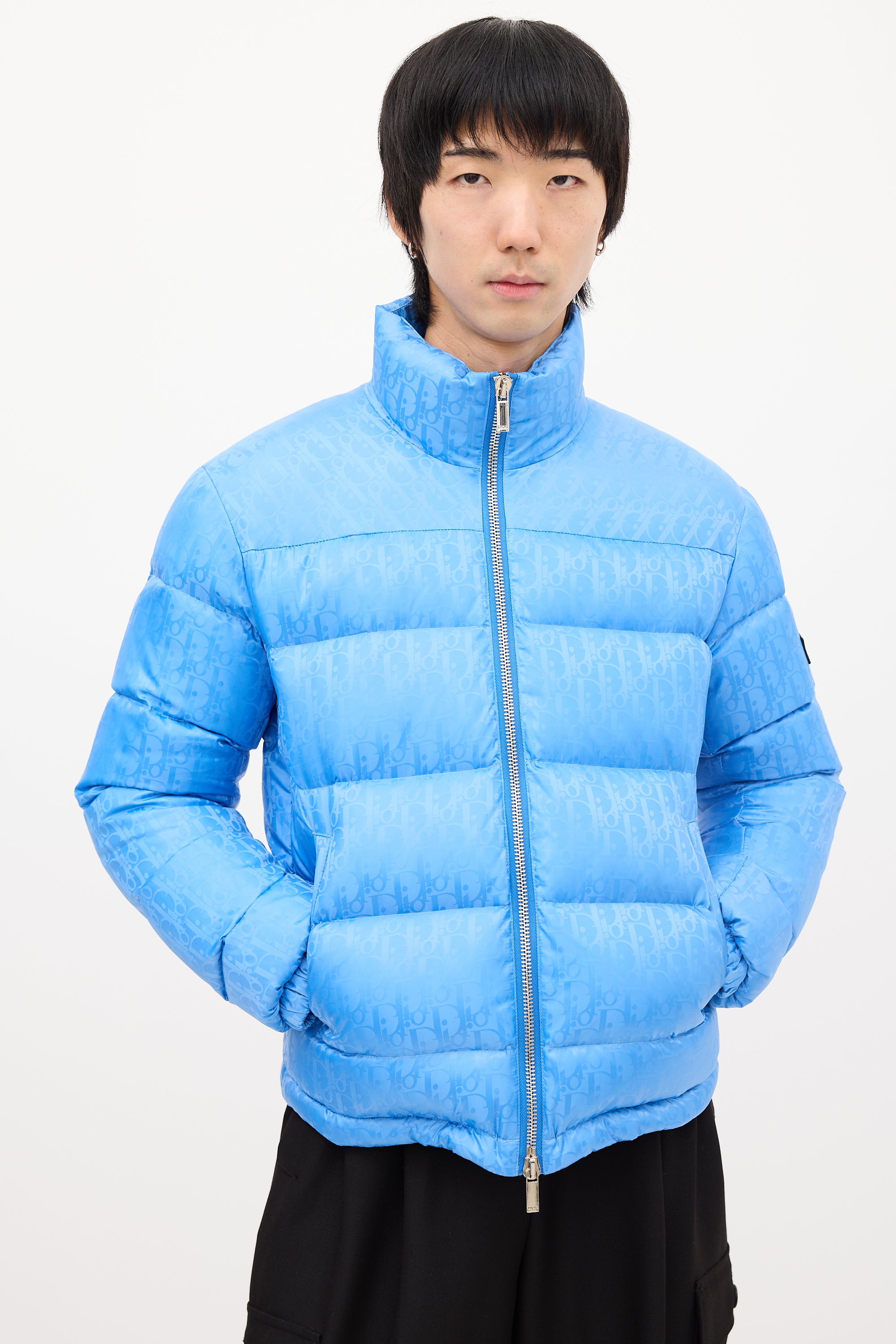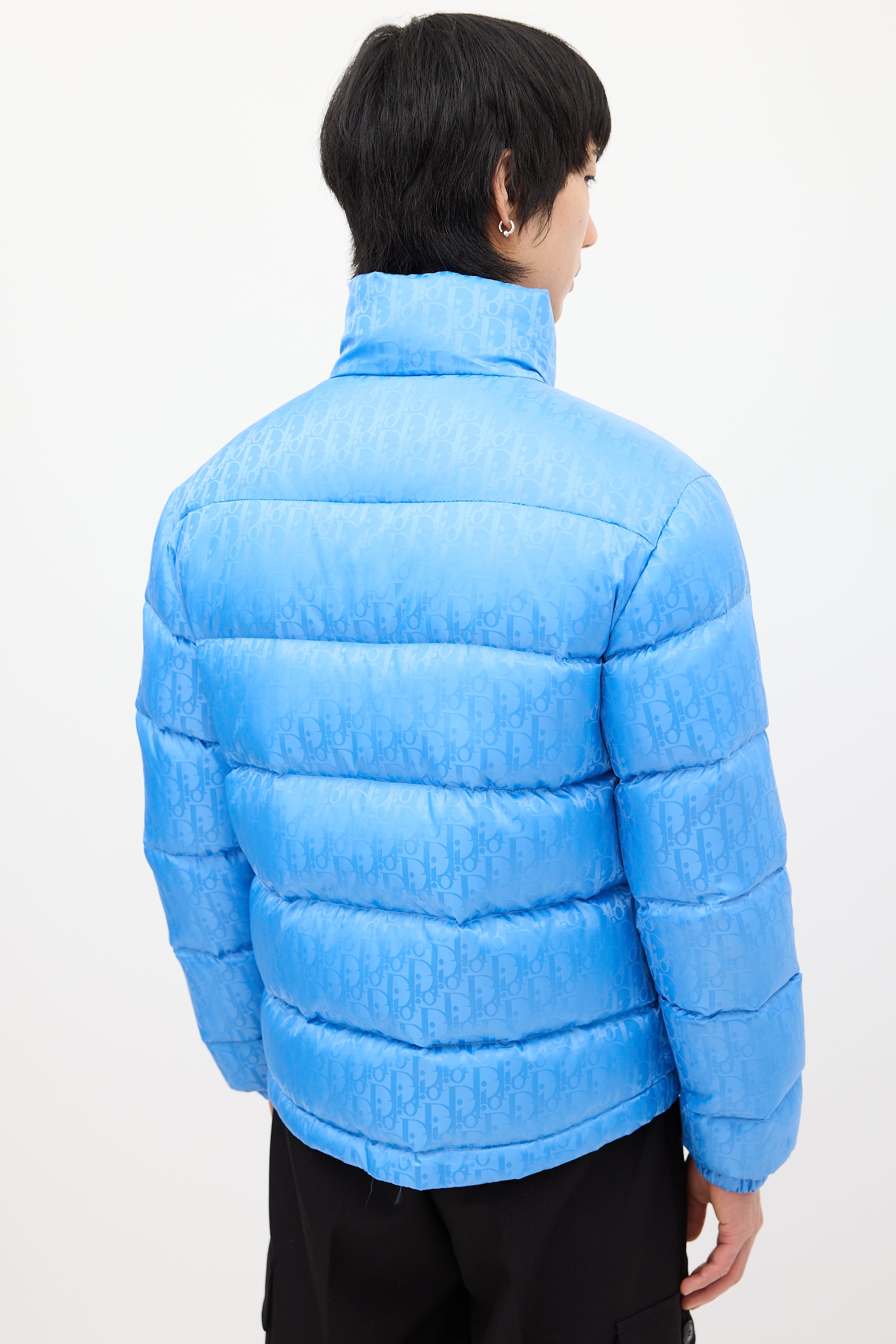 Pre-owned Dior light blue down puffer jacket featuring a nylon shell, funnel collar, front double zip closure, two front pockets, two interior pockets, drawcord hem, logo patch at left arm, and signature oblique jacquard throughout. Padded and lined.