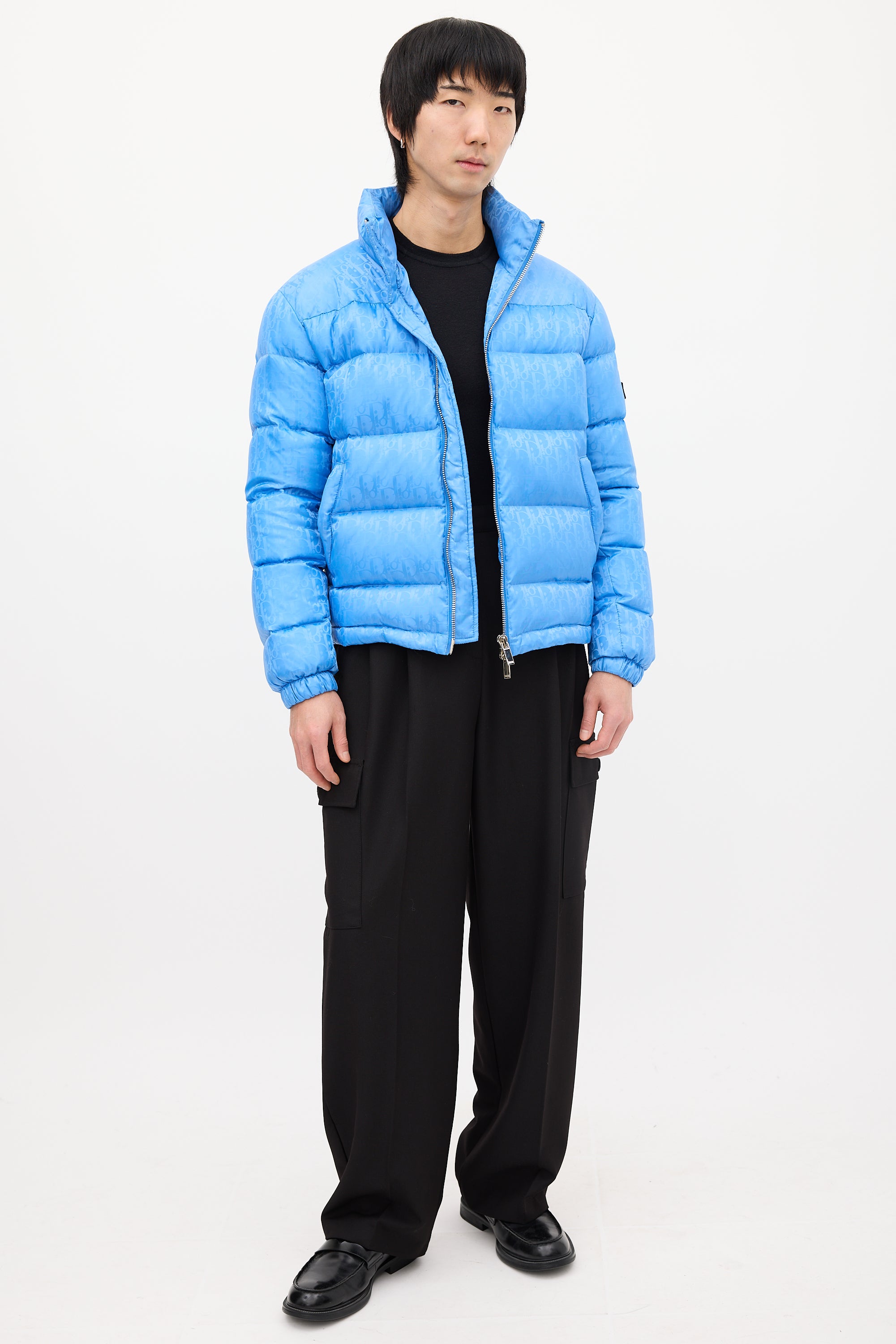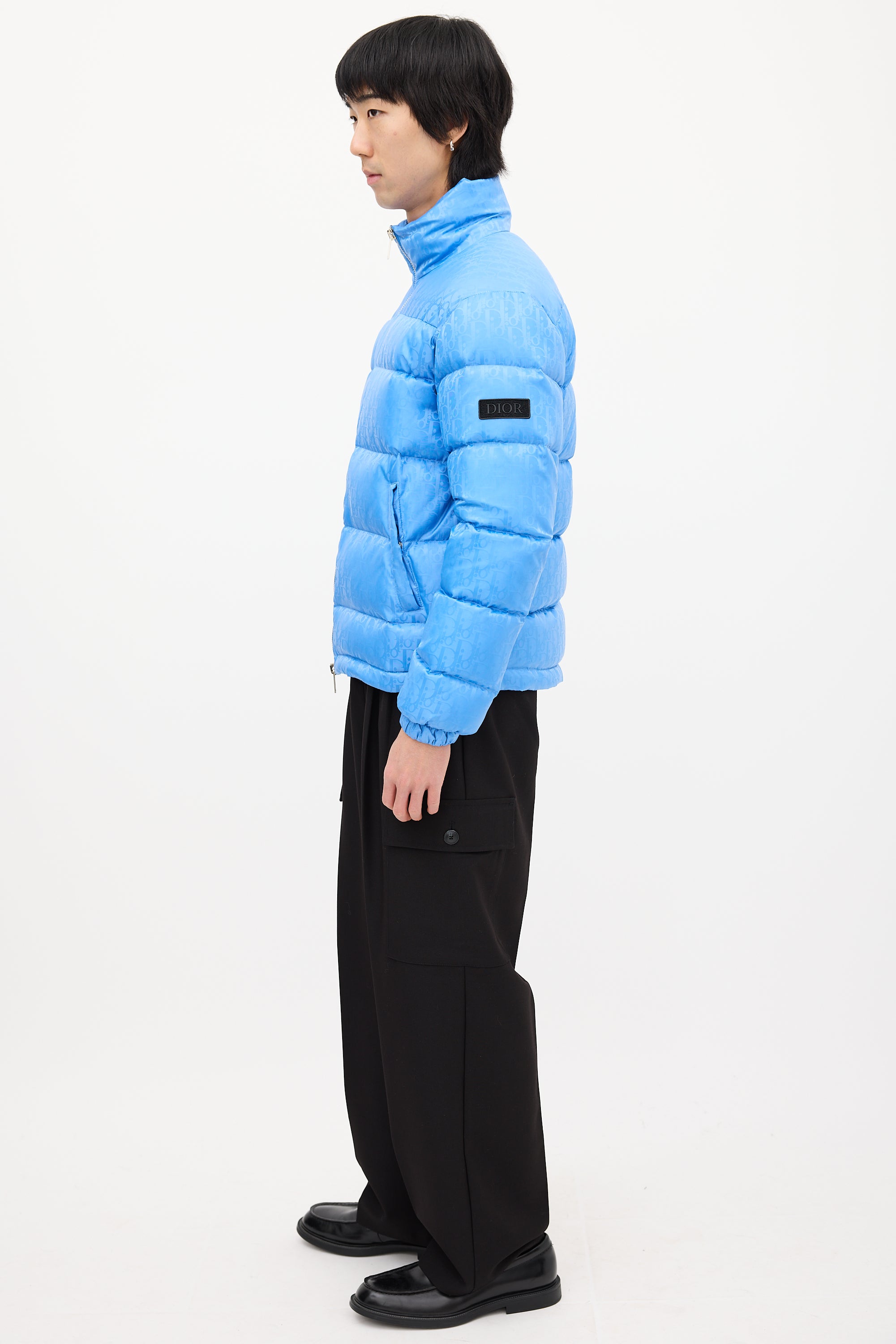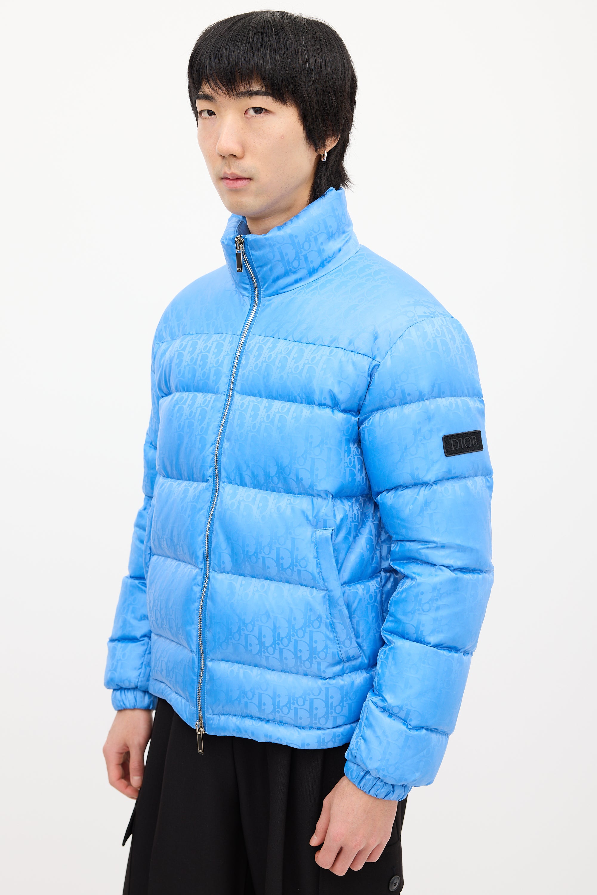 Pre-owned Dior light blue down puffer jacket featuring a nylon shell, funnel collar, front double zip closure, two front pockets, two interior pockets, drawcord hem, logo patch at left arm, and signature oblique jacquard throughout. Padded and lined.