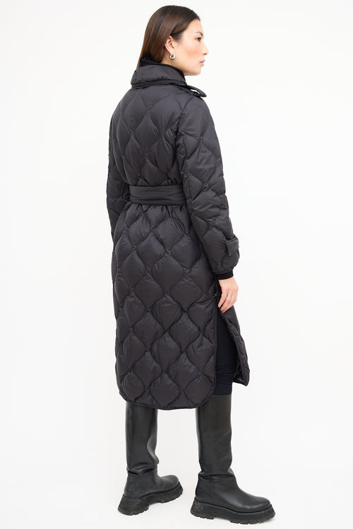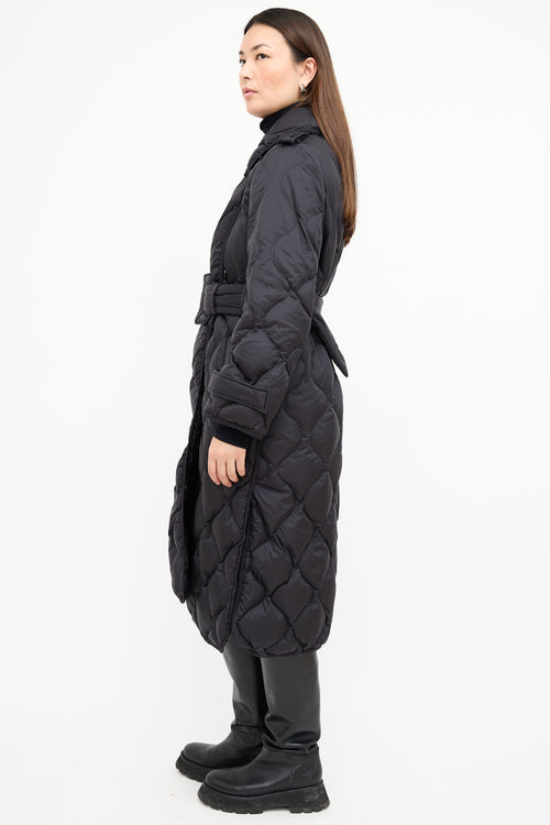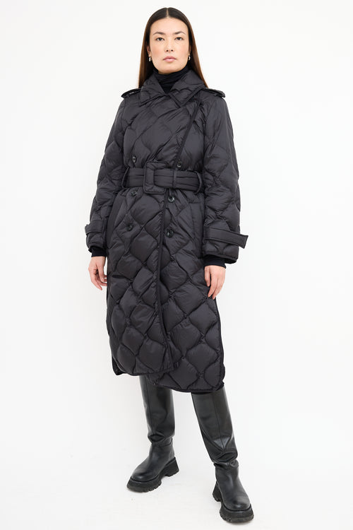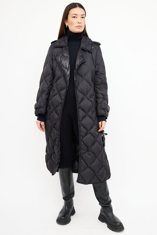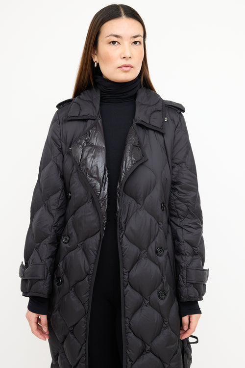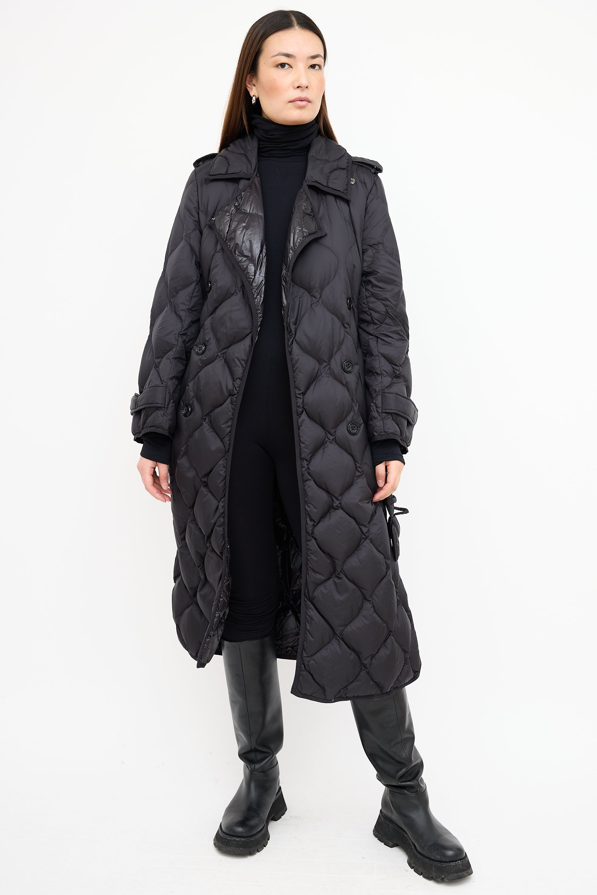 Pre-owned Dorothee Schumacher black quilted nylon trench coat featuring wide collar and lapel, decorative double breasted button front, two front pockets, side vents, waist belt, epaulettes, and cuff straps. Lined.