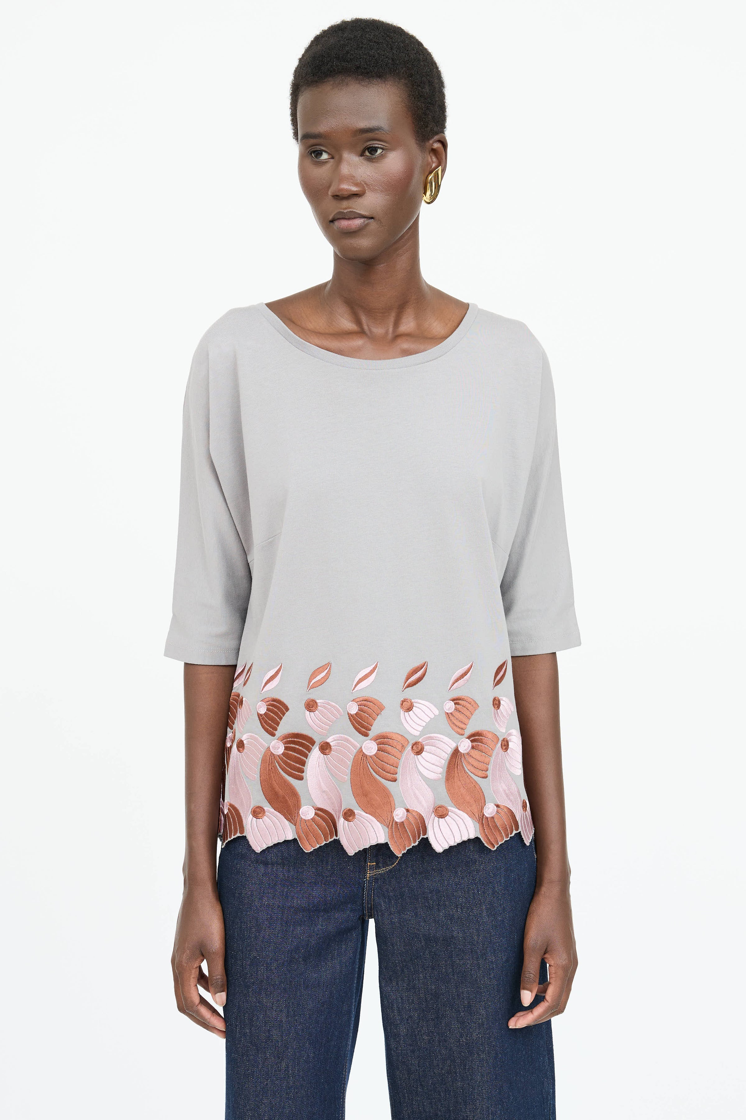 Pre-owned Dries Van Noten grey and multicolor t-shirt featuring 3/4 length sleeves, boat neckline, embroidered detail at bottom, and raw hemline.