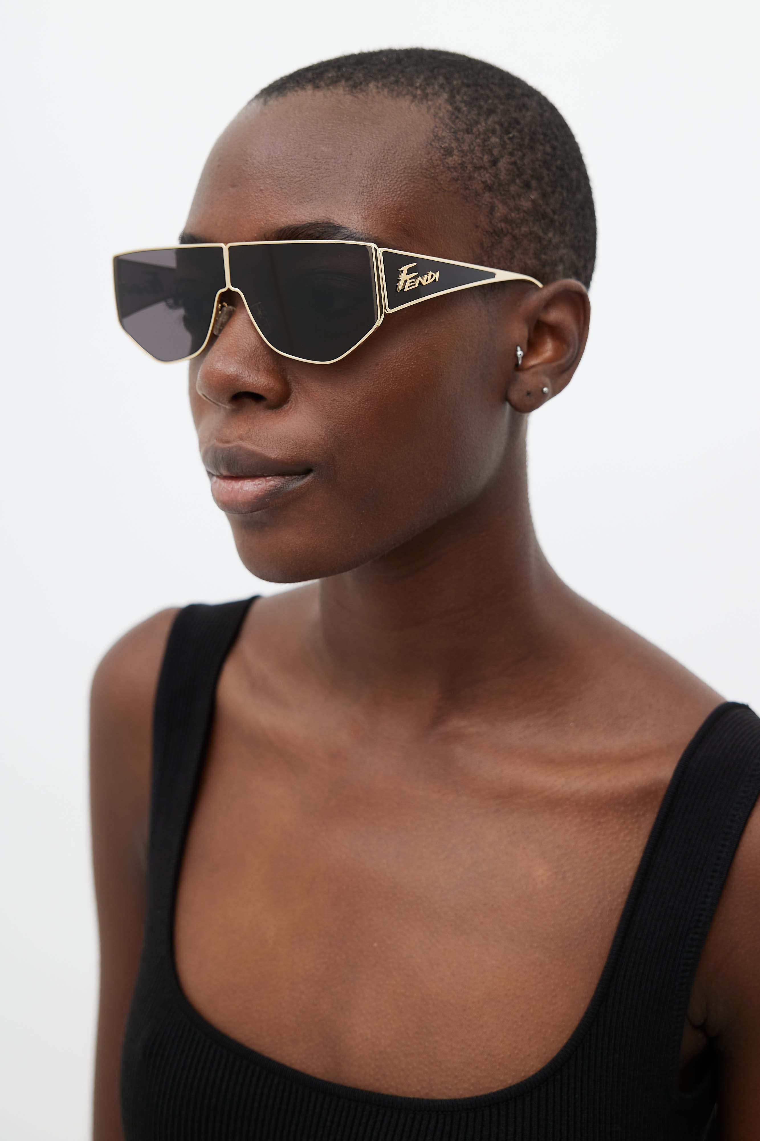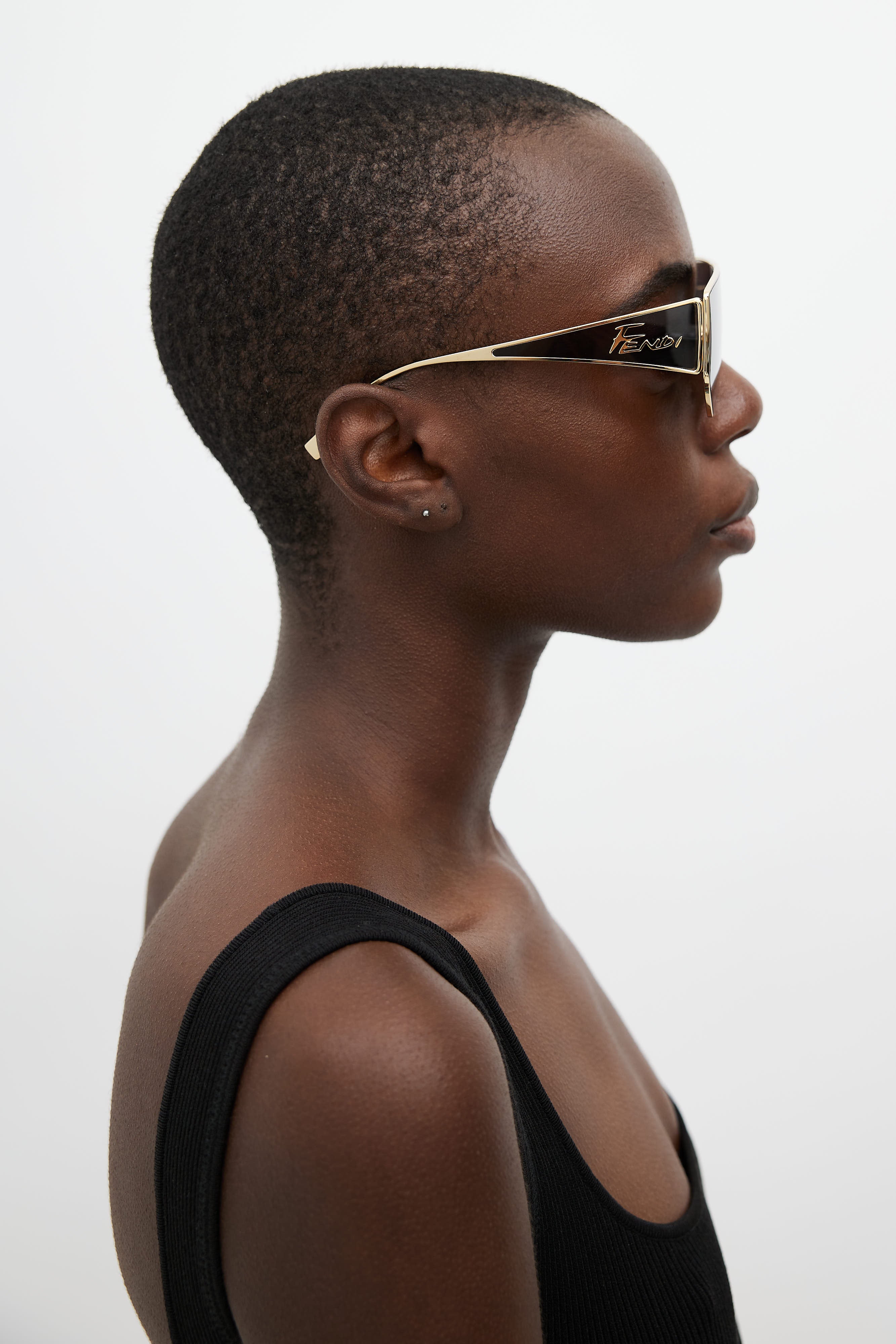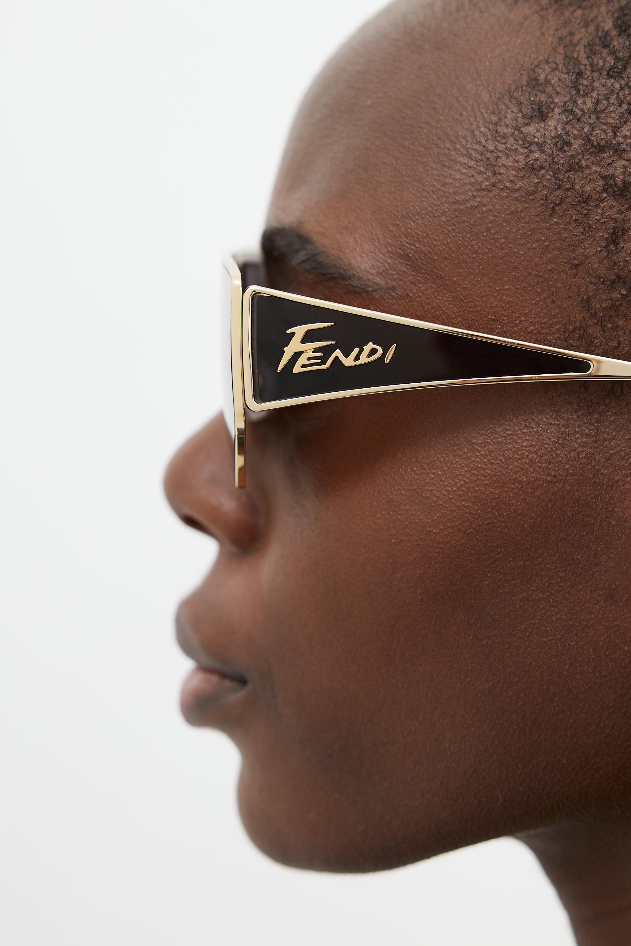 Pre-owned Fendi black and gold FE40051U rectangular sunglasses featuring geometric lenses, nose pads, gold tone arms, and a gold tone typographic logo at sides. Comes with original case.