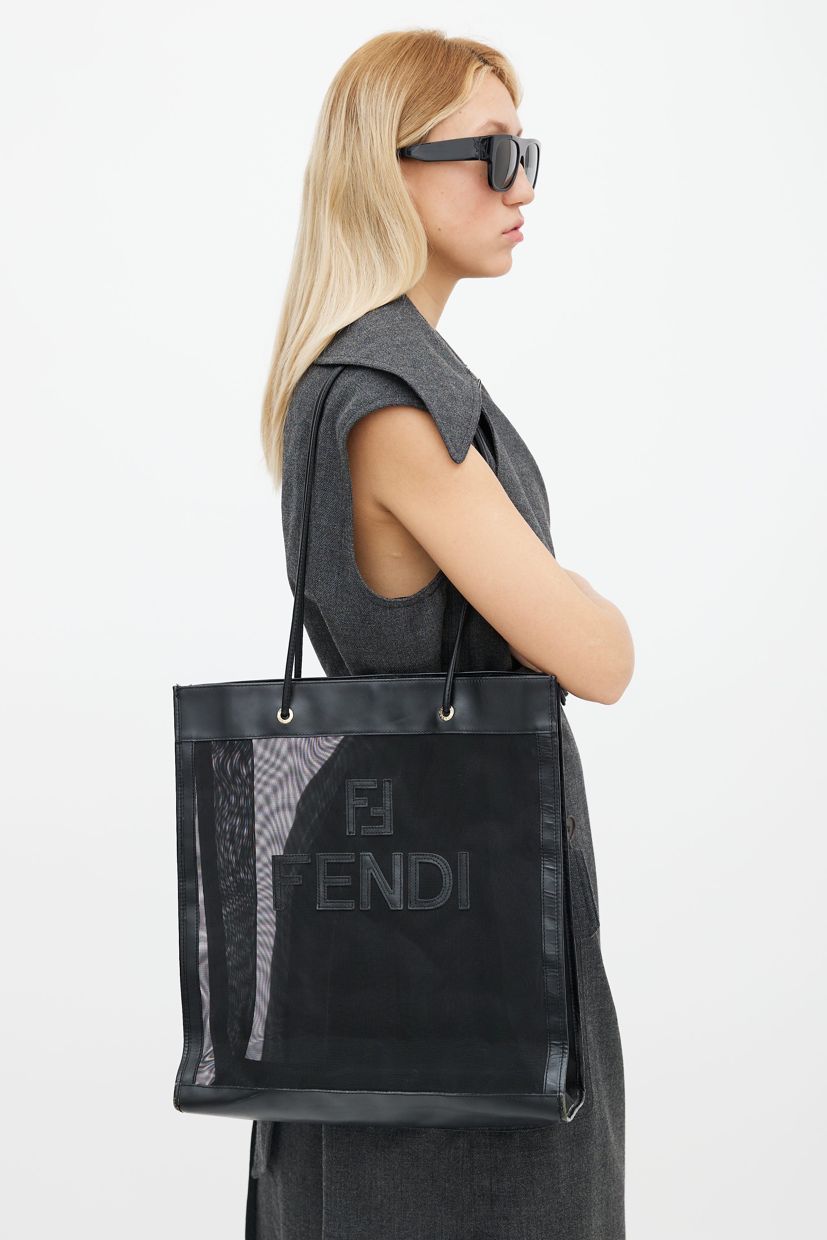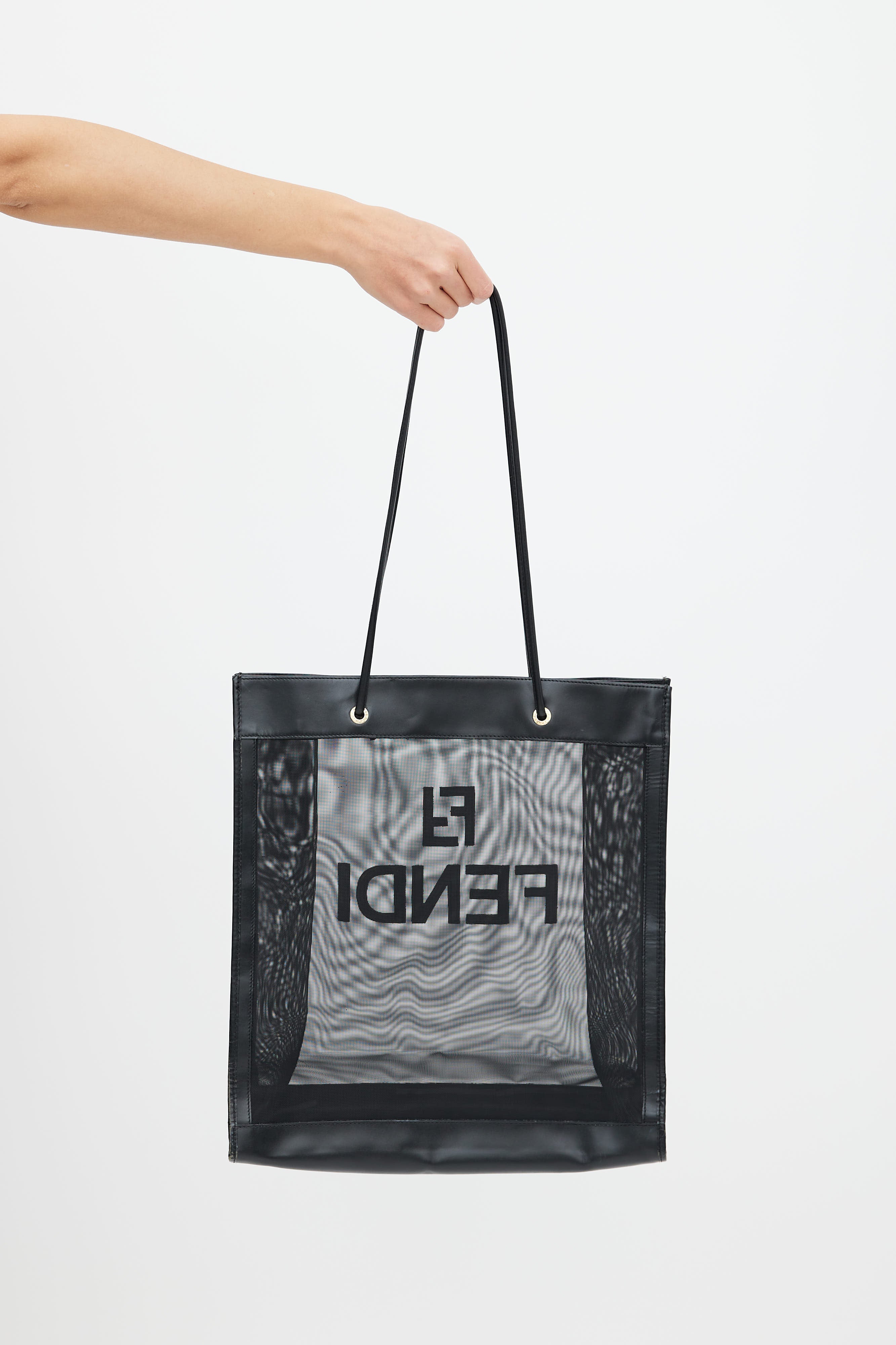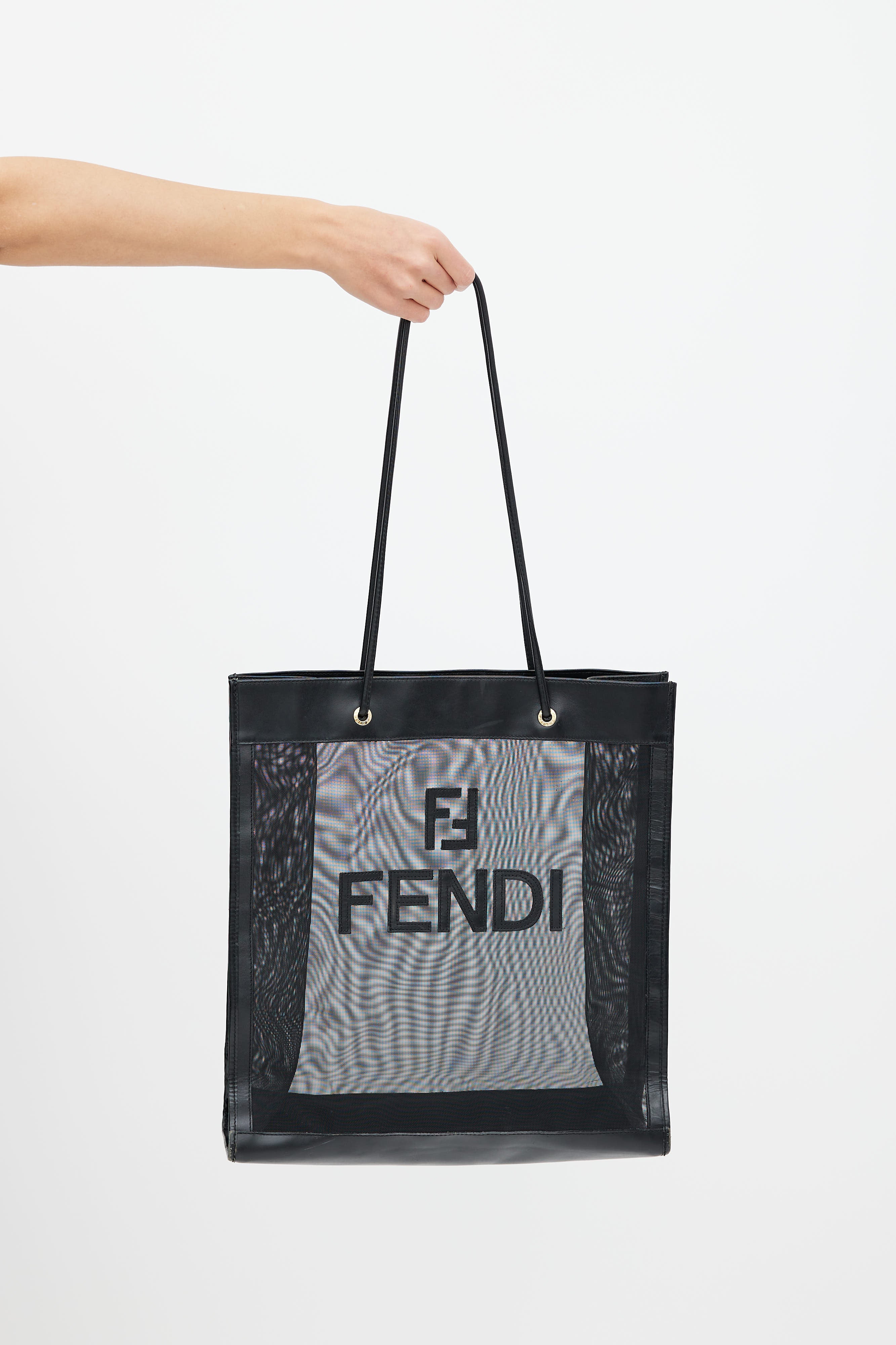 Pre-owned Fendi black mesh and leather tote bag featuring sheer mesh at front and back, leather trim throughout, leather logo patch at front, dual leather rolled shoulder strap at top, open entry, gold-tone hardware and one main compartment.