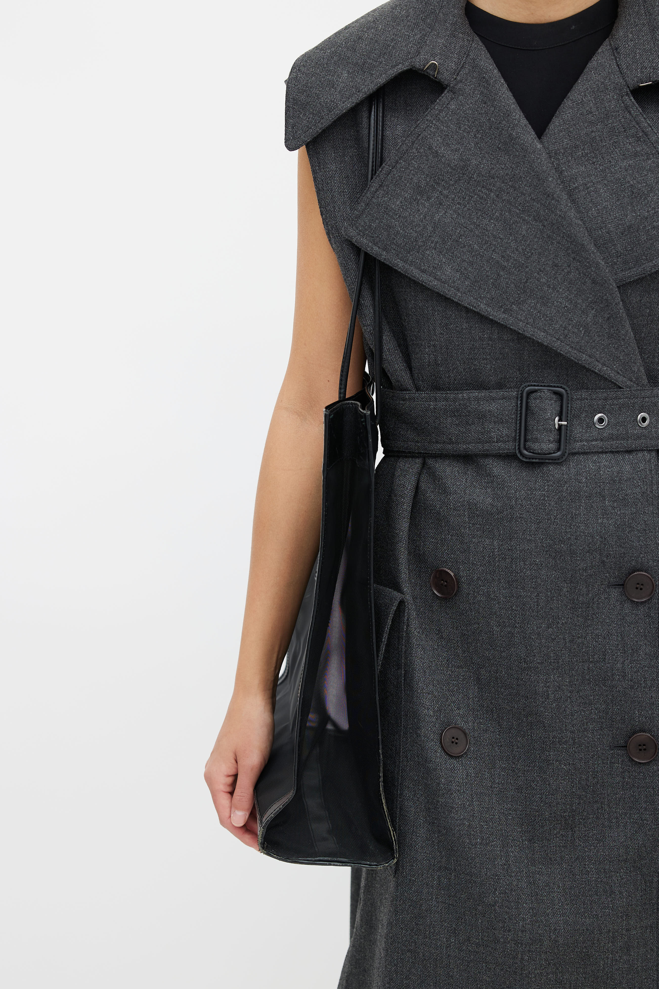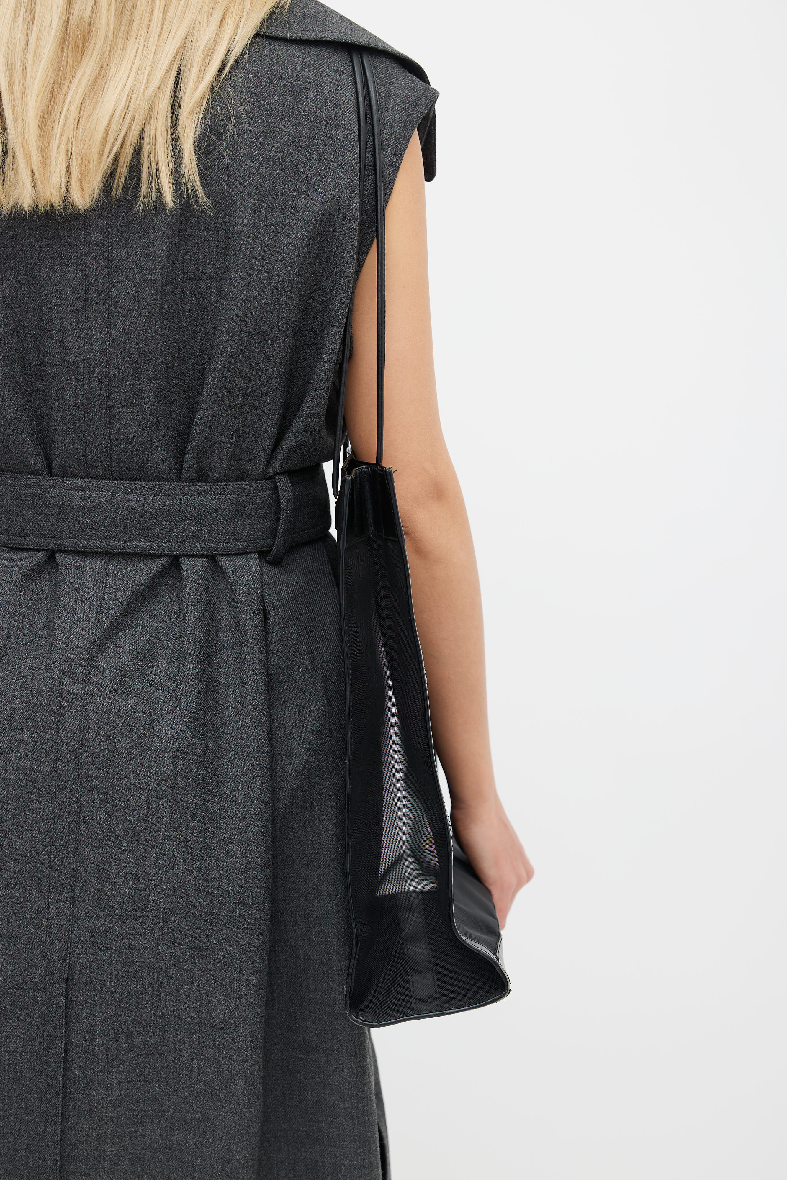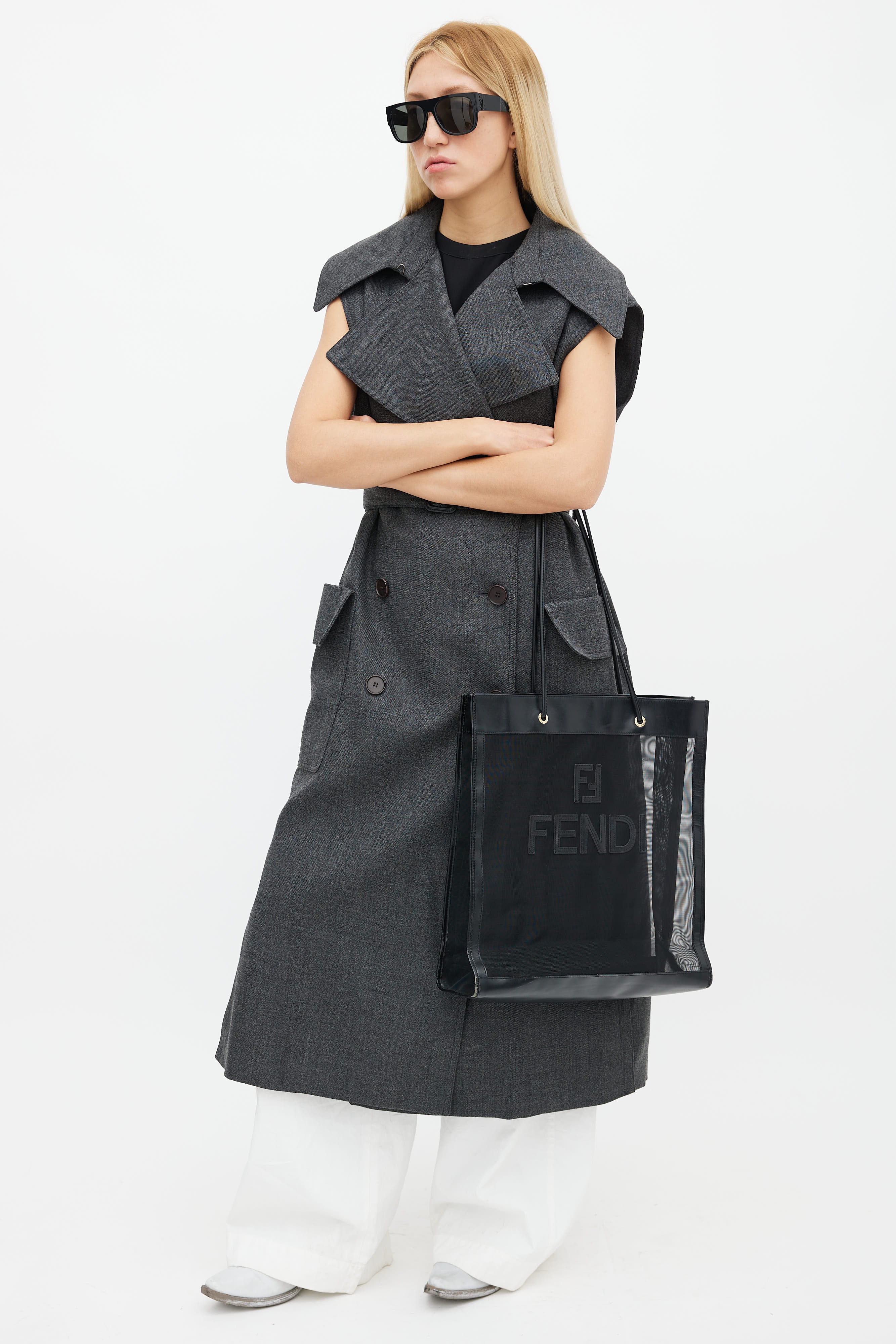 Pre-owned Fendi black mesh and leather tote bag featuring sheer mesh at front and back, leather trim throughout, leather logo patch at front, dual leather rolled shoulder strap at top, open entry, gold-tone hardware and one main compartment.