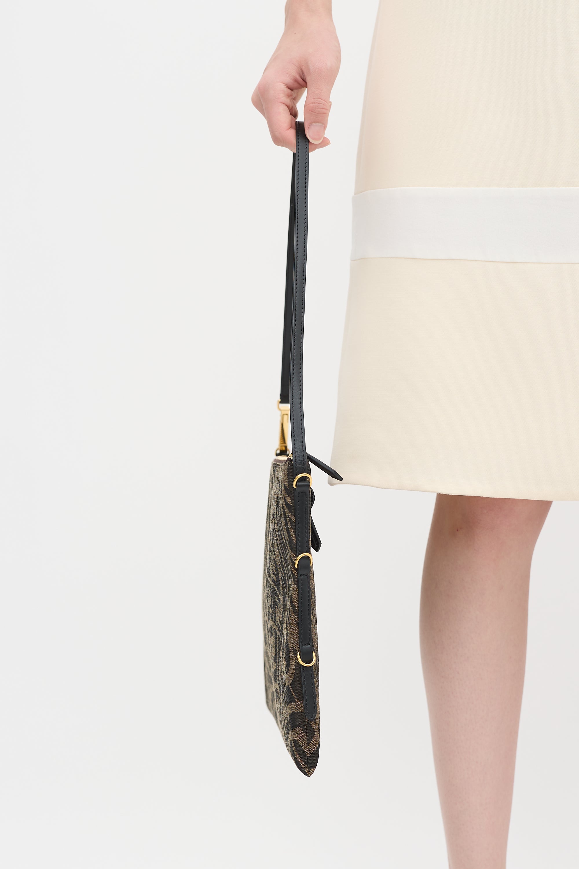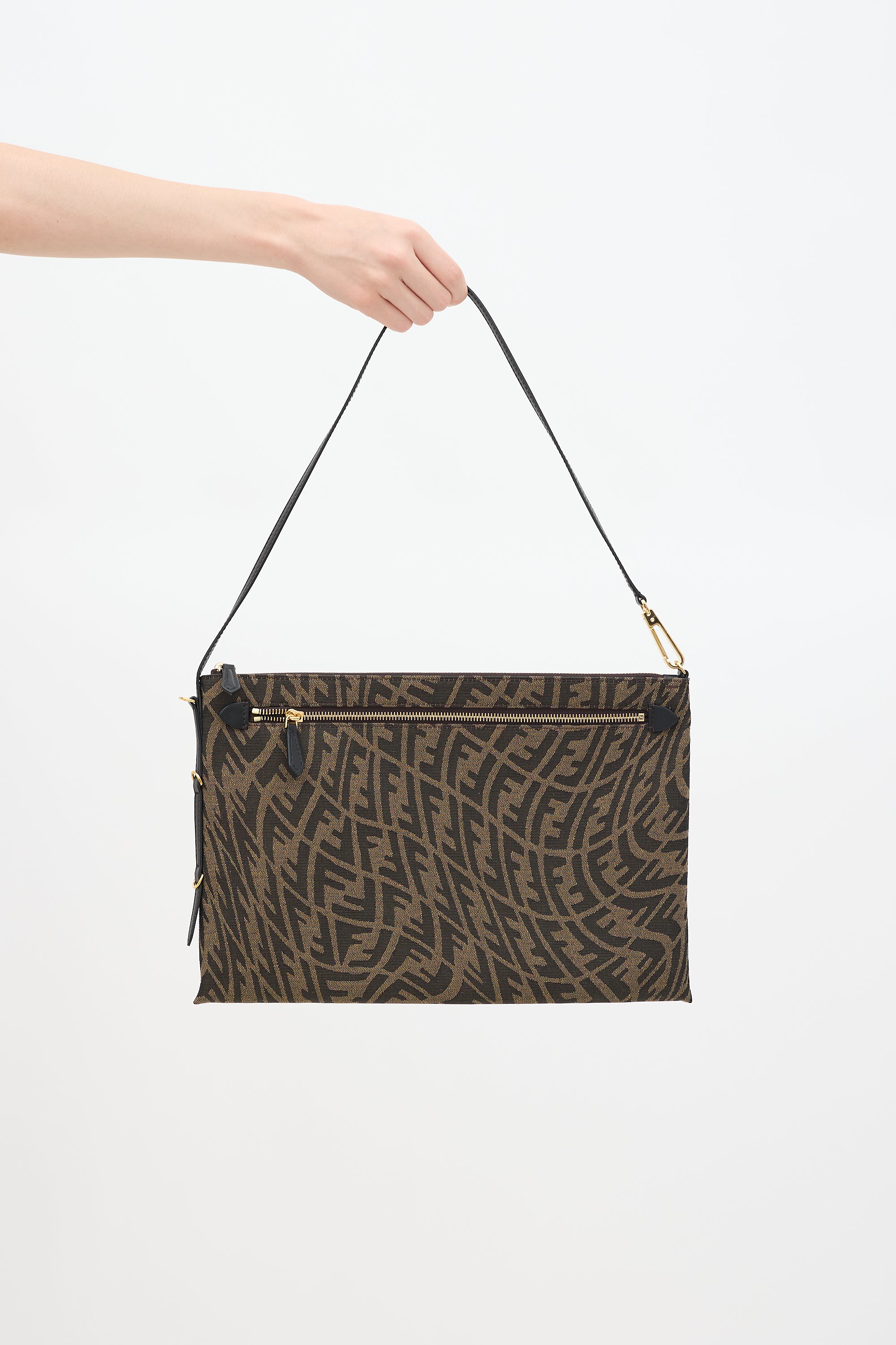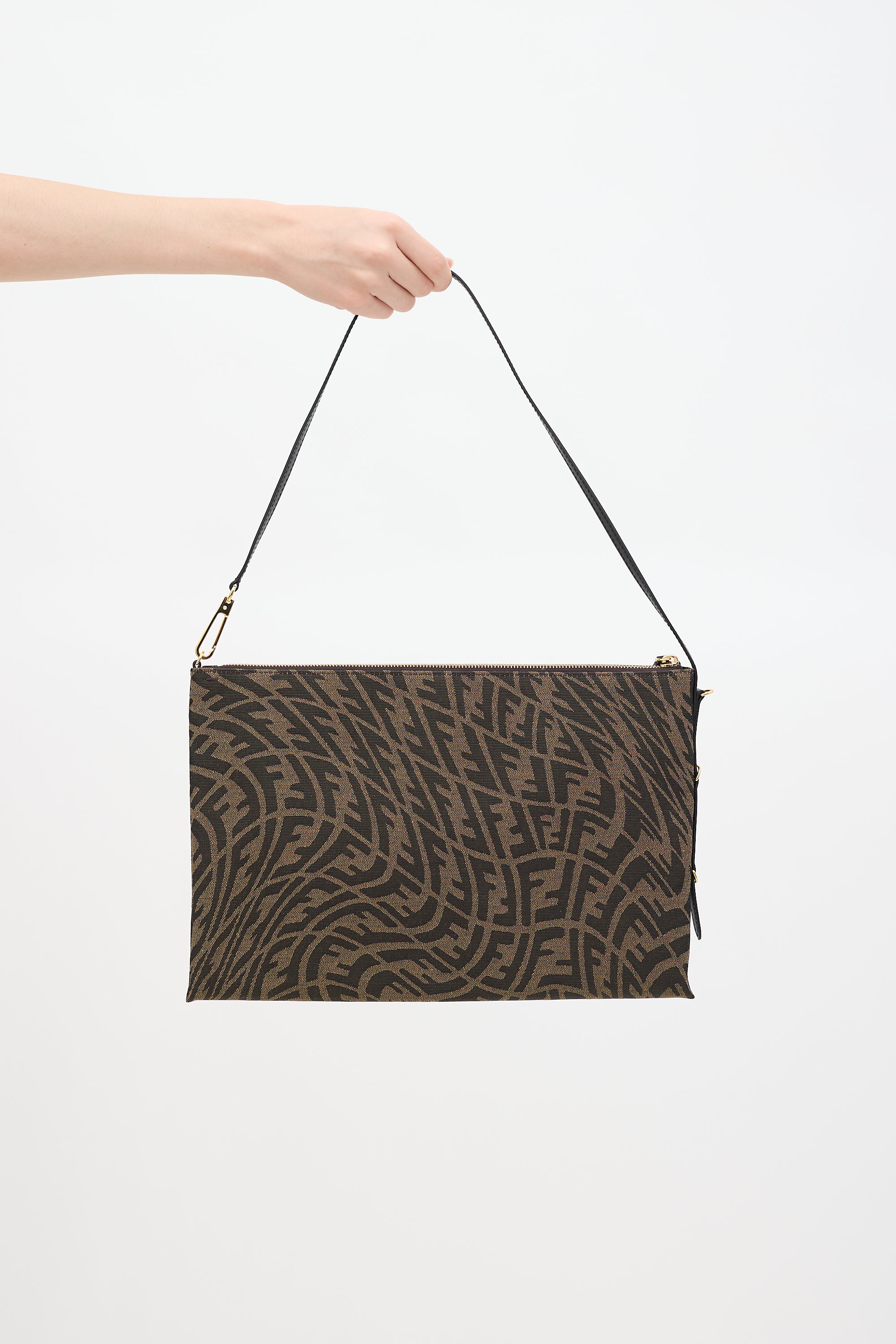 Pre-owned Fendi brown Vertigo bag featuring a black FF monogram pattern throughout, one zip pocket at front, one main compartment, convertible shoulder strap, and top zip closure.
