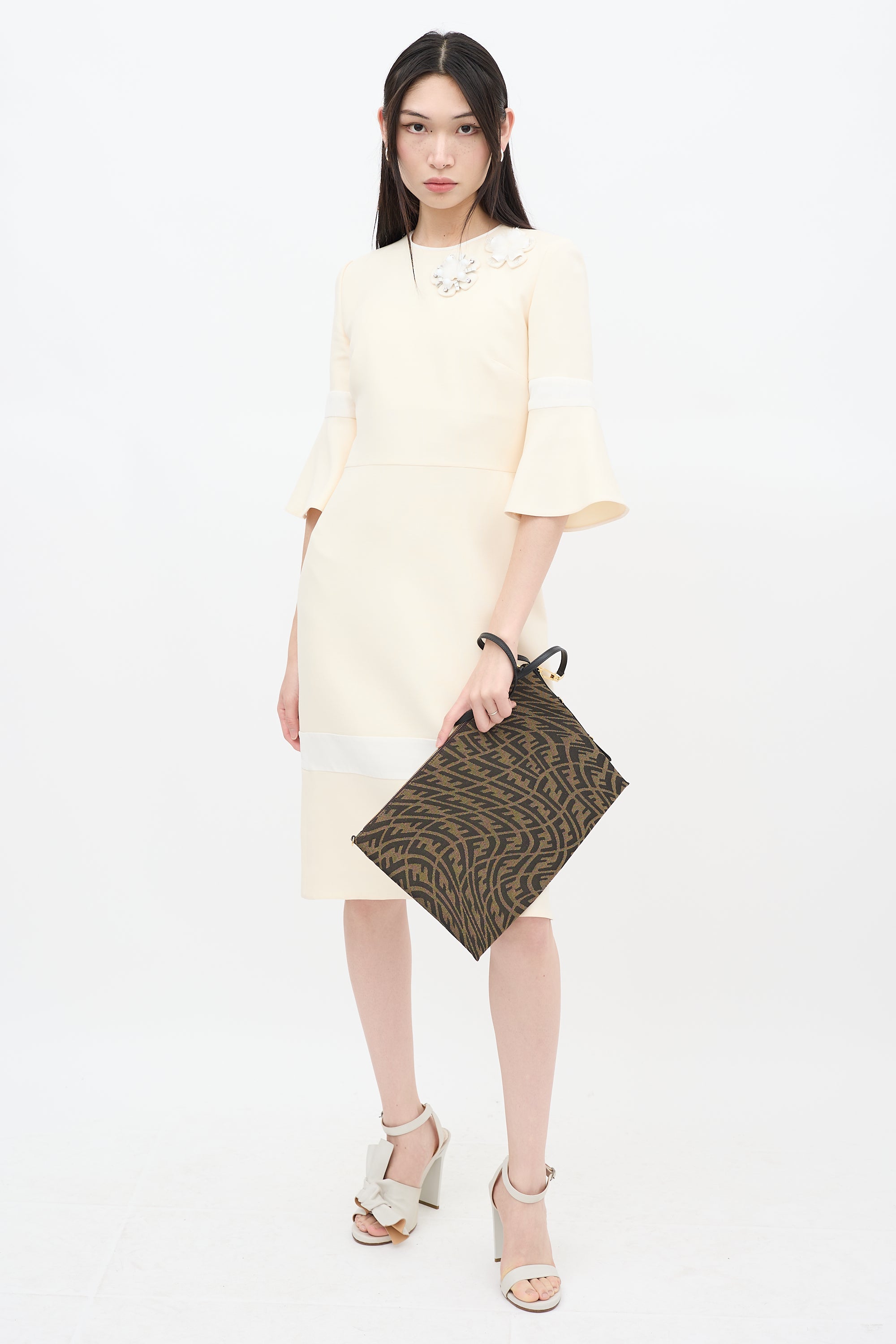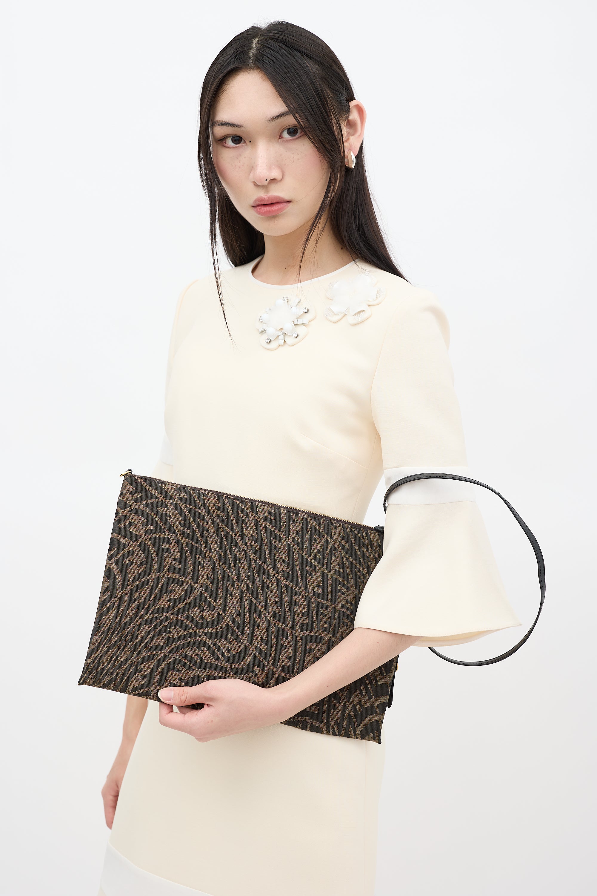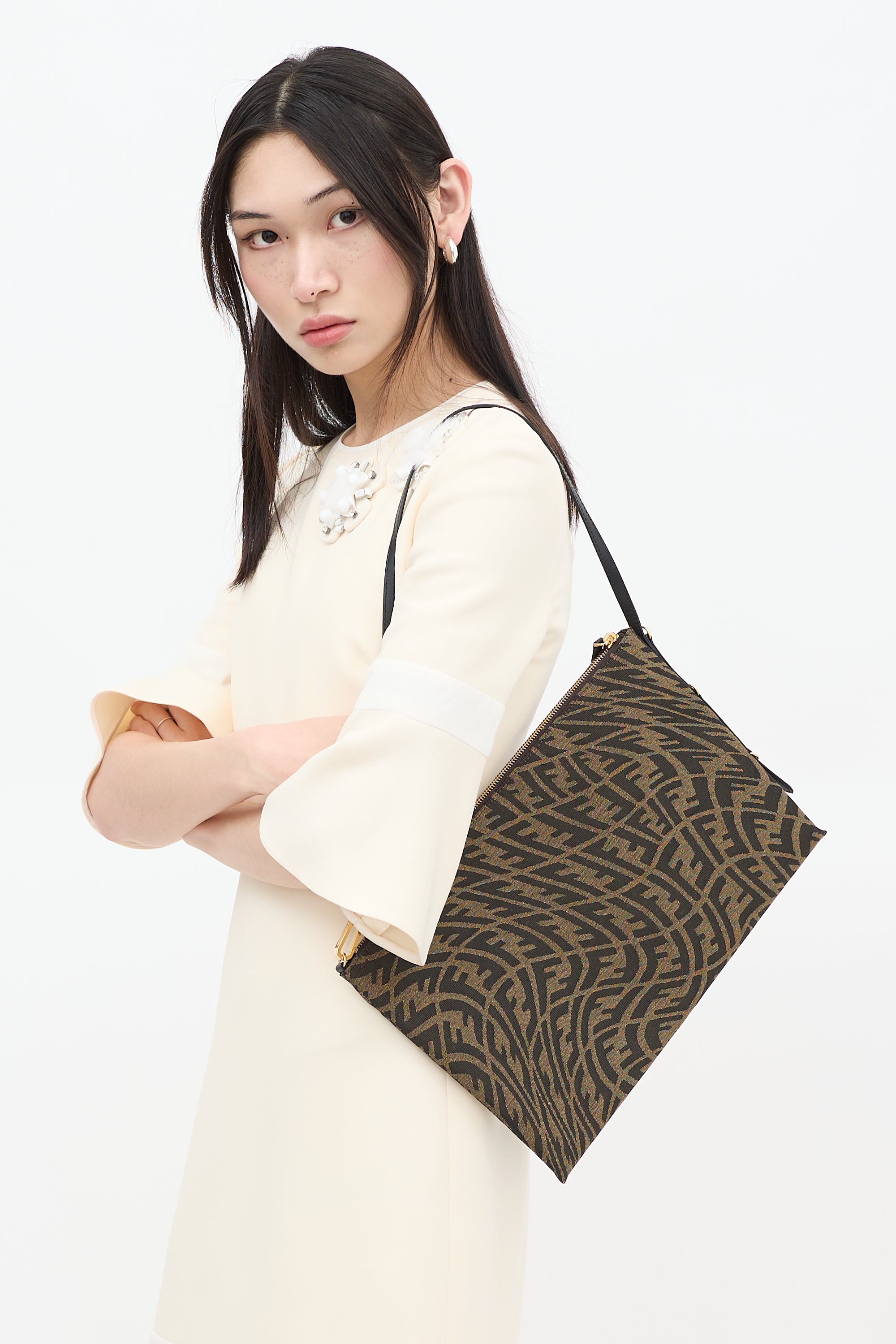 Pre-owned Fendi brown Vertigo bag featuring a black FF monogram pattern throughout, one zip pocket at front, one main compartment, convertible shoulder strap, and top zip closure.