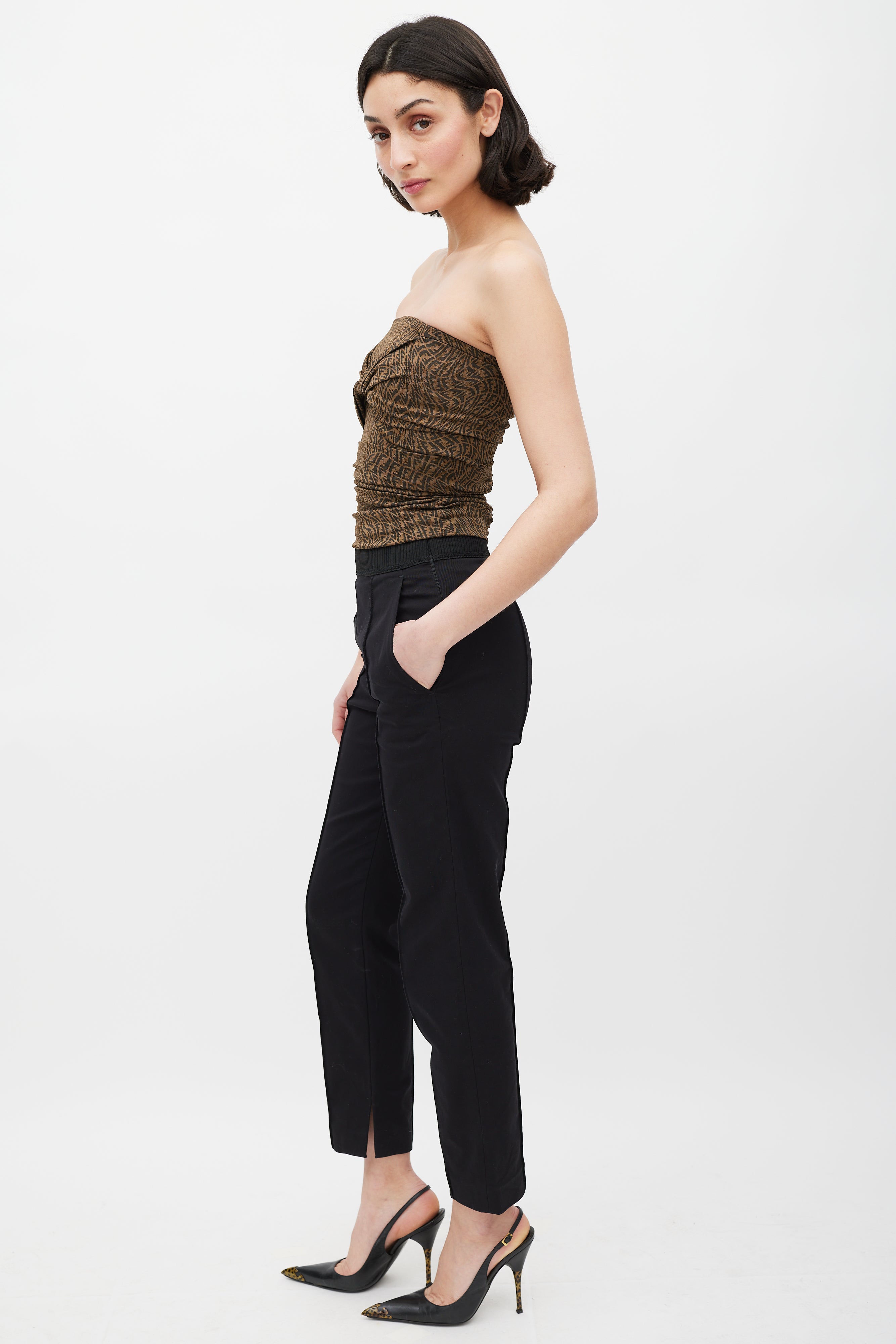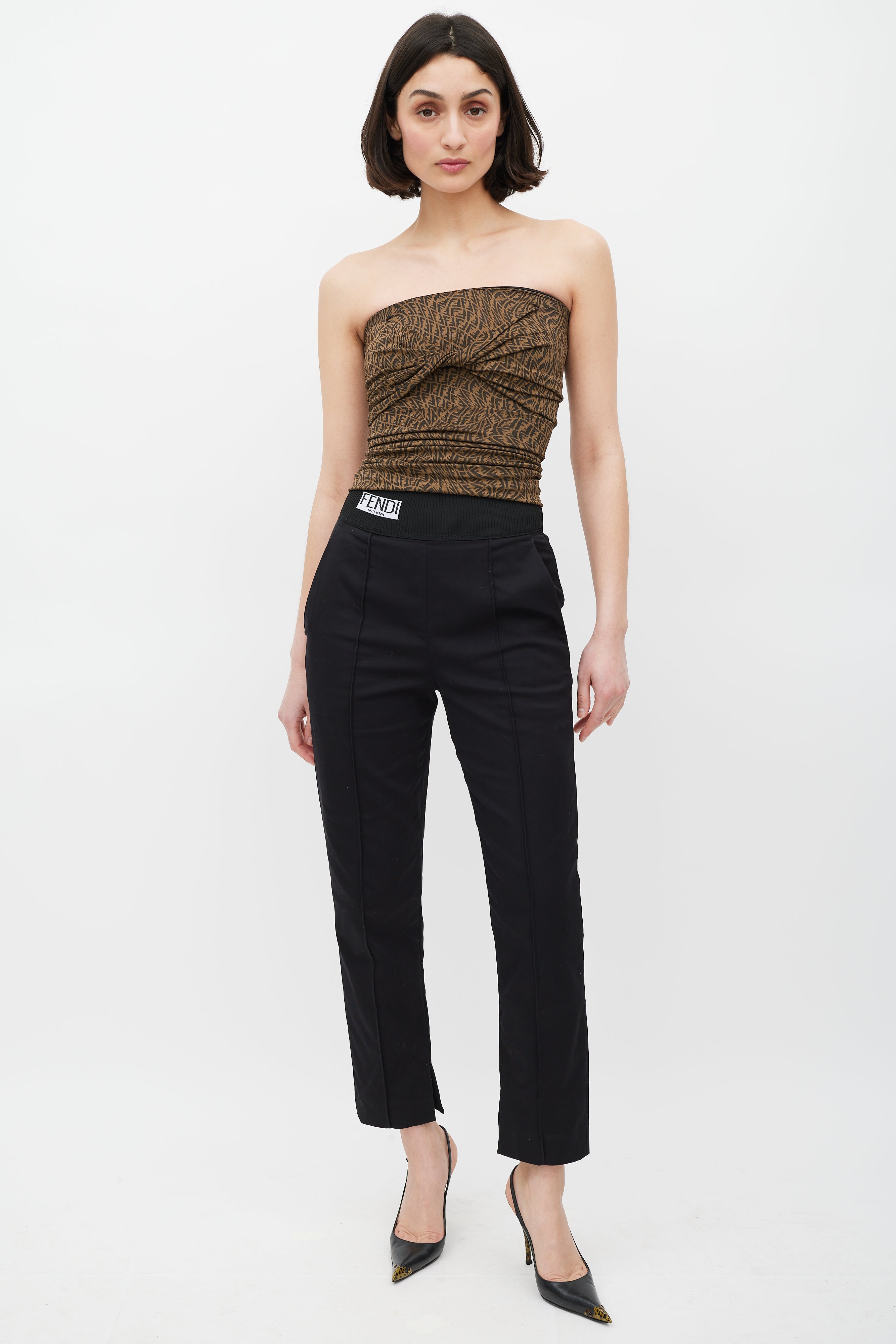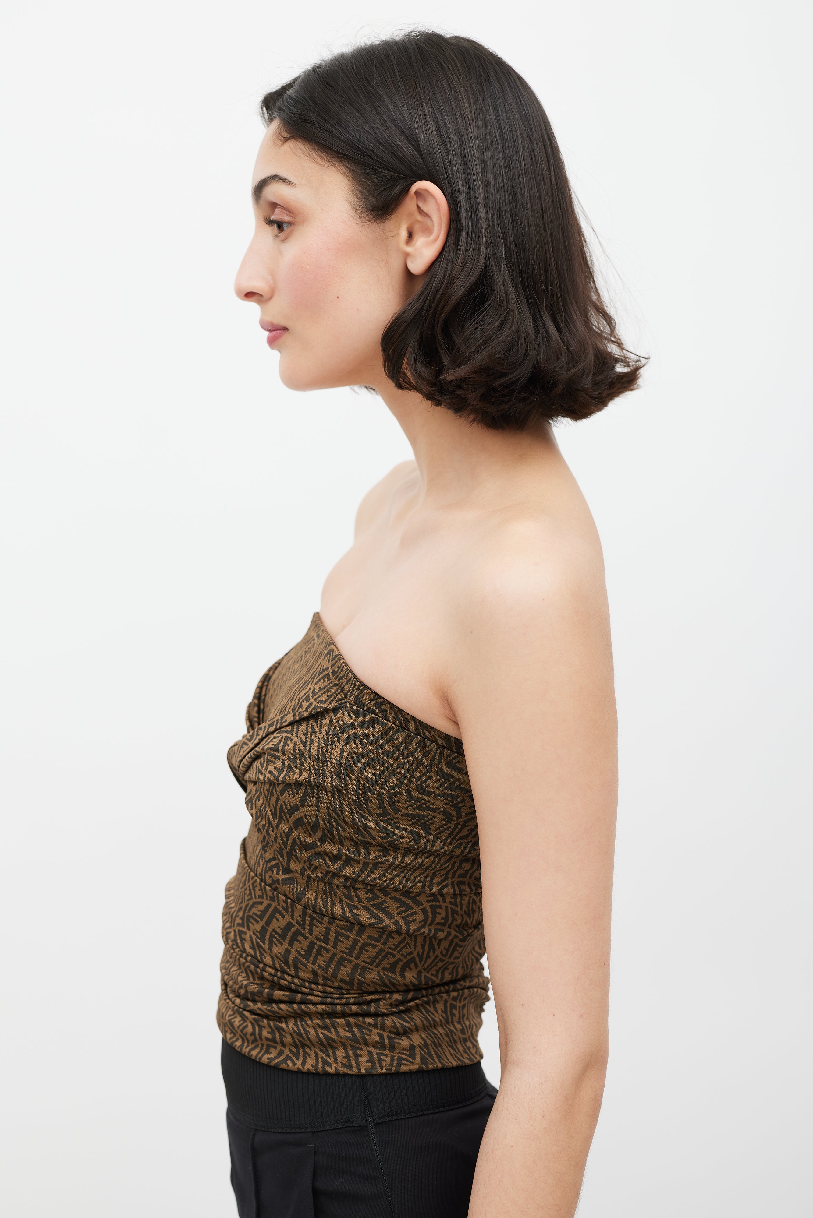 Fendi brown tube top featuring an FF Vertigo monogram pattern throughout, straight across neckline, sleeveless styling, twisted detailing at front, and zip closure at back.