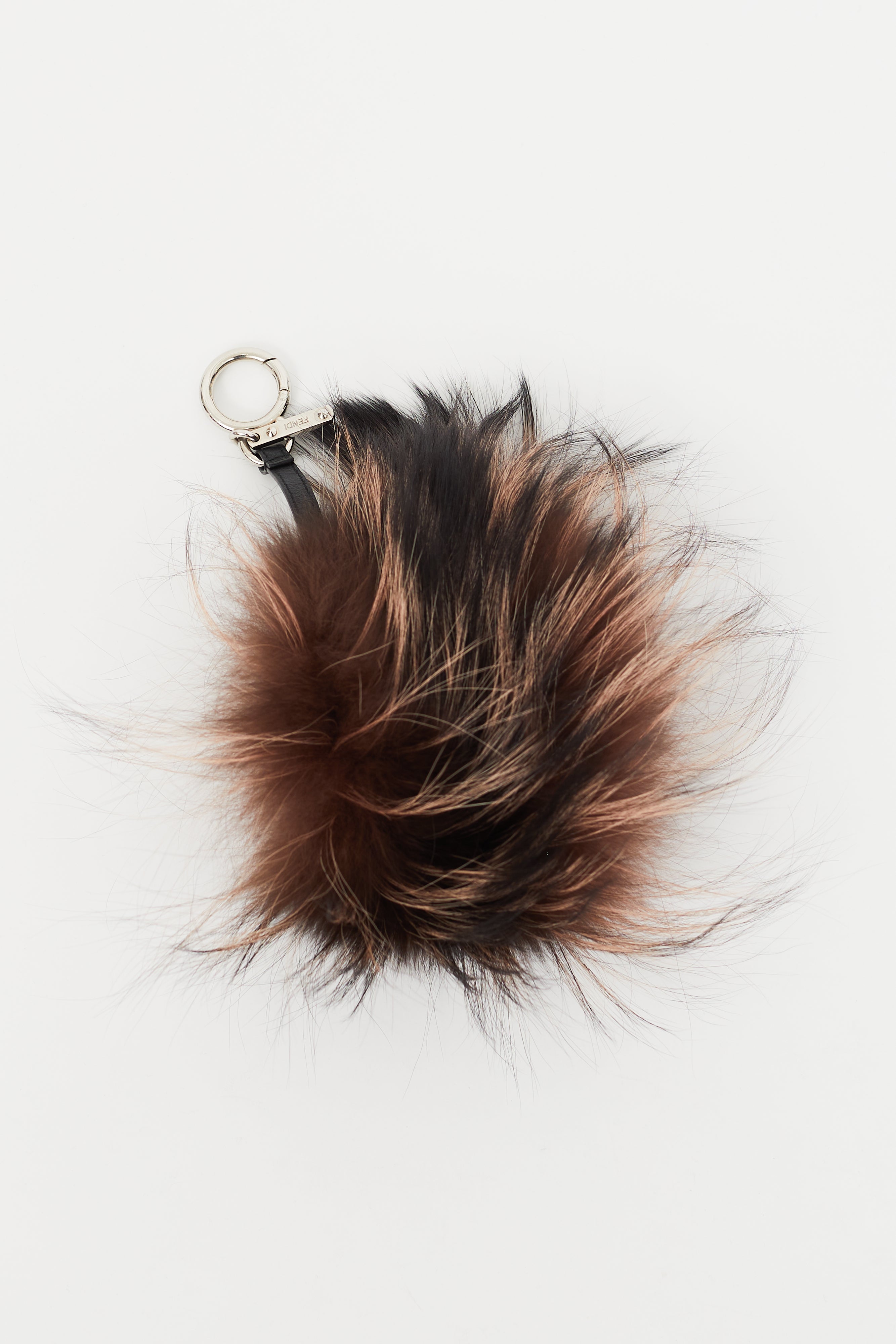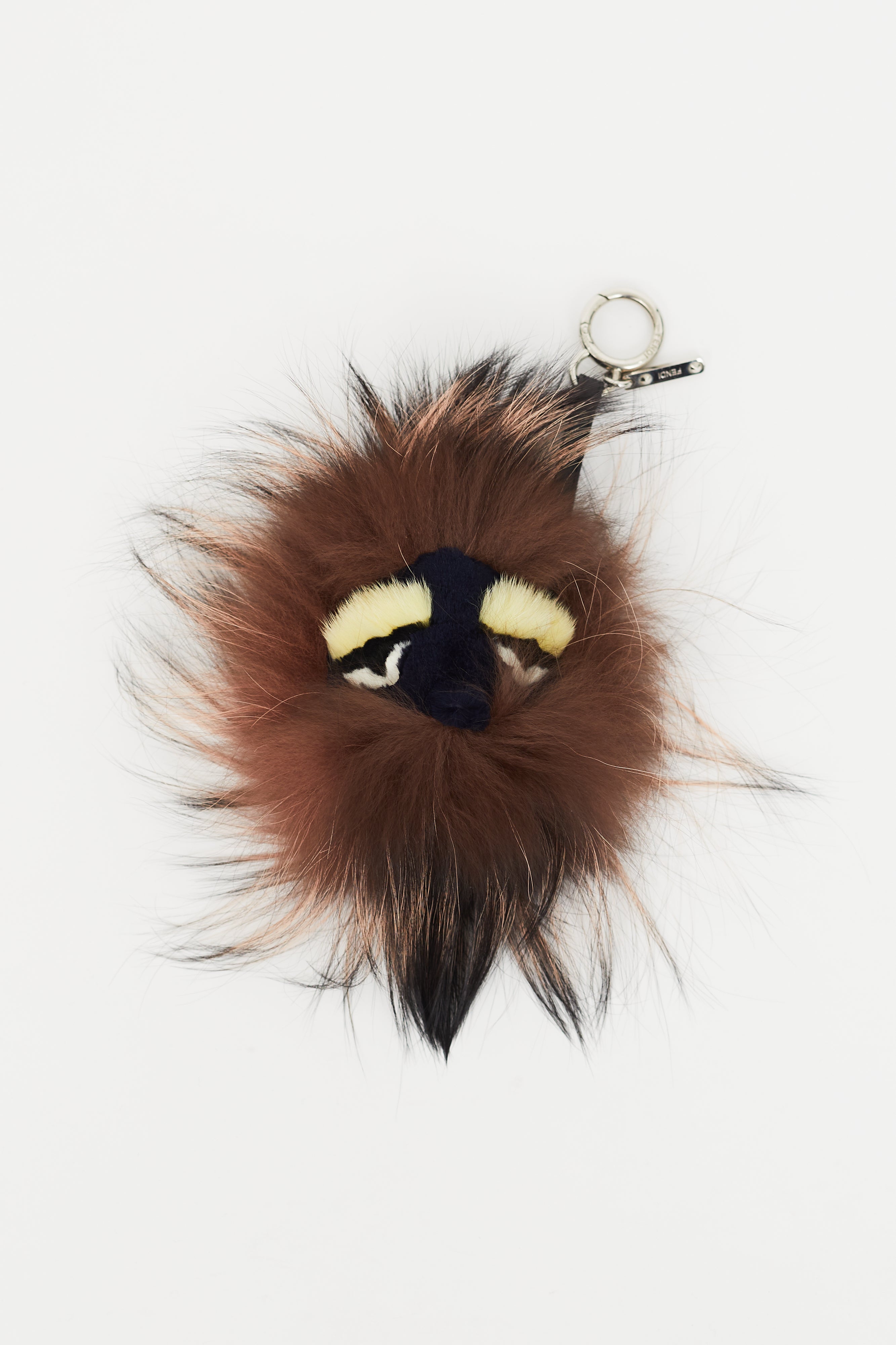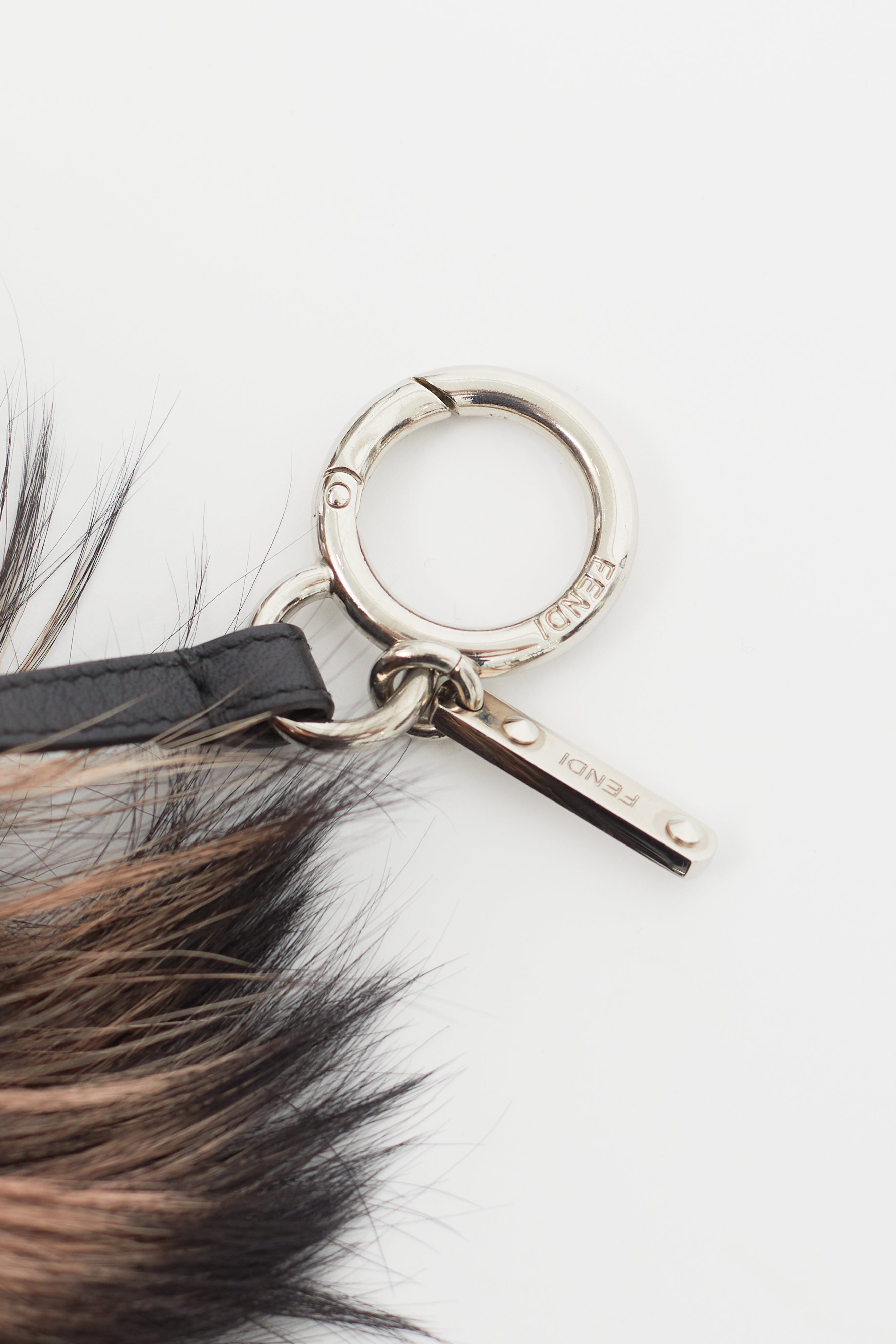 Pre-owned Fendi brown Bag Bug charm featuring bug motif, silver tone ring, engraved logo tab, and black leather strap. Comes with original dust bag.