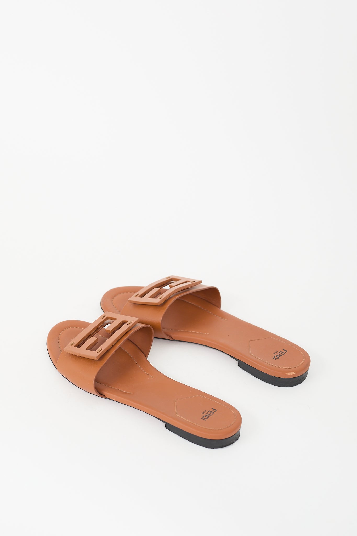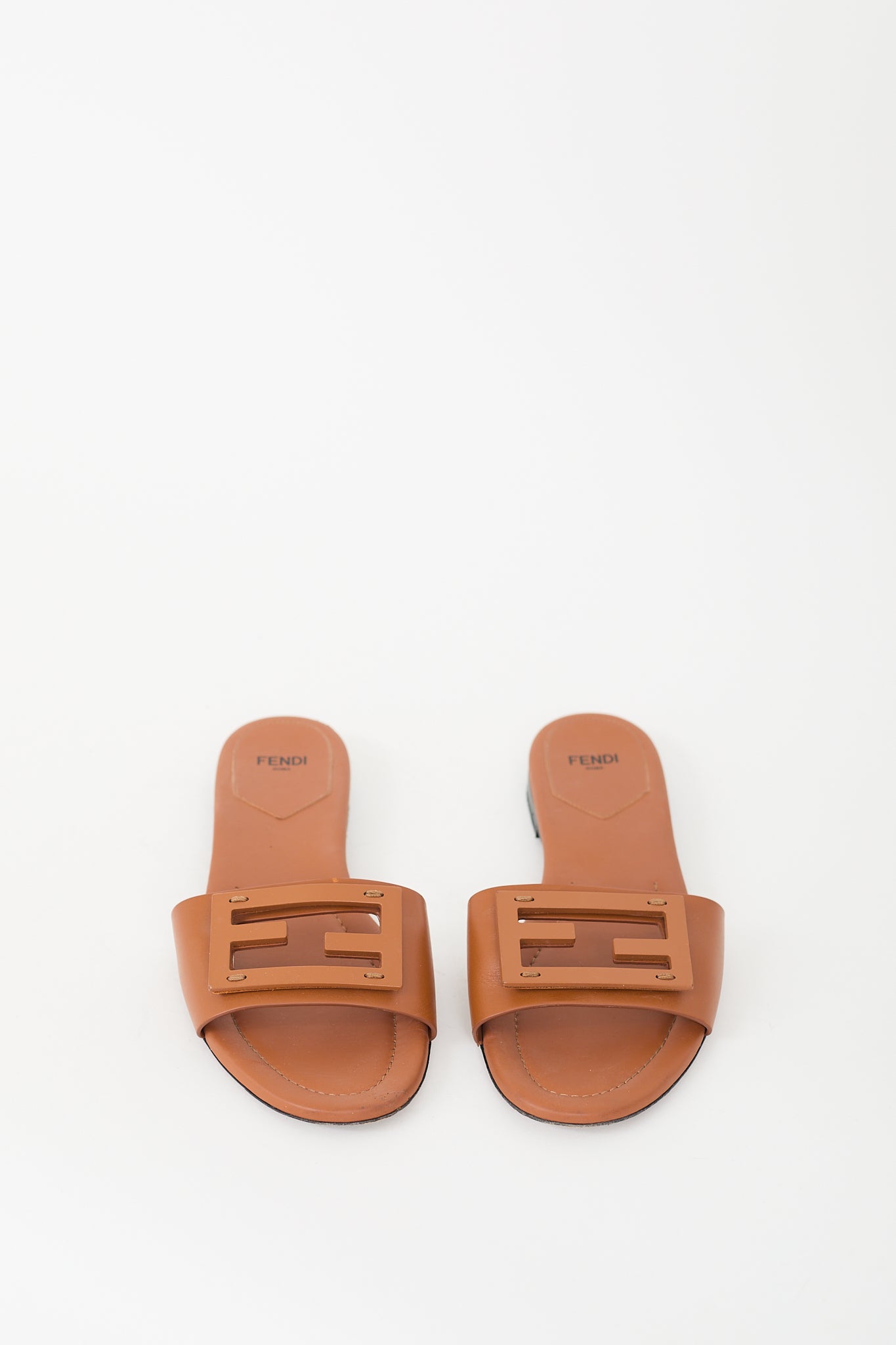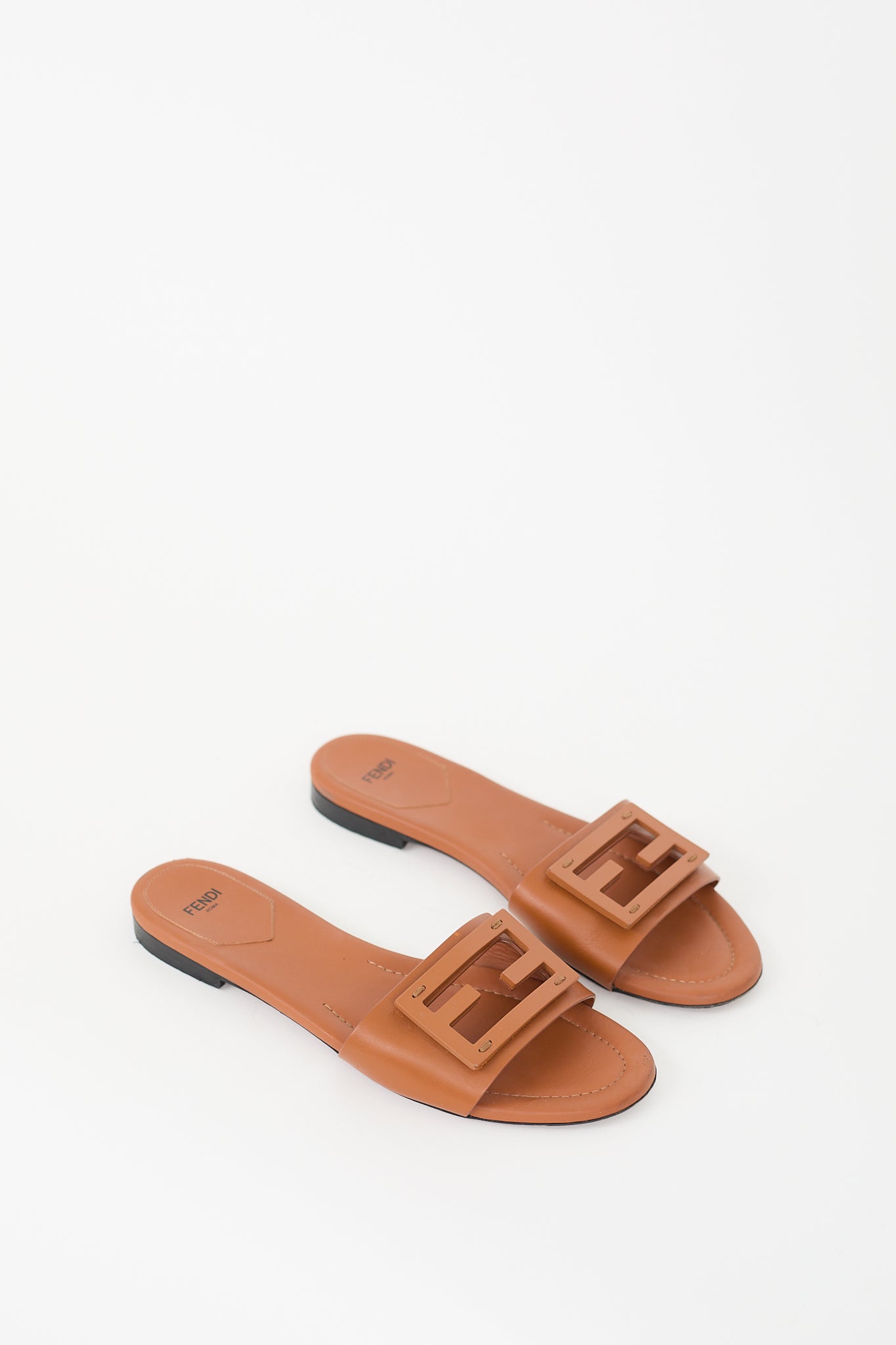 Pre-owned Fendi brown leather Baguette slides featuring rounded toe, tonal FF cut out logo detail across vamp and gold stamped logo at insole.