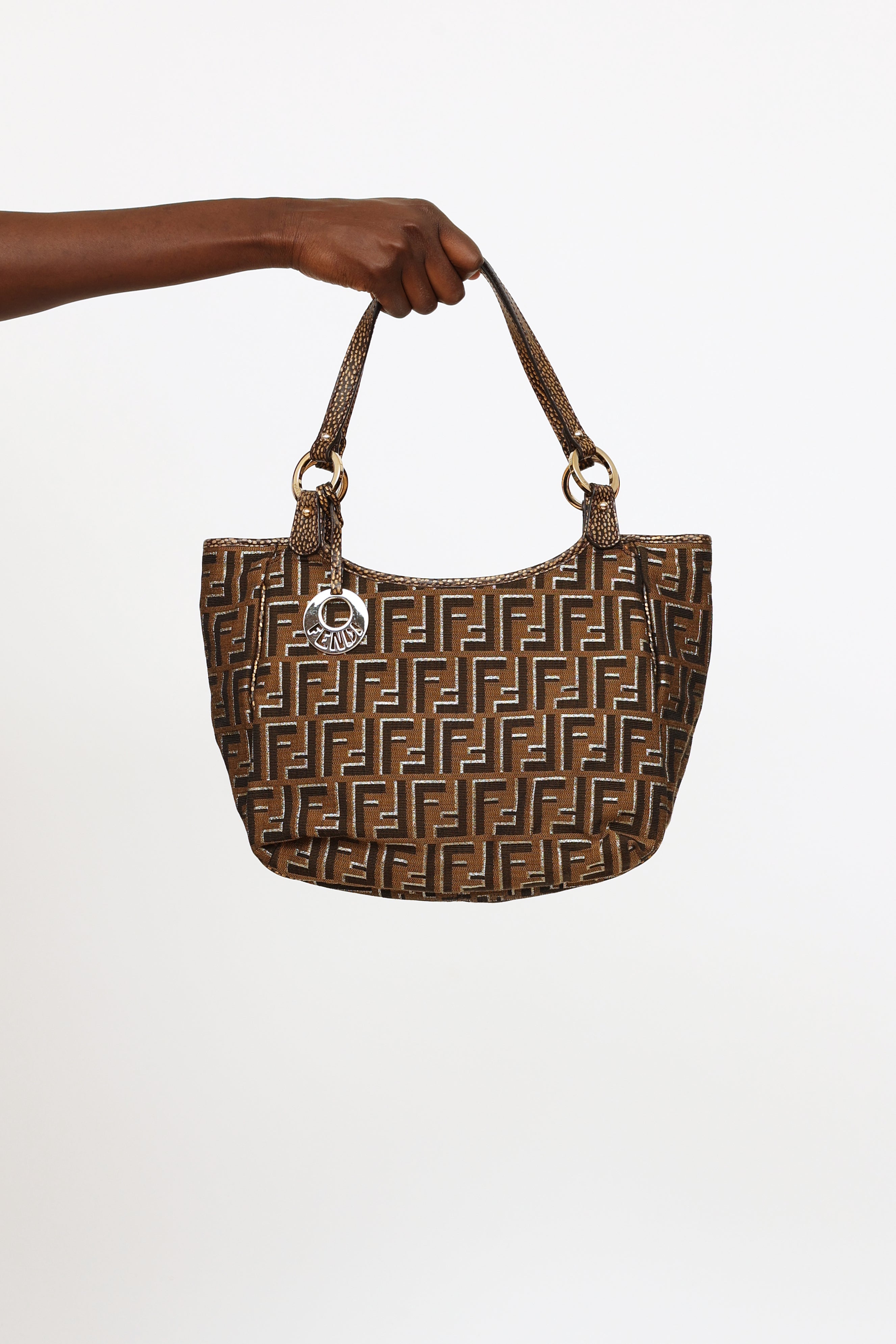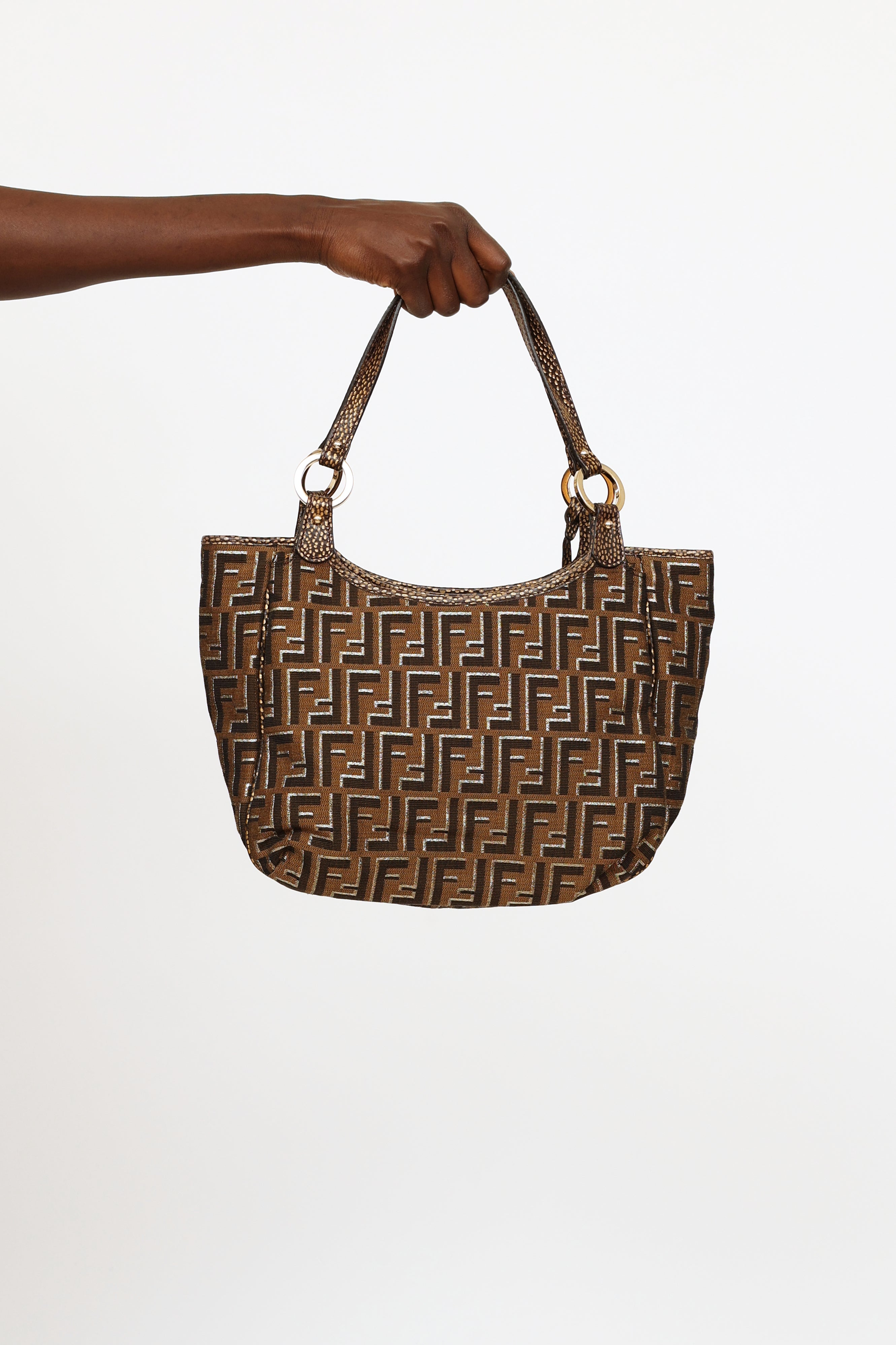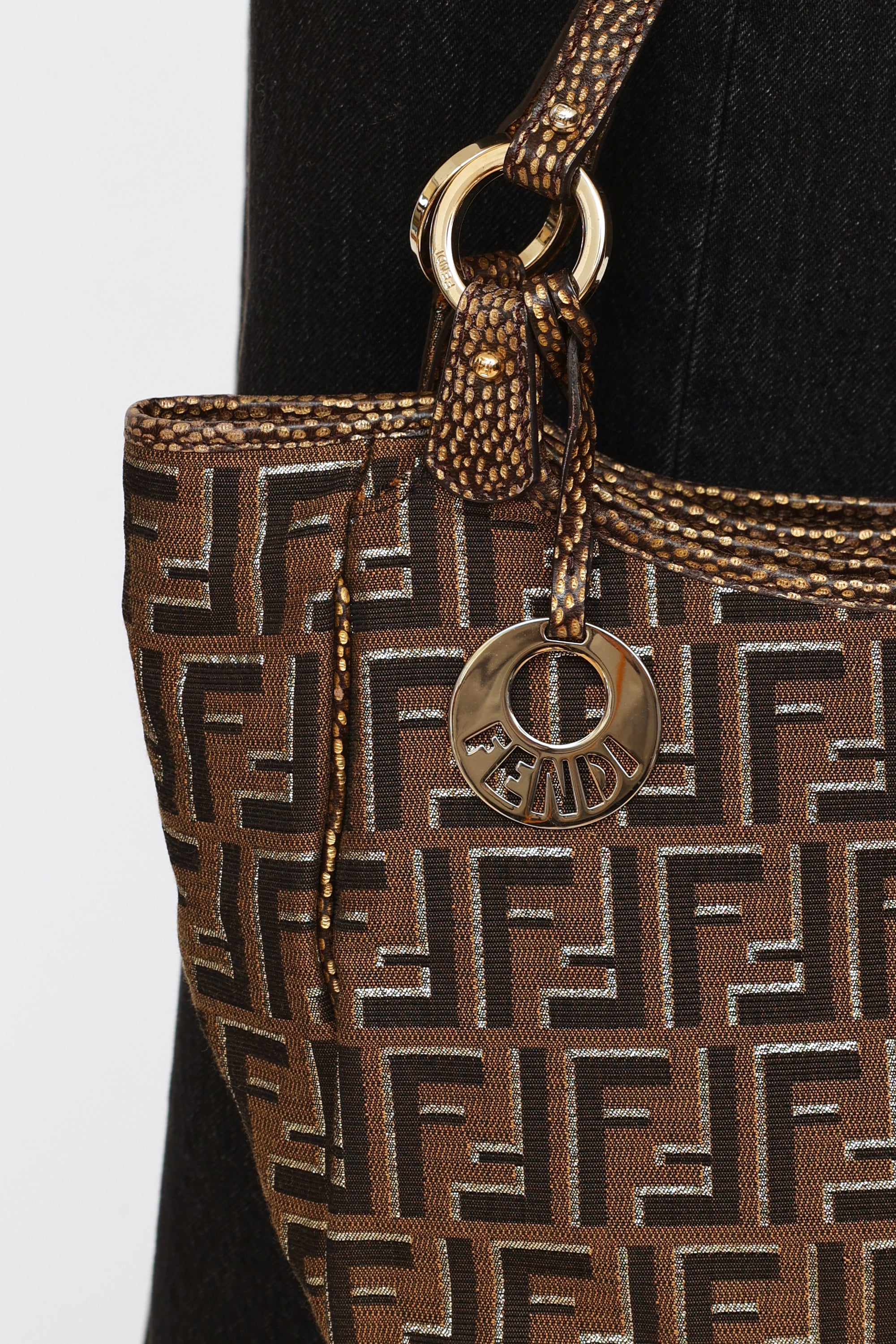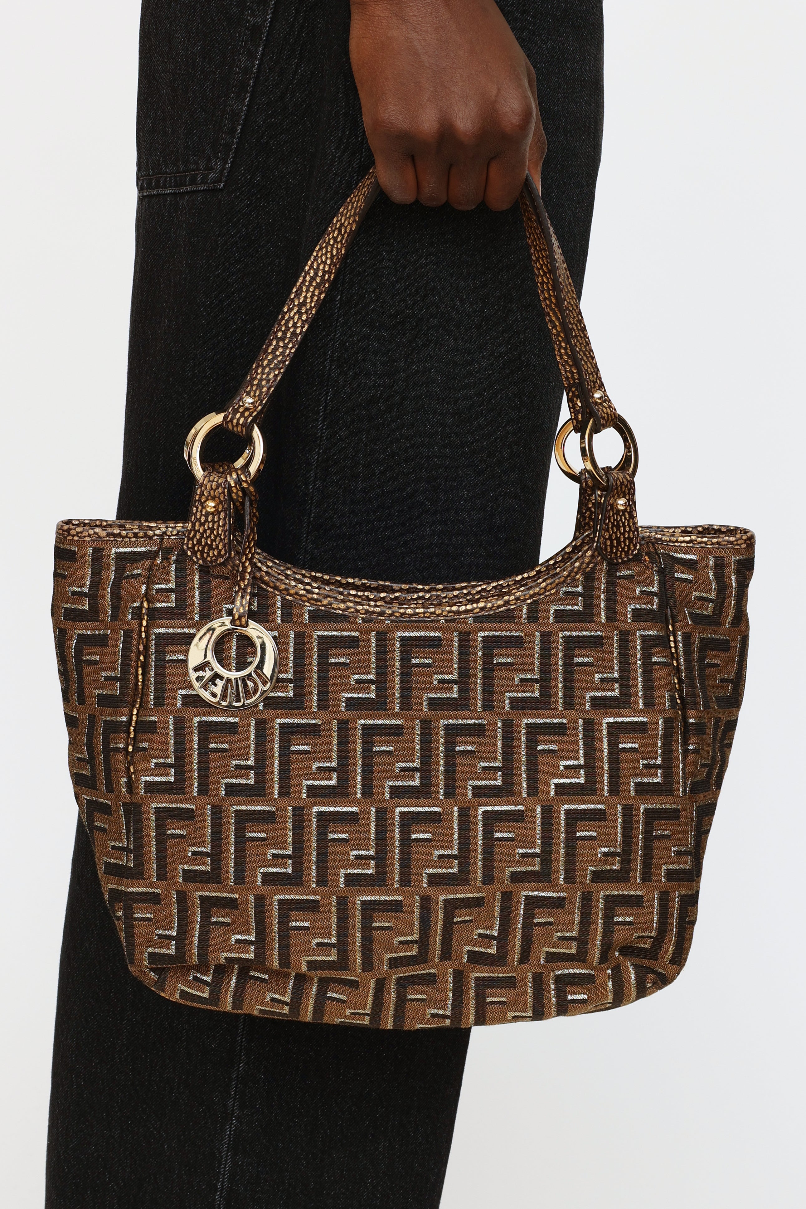 Pre-owned Fendi brown canvas small tote bag featuring Zucca monogram motif with gold shimmer, embossed flat leather shoulder straps on gold-tone rings, leather trims, silver-tone Fendi charm detail. Two open top compartments and one central zipped compartment featuring lined interior and one slip pocket.