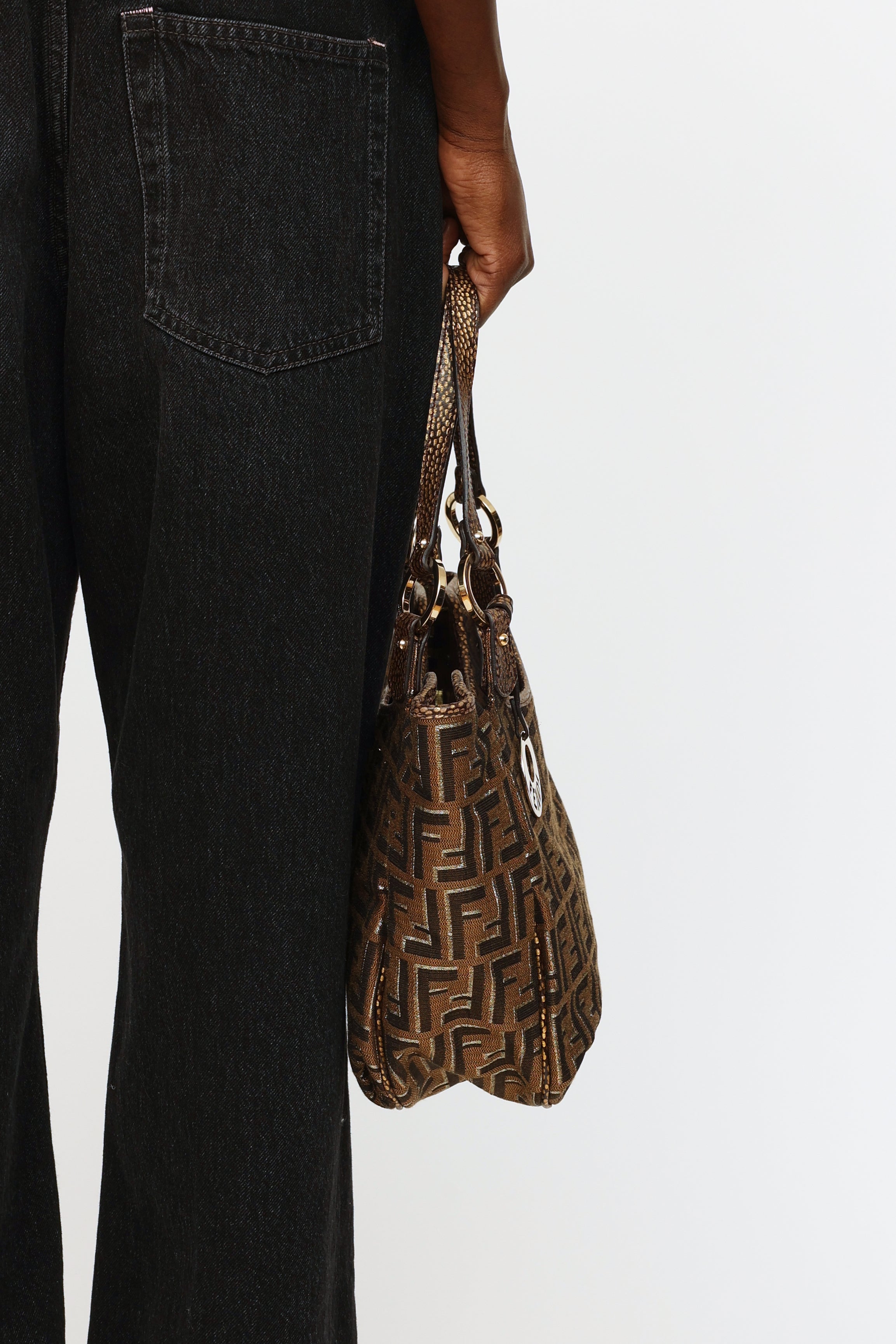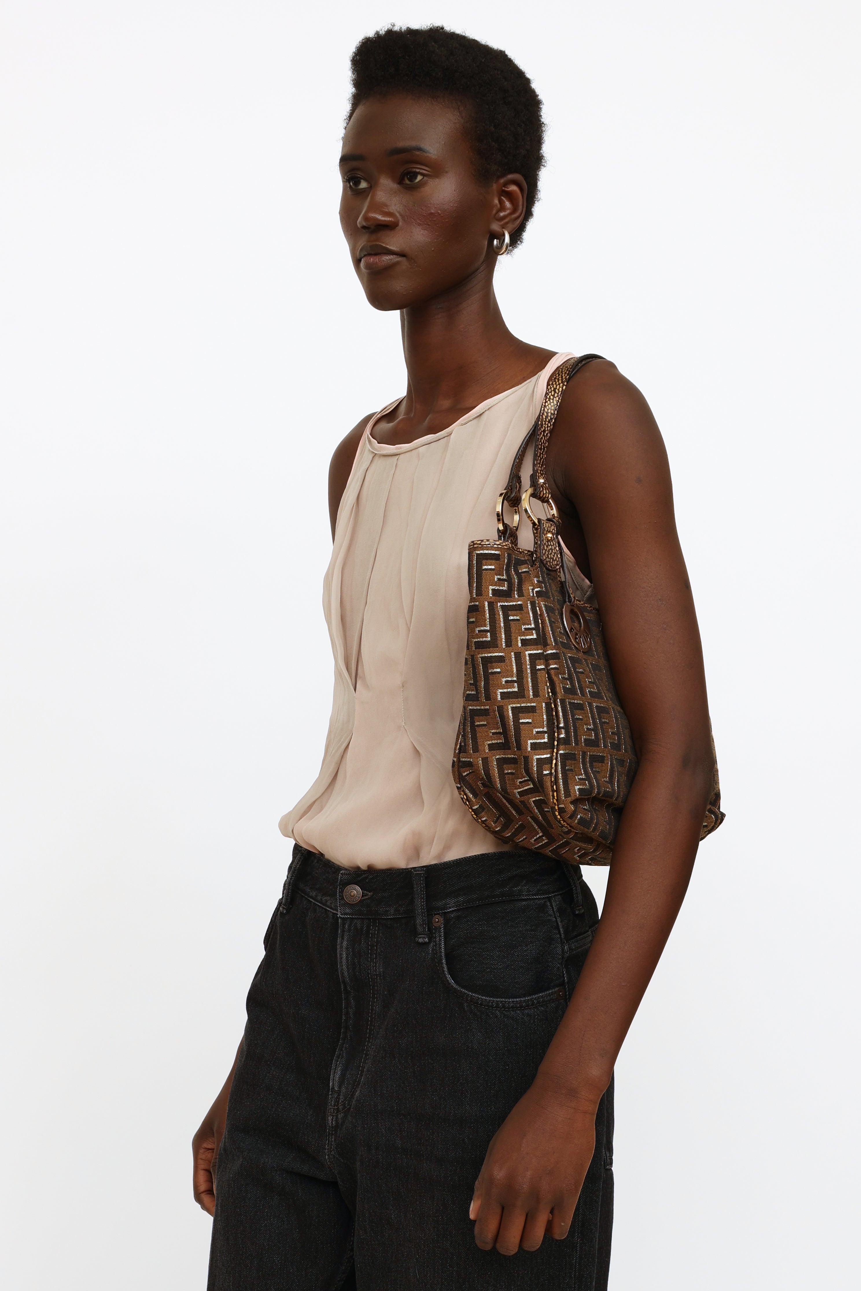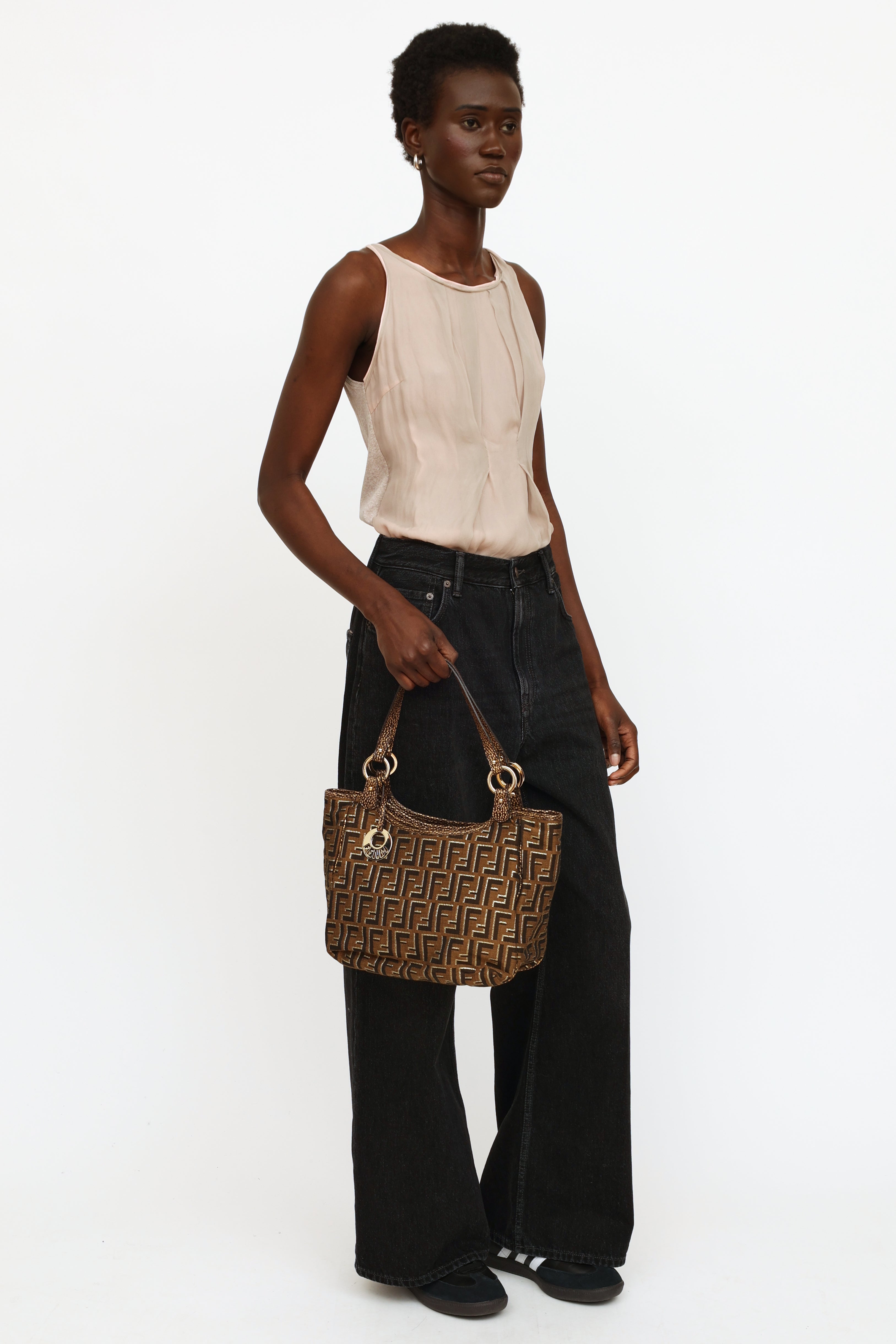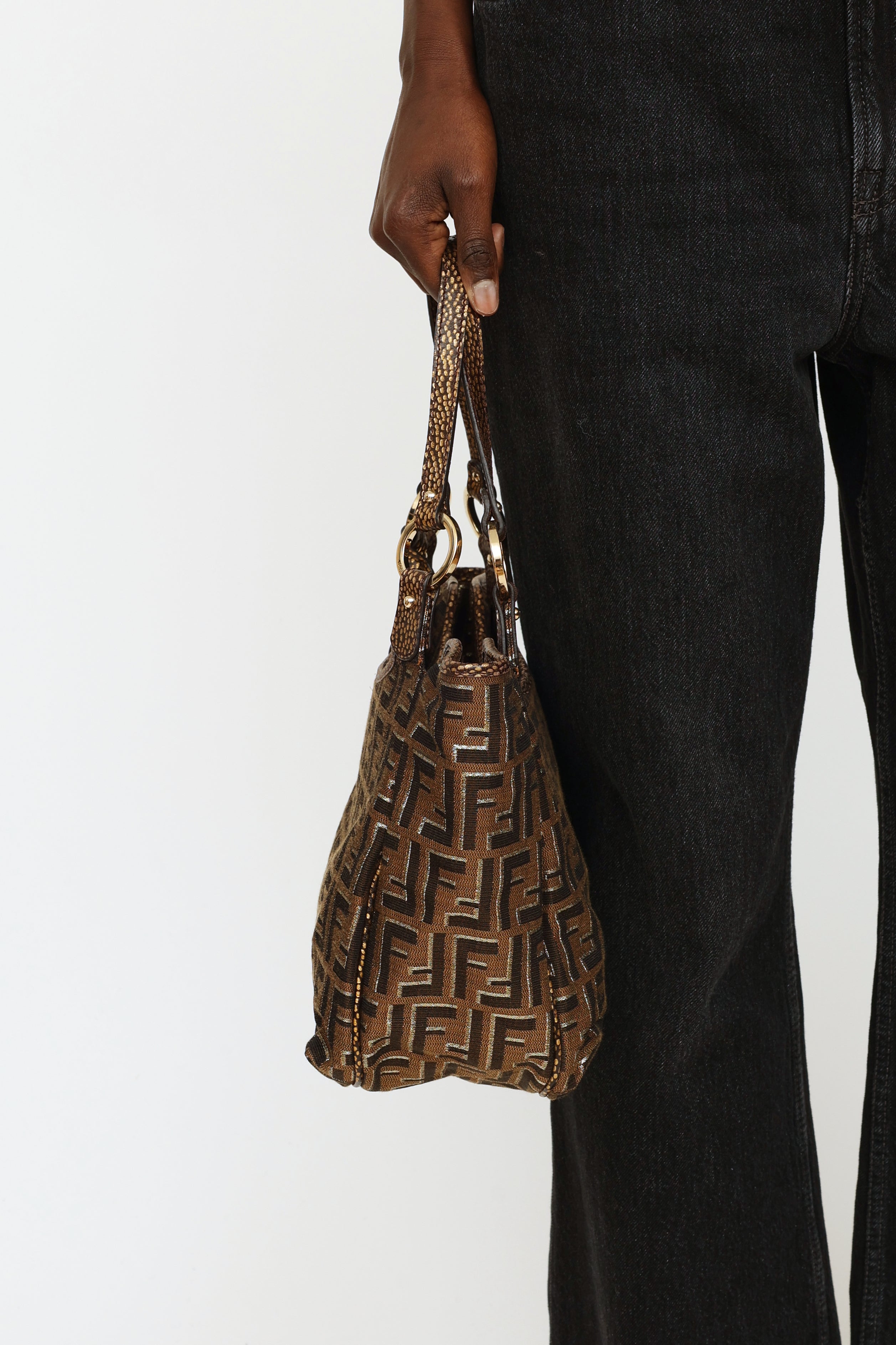 Pre-owned Fendi brown canvas small tote bag featuring Zucca monogram motif with gold shimmer, embossed flat leather shoulder straps on gold-tone rings, leather trims, silver-tone Fendi charm detail. Two open top compartments and one central zipped compartment featuring lined interior and one slip pocket.