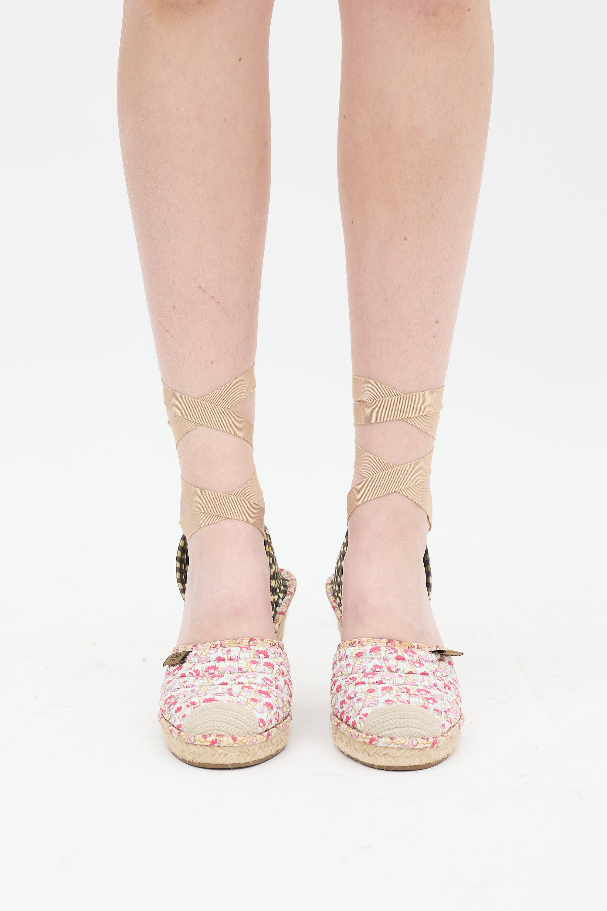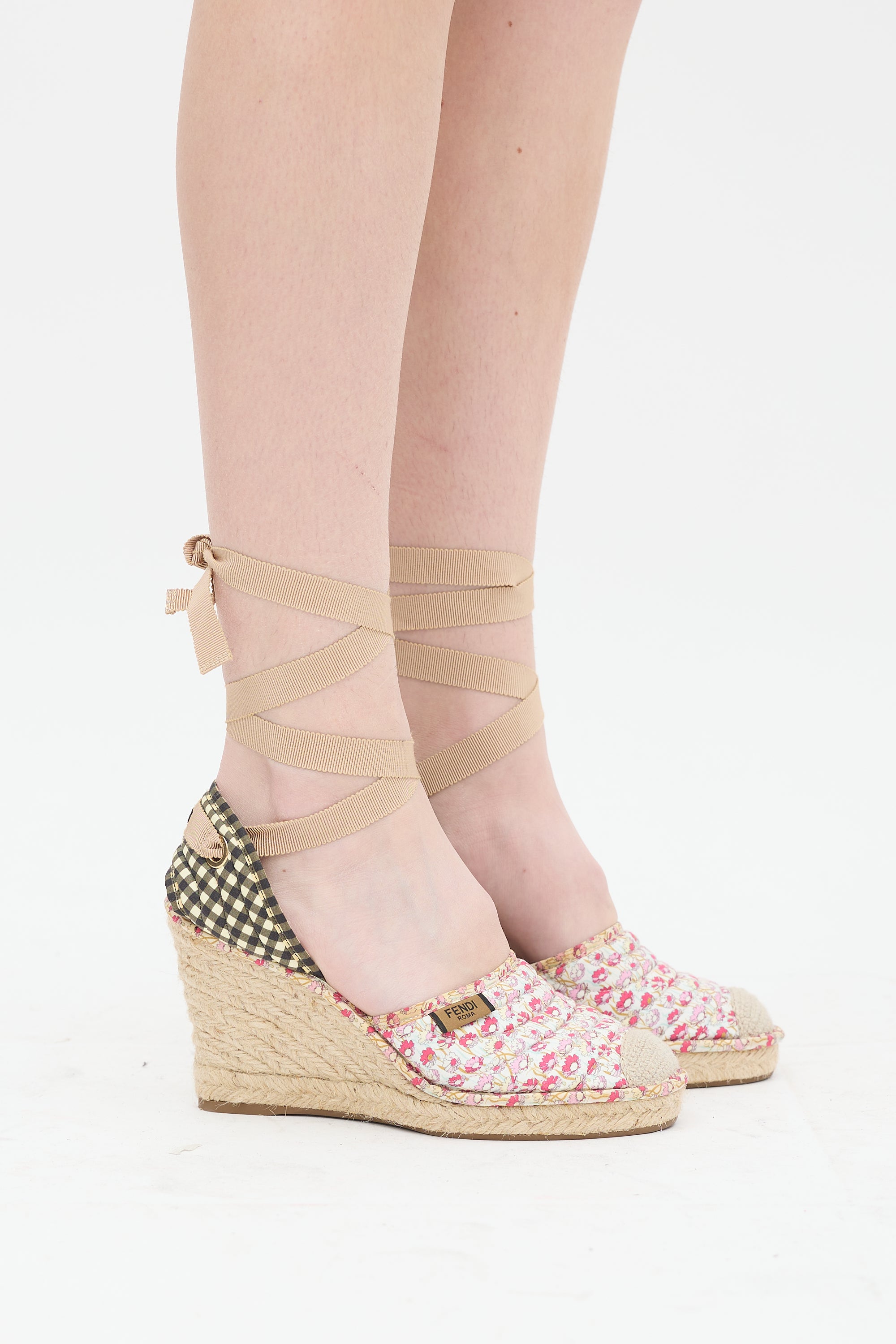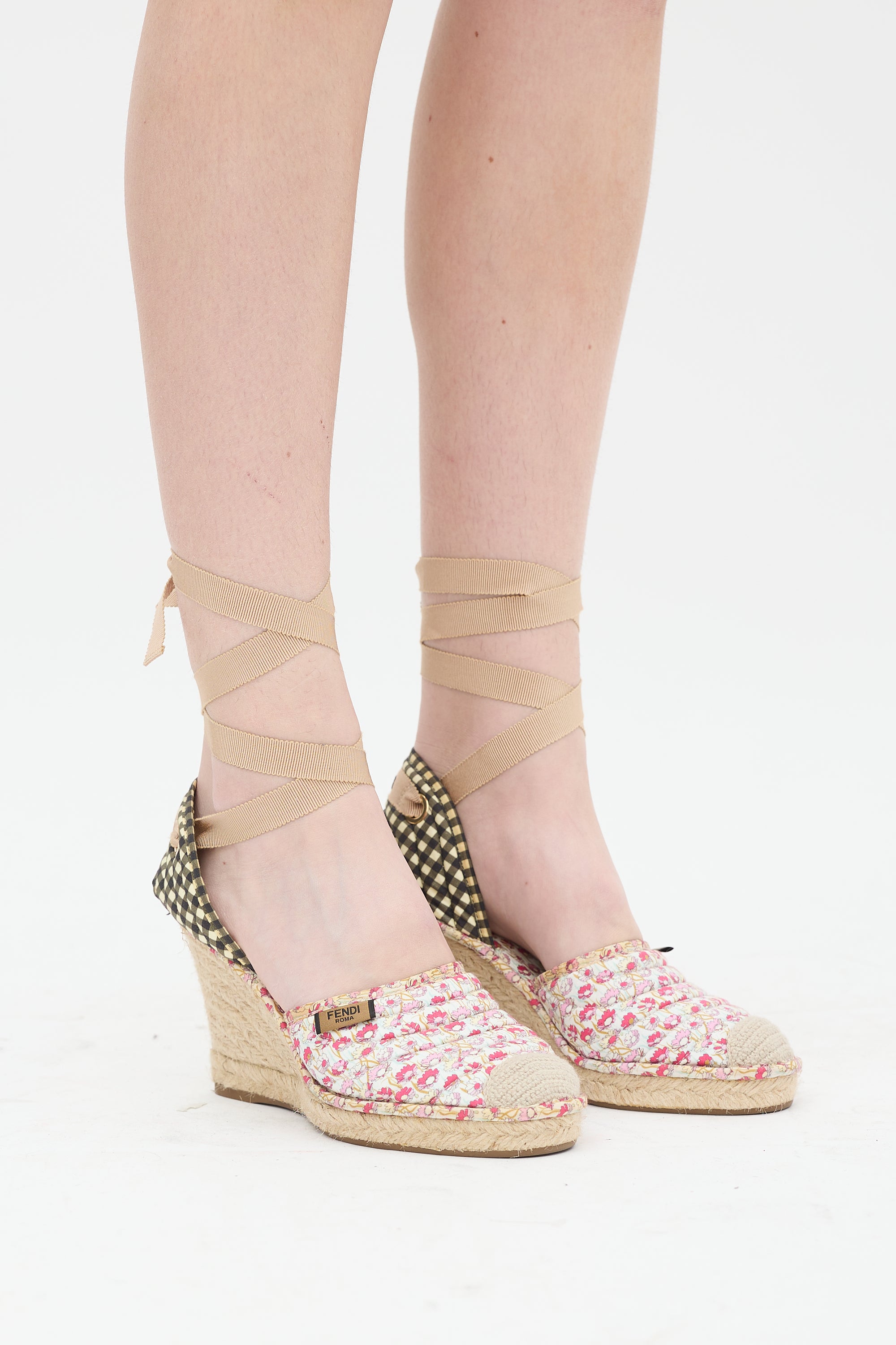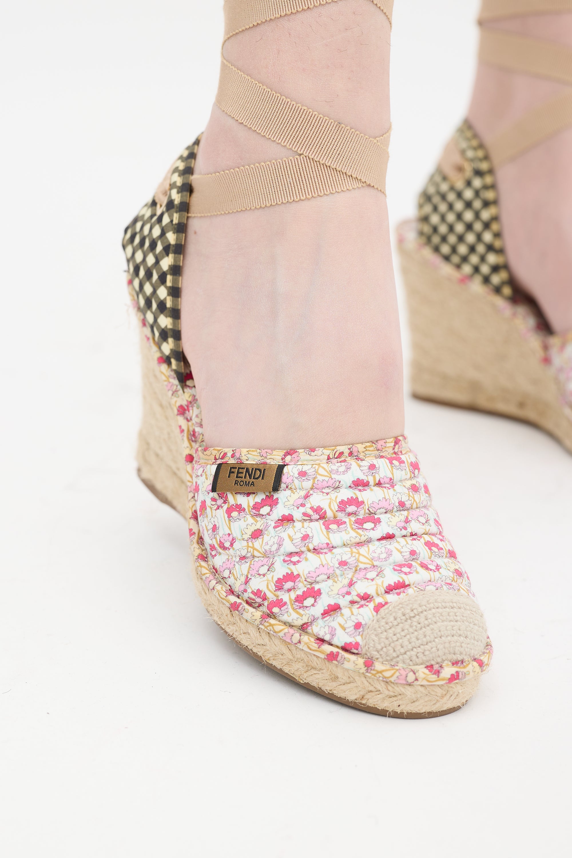 Pre-owned Fendi multicolour espadrille sandals featuring rounded toe with crochet toe cap, floral print at quilted vamp and insole, logo tag at topline, black and white gingham counter with embroidered logo, lace up closure, and rubber outsole.