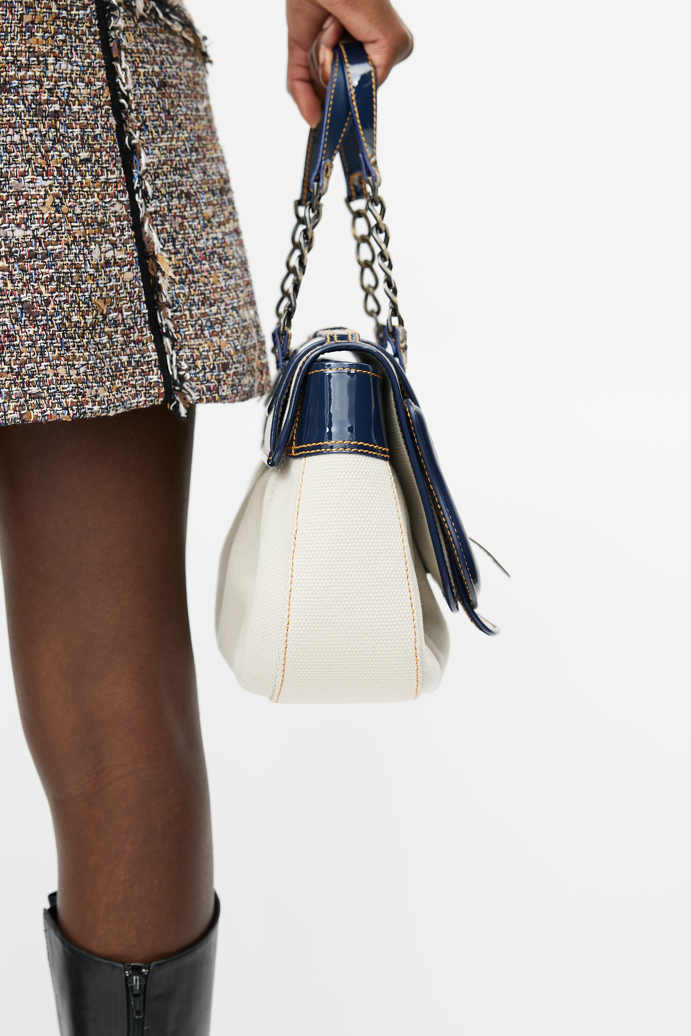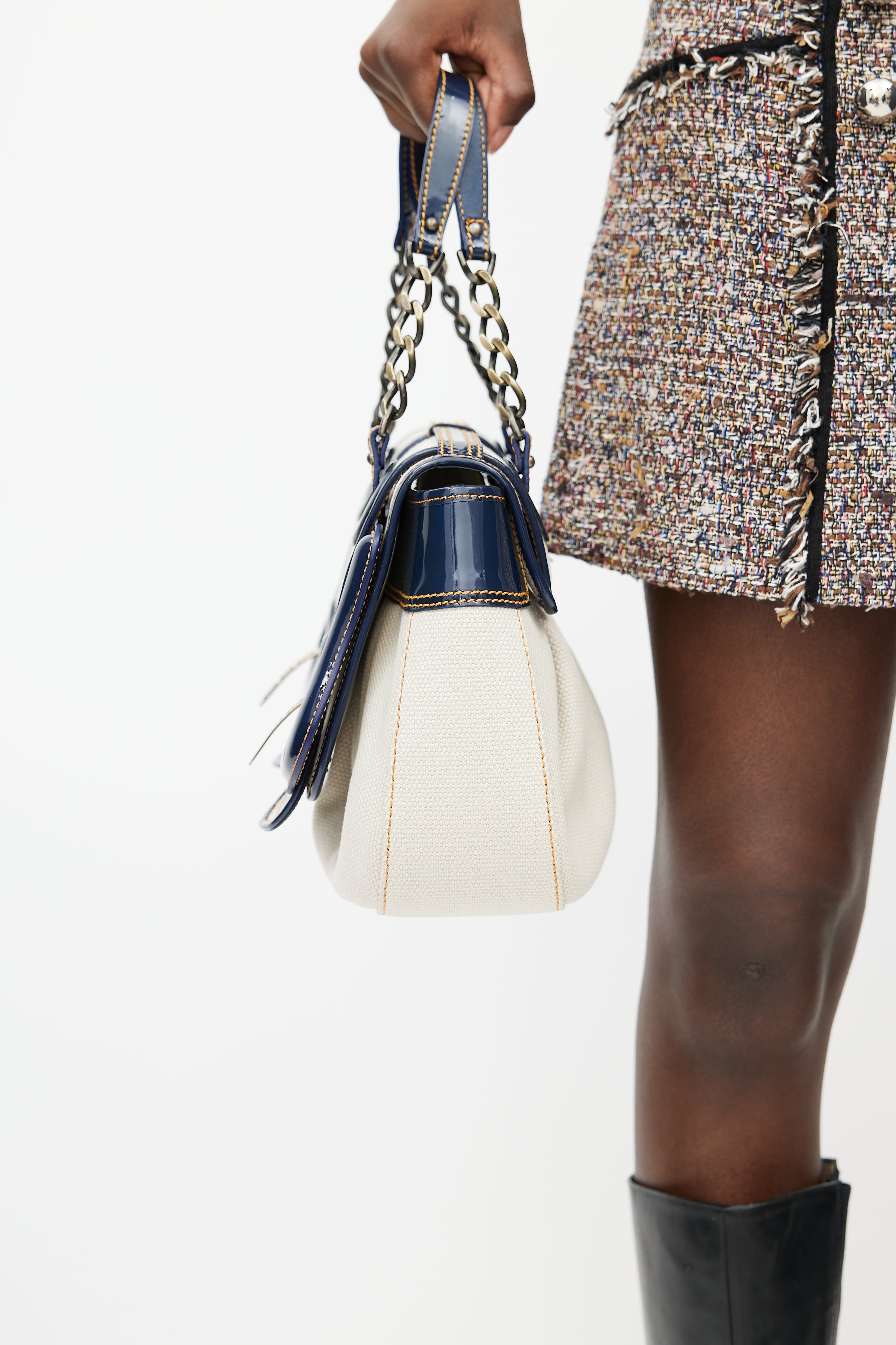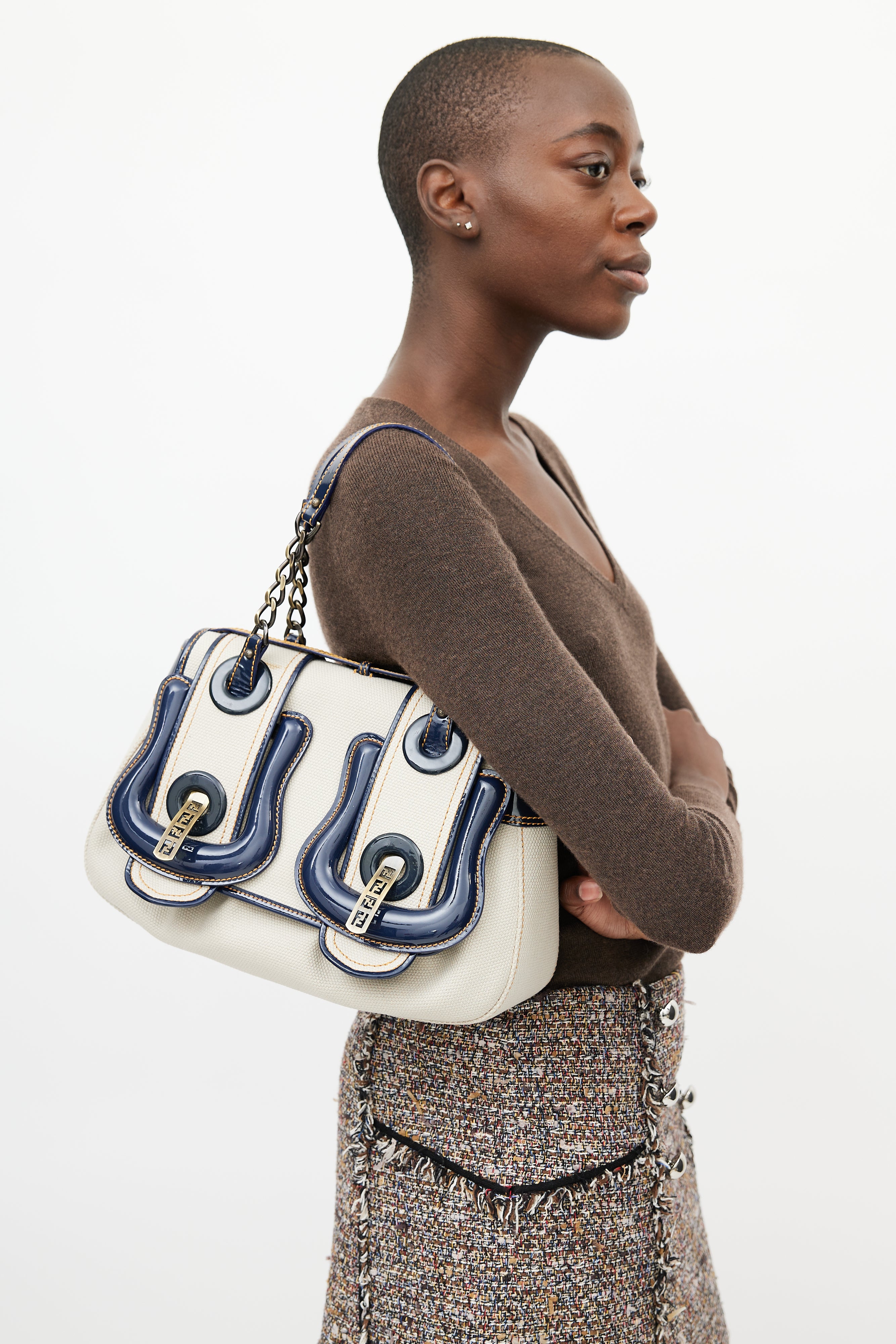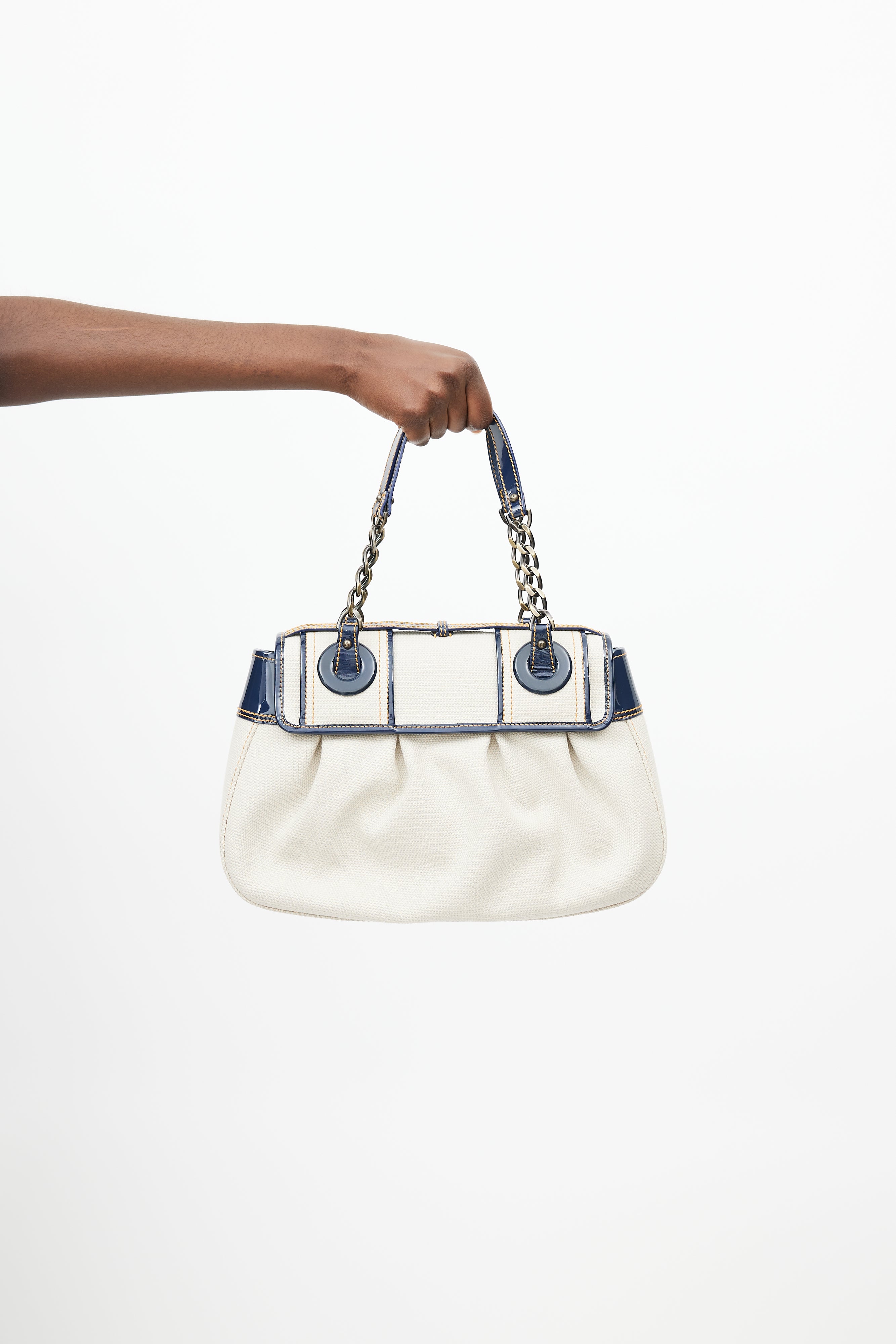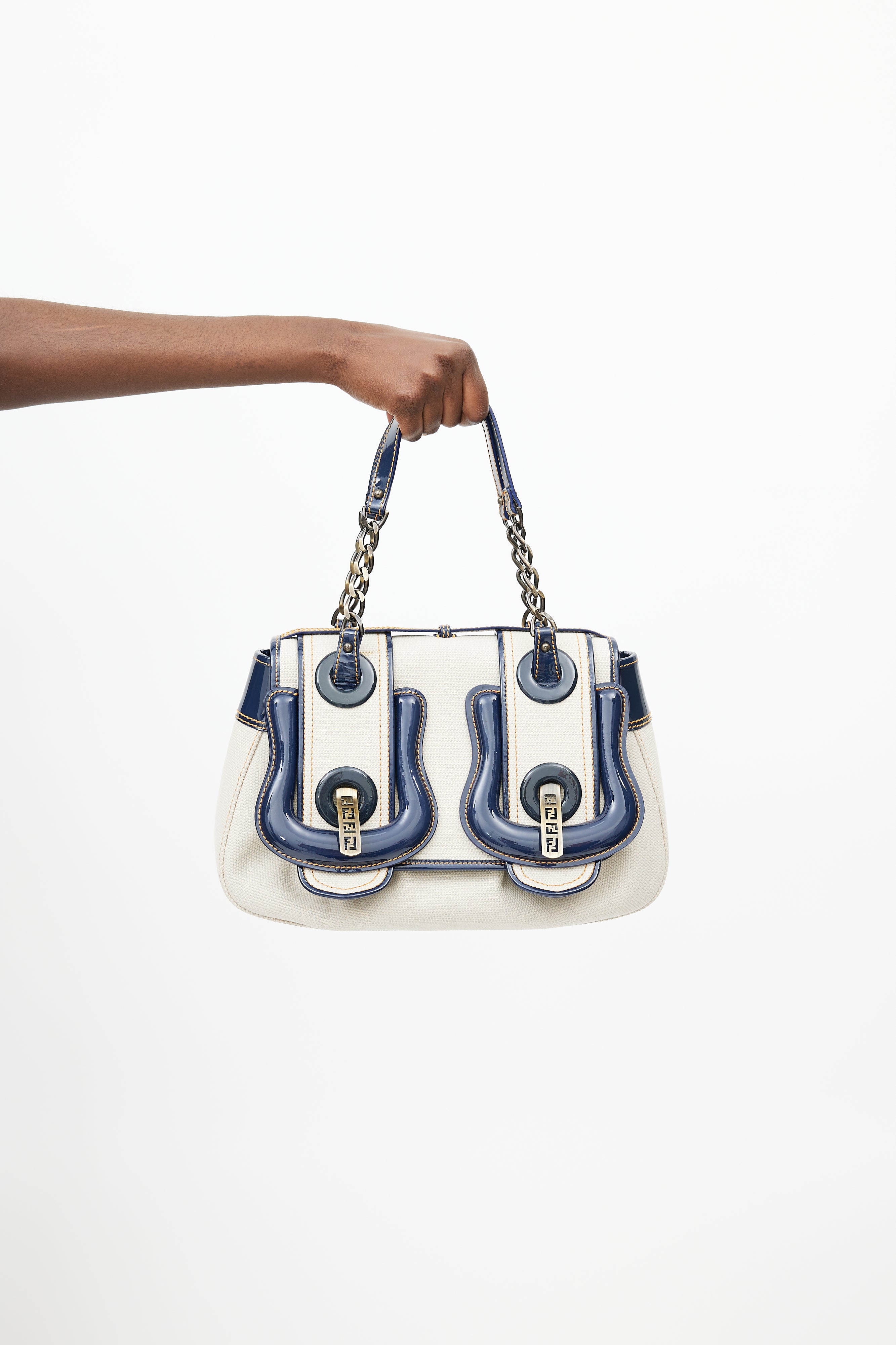 Pre-owned Fendi white B leather bag featuring a top flap with blue patent leather trim, gold tone logo hardware, one main compartment with one slip pocket, two chainlink top handles, contrast stitching, and push lock closure. Comes with original dust bag.
