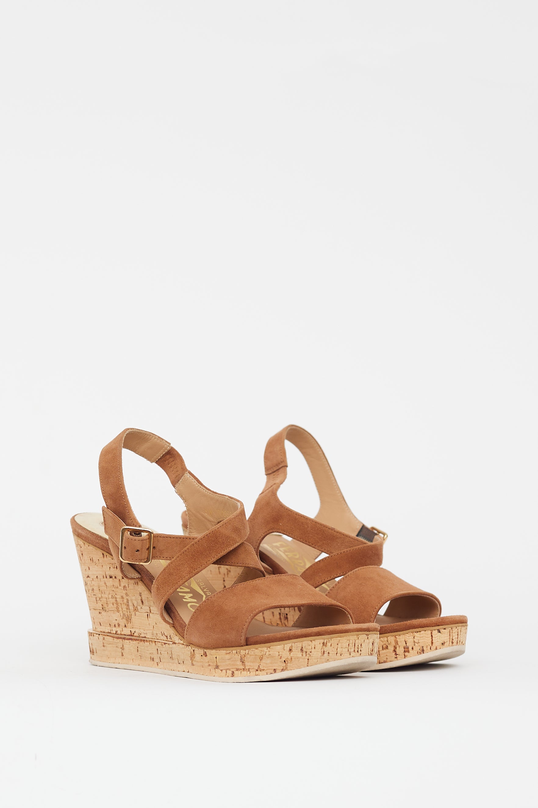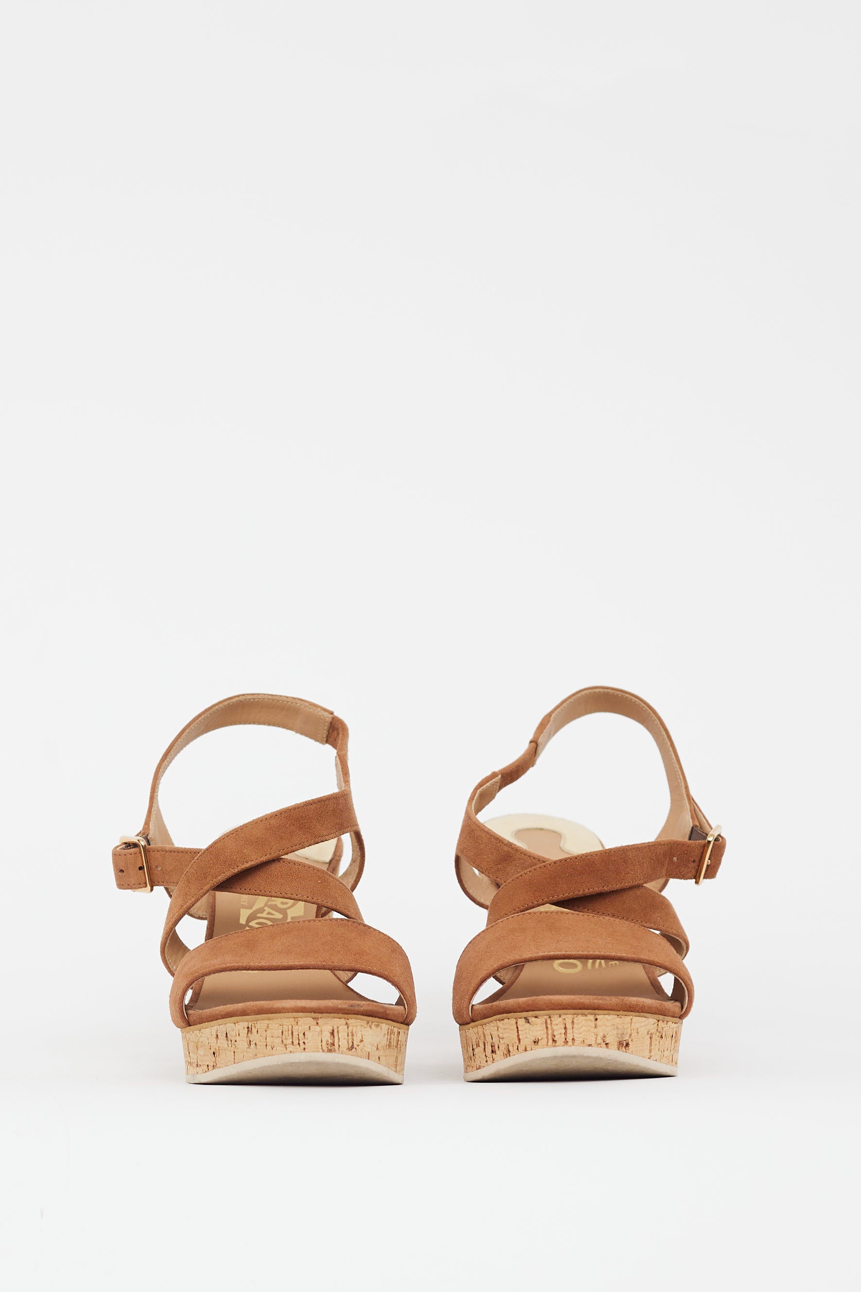 Pre-owned Ferragamo brown suede sandals featuring an open round toe, cork midsole, wedge heel, criss cross straps at upper, and adjustable ankle strap.